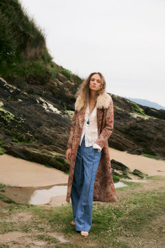 Una pieza llamativa con inspiración vintage, el chaleco Erica está confeccionado en un jacquard de estampado paisley en tonos cálidos, realzado con un cuello de borreguito que aporta textura y volumen. Su silueta corta y abierta al frente lo convierte en una capa versátil para looks bohemios y sofisticados. Perfecto para combinar con blusas entalladas o vestidos fluidos.