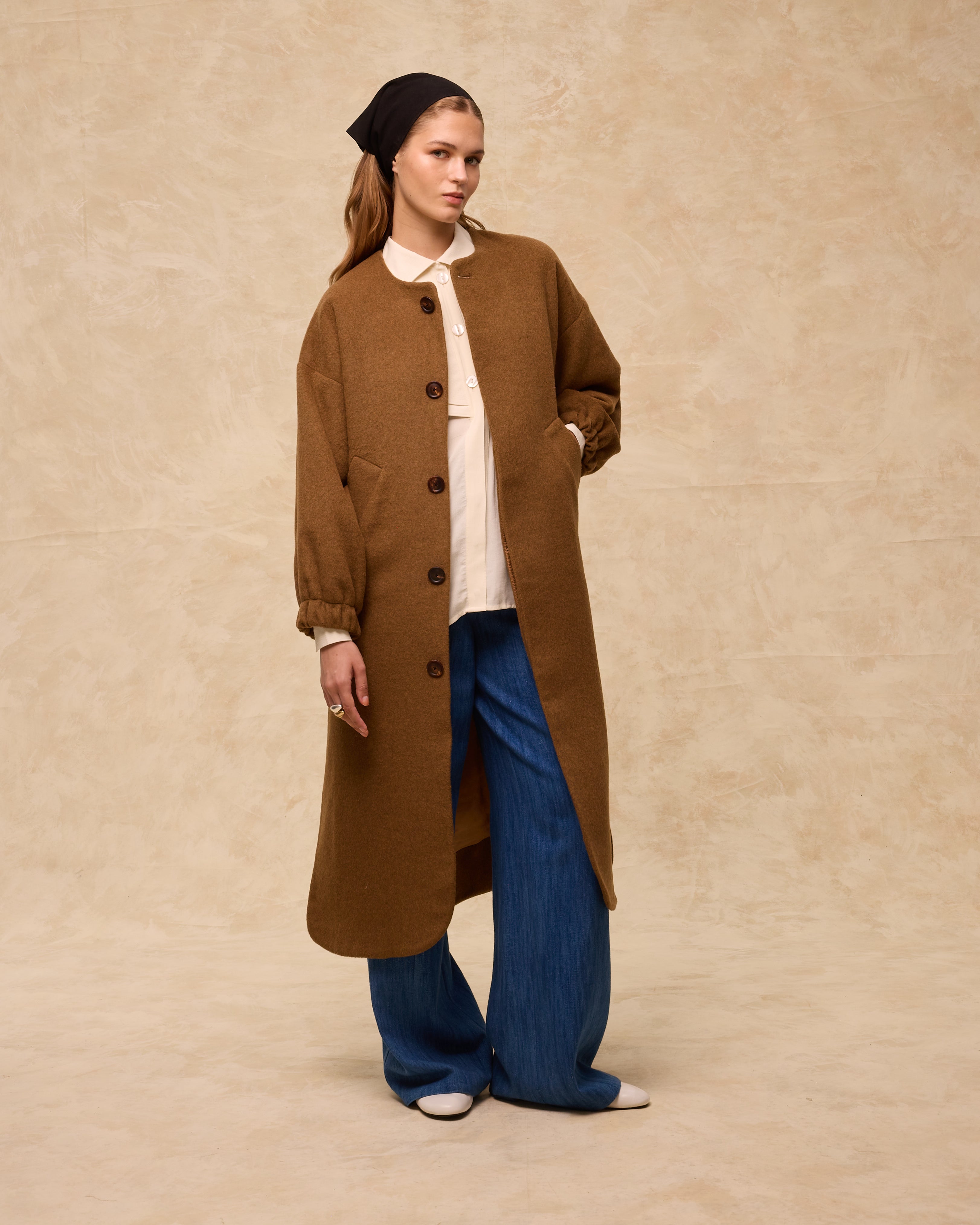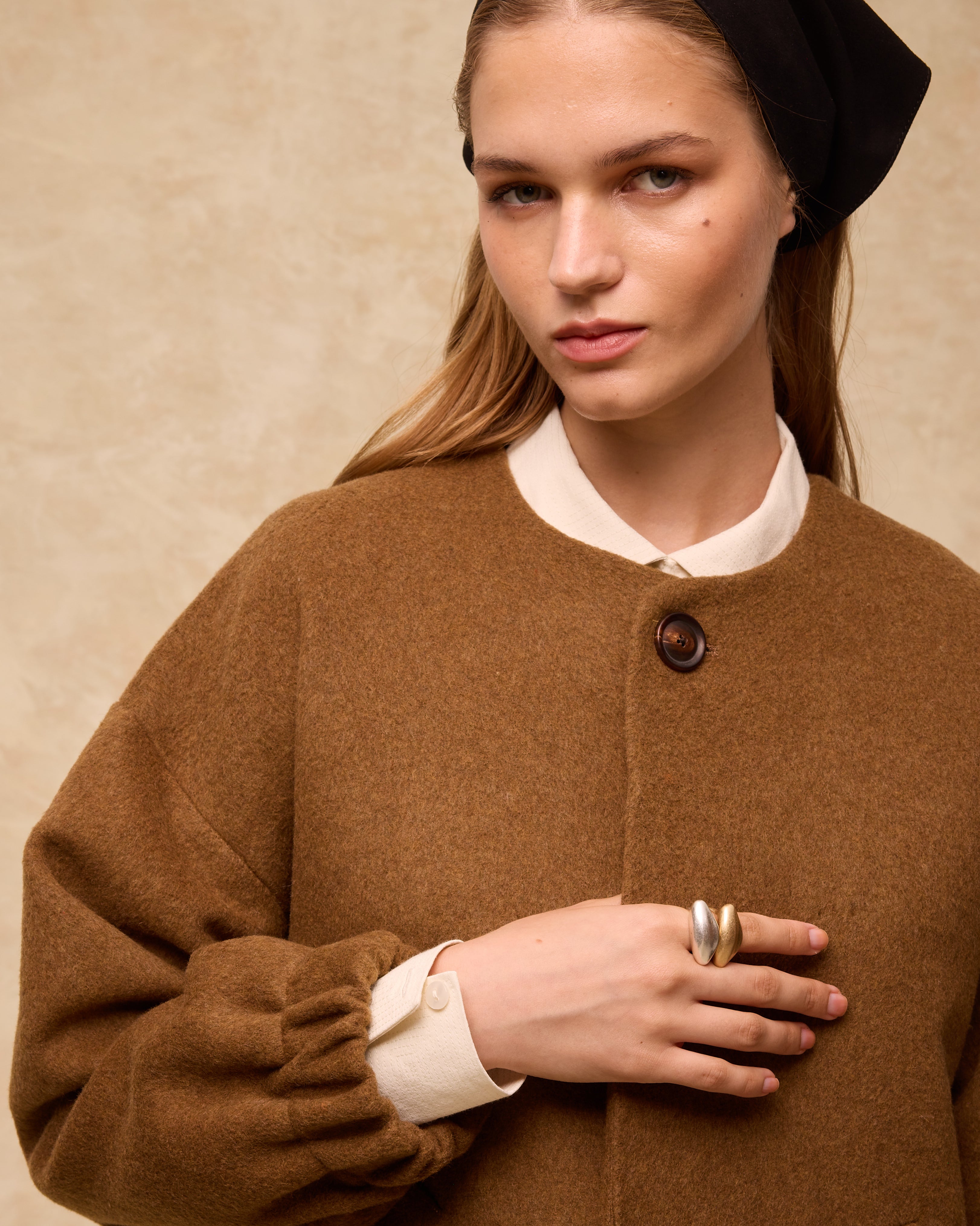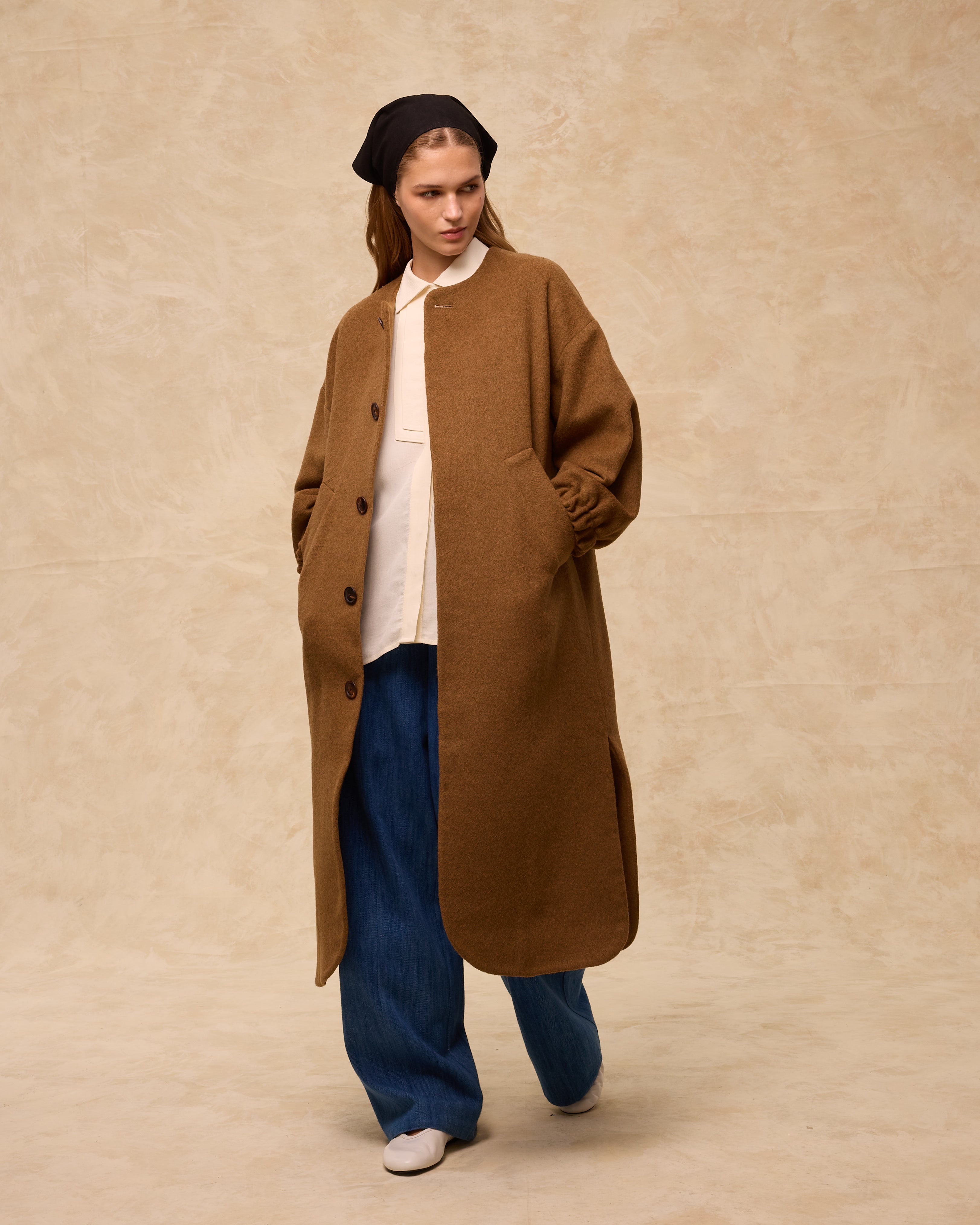 Con estructura suave, el abrigo Morganti está confeccionado en una cálida mezcla de lana y completamente forrado. Diseñado con una silueta relajada y bajo curvado, presenta un cuello redondo limpio, mangas oversize con puños elásticos y profundas aberturas laterales que aportan libertad de movimiento. Una hilera de botones al tono aporta un acabado minimalista.
