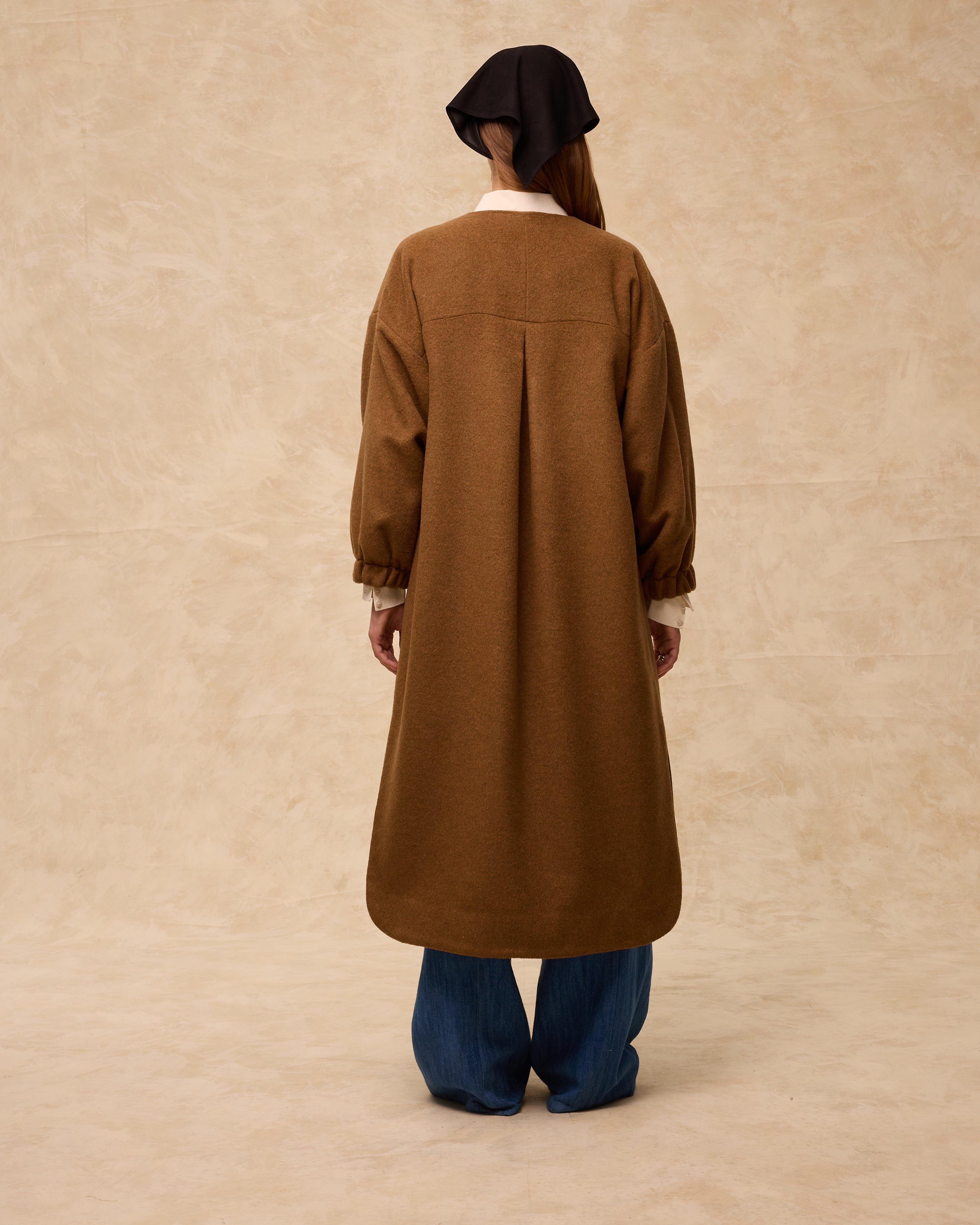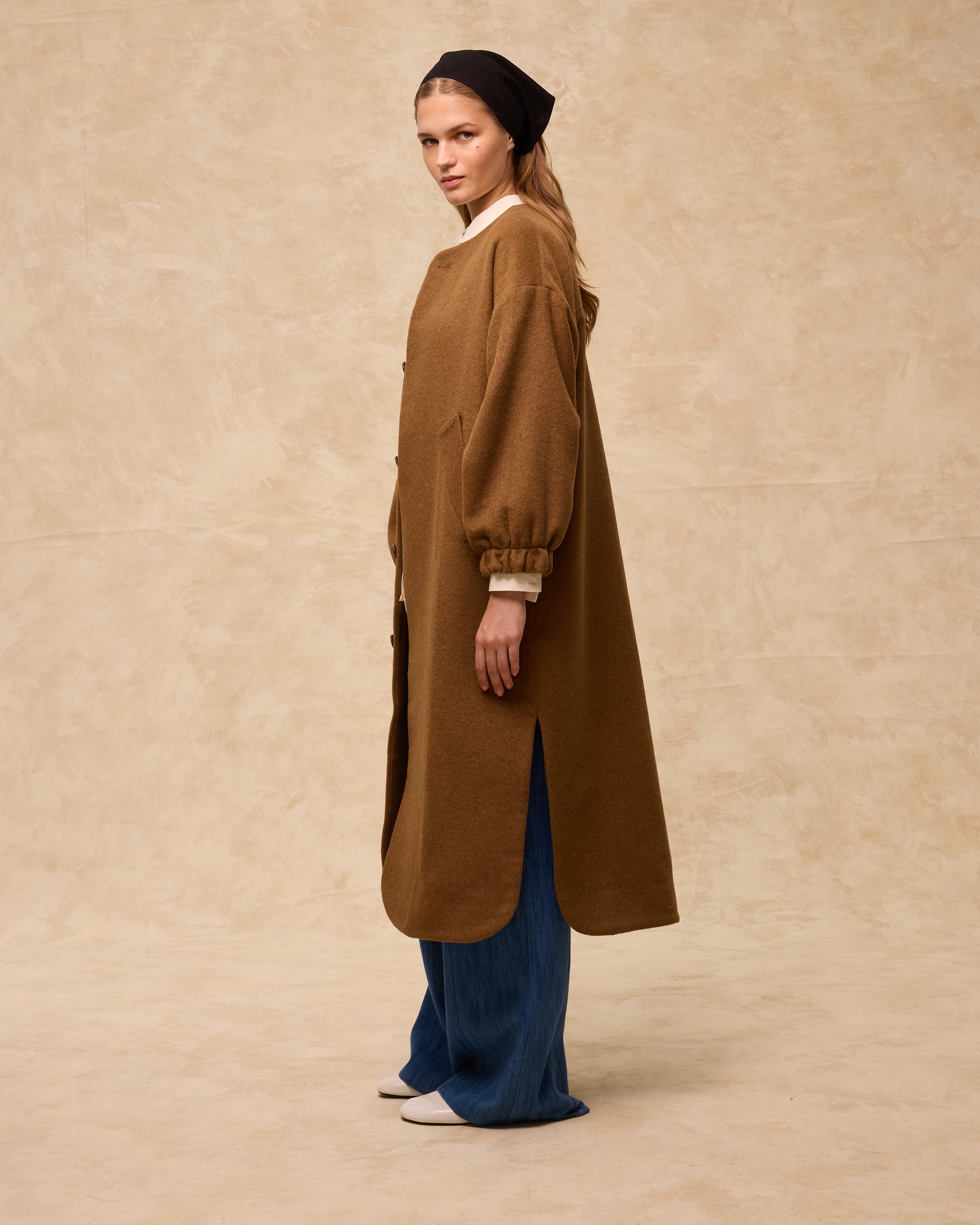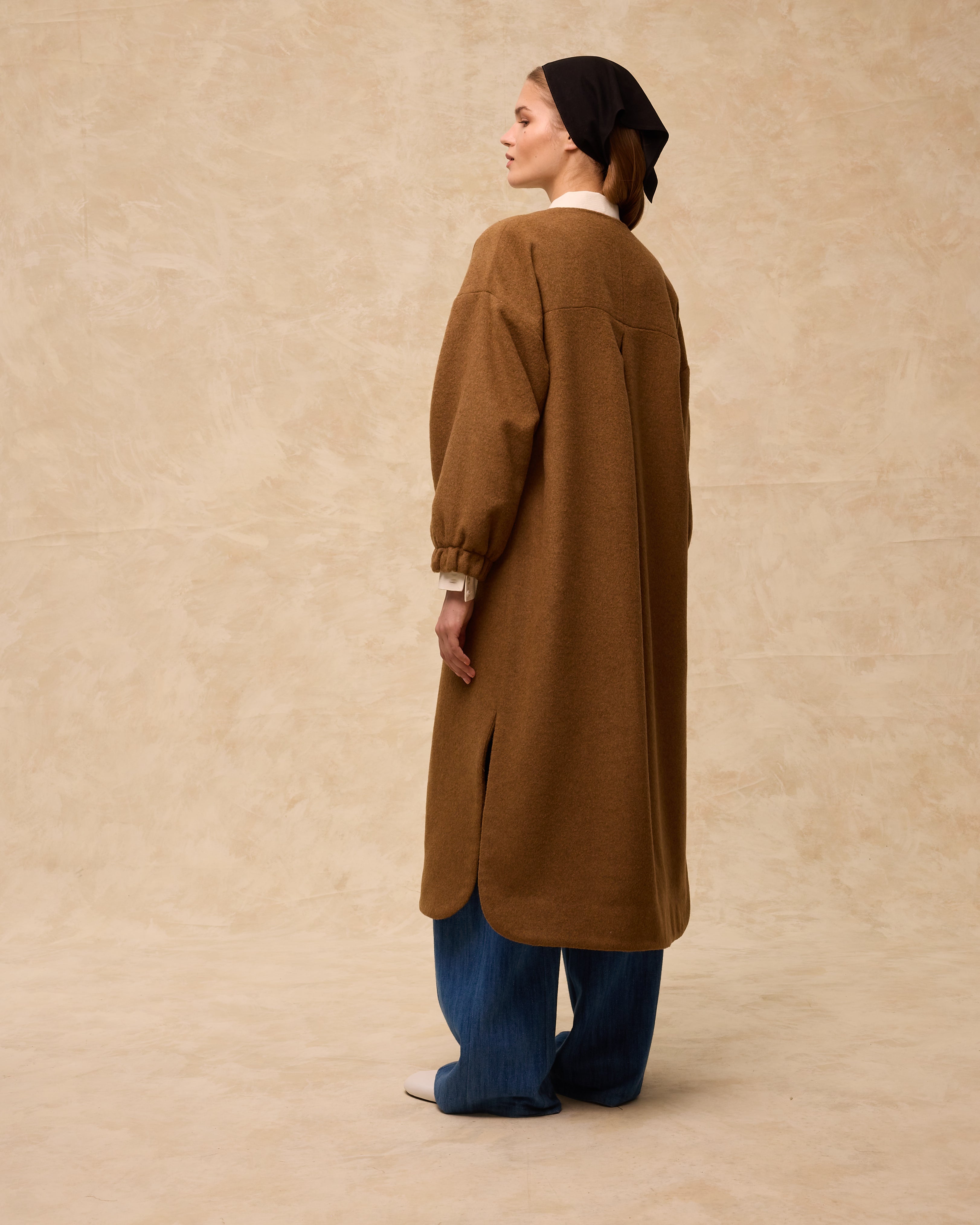 Con estructura suave, el abrigo Morganti está confeccionado en una cálida mezcla de lana y completamente forrado. Diseñado con una silueta relajada y bajo curvado, presenta un cuello redondo limpio, mangas oversize con puños elásticos y profundas aberturas laterales que aportan libertad de movimiento. Una hilera de botones al tono aporta un acabado minimalista.
