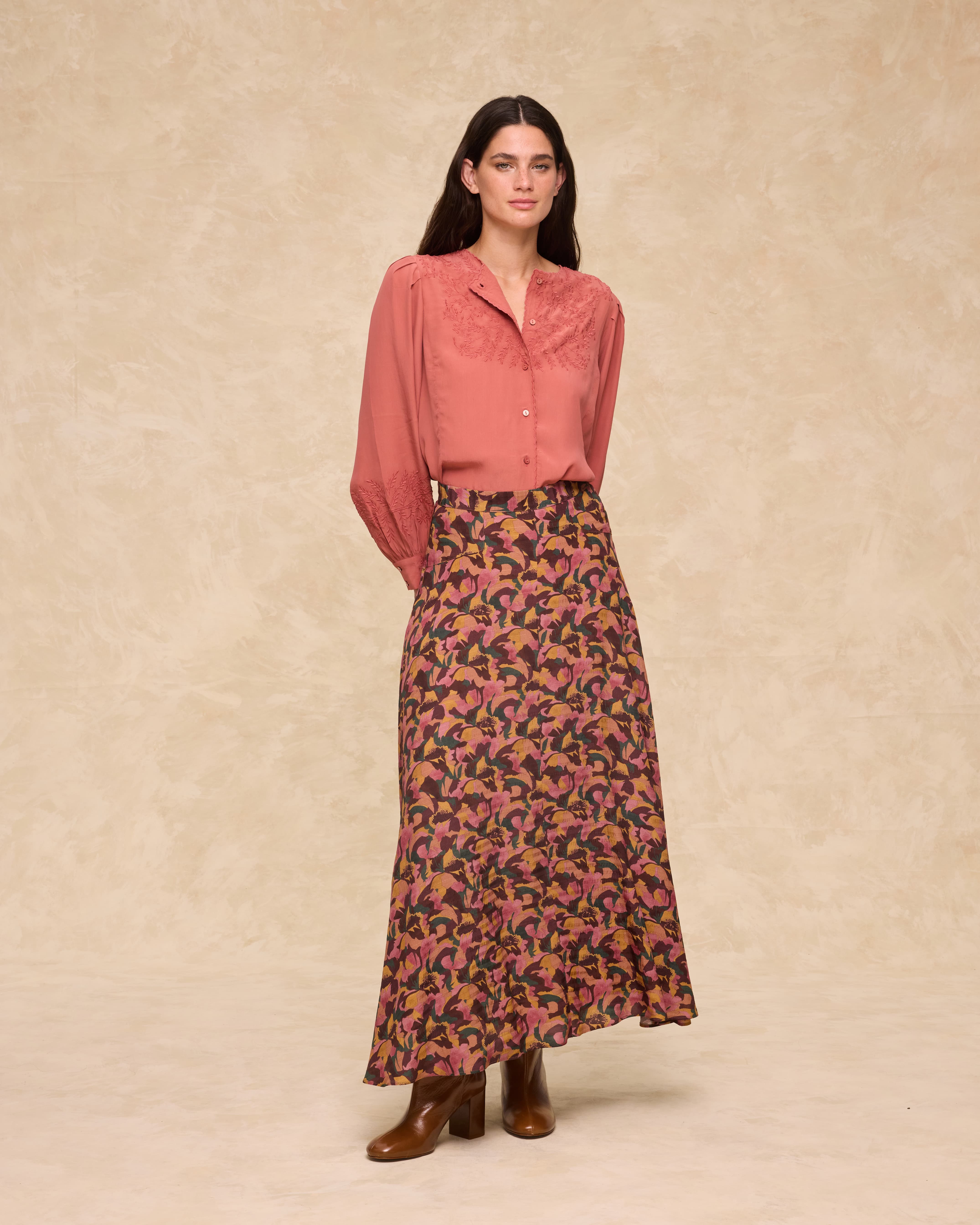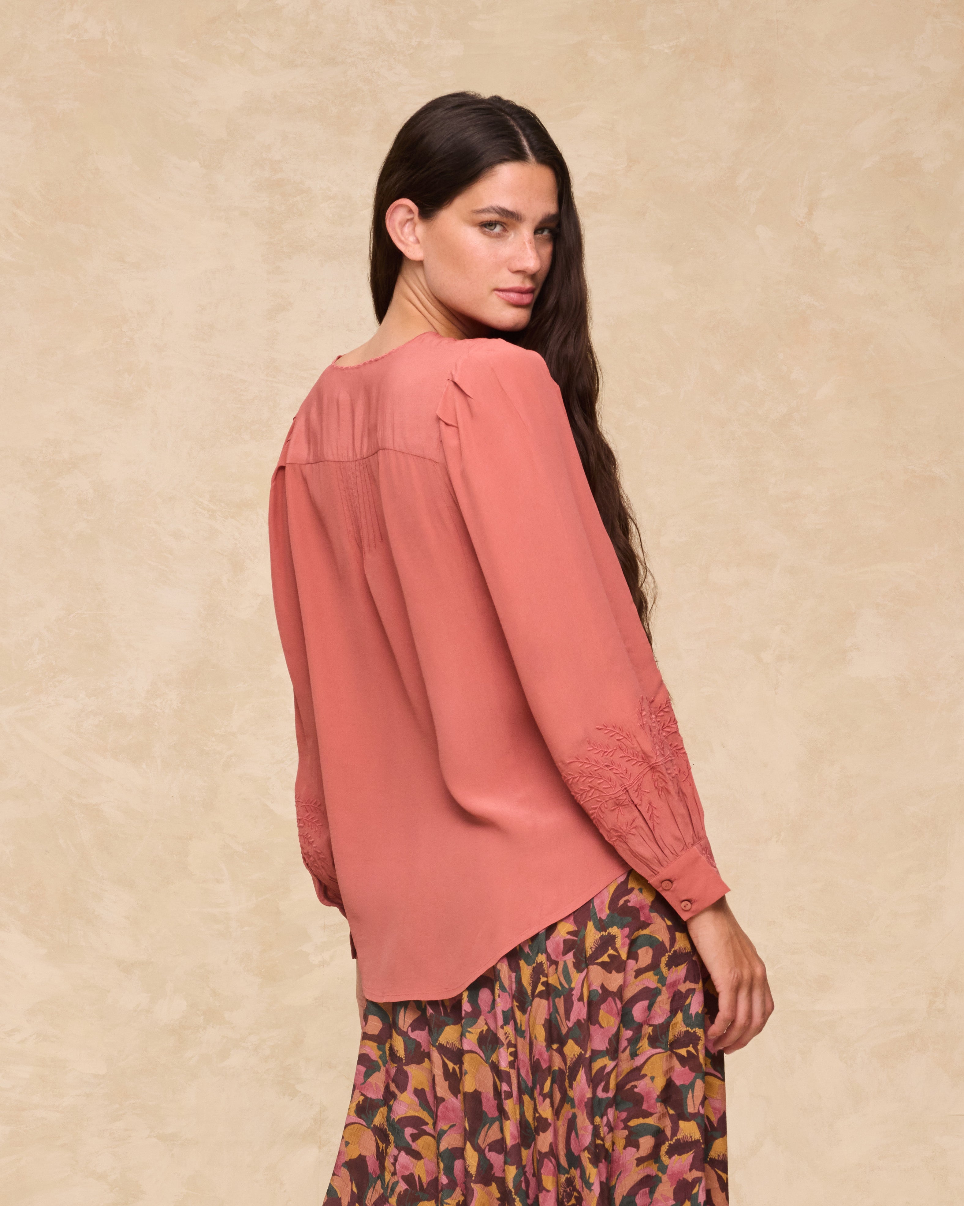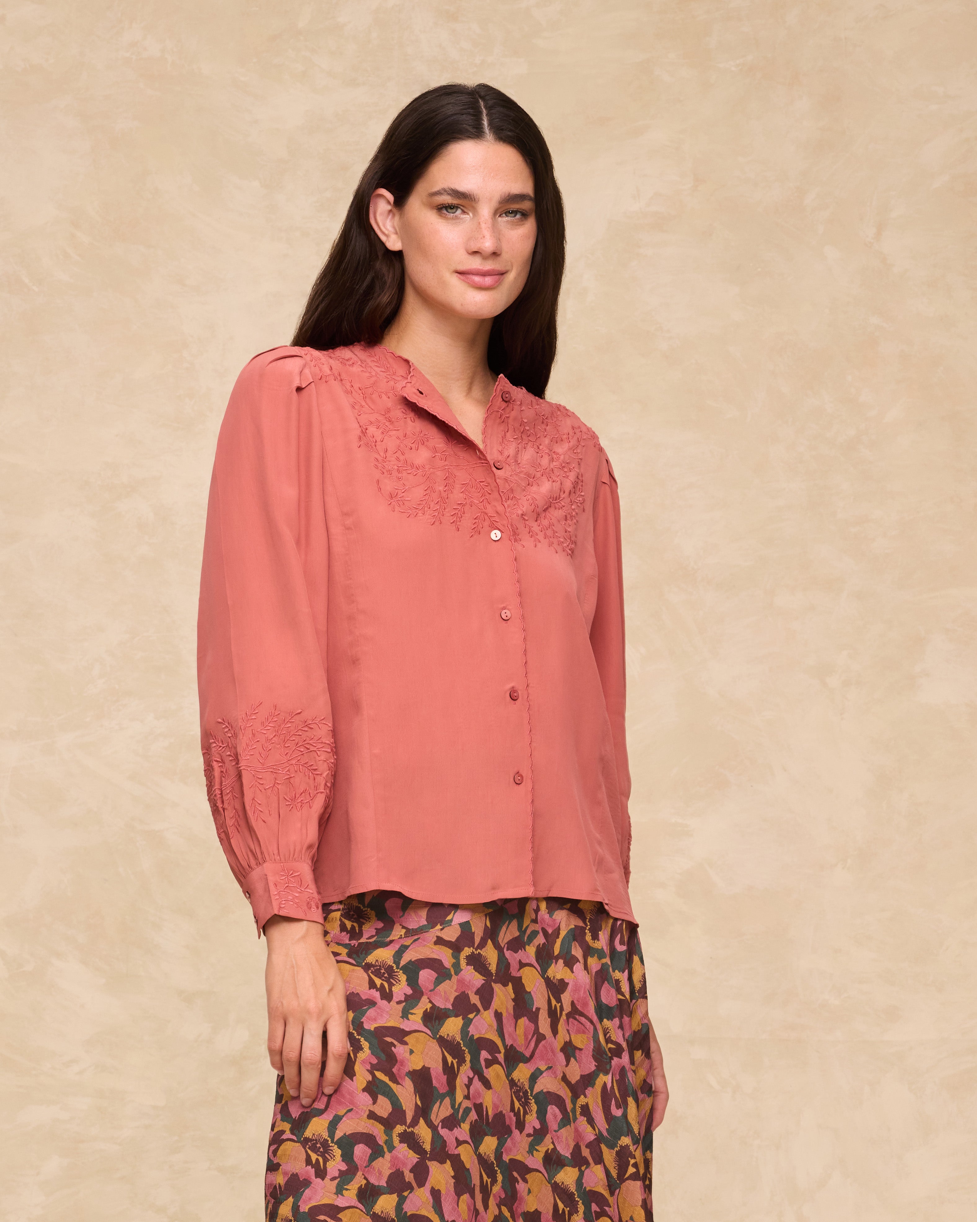 La blusa ALMA combina delicadeza y estilo atemporal con detalles bordados a tono sobre el pecho y los puños. Su silueta fluida, abotonadura frontal y mangas largas ligeramente abullonadas con puño camisero la convierten en una prenda versátil para elevar cualquier look, tanto formal como casual. Su tejido ligero proporciona un movimiento natural y una sensación suave al tacto.