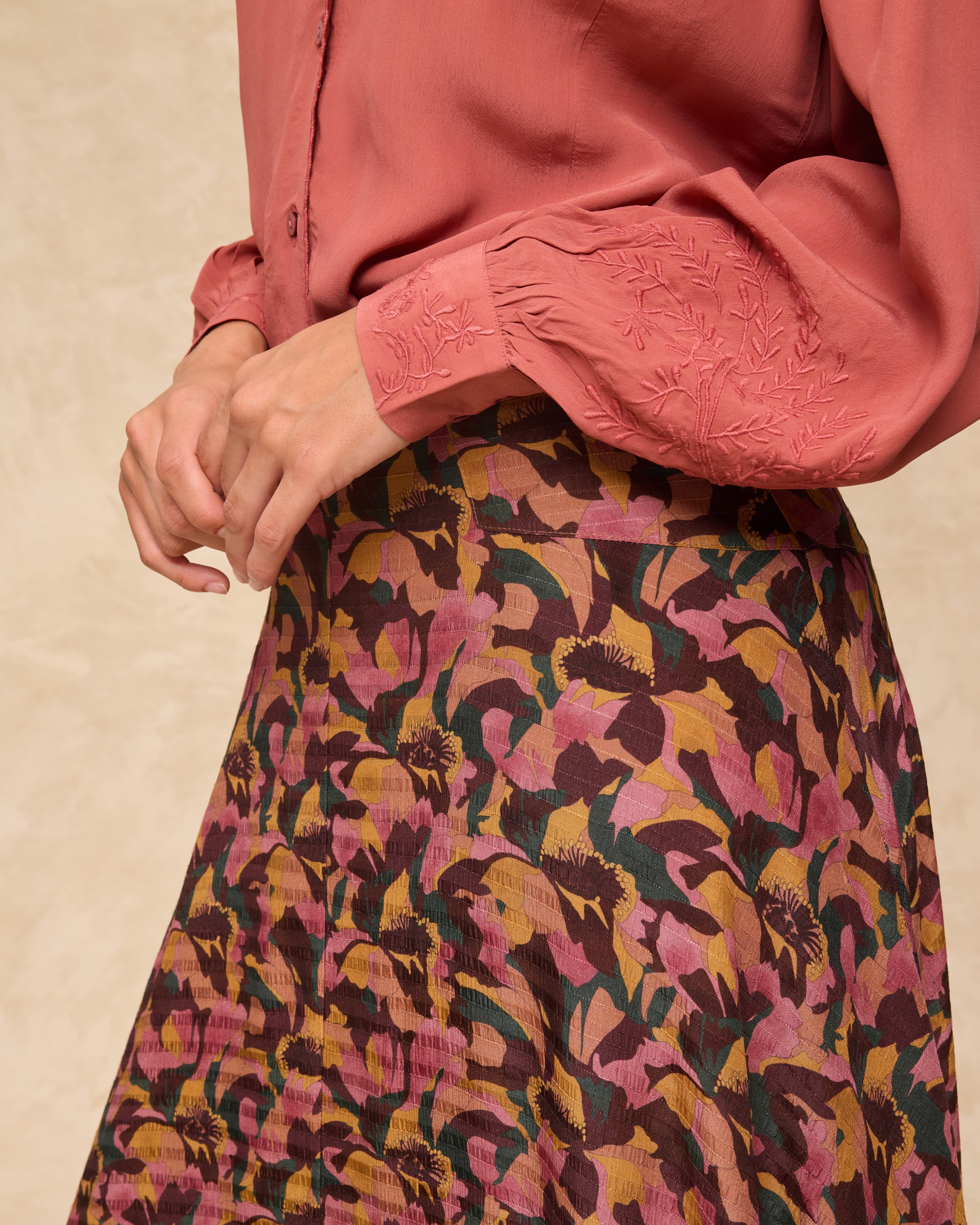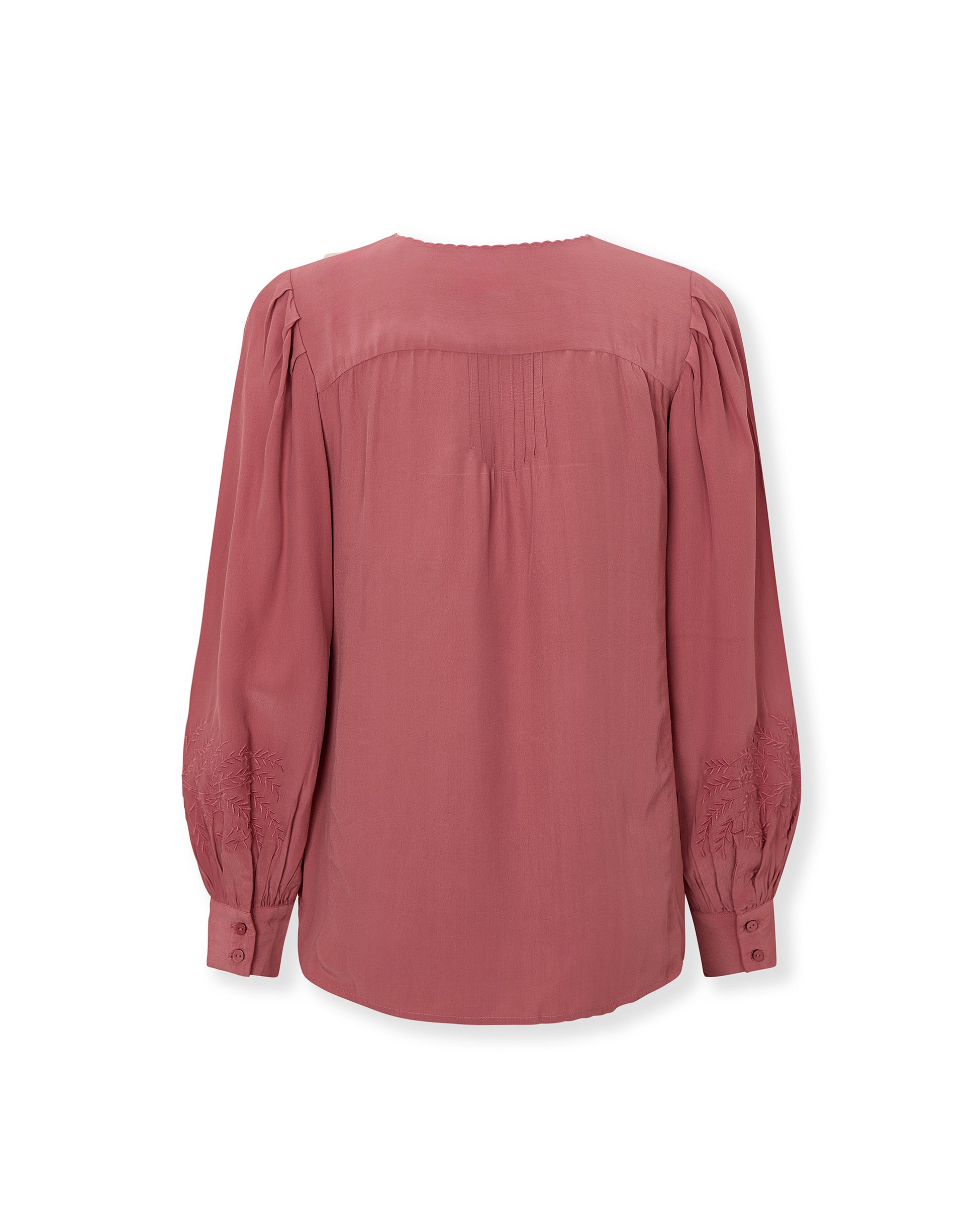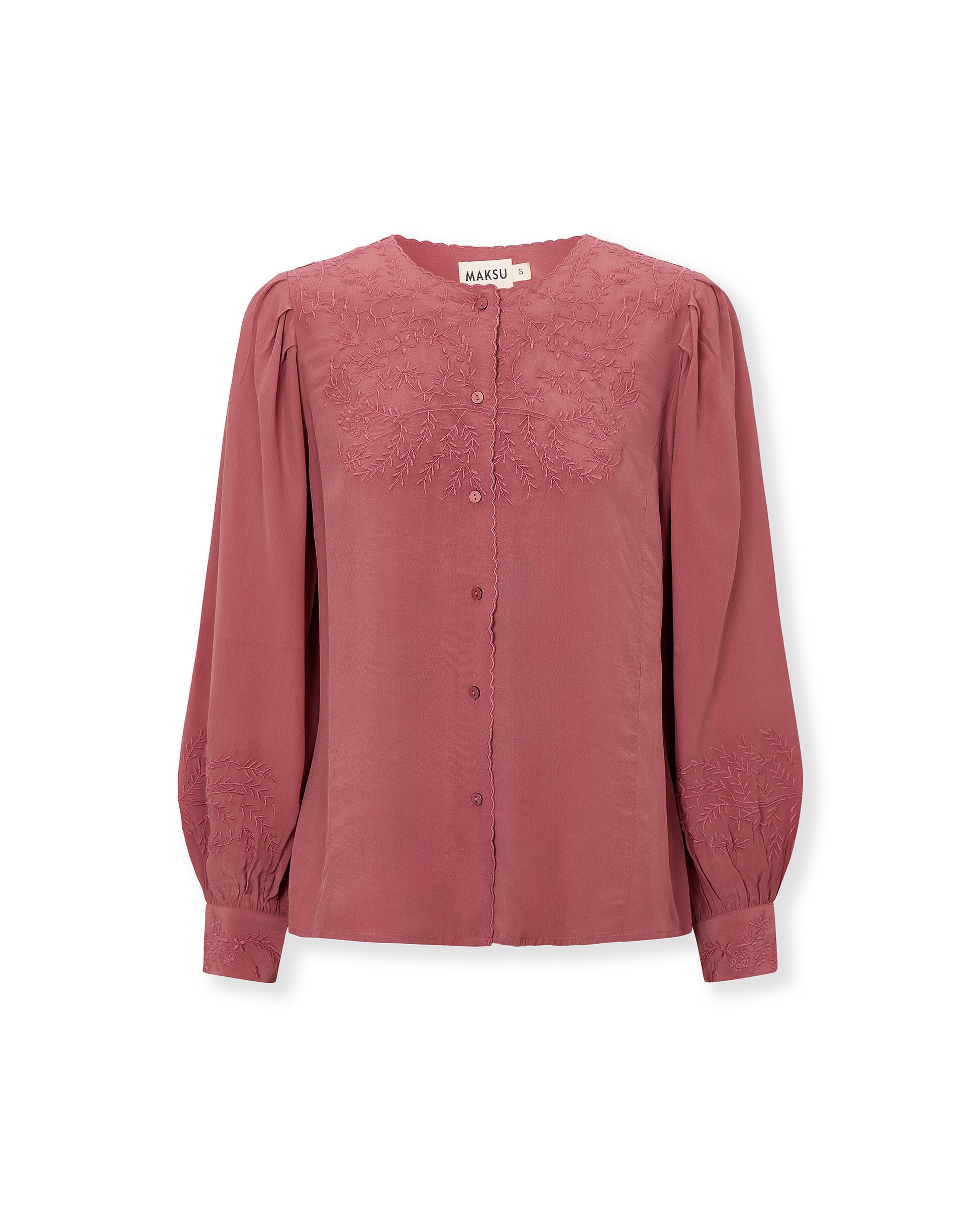 La blusa ALMA combina delicadeza y estilo atemporal con detalles bordados a tono sobre el pecho y los puños. Su silueta fluida, abotonadura frontal y mangas largas ligeramente abullonadas con puño camisero la convierten en una prenda versátil para elevar cualquier look, tanto formal como casual. Su tejido ligero proporciona un movimiento natural y una sensación suave al tacto.