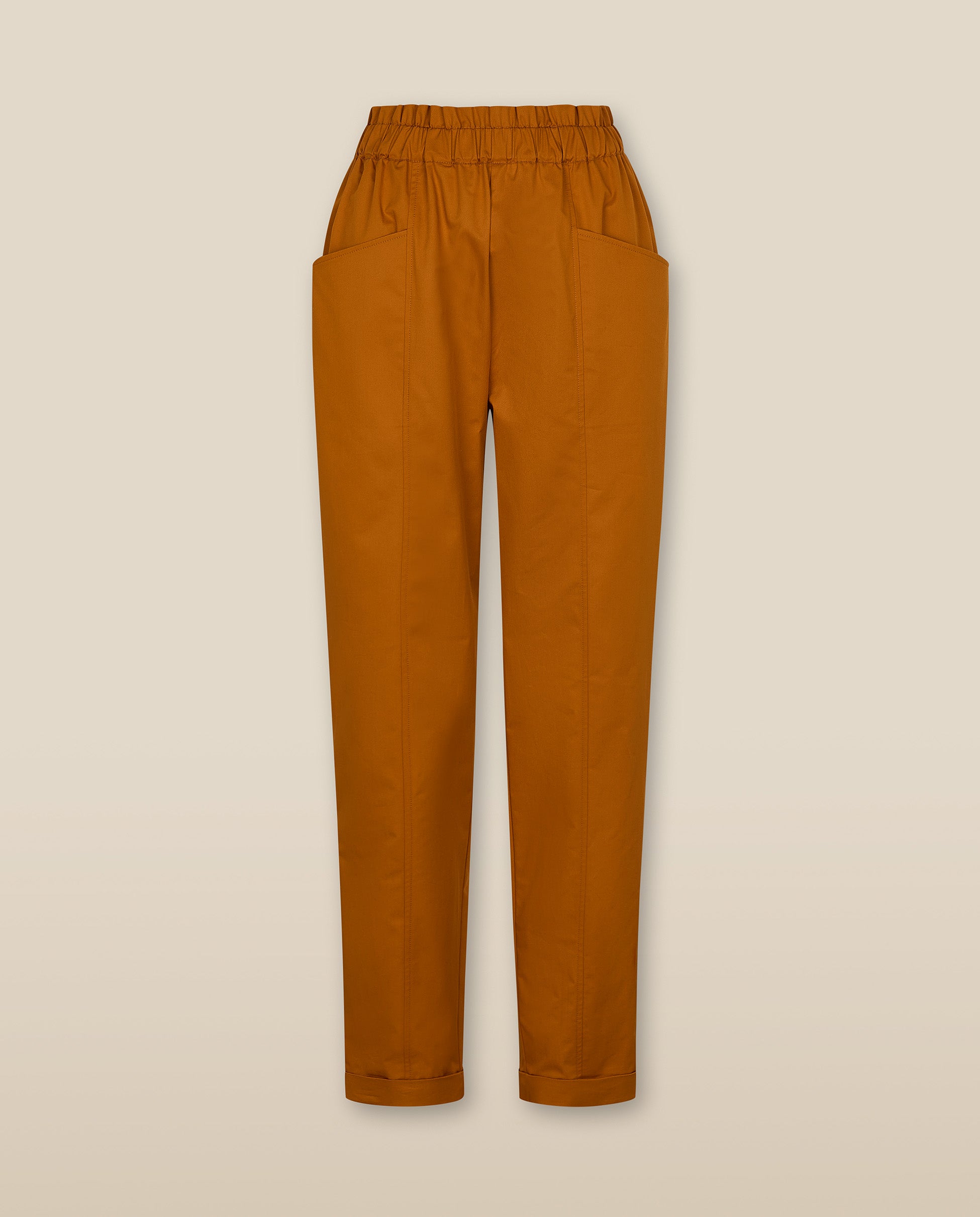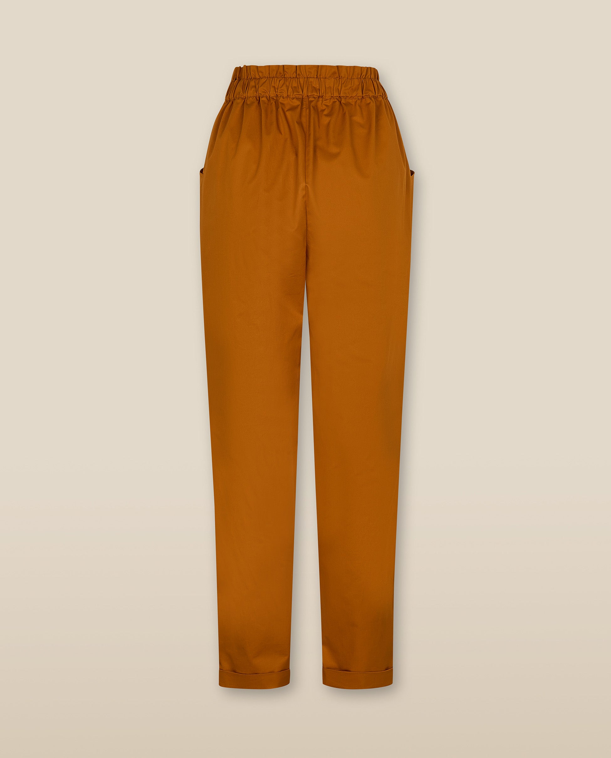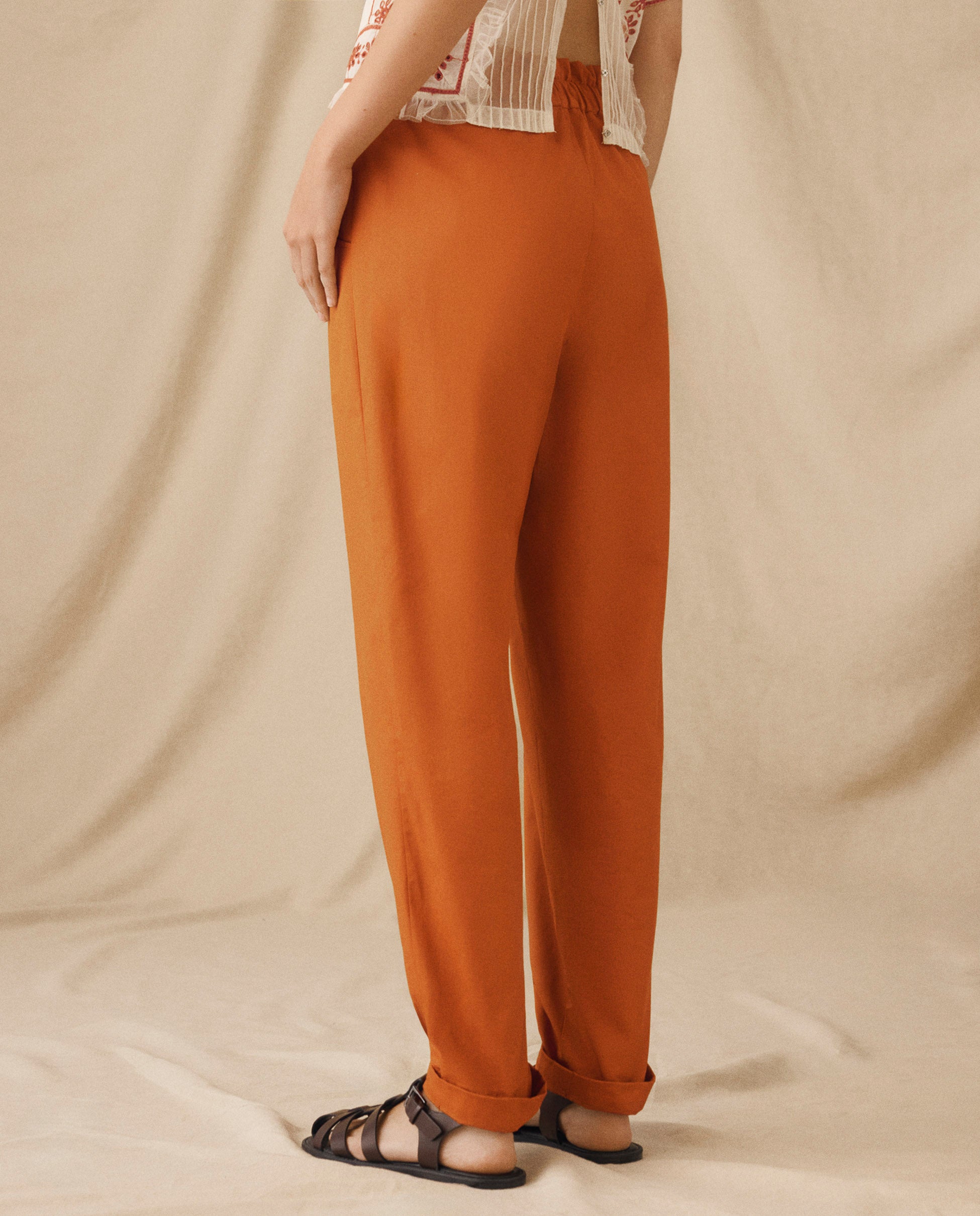 Actualiza tu fondo de armario con el pantalón Astros en tono naranja teja. Confeccionado en algodón firme con un sutil brillo, combina un corte tapered con un color vibrante y una estructura relajada para aportar frescura al estilo casual. La cintura elástica fruncida y los bolsillos frontales extragrandes añaden un aire utilitario, mientras que las costuras frontales limpias y el largo al tobillo aportan un acabado pulido.