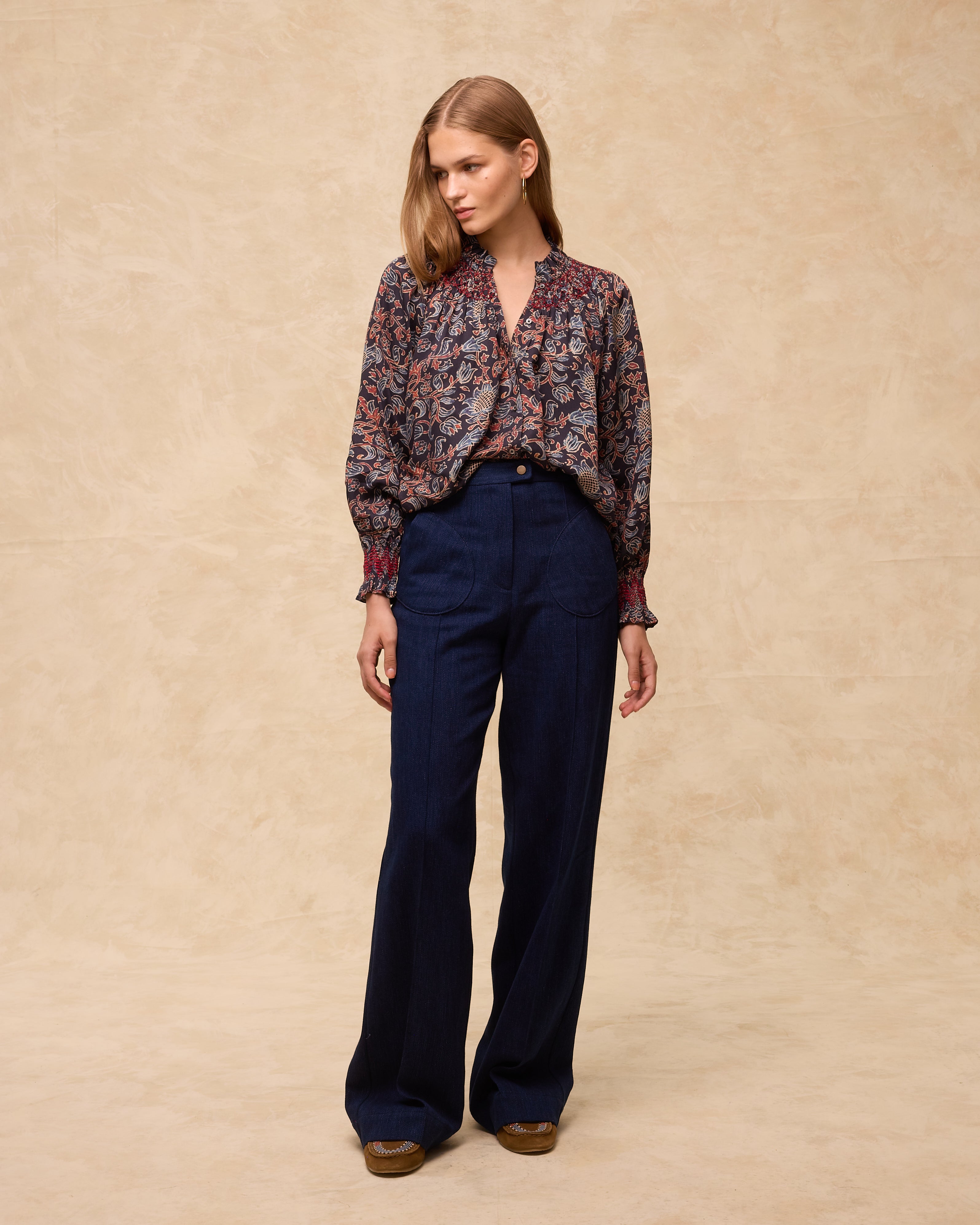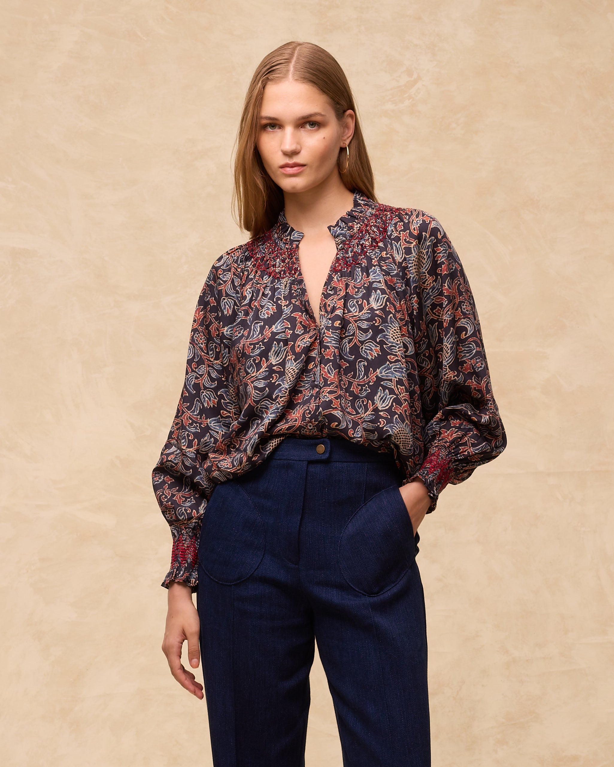 La blusa Maretoile luce un estampado floral de inspiración vintage en azul marino, rojo ladrillo y marfil suave. La silueta, ligeramente fruncida, está enmarcada por un cuello con nido de abeja hecho a mano y bordado a tono, mientras que las mangas largas terminan en puños fruncidos para aportar un volumen sutil. Una pieza refinada que equilibra artesanía y comodidad.