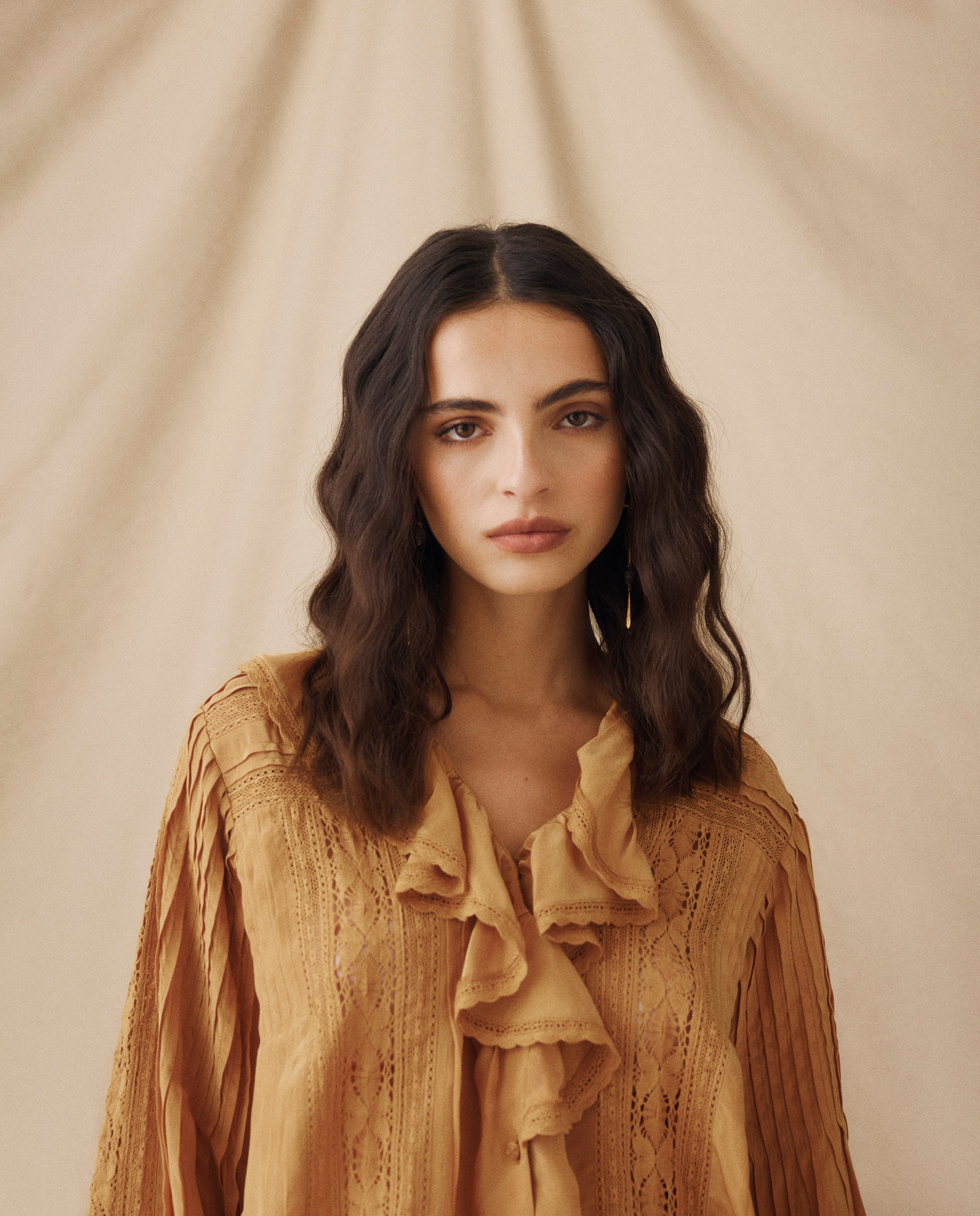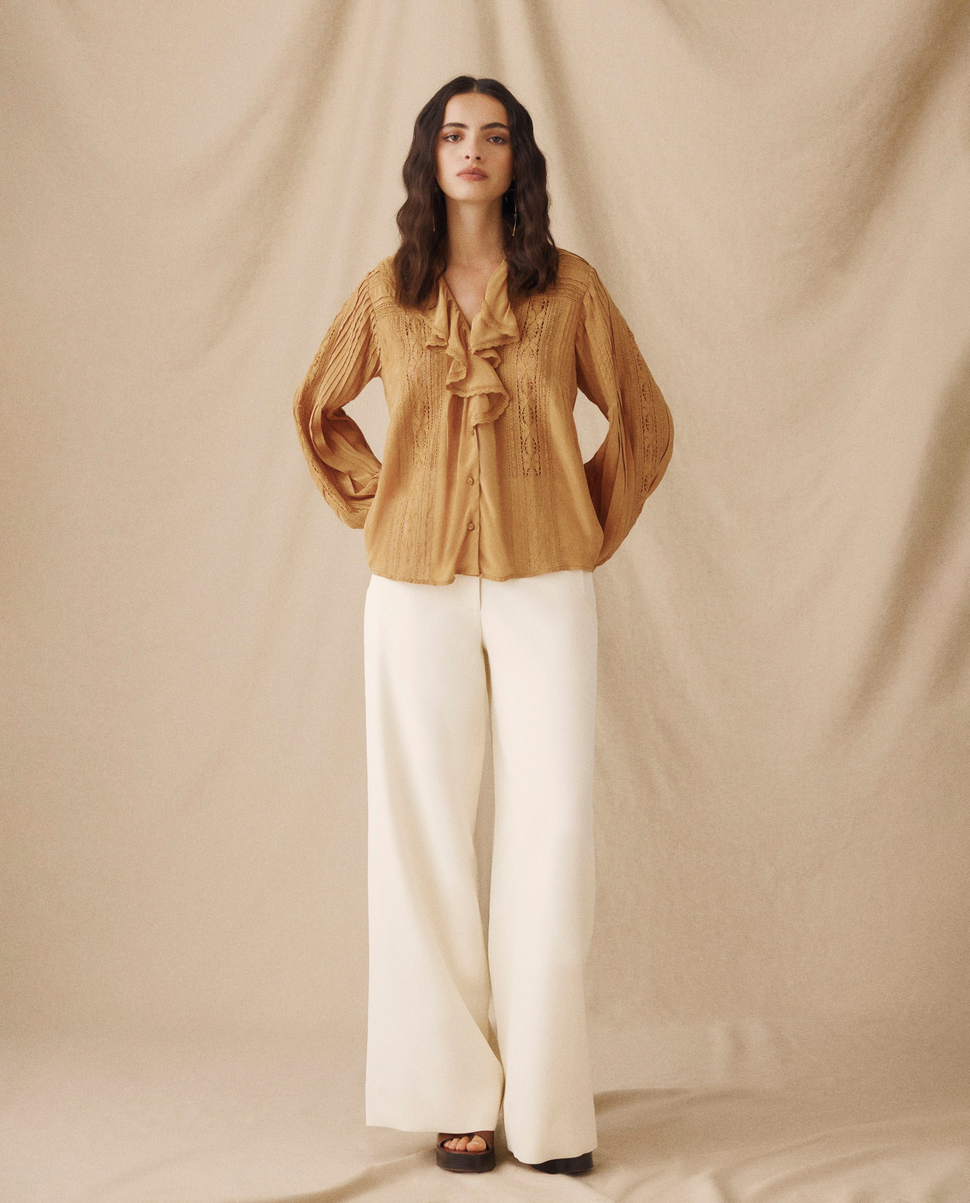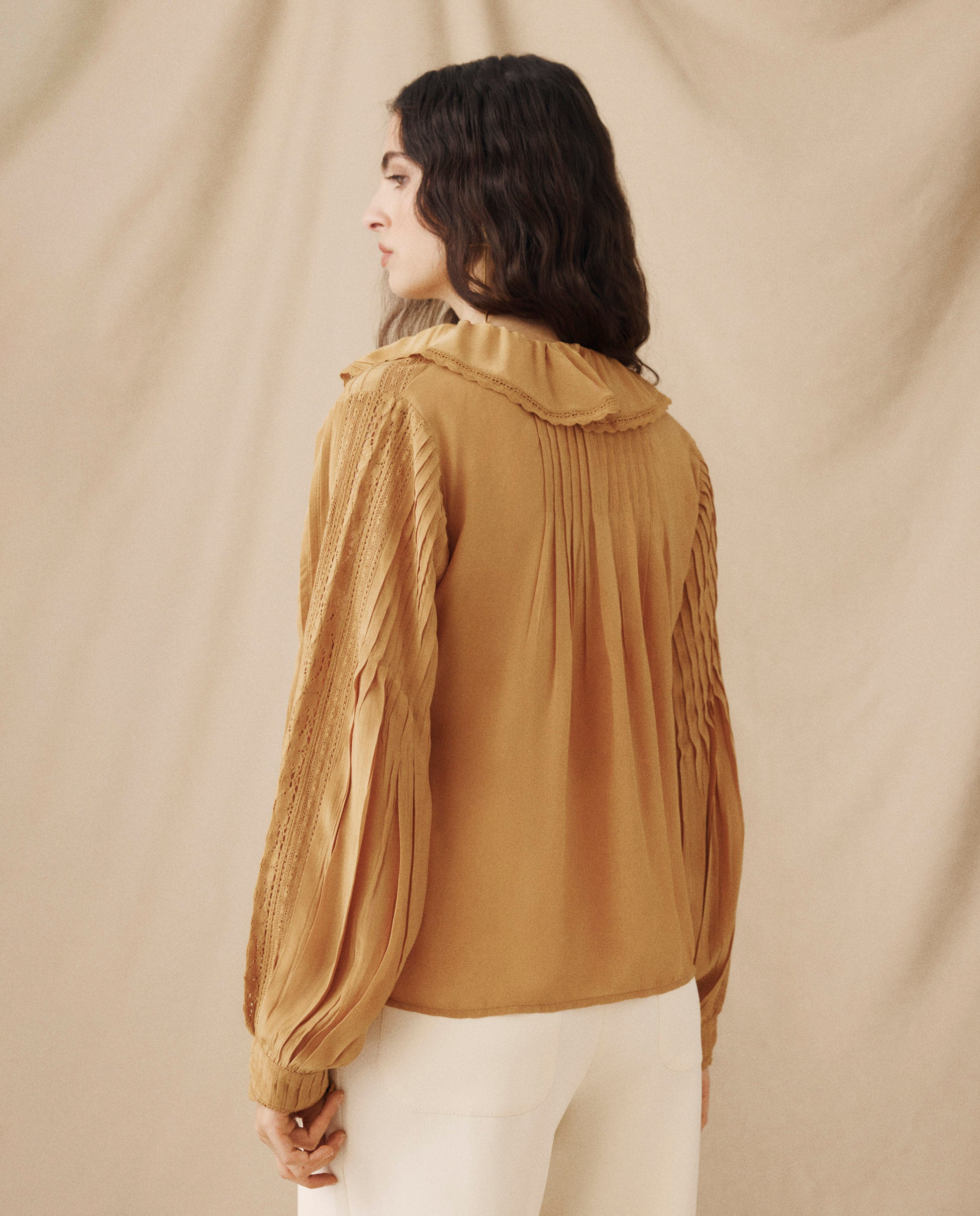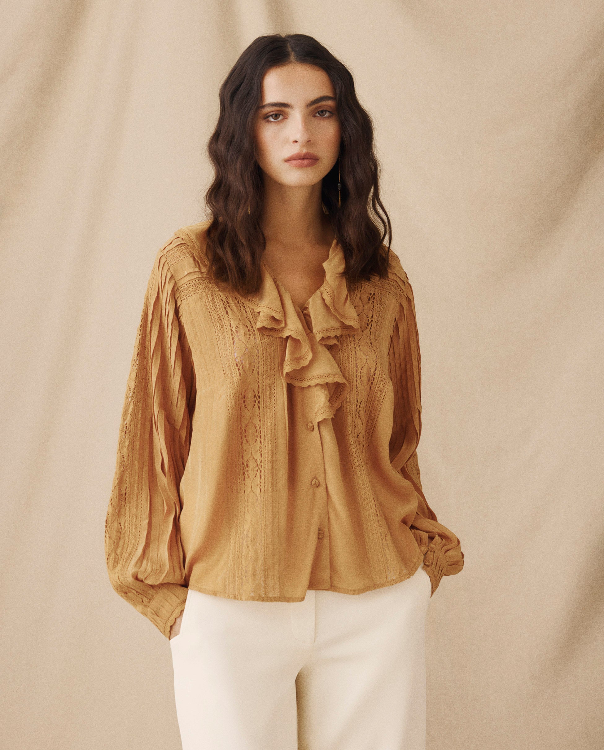 BASIL | Blusa con Volantes y Encaje en color Camel