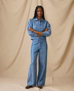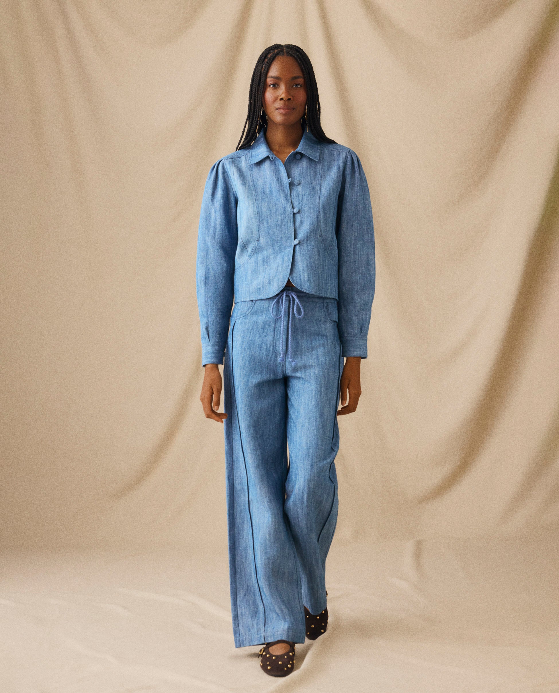 • Confeccionada en mezcla de algodón y lino en azul denim claro
