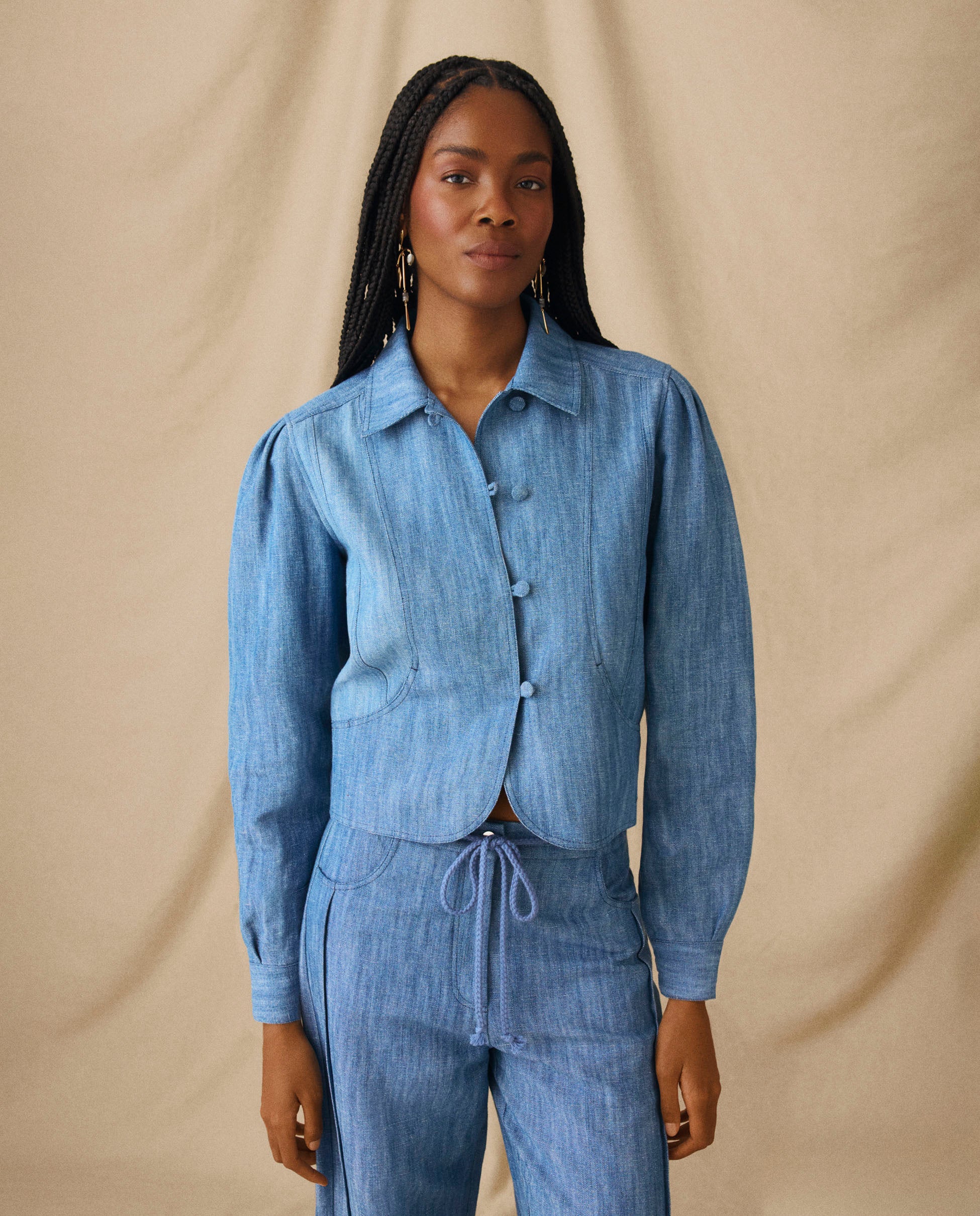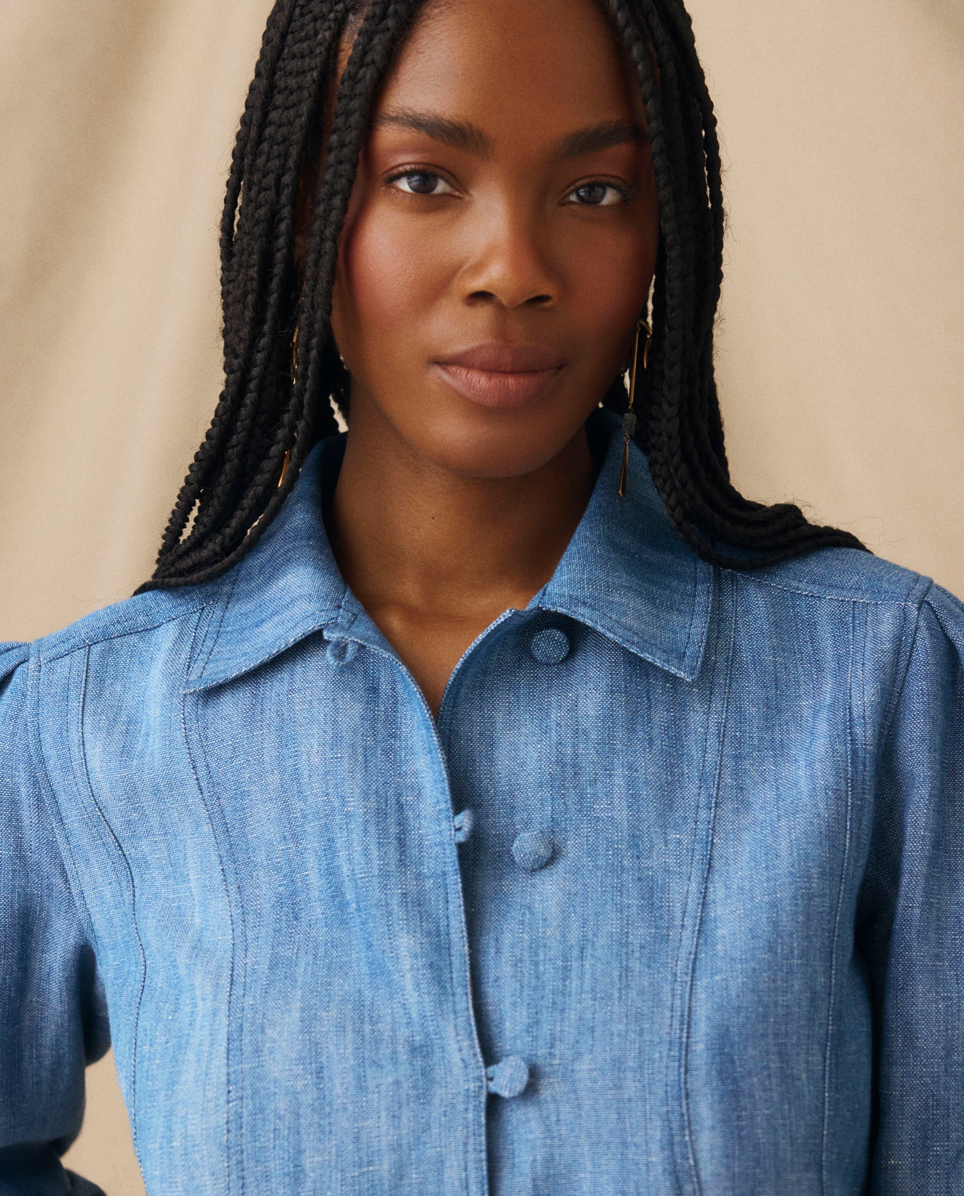 Confeccionada en una mezcla ligera de algodón y lino, la chaqueta Anika equilibra estructura y suavidad. Diseñada con frunces sutiles en los hombros y costuras curvas que perfilan el cuerpo, se abrocha con botones forrados al tono y termina a la altura de la cintura, creando una silueta limpia y moderna.