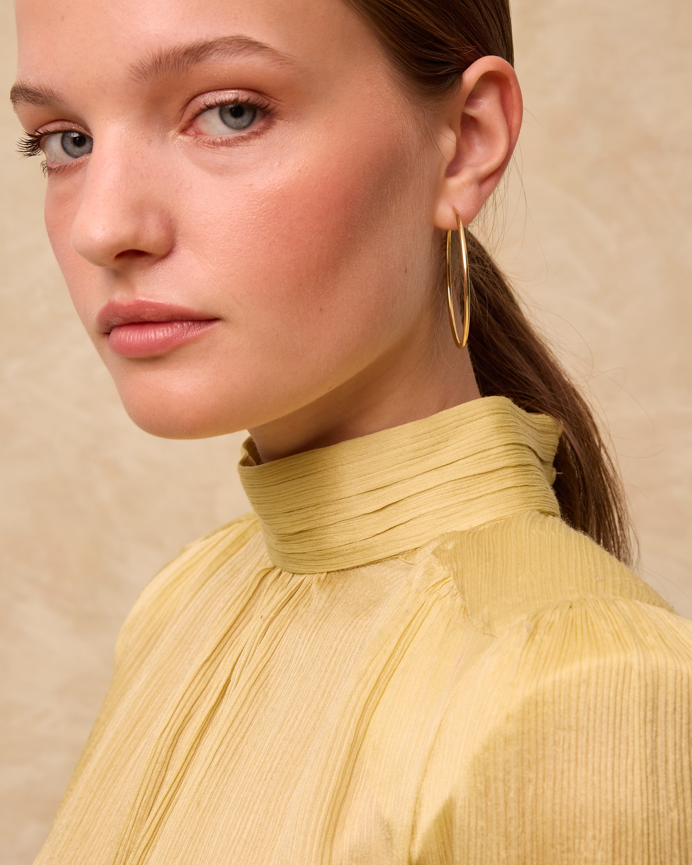 Elegant and softly structured, the Carol blouse is crafted from 100% silk in a luminous pale chartreuse tone. Designed with subtle pleating through the front, it falls to a relaxed silhouette with softly padded shoulders for gentle shape. The gathered high neckline and structured cuffs bring refined detail, while a delicate keyhole with tonal button fastening finishes the back.