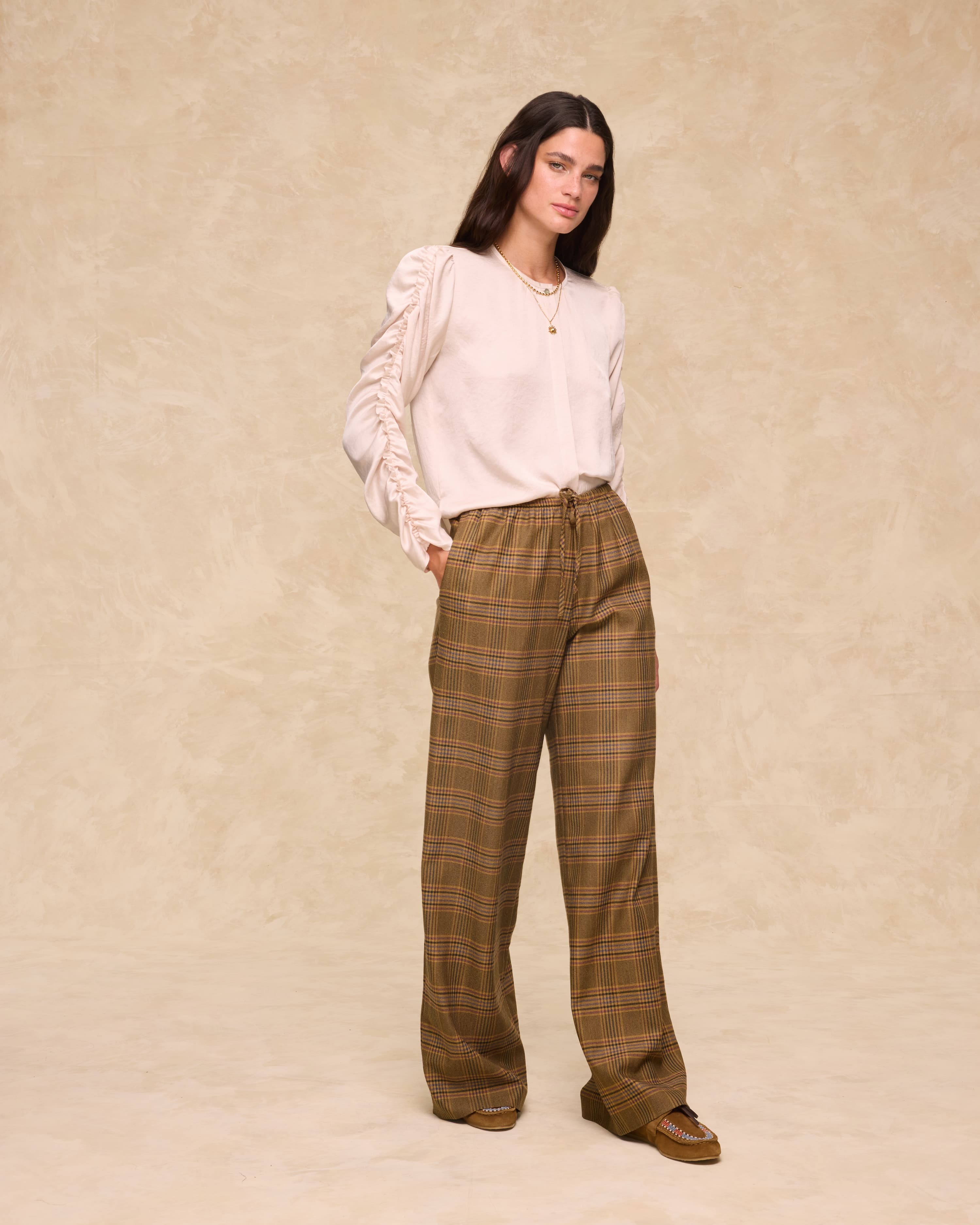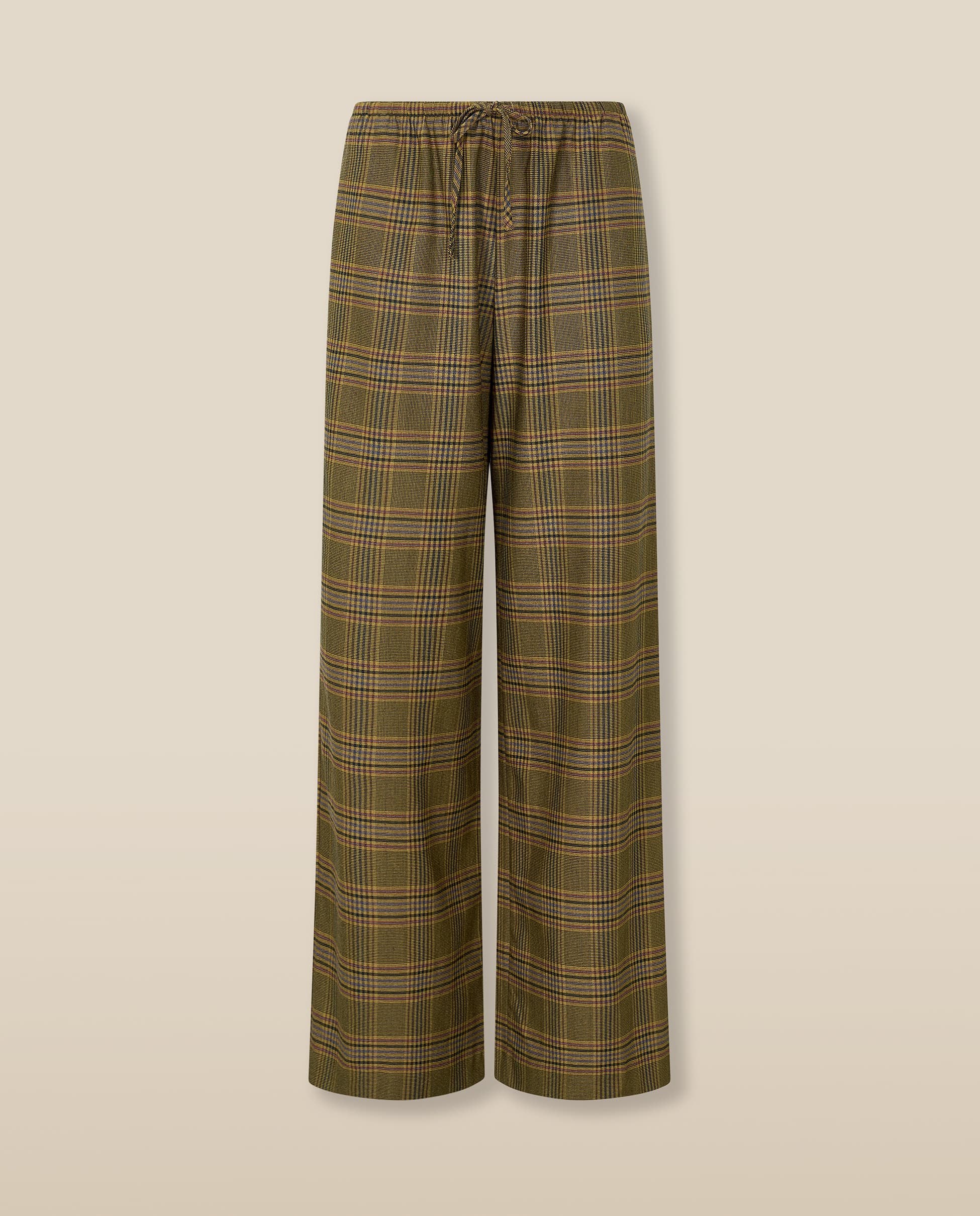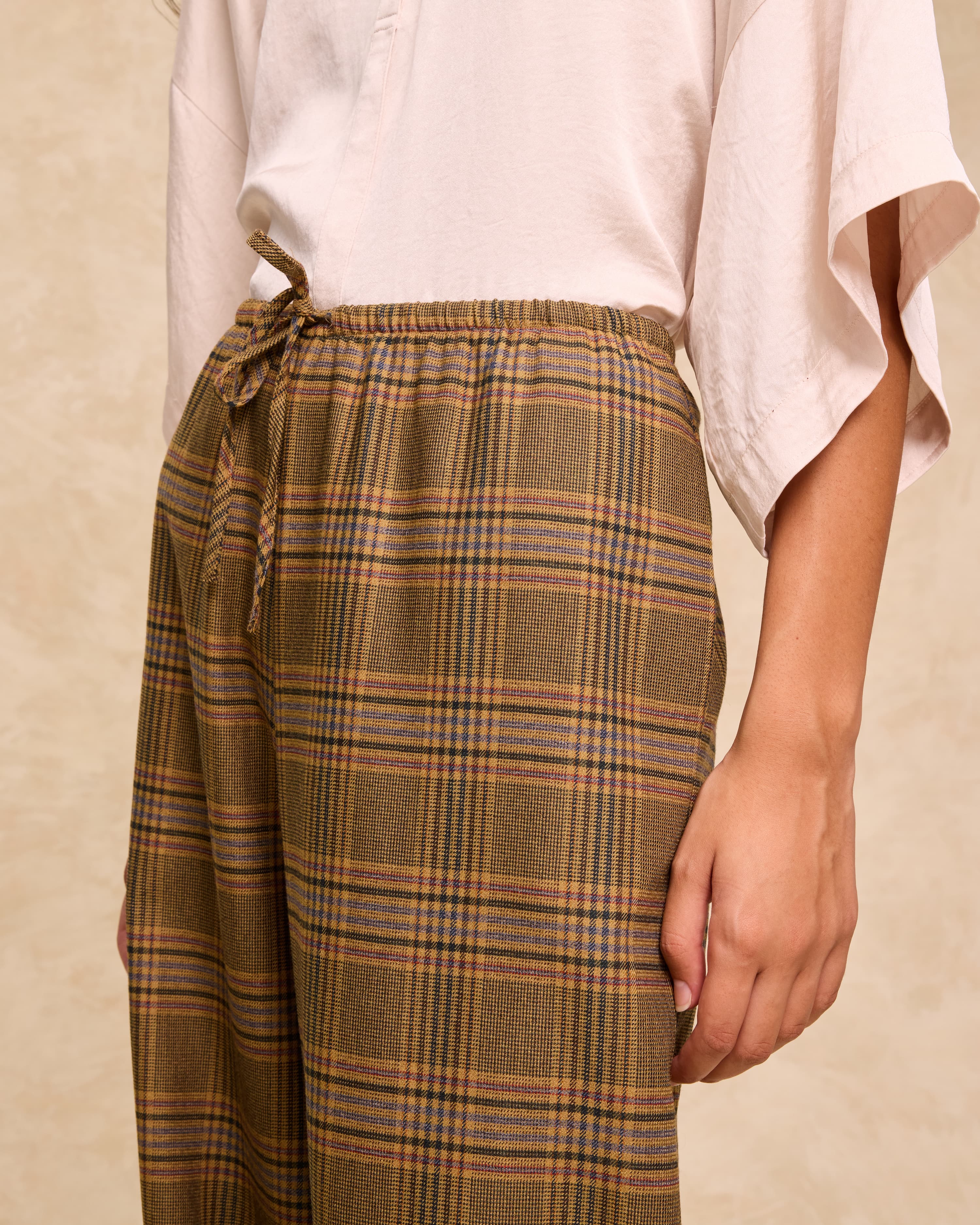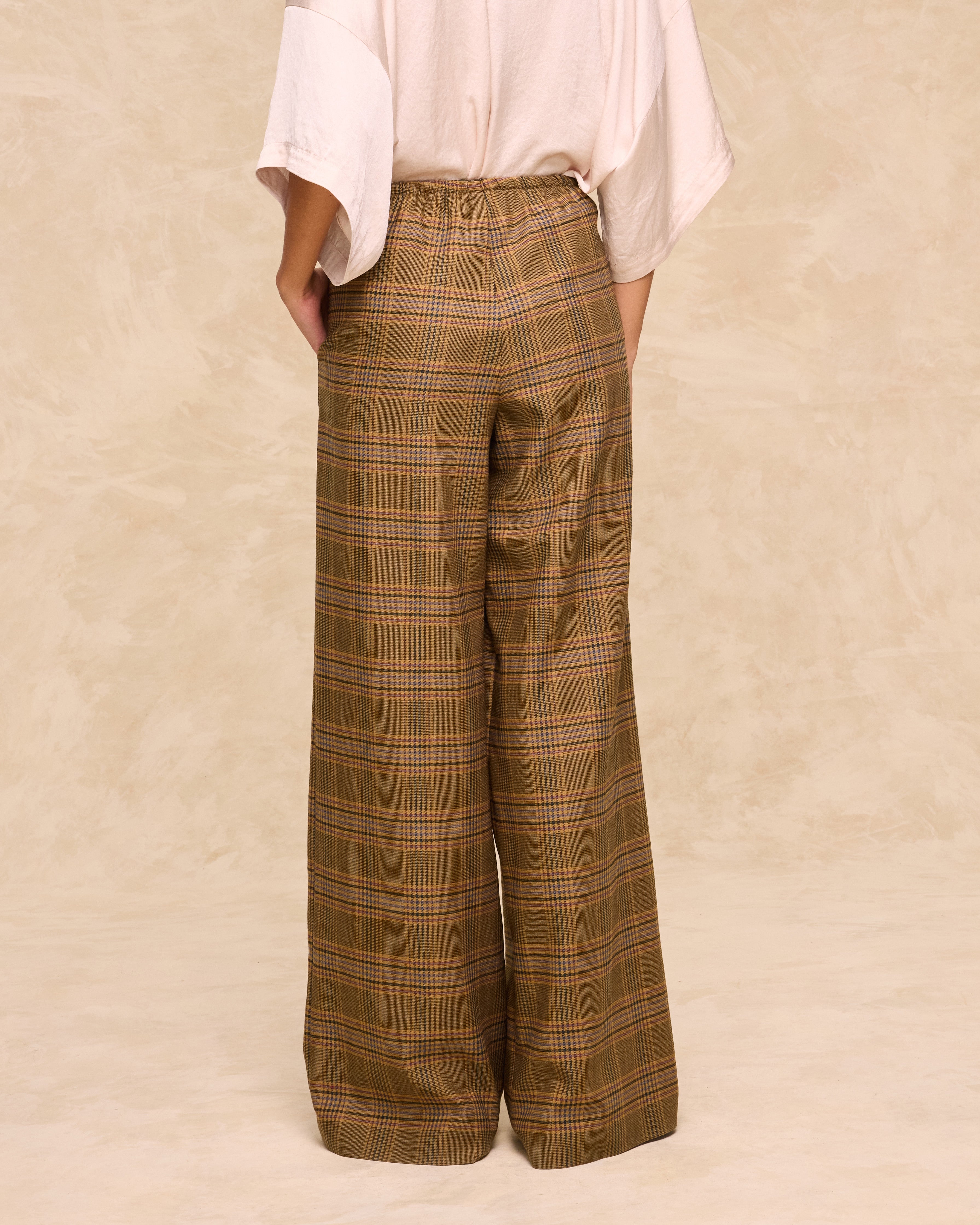 Un esencial relajado en un cuadro refinado, los pantalones Henry están confeccionados en un tejido italiano tejido en ricos tonos mostaza con suaves acentos en violeta y cálido marrón. Caen en una silueta fluida de pierna ancha con cintura ajustable mediante cordón. Los bolsillos laterales aportan comodidad para el día a día, ya sea llevados solos o combinados con la chaqueta Francine a juego.