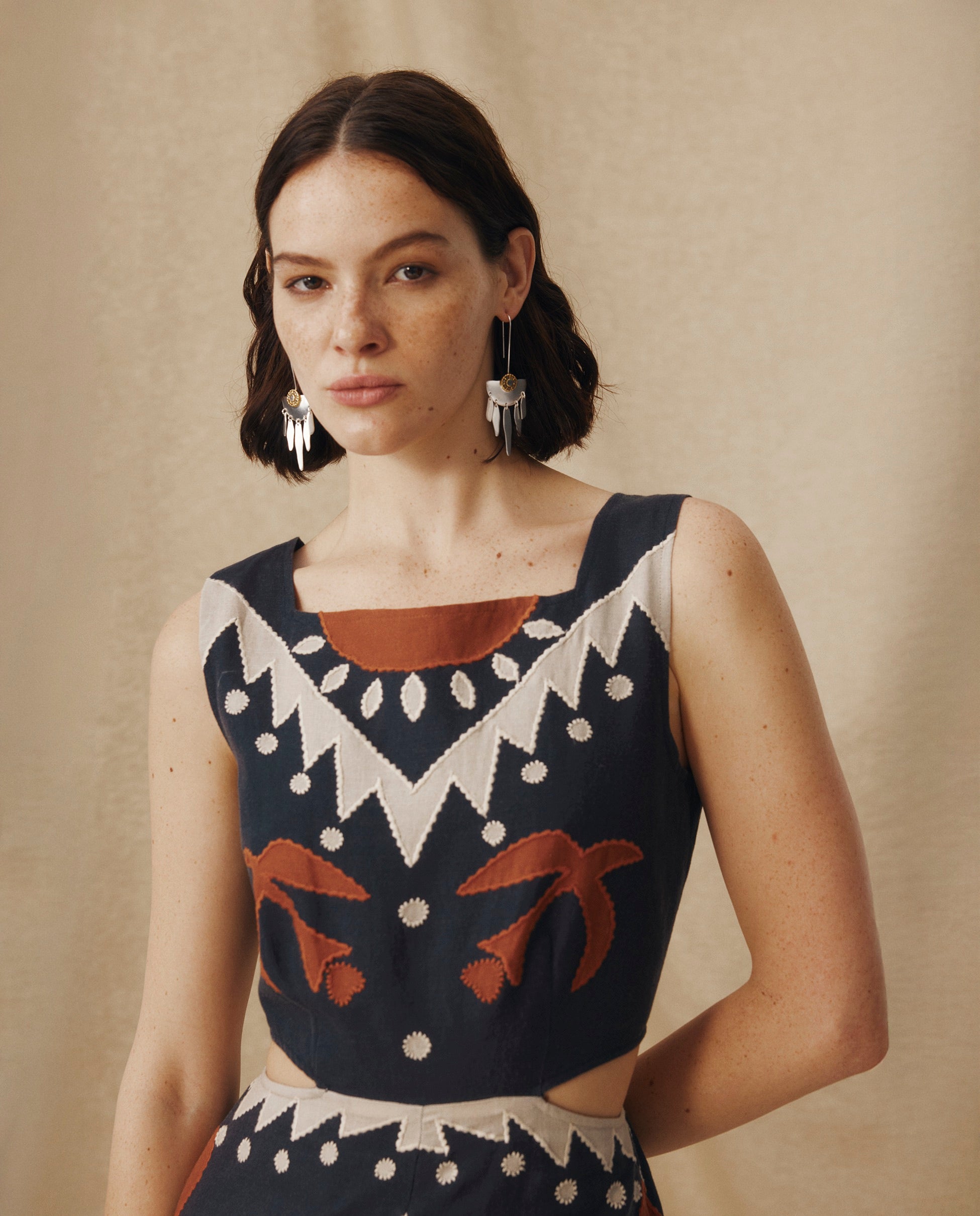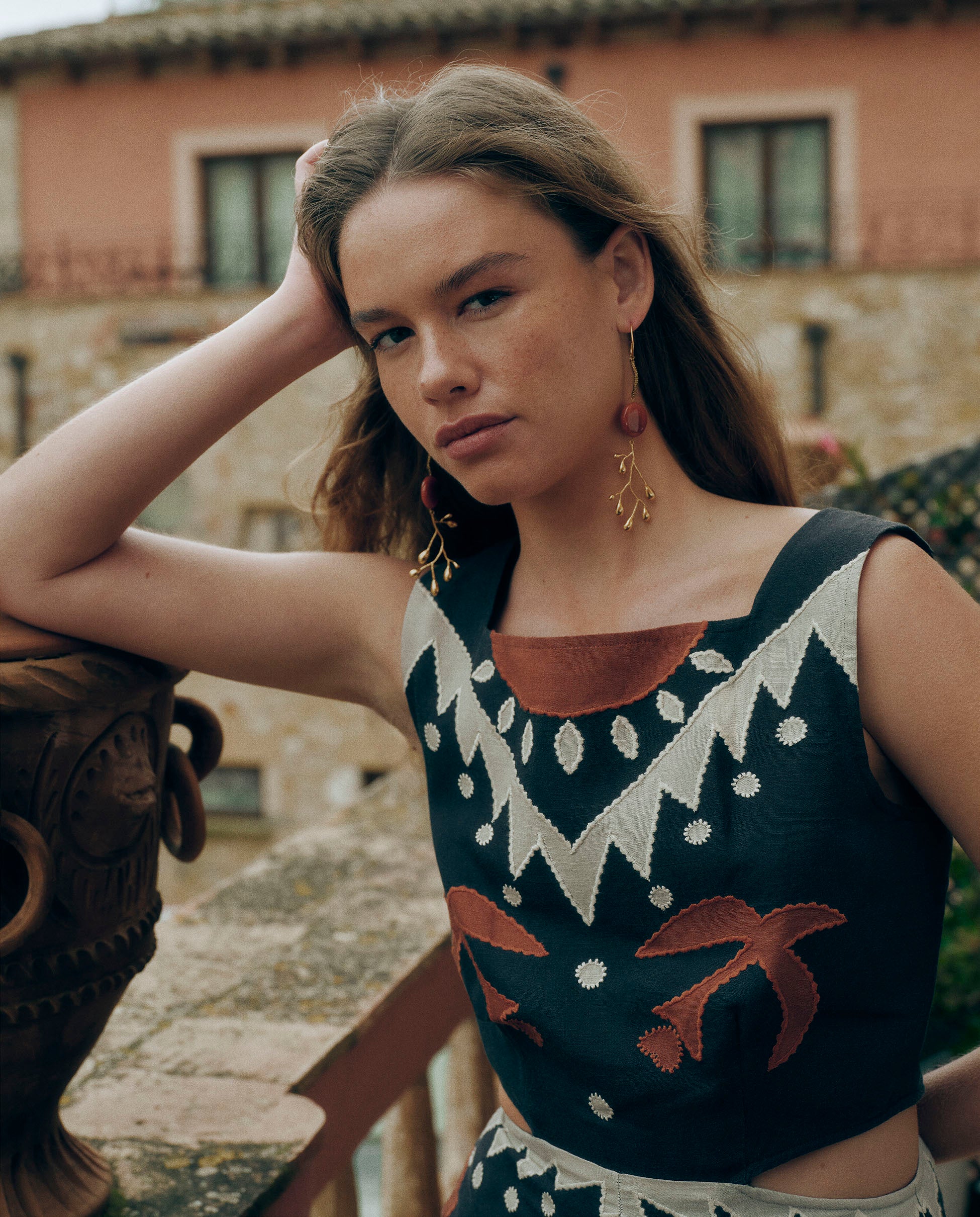 • Bordado geométrico en tonos terracota y crudo