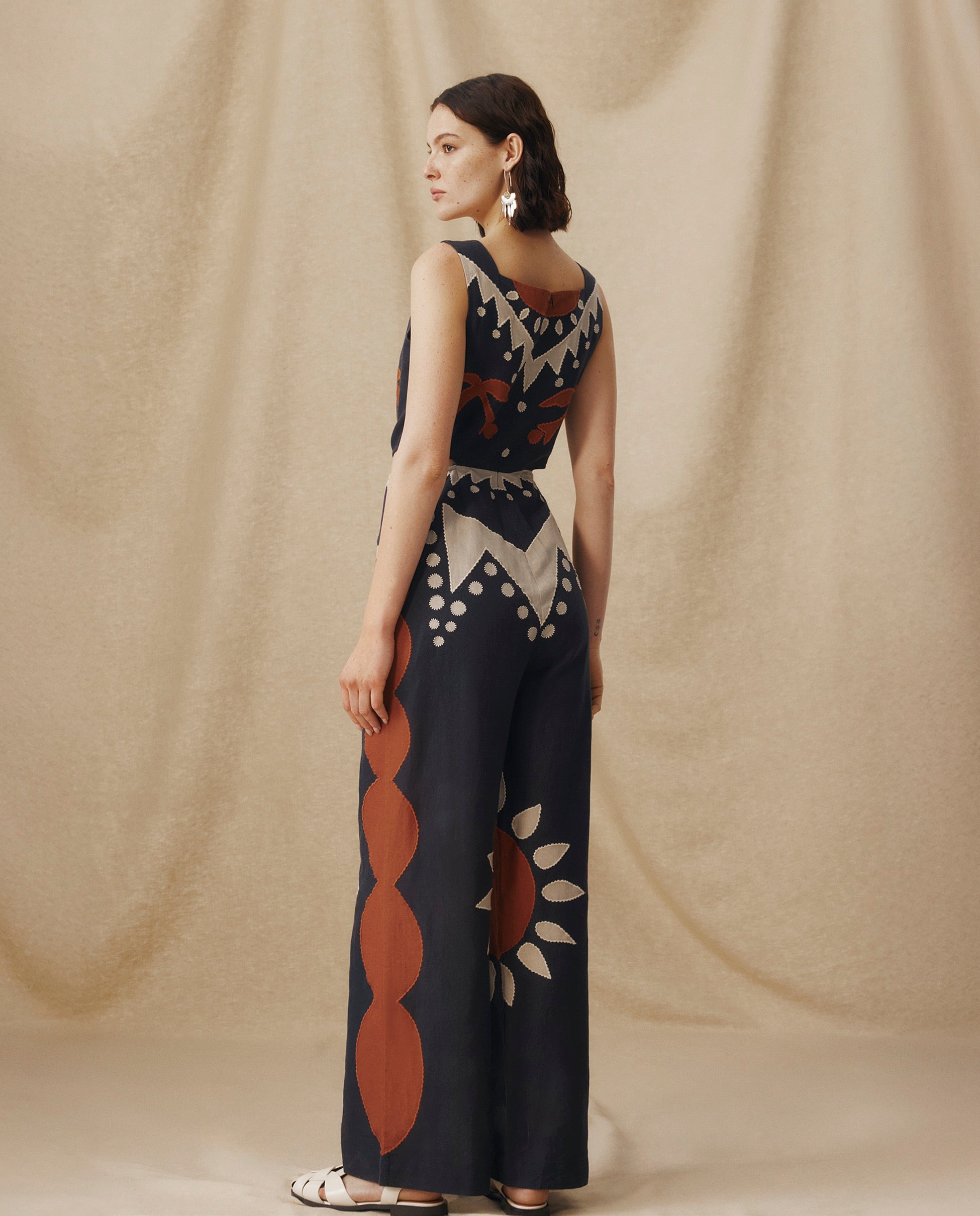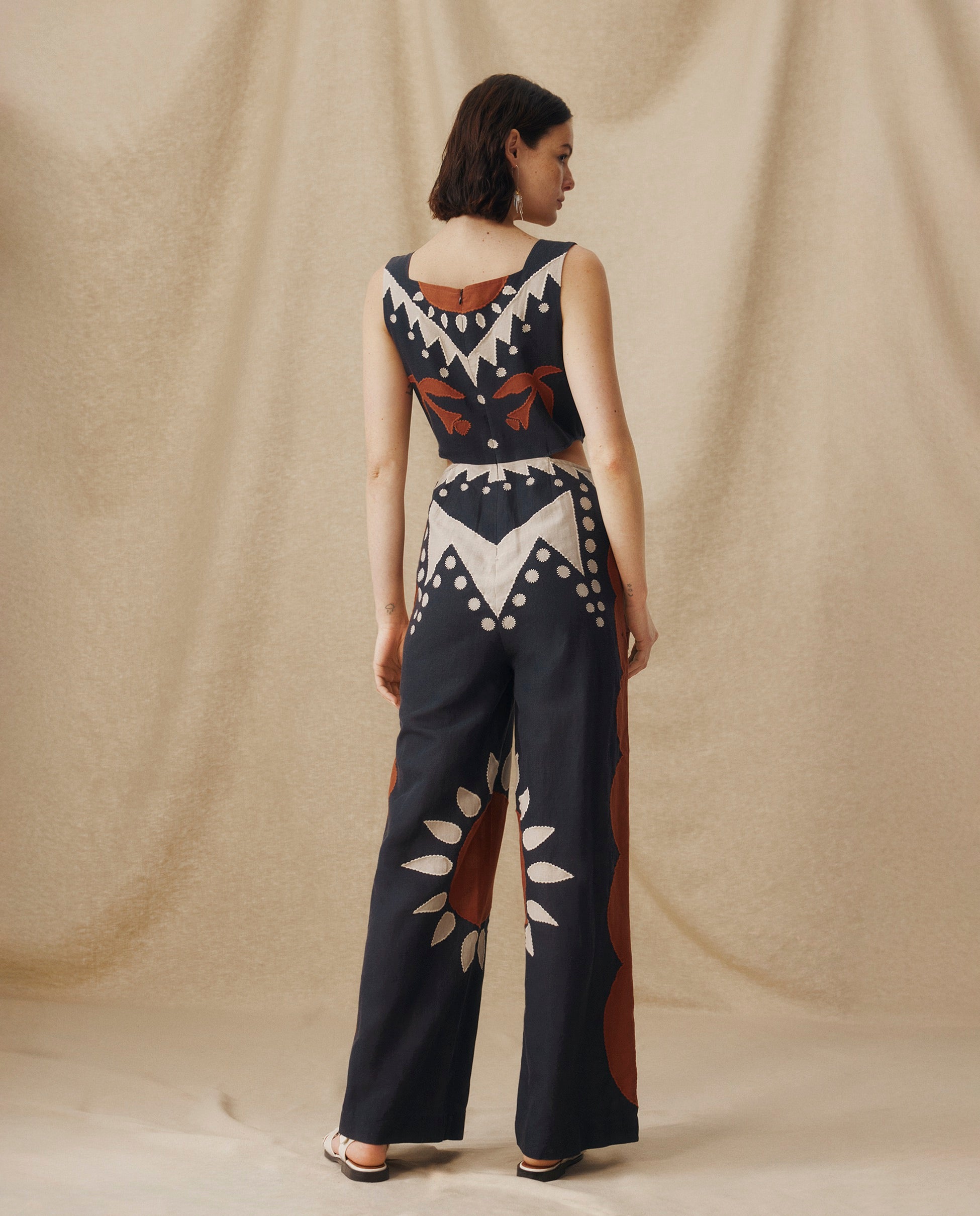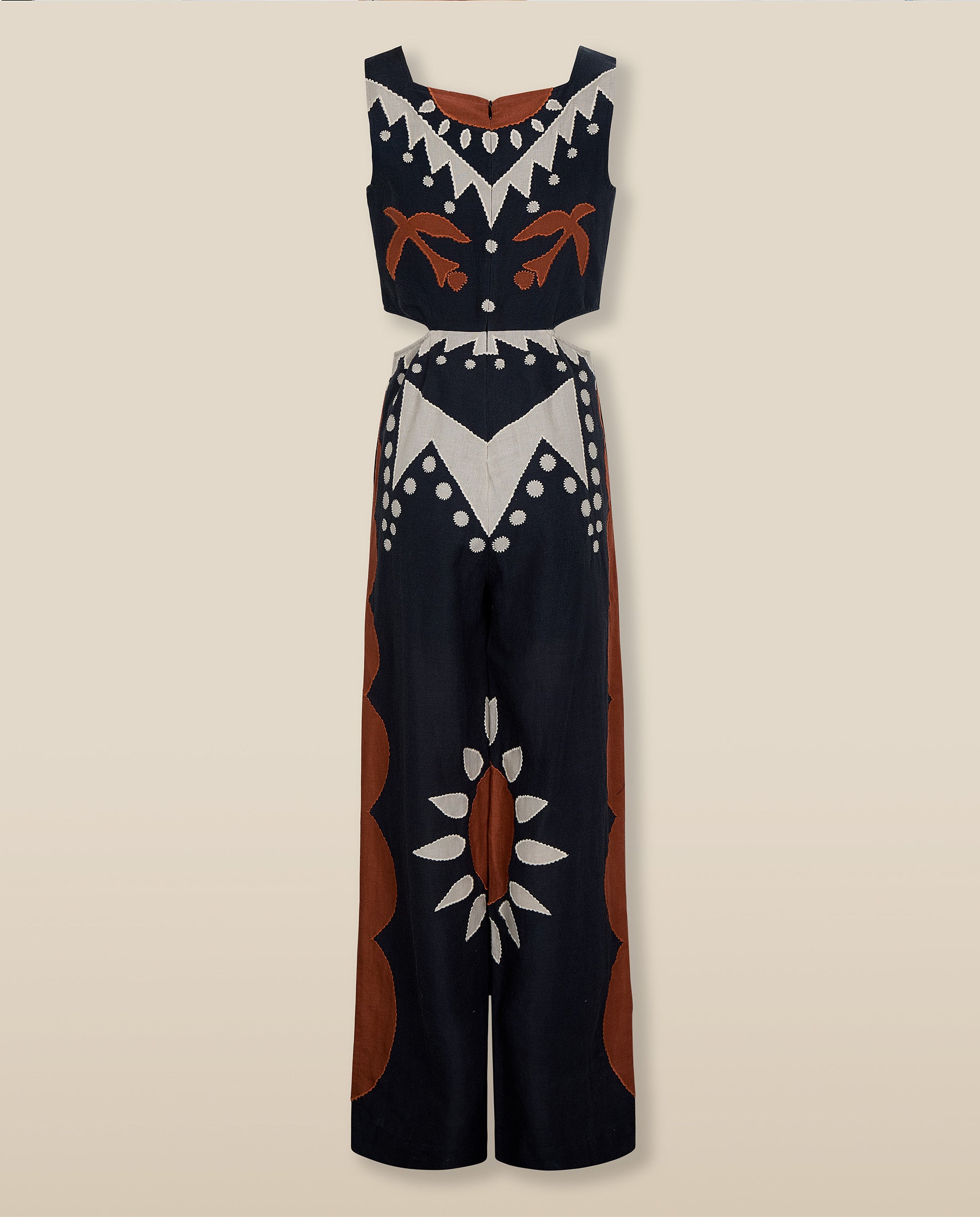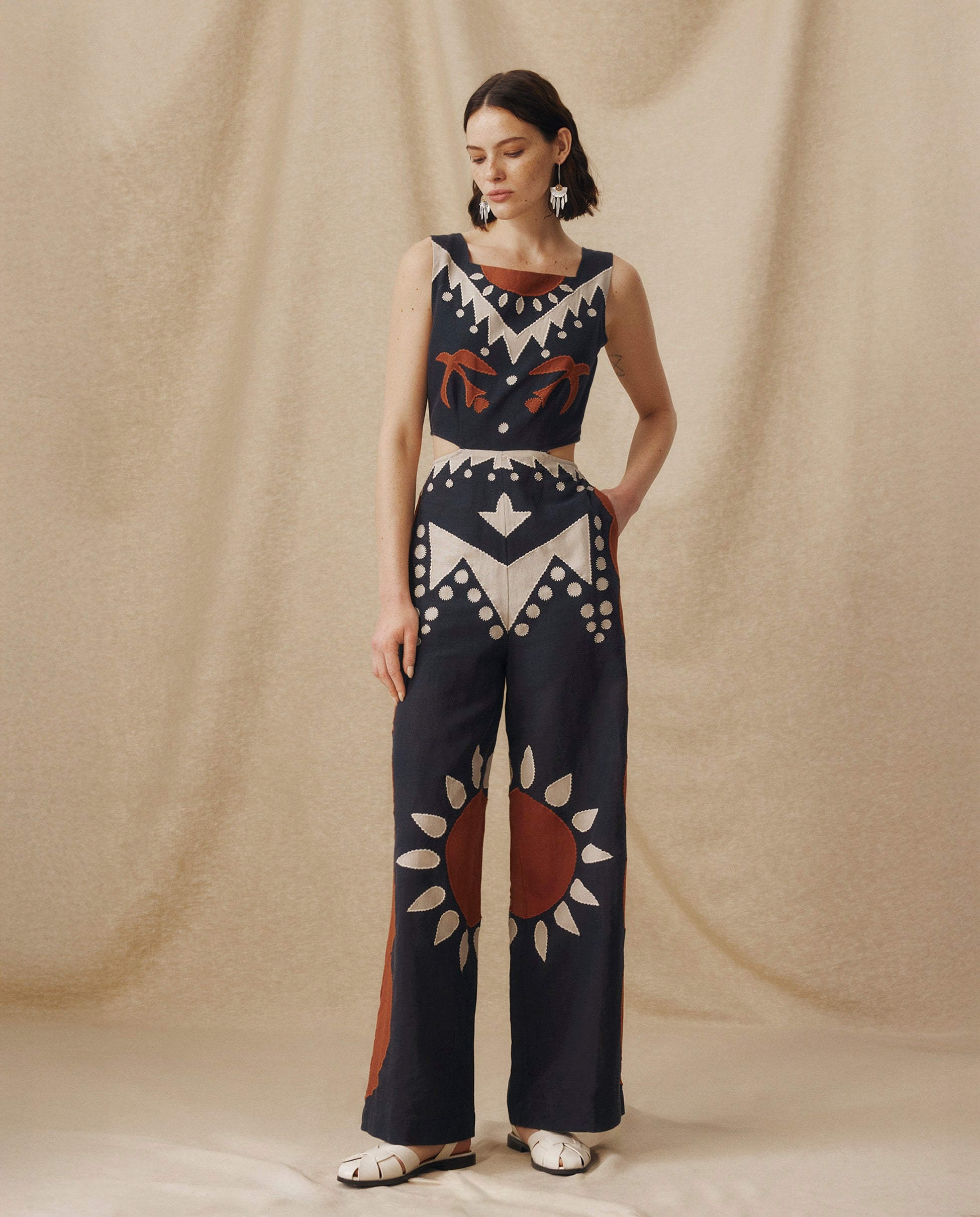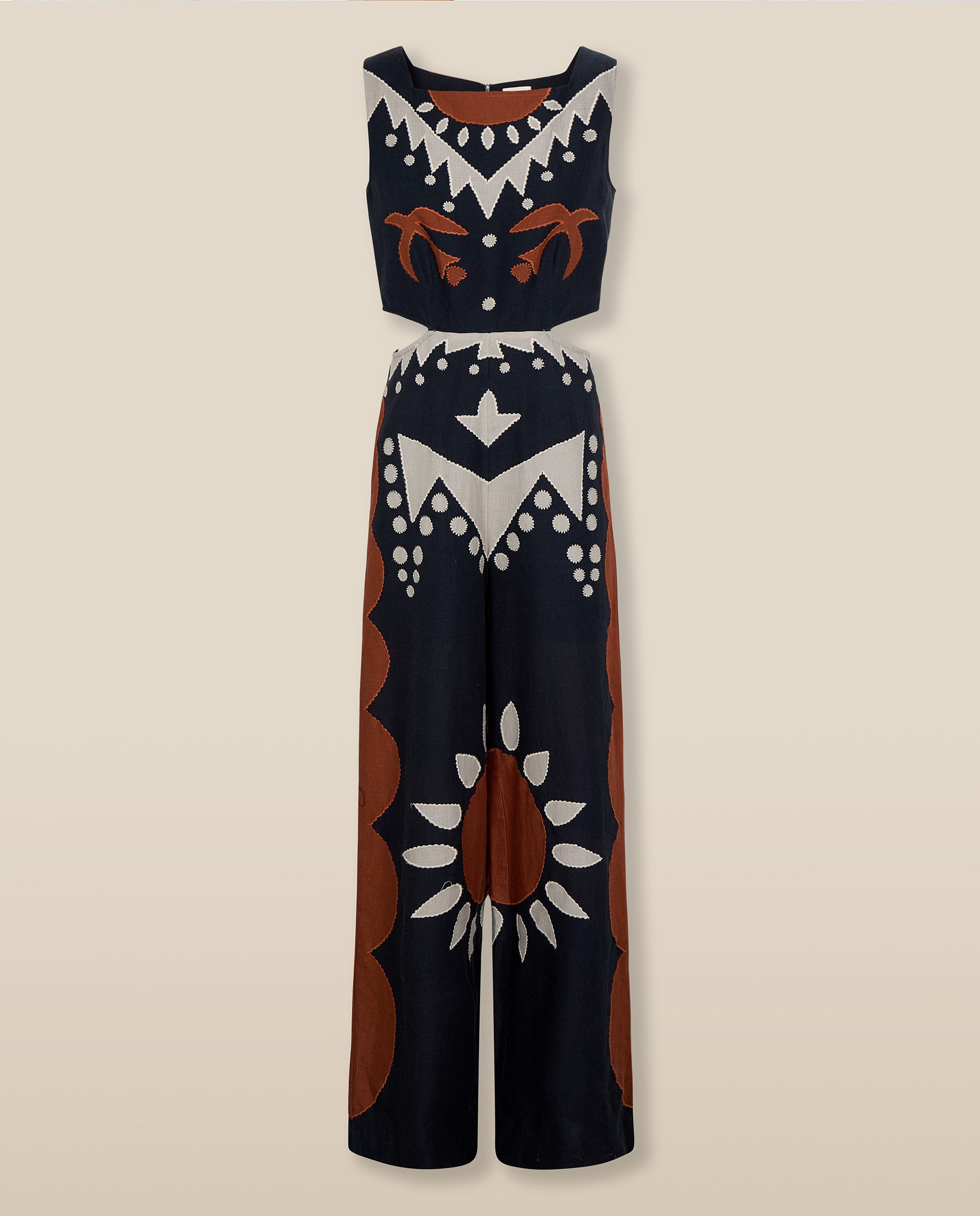 Original y llamativo, el mono Genoveva transmite fuerza a través su bordado geométrico y su silueta escultural. Confeccionado en una mezcla de algodón y lino transpirable, cuenta con un escote cuadrado, sutiles aberturas en la cintura y pantalón de corte ancho que estiliza y alarga la figura. El motivo en color terracota y en color beige aporta carácter y pone en valor la artesanía.