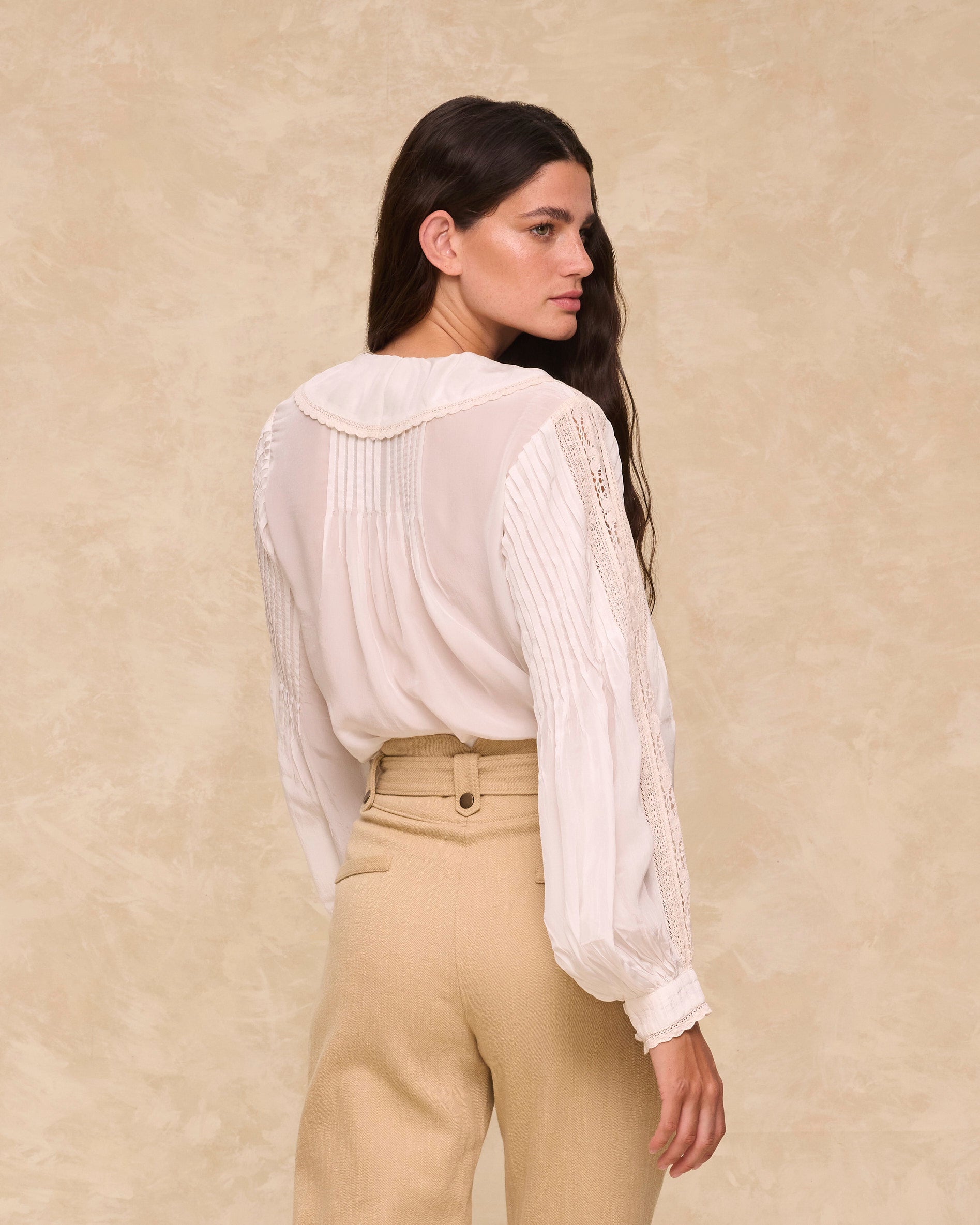 Inspirada por el romanticismo, la blusa Basil está confeccionada en 100% viscosa con un diseño ligero y con textura que combina plisados suaves con encaje. Presenta un escote en V adornado con volantes que caen delicadamente sobre la tapeta abotonada. Las mangas largas, con volumen sutil, refuerzan su aire femenino, mientras que la parte posterior se mantiene limpia para un acabado equilibrado.