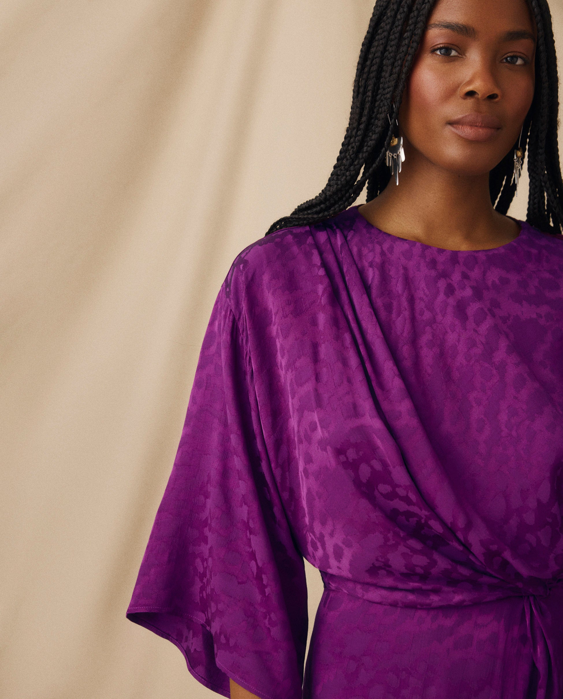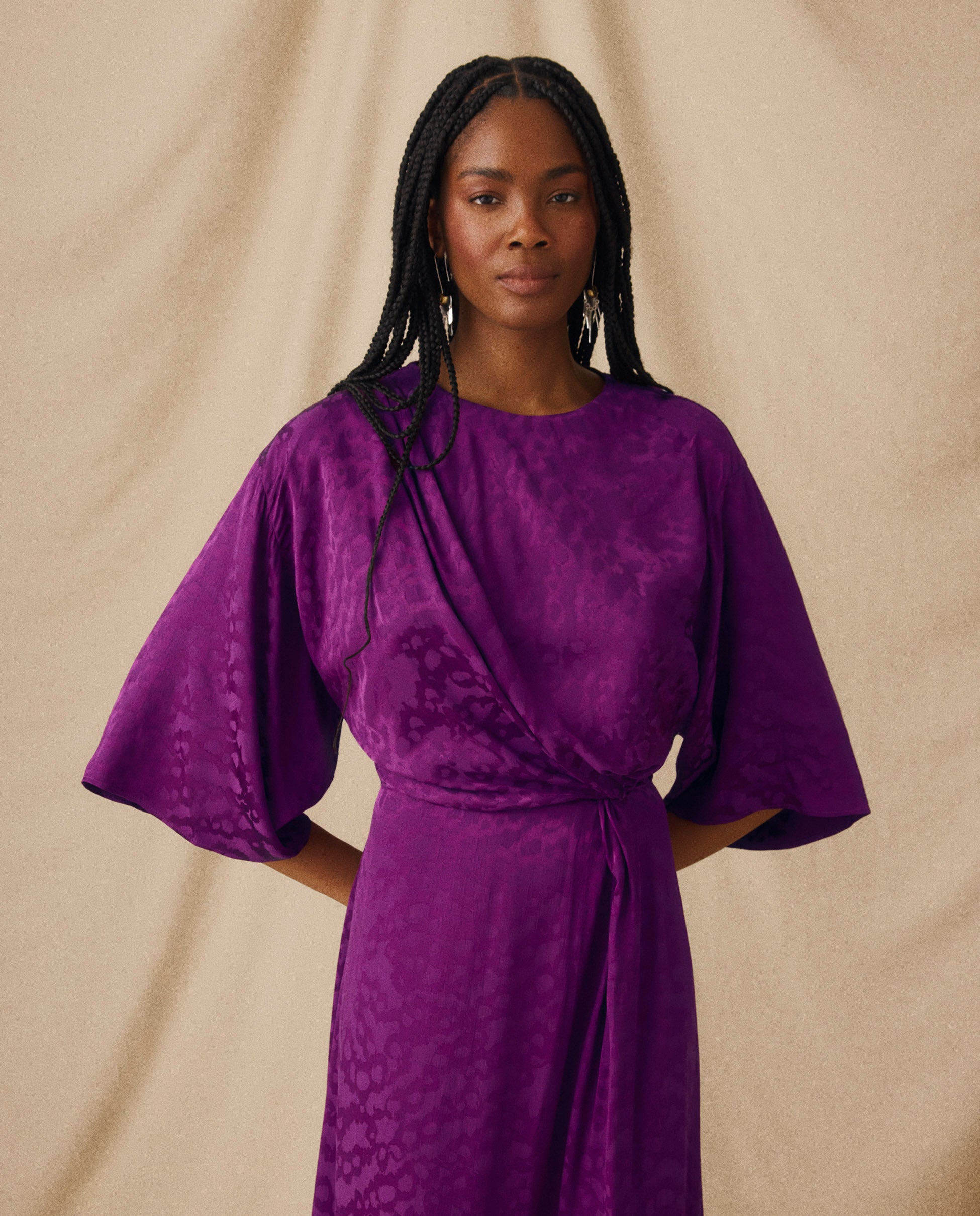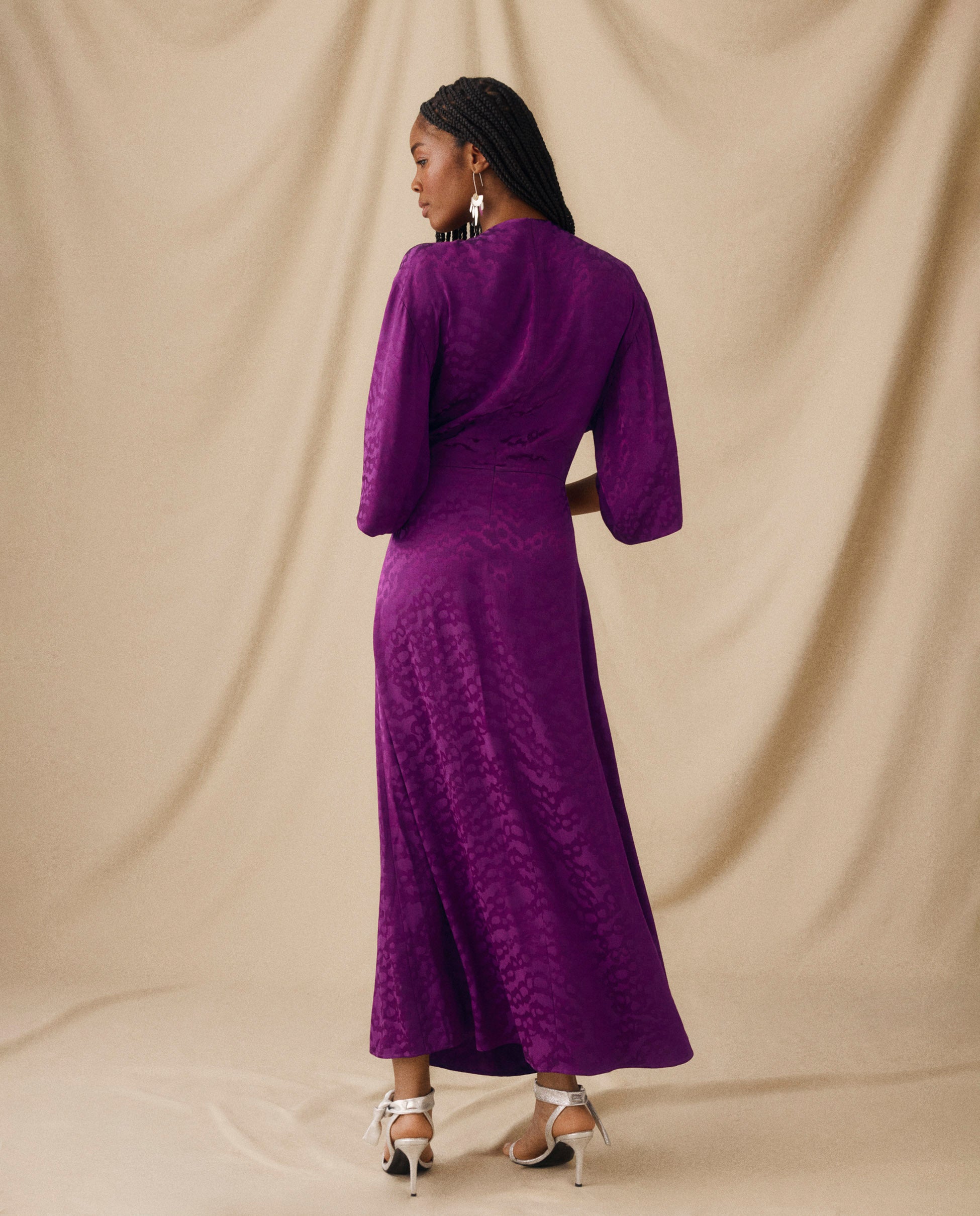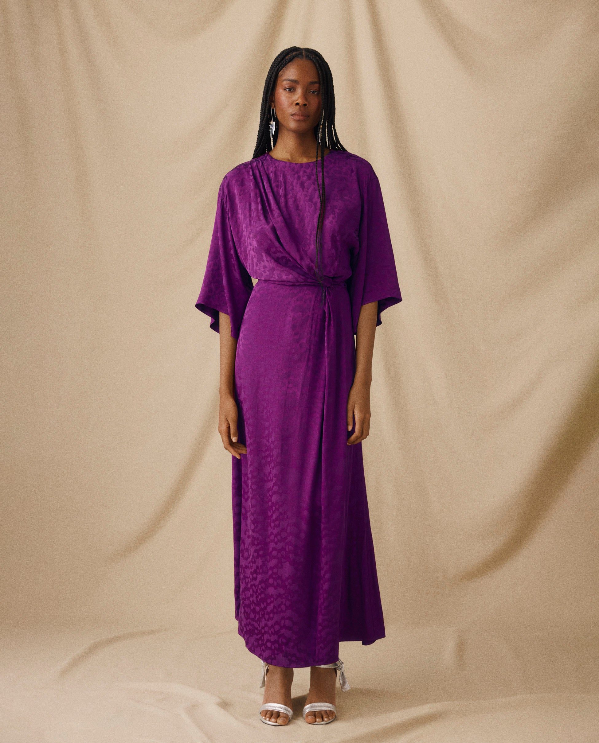 Confeccionado en un jacquard tono magenta con un sutil motivo animal, el vestido Ciceley ofrece una estructura elegante con líneas suaves y cierta estructura. Diseñado con escote redondo y un detalle de nudo frontal, presenta mangas tipo amplias que caen hasta el codo y una falda larga con abertura delantera. La cremallera trasera oculta garantiza un ajuste impecable, mientras que el bajo fluido añade movimiento.