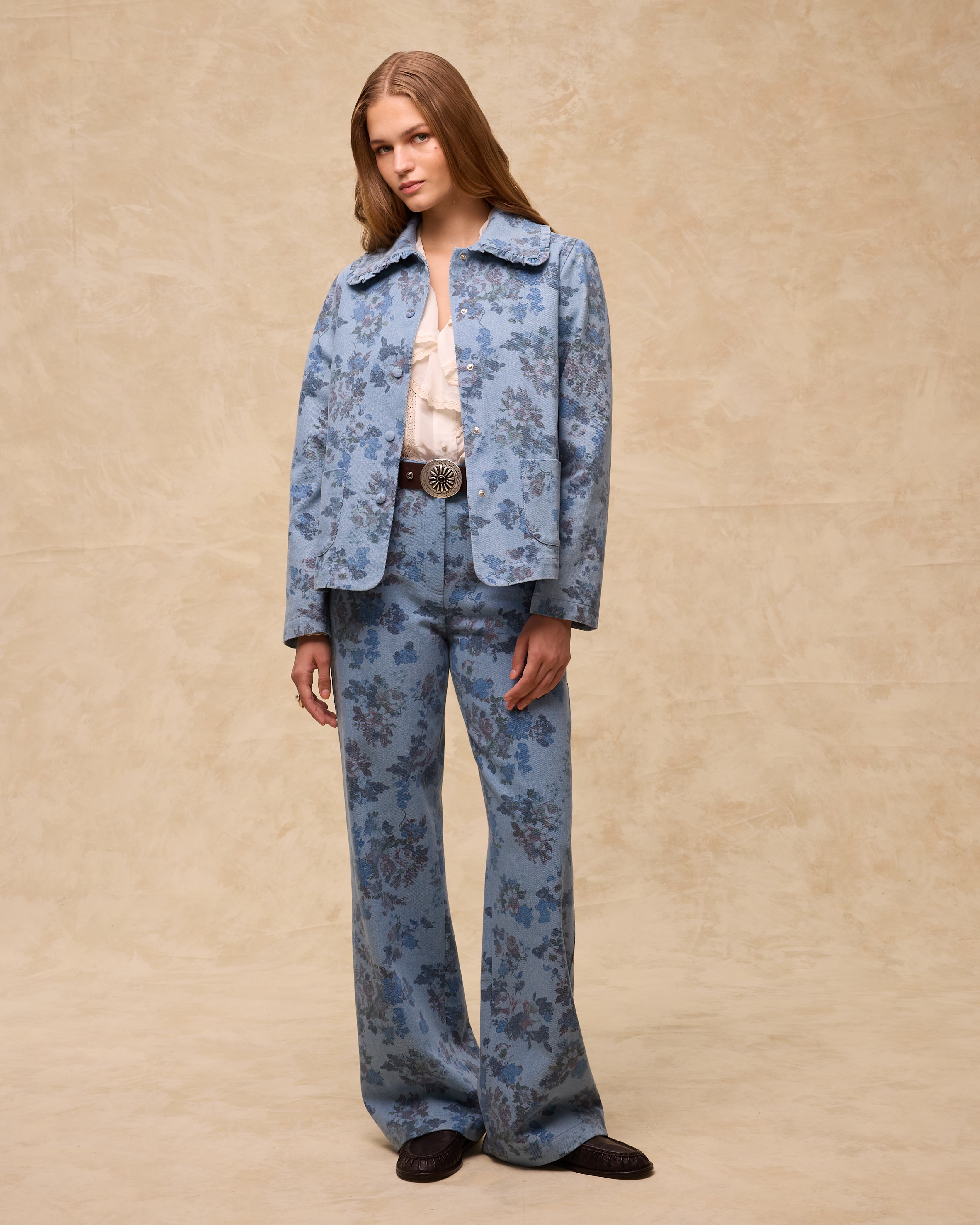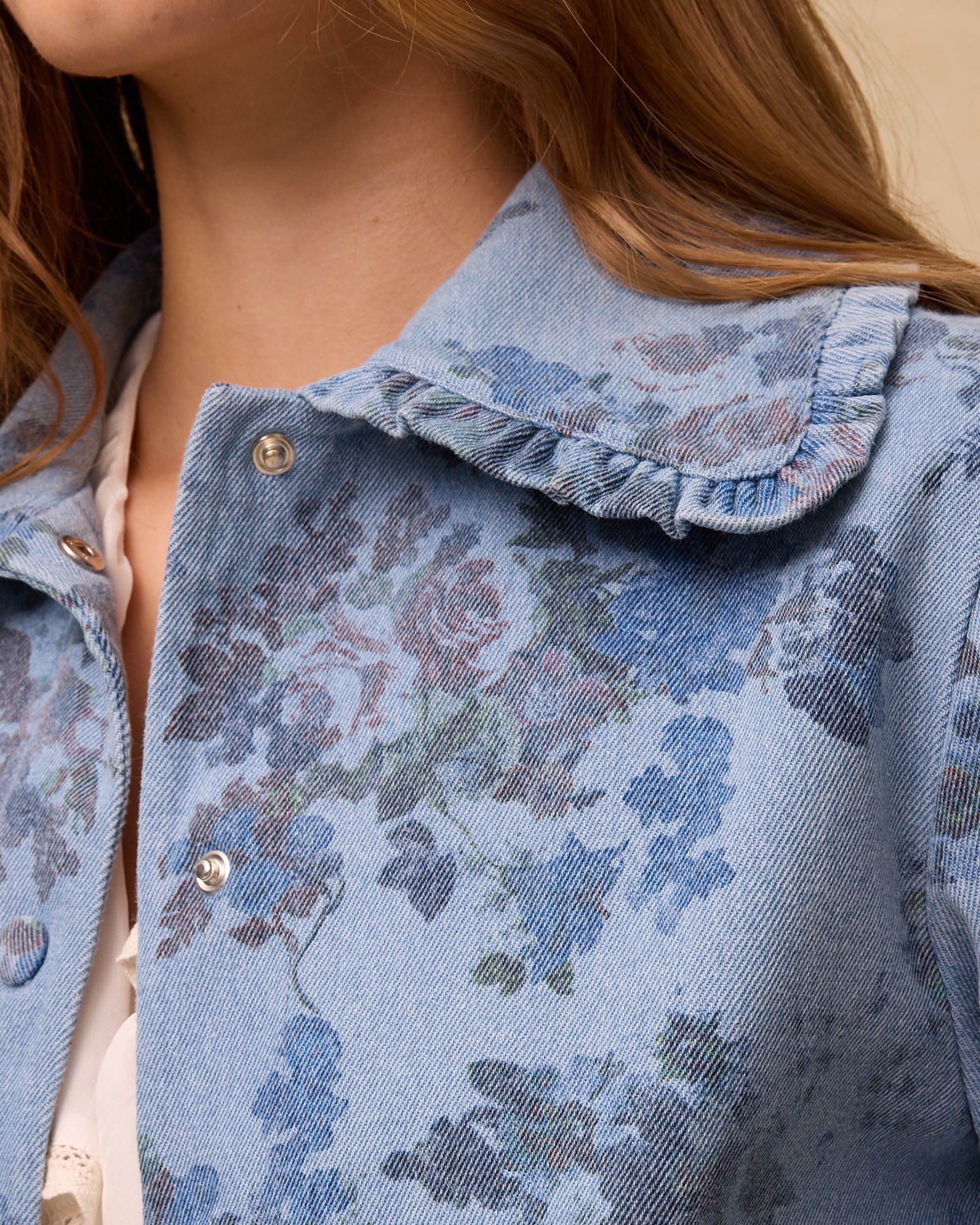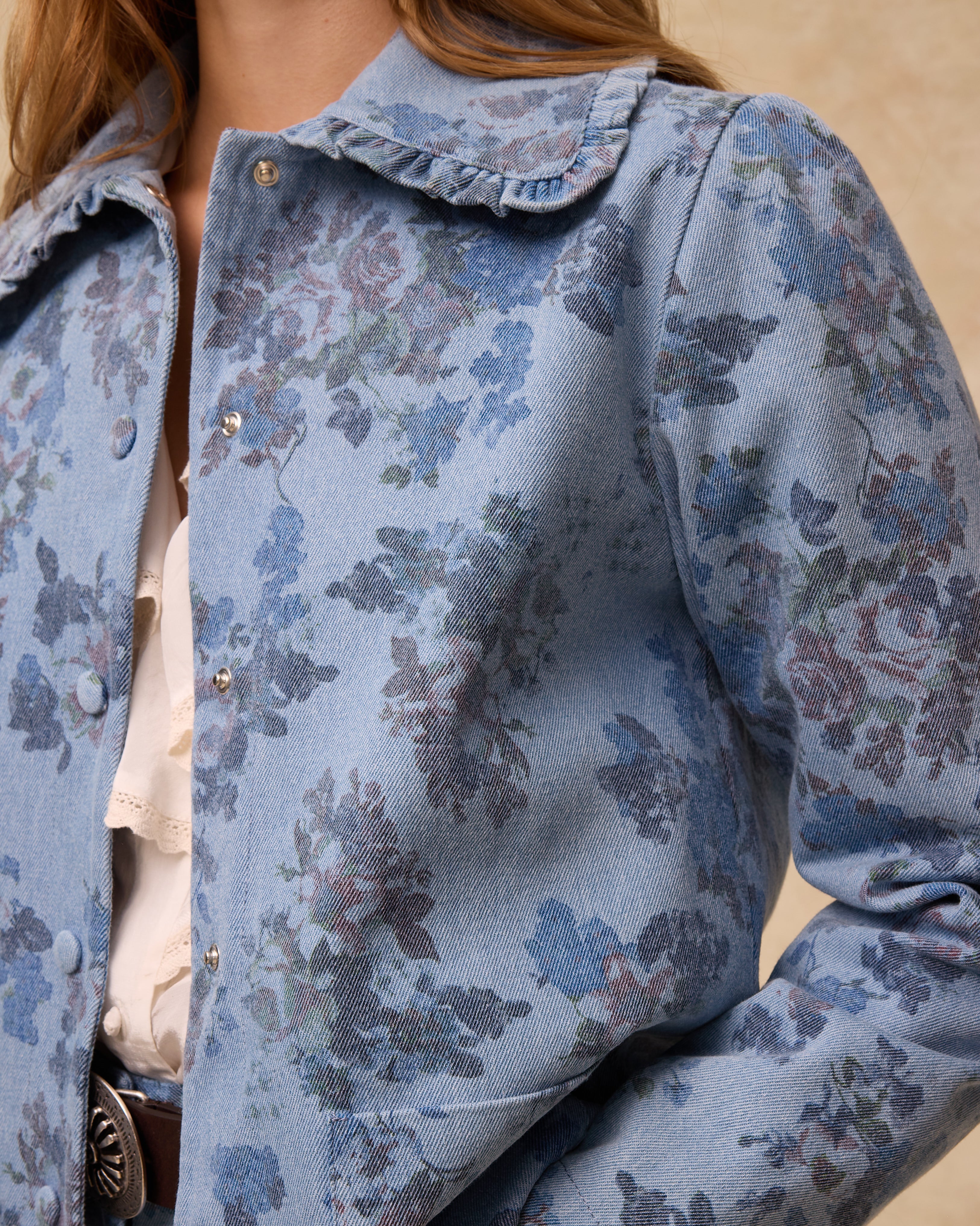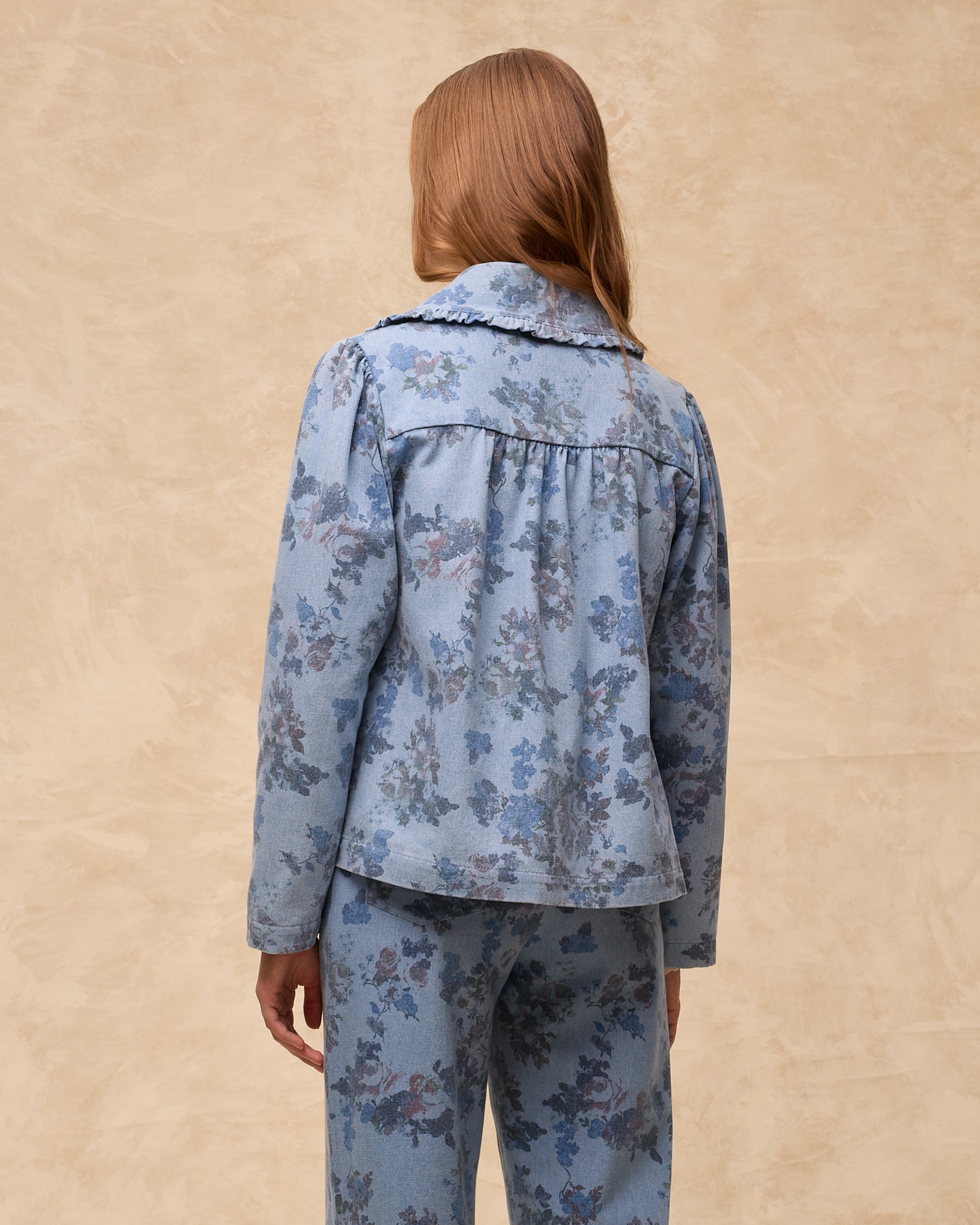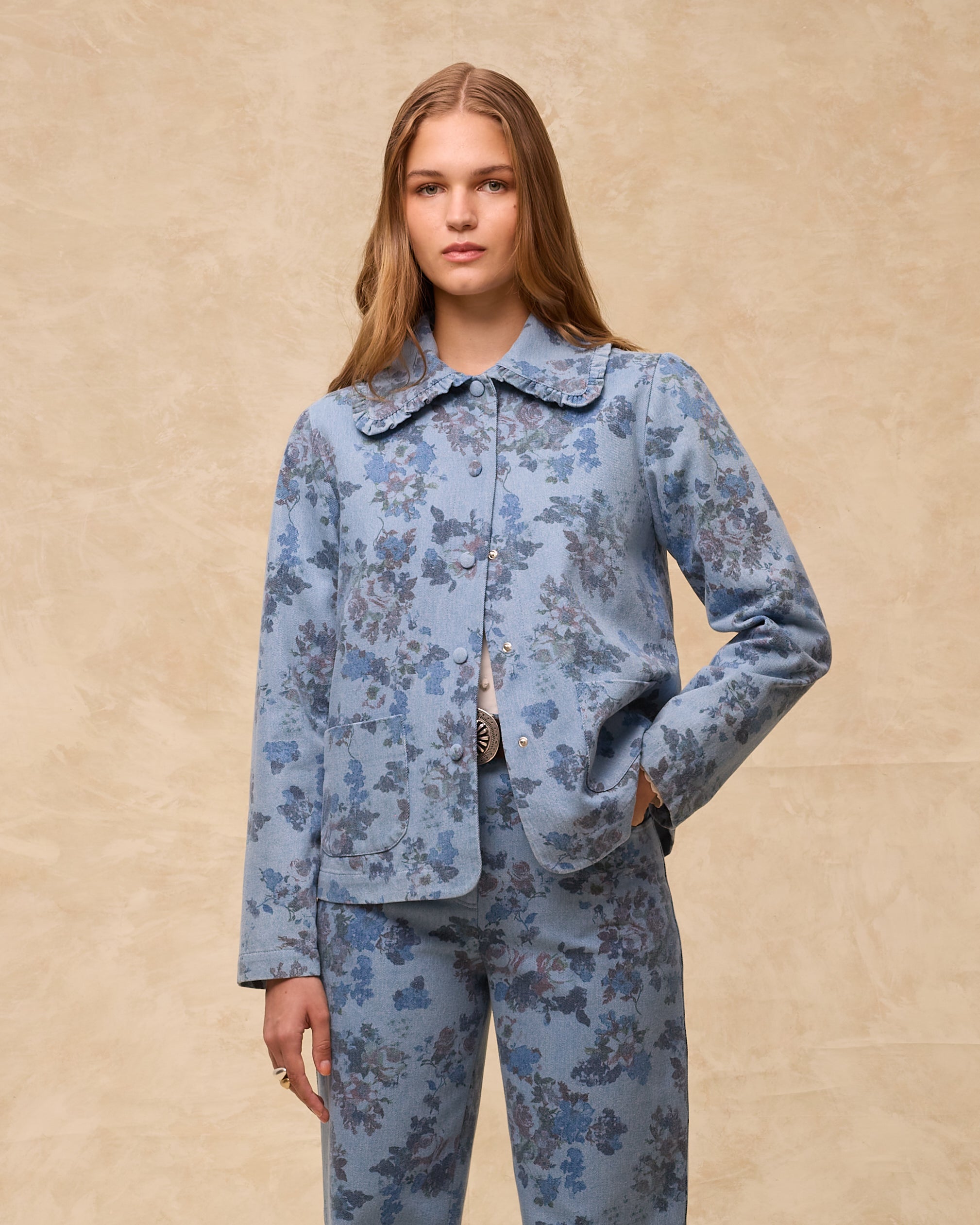 Estampada con flores de inspiración vintage en tonos azules y rosa empolvado, la chaqueta Connie está confeccionada en 100% algodón con una estructura ligera y suave. Presenta un cuello clásico con ribete de volantes, bolsillos de parche curvos y bajo recto. El cierre frontal con corchetes al tono aporta un acabado limpio y moderno.