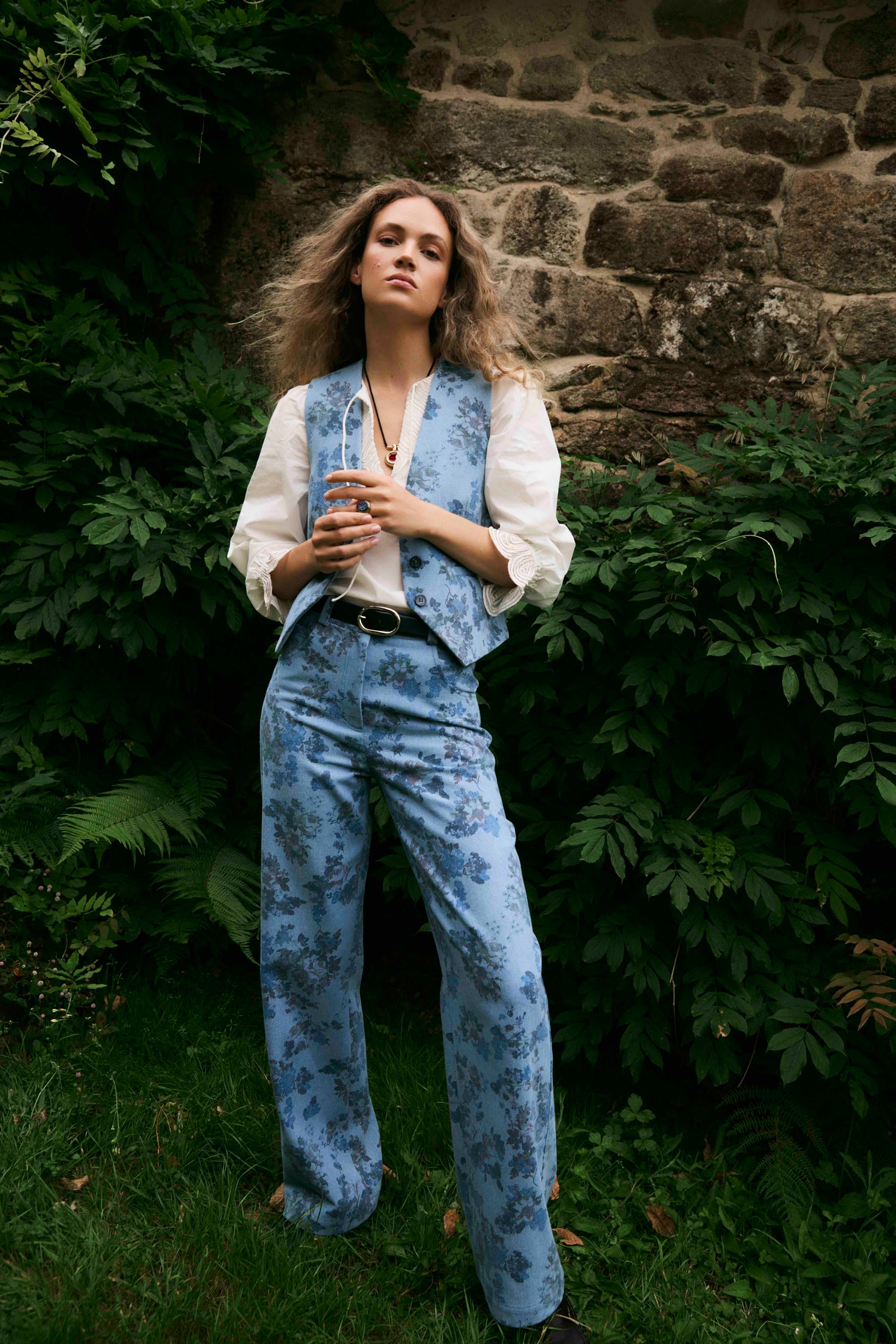 Confeccionado en 100% algodón con un estampado floral en tonos azules, el pantalón Connie aporta un aire delicado. Diseñado con talle medio y pernera recta, presenta cierre clásico de botón y cremallera, bolsillos laterales y en la parte trasera.