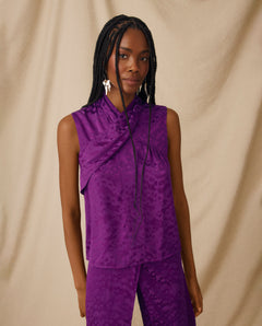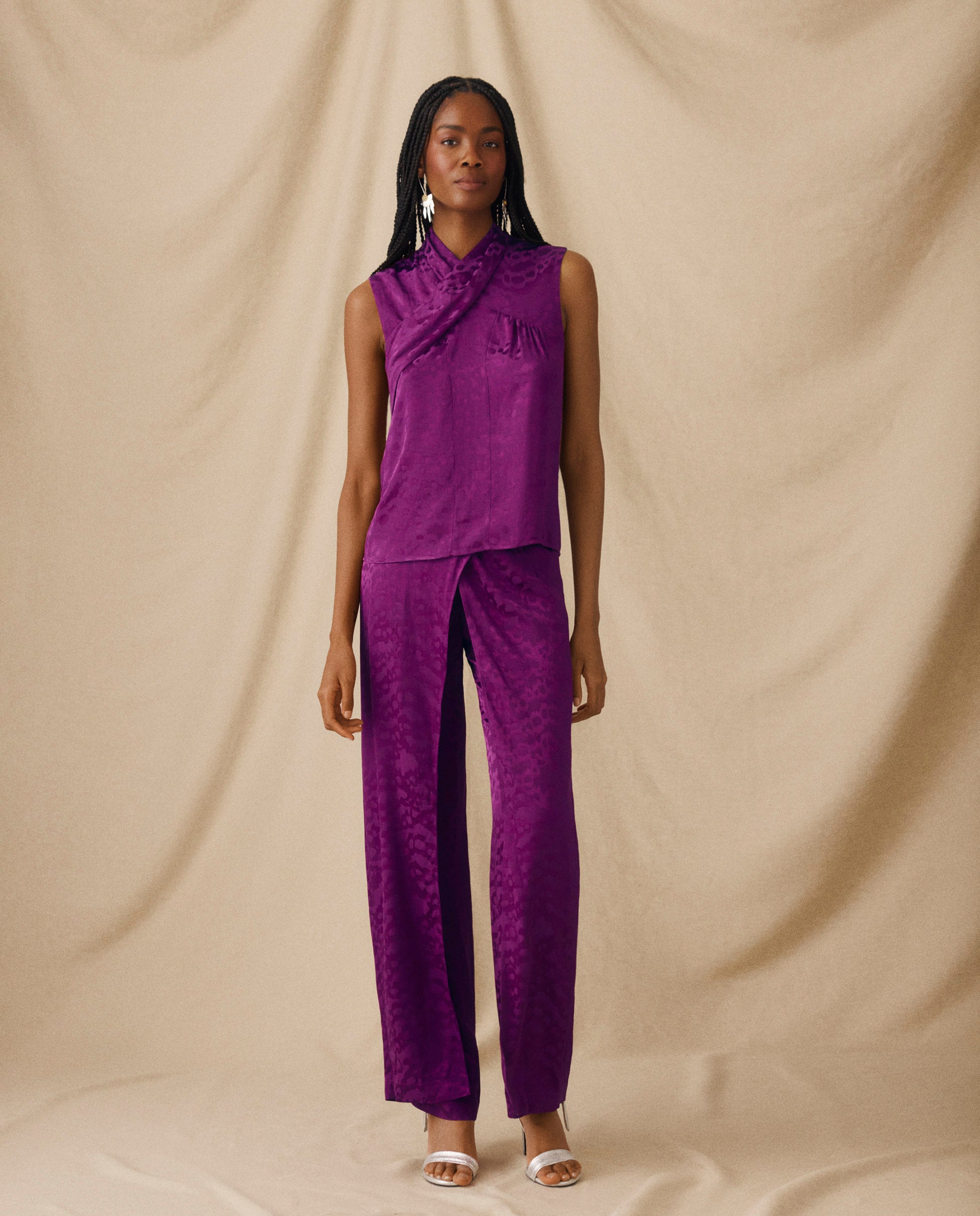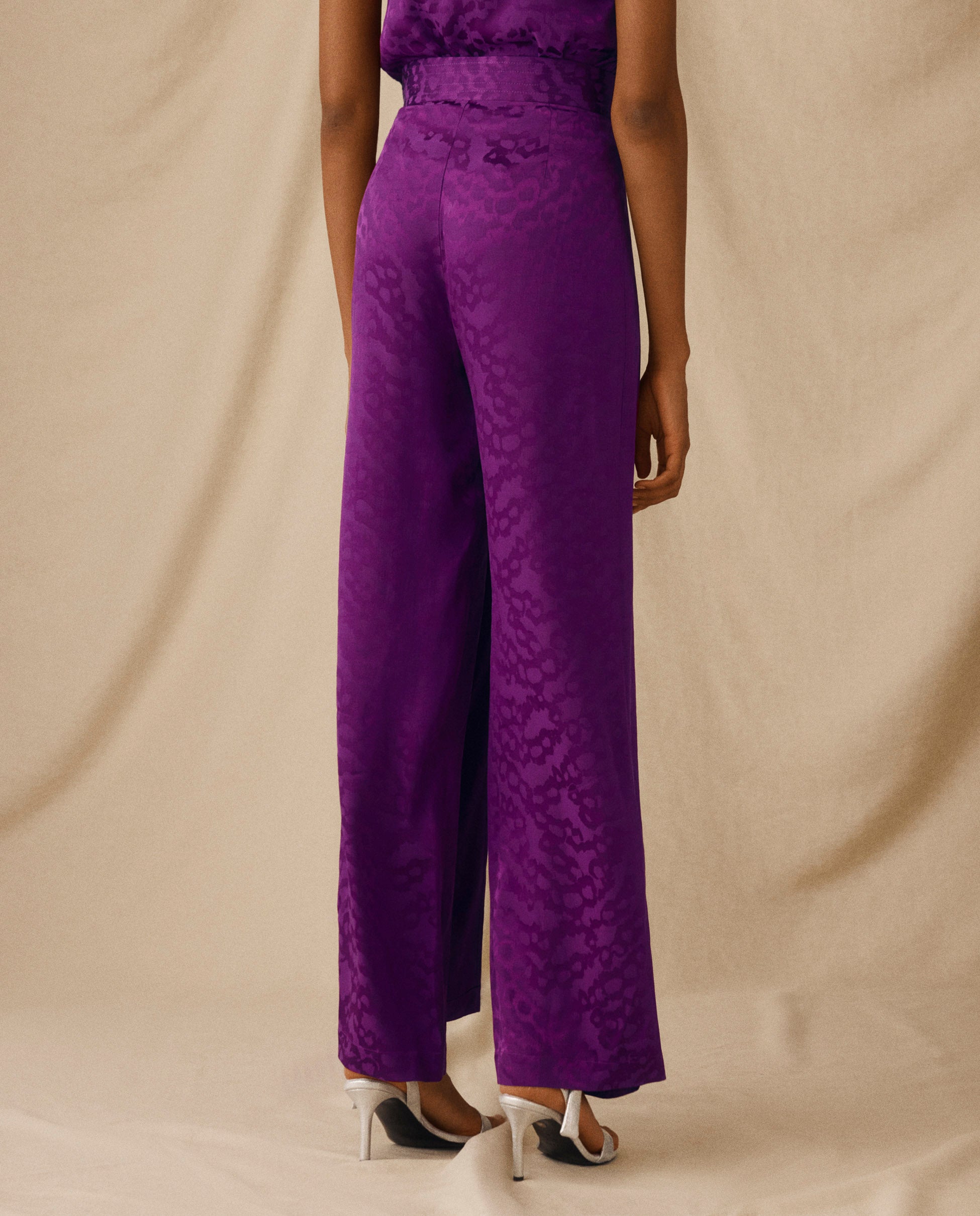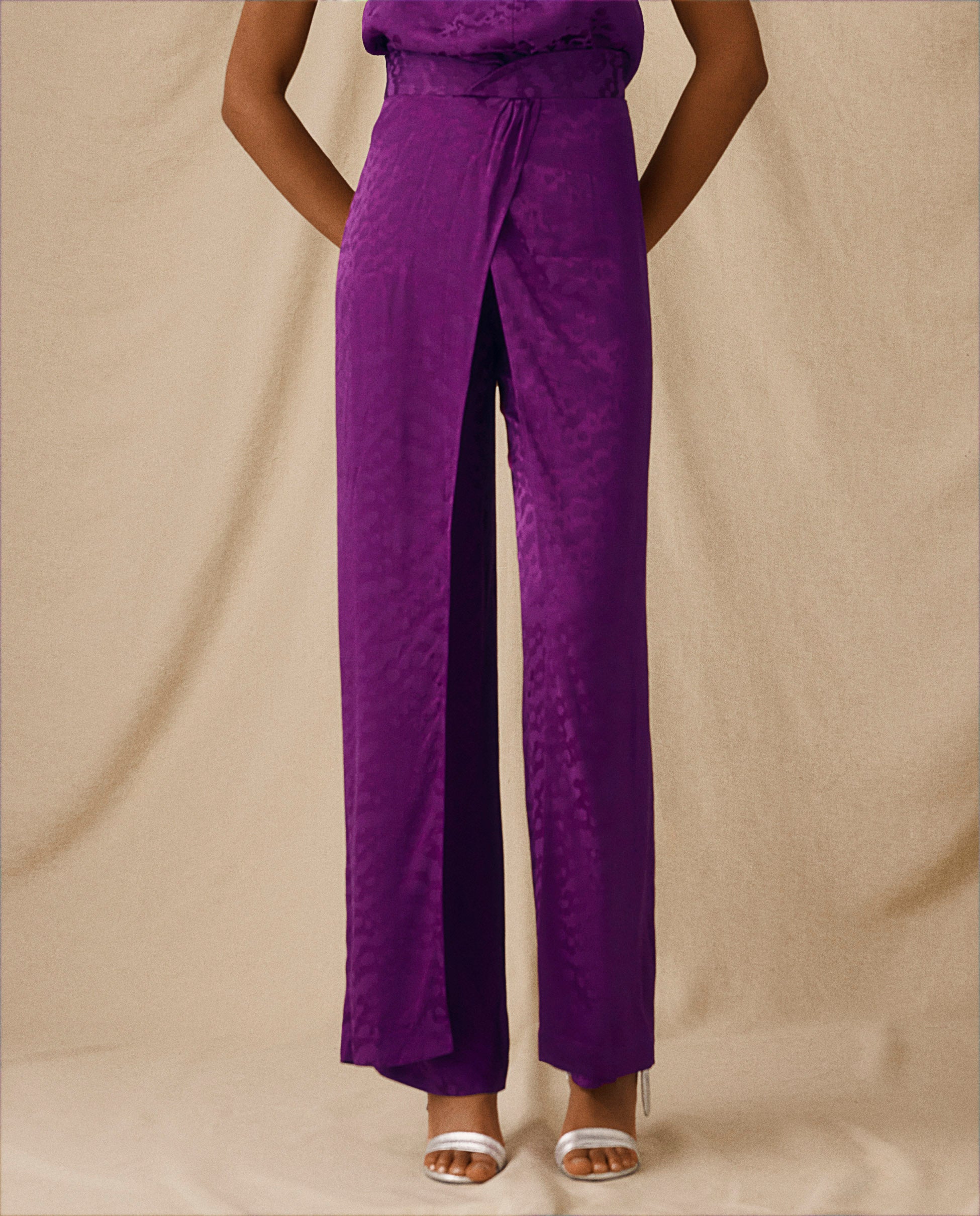 El pantalón Elaine está confeccionado en jacquard magenta con un sutil motivo de leopardo. Diseñado para ajustarse a la cintura, presenta un panel frontal drapeado con efecto cruzado y una cinturilla ancha que realza la silueta. La pernera larga y fluida aporta movimiento. Se completa con un cierre lateral oculto para un acabado limpio.