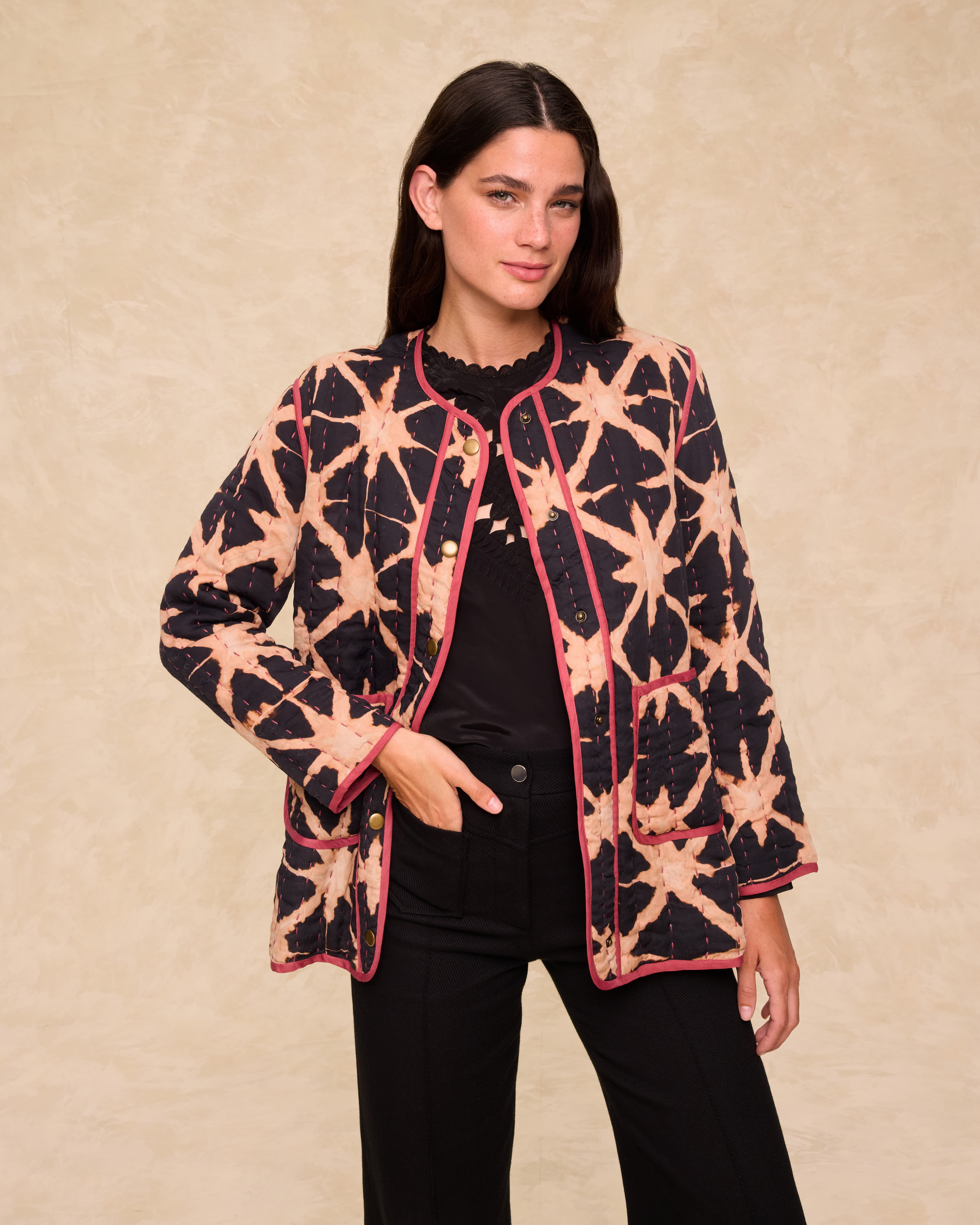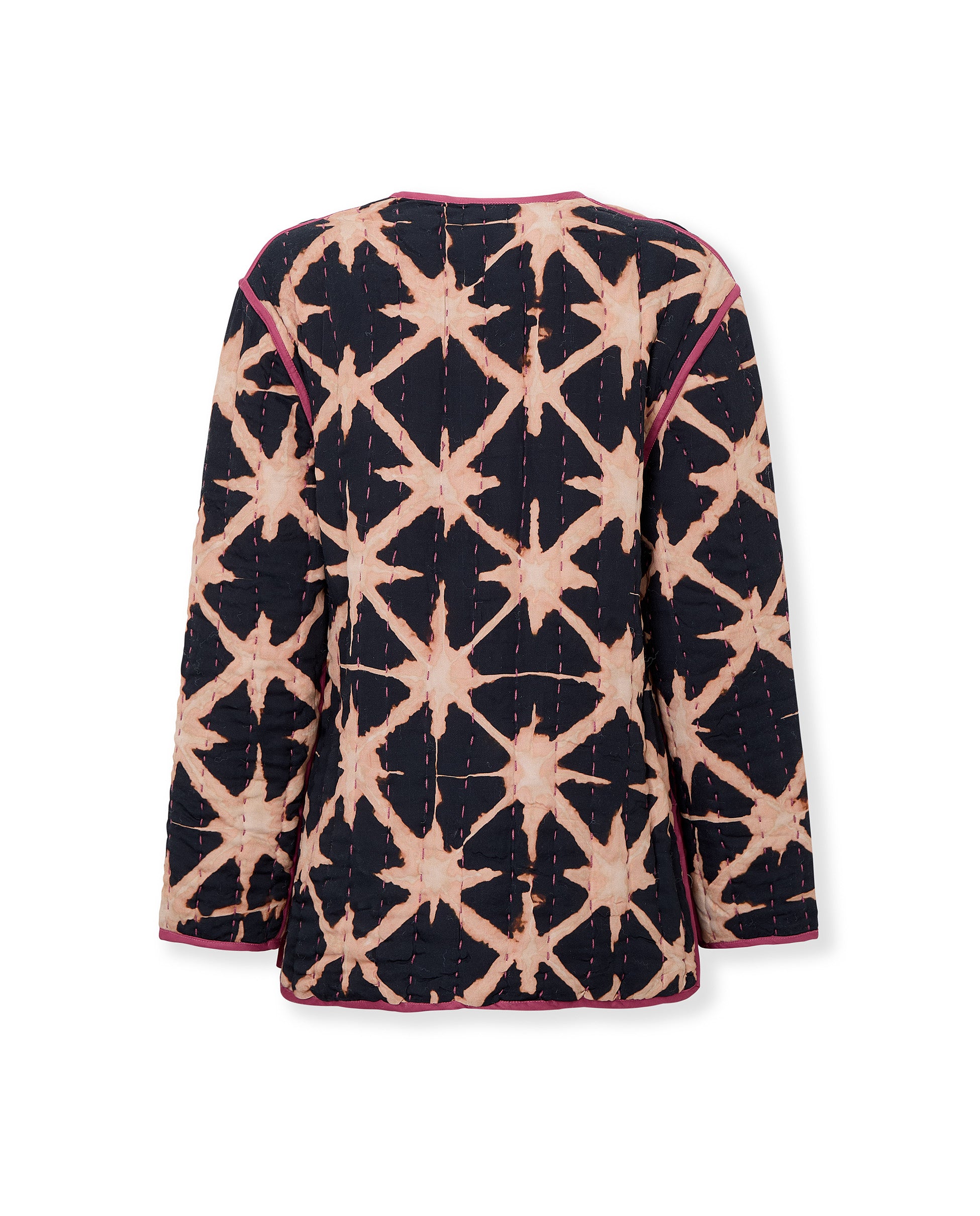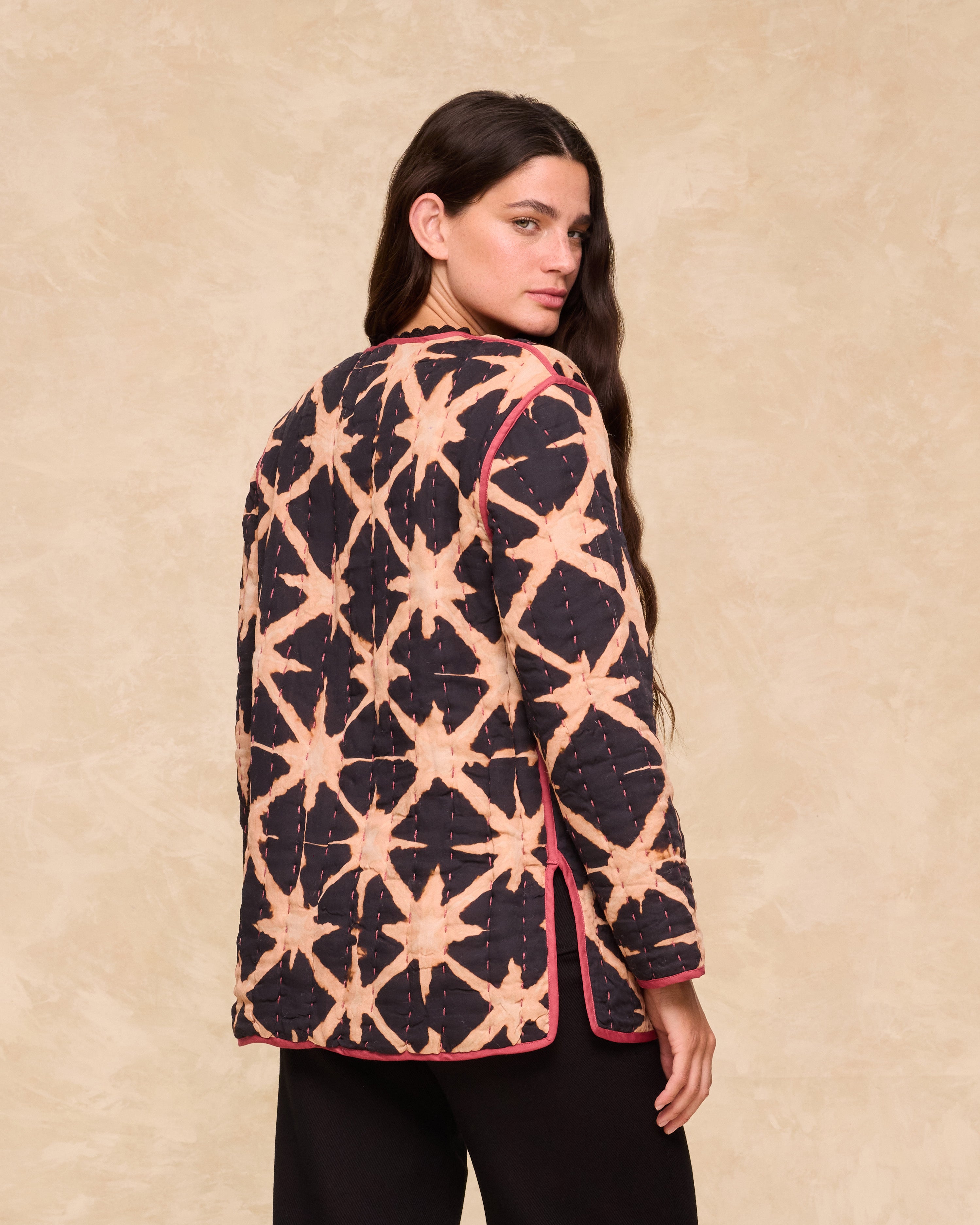 Un abrigo original y llamativo que combina comodidad y estilo en un diseño artesanal. El abrigo Estrella presenta un estampado gráfico tipo batik con detalles en contraste y acabado acolchado para un look distintivo.