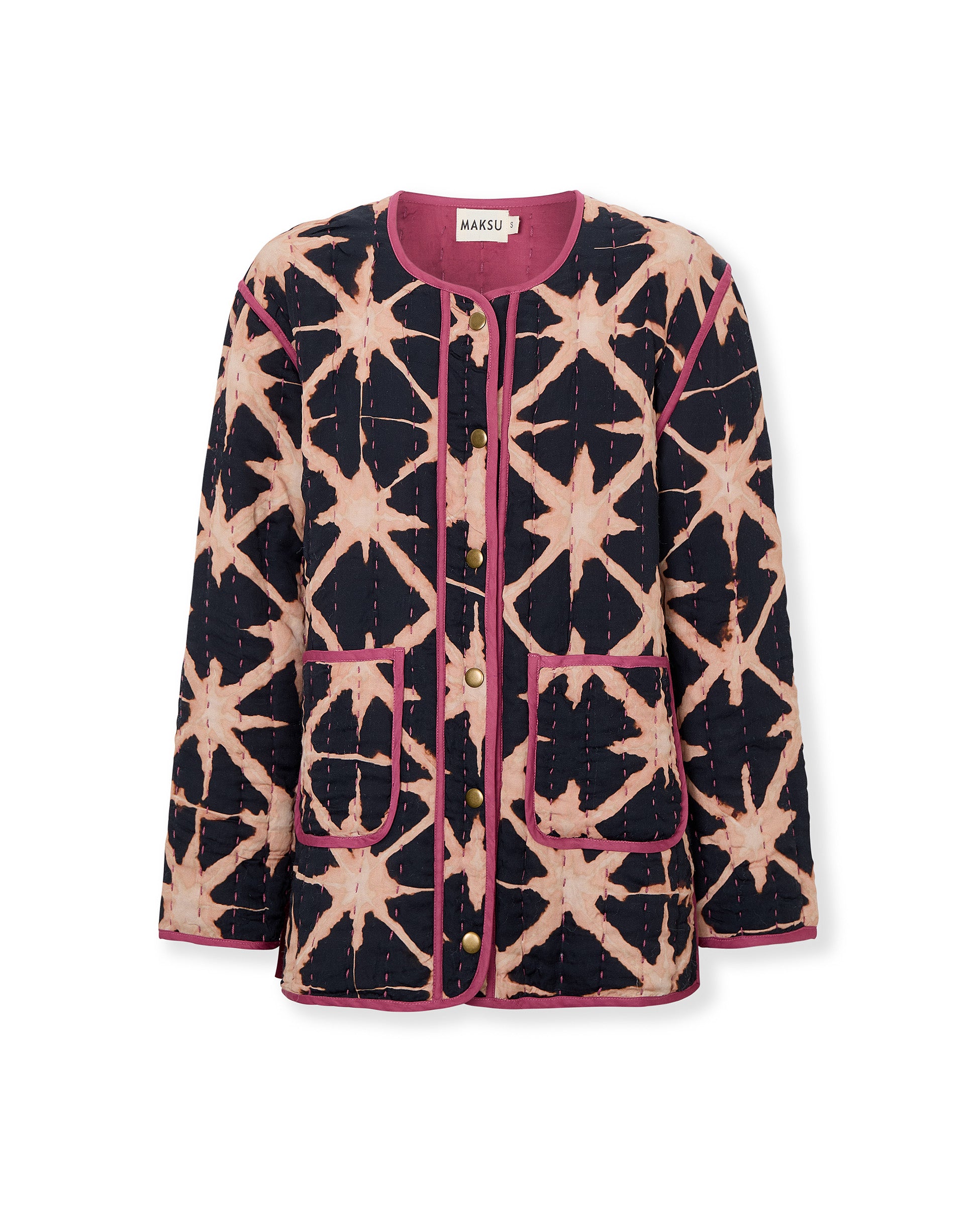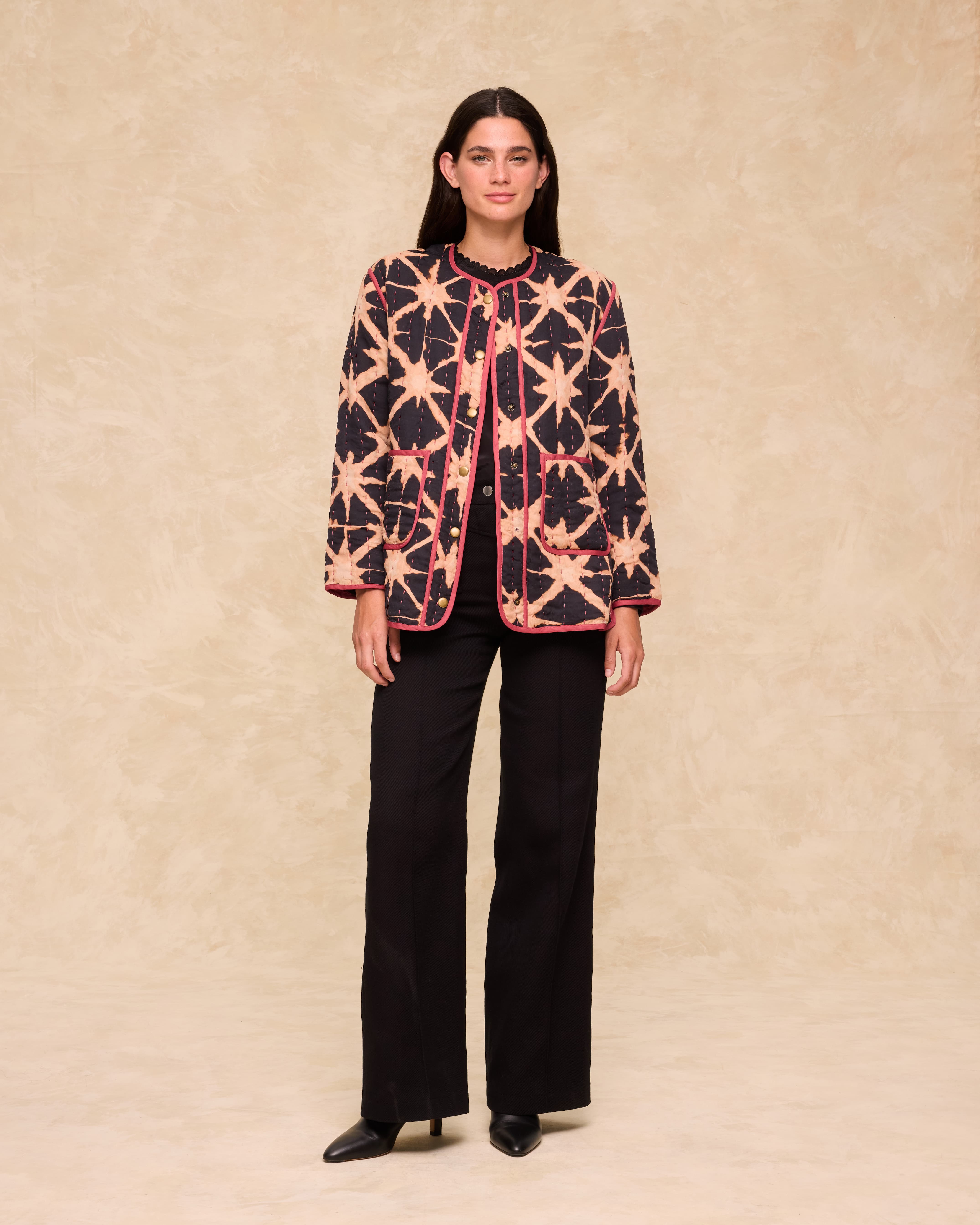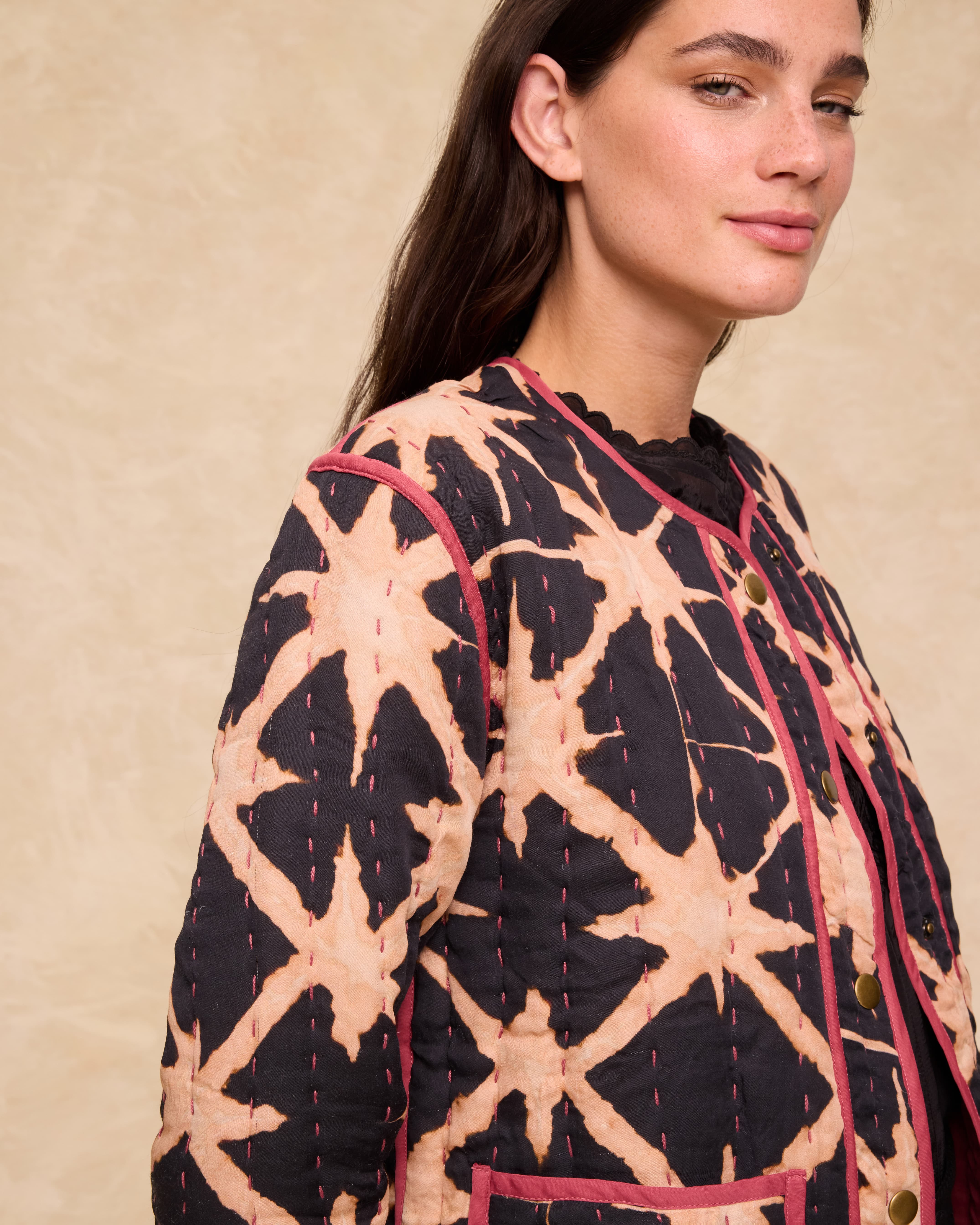 Un abrigo original y llamativo que combina comodidad y estilo en un diseño artesanal. El abrigo Estrella presenta un estampado gráfico tipo batik con detalles en contraste y acabado acolchado para un look distintivo.