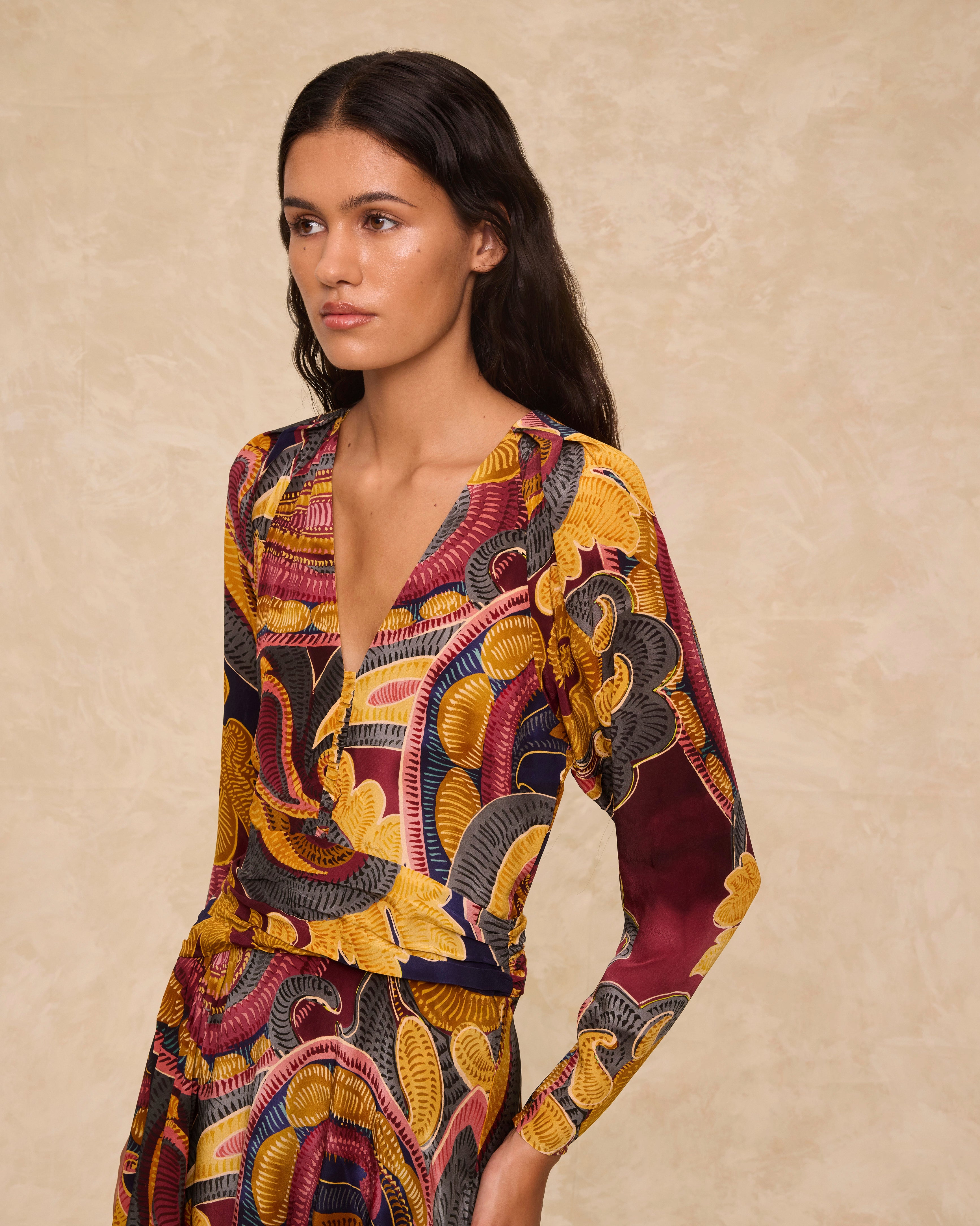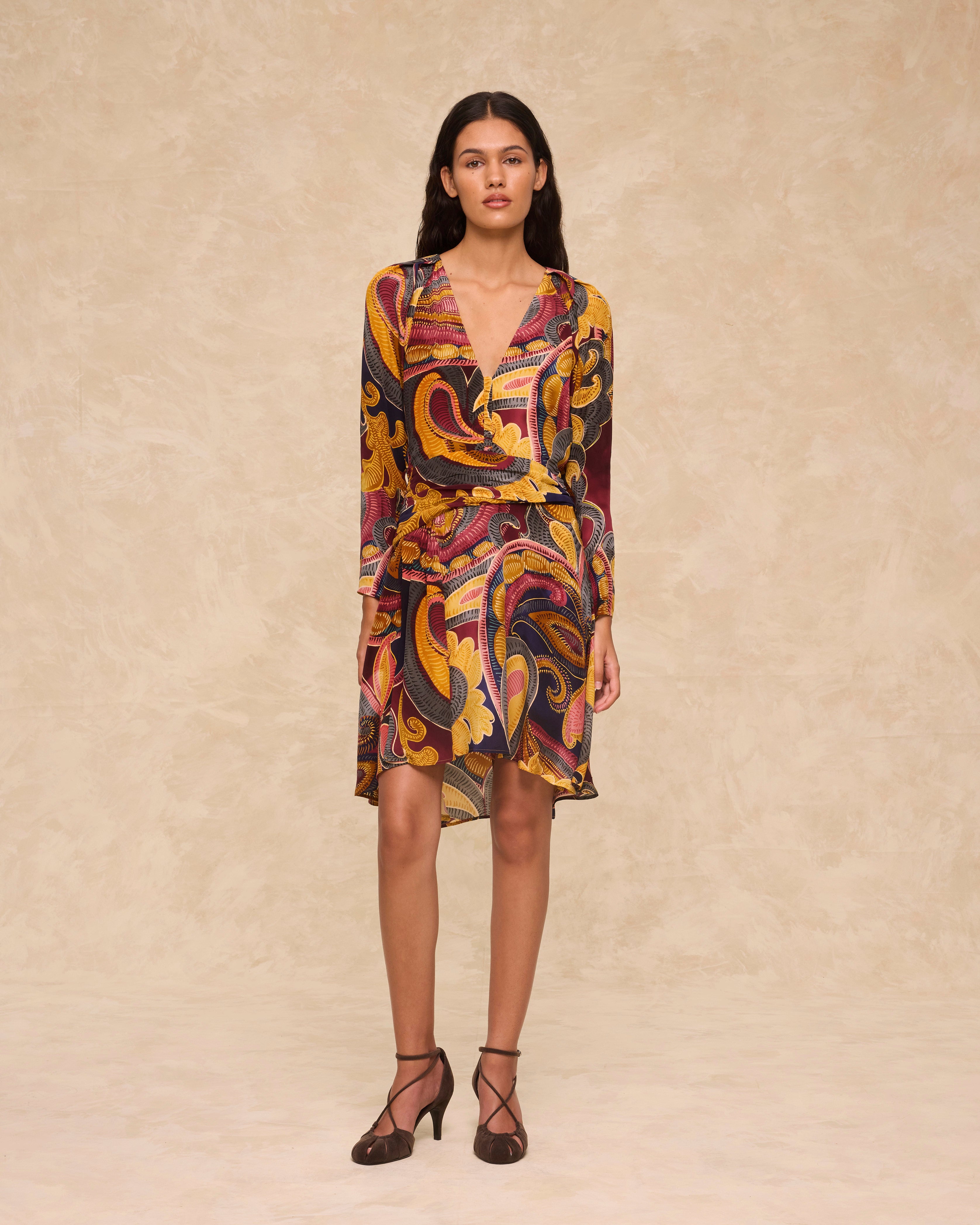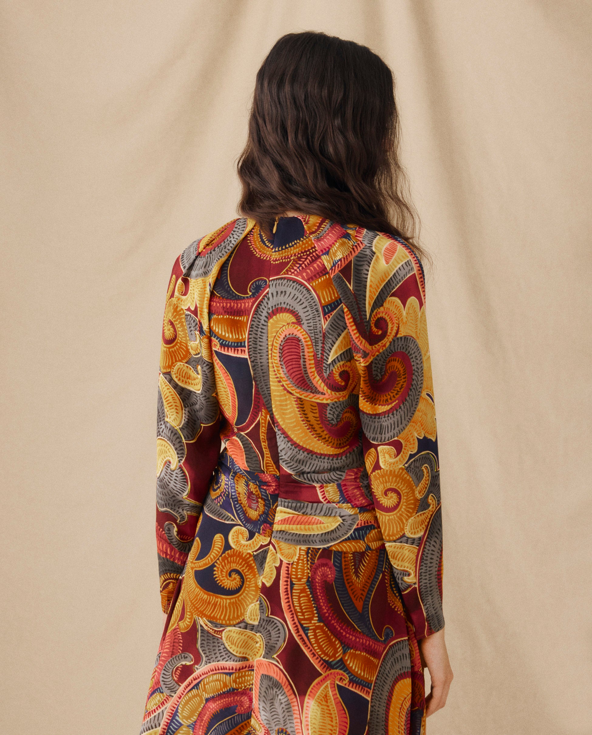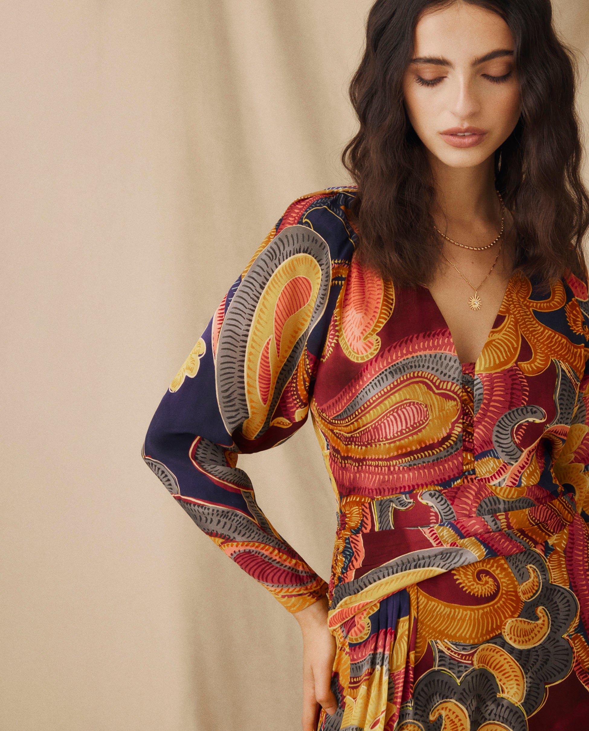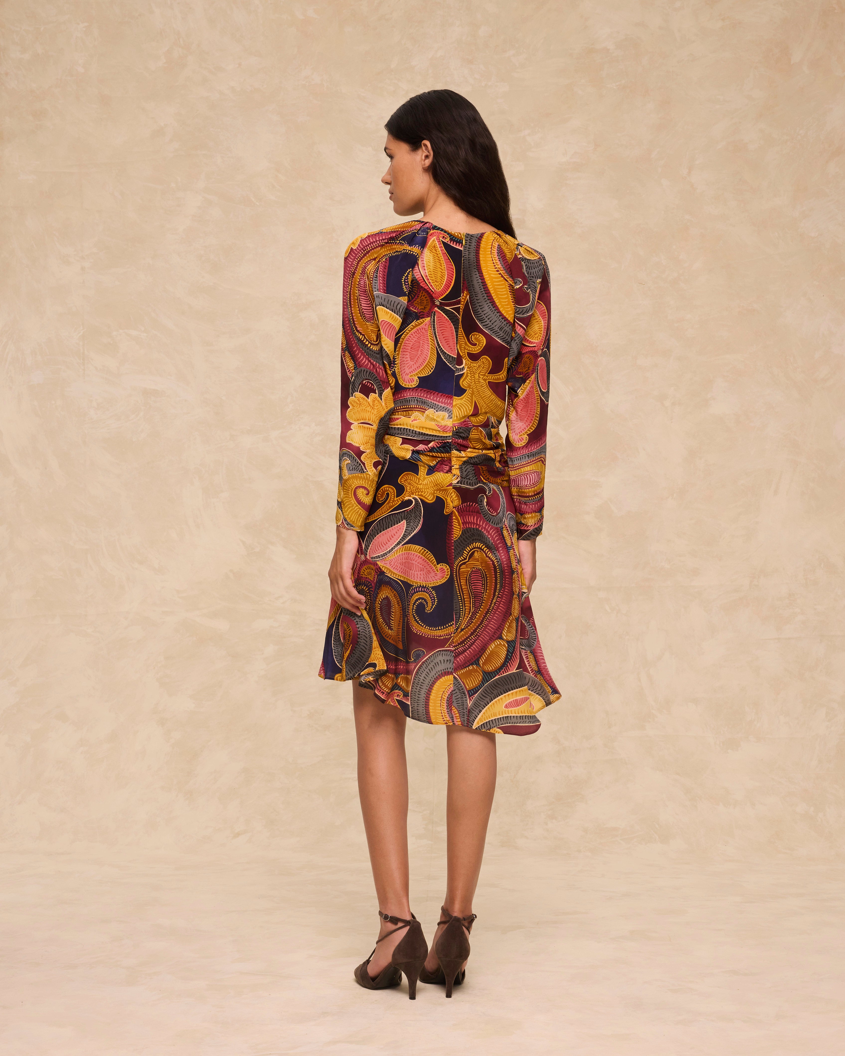 El vestido Flavie no pasará desapercibido gracias a su vibrante estampado paisley y sus llamativos colores. Diseñado con un escote en pico y mangas largas, presenta pliegues en la parte delantera de la falda que aportan movimiento y definición. Un cierre de cremallera oculto en la espalda garantiza un ajuste cómodo.