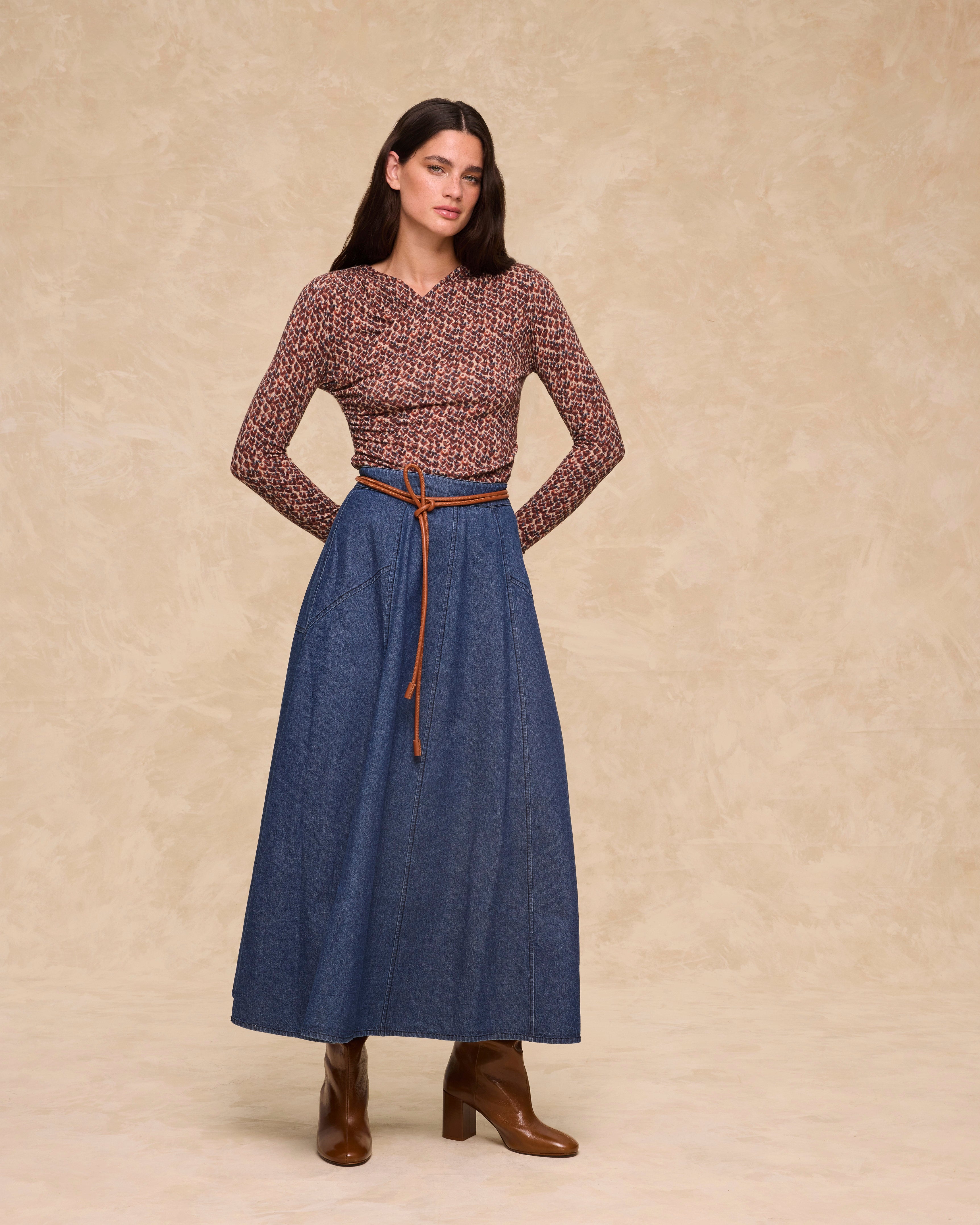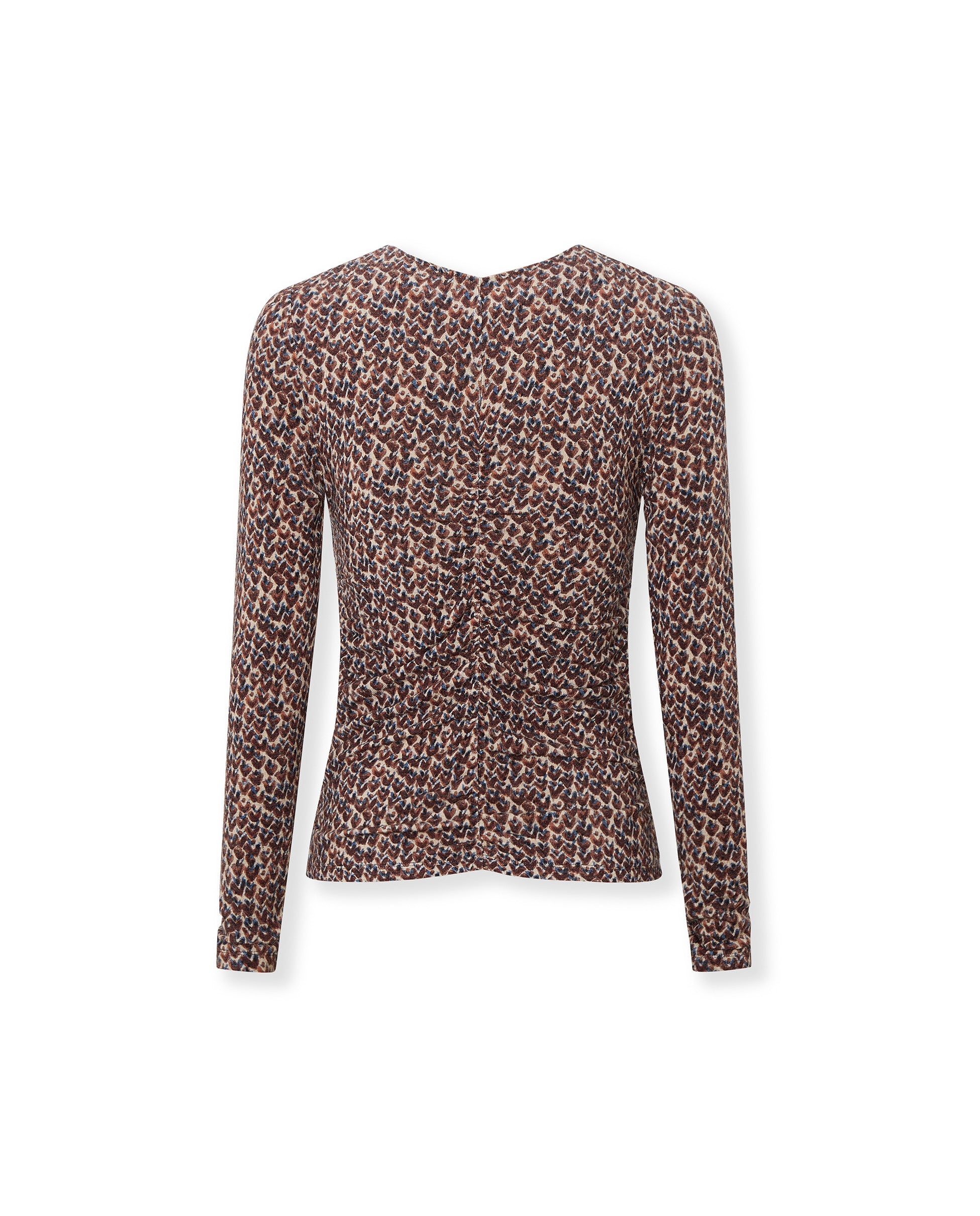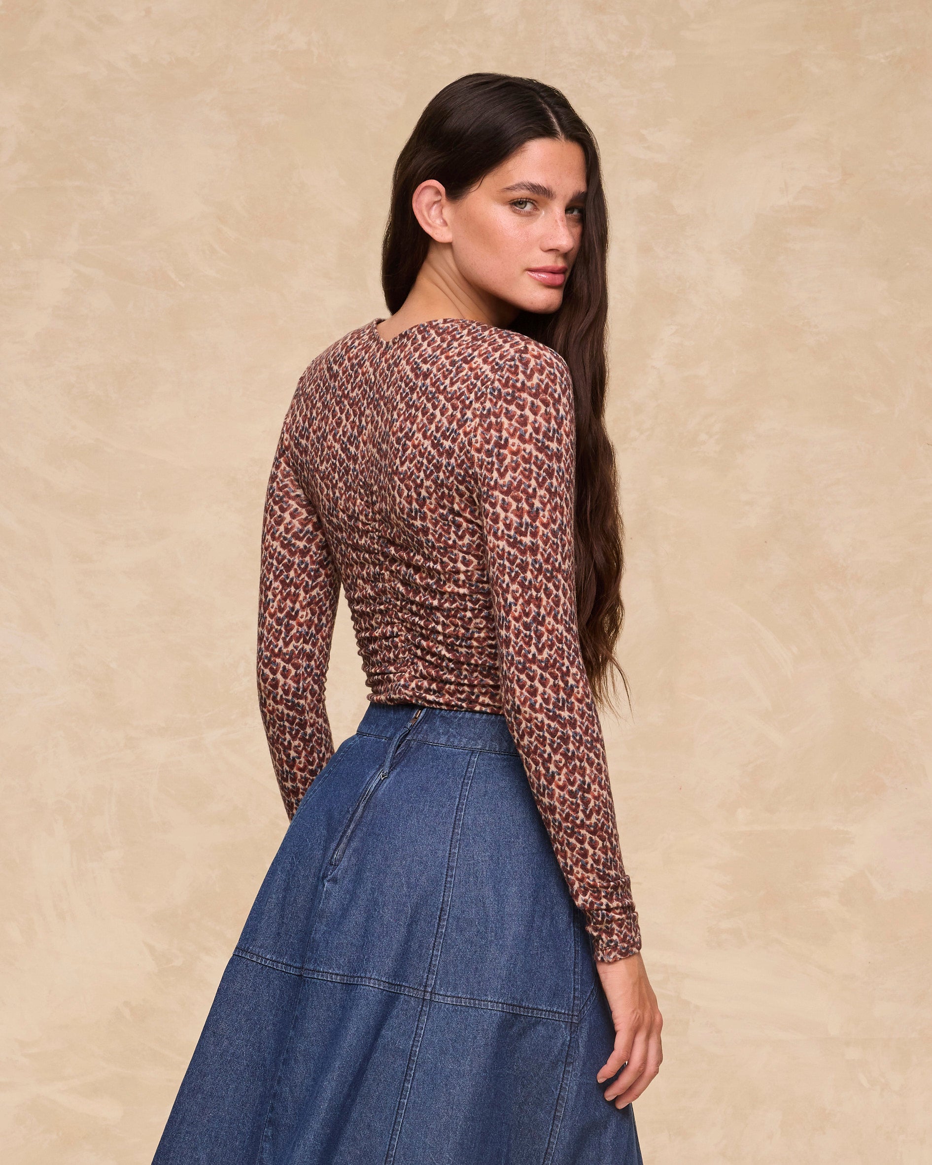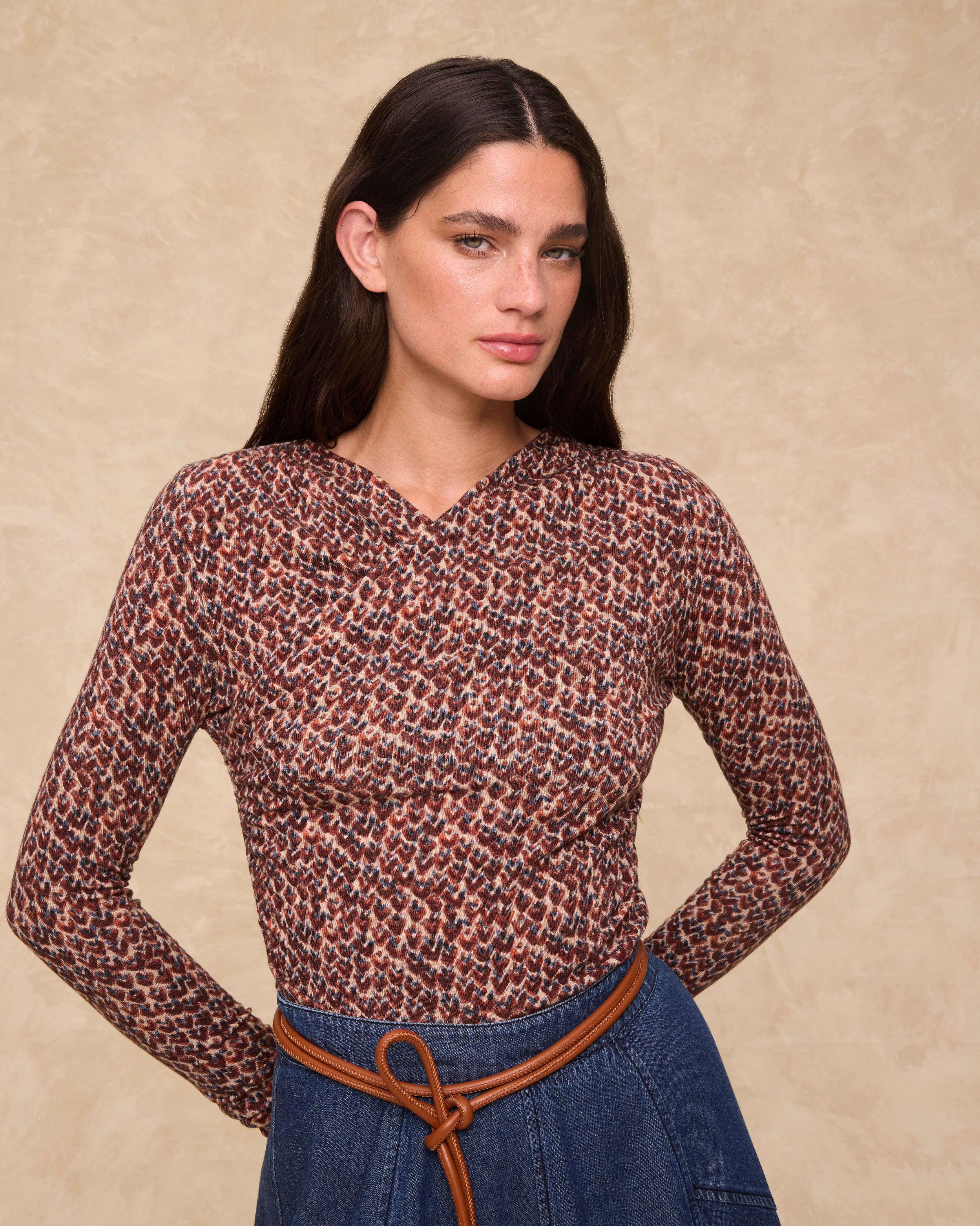 Ligero y de ajuste entallado, el top Marissa presenta un estampado floral abstracto en tonos de temporada. Con un delicado escote en V cruzado y frunces suaves en la espalda, está confeccionado en punto elástico para mayor comodidad. Ideal para combinar con denim o prendas sastreras según la ocasión.