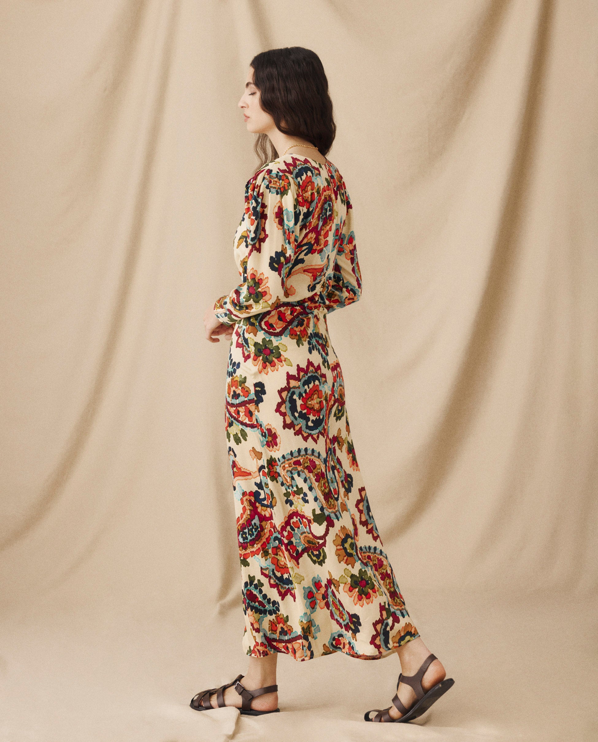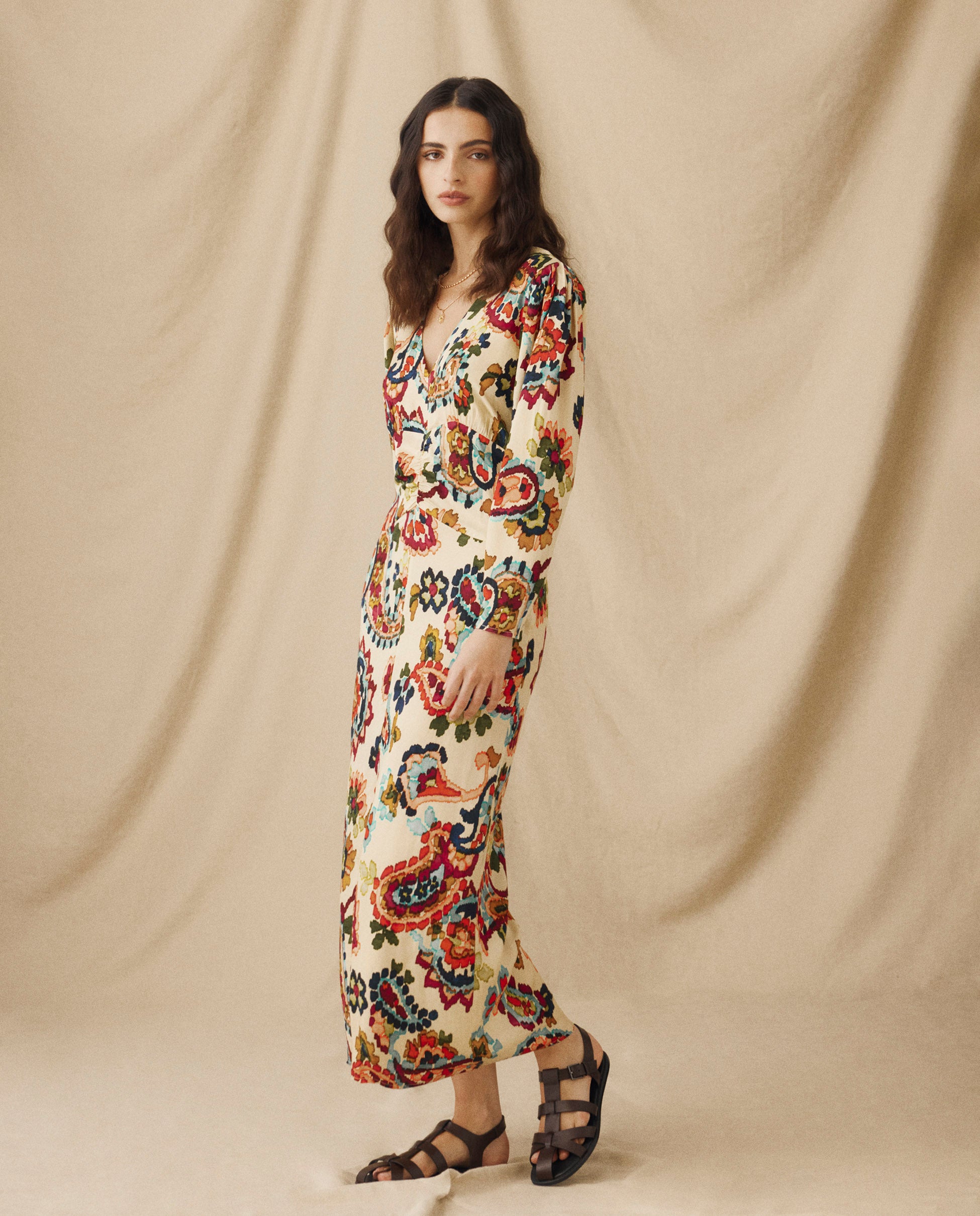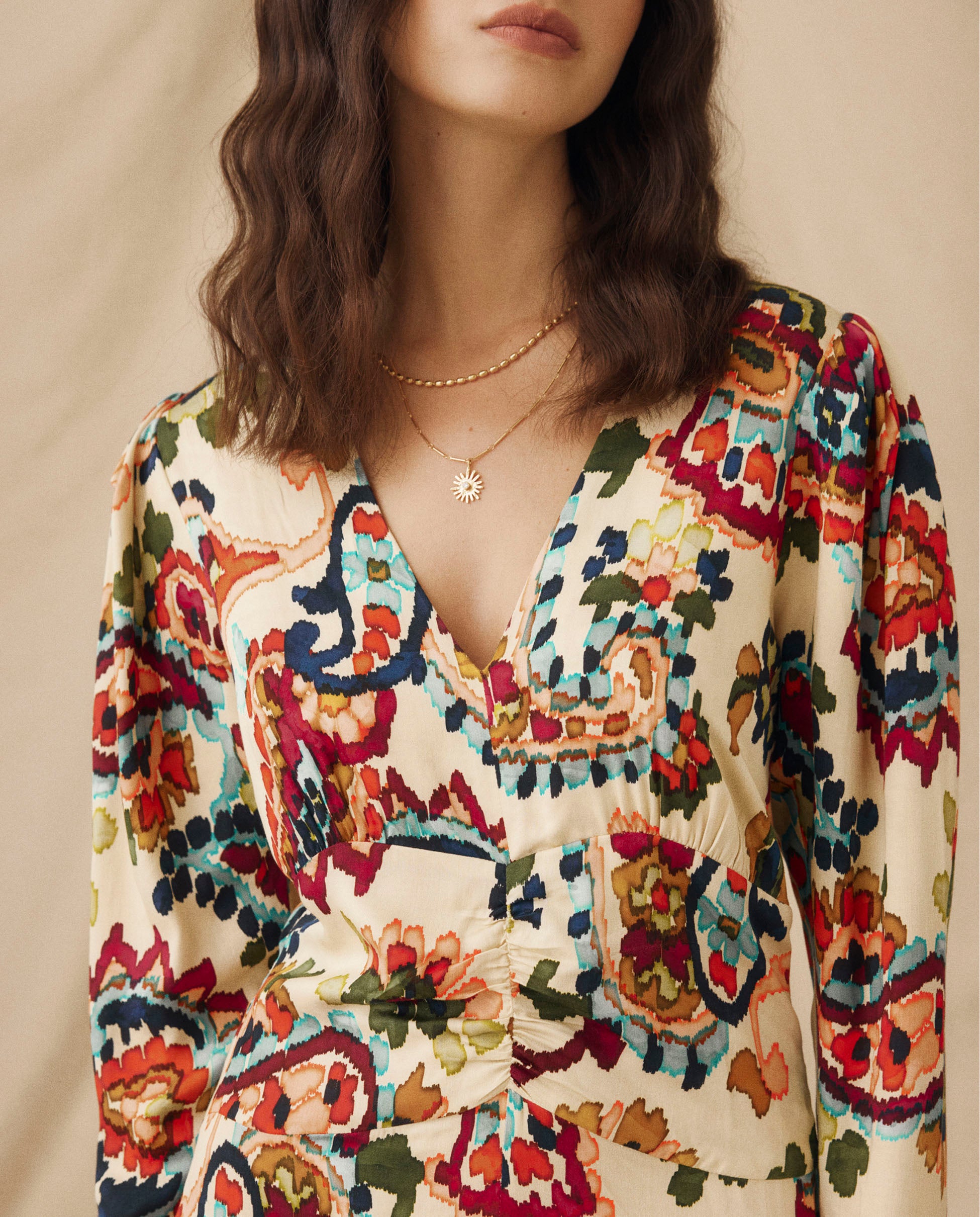 Vibrante pero refinado, el vestido Salena presenta una silueta que acompaña la figura con delicados pliegues en la cintura para una caída elegante. Confeccionado con mangas largas y puños con cremallera sutil, escote en pico favorecedor y abertura frontal que aporta libertad de movimiento, se cierra con una cremallera lateral oculta. Estampado con un diseño floral de estilo pictórico en tonos azul cobalto, rojo ladrillo, ámbar y verde musgo, aporta un acabado artístico y rico a una forma atemporal.