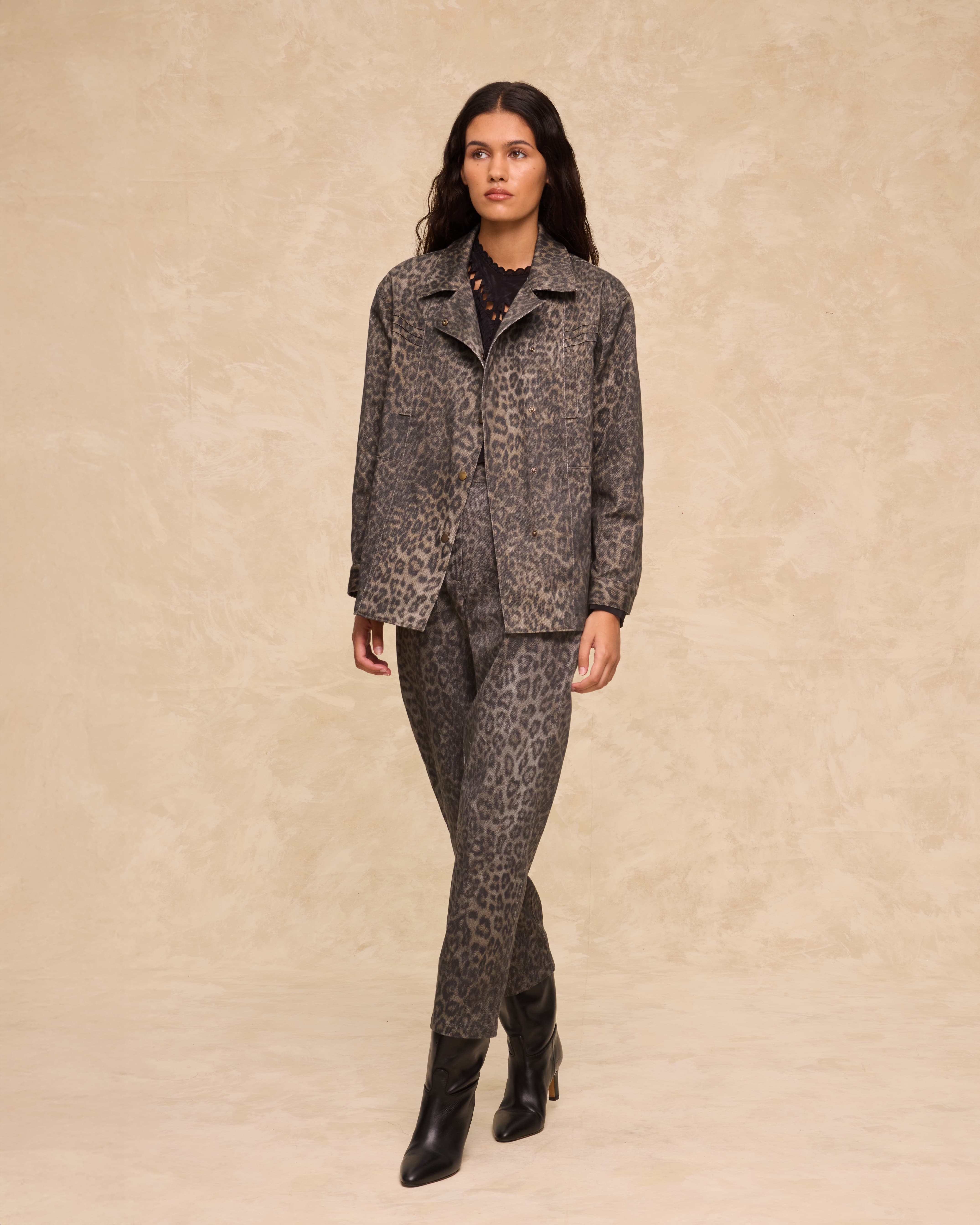 La chaqueta Olivia reinterpreta la sastrería clásica con un aire felino. Confeccionada en algodón, presenta un estampado de leopardo y un corte relajado.