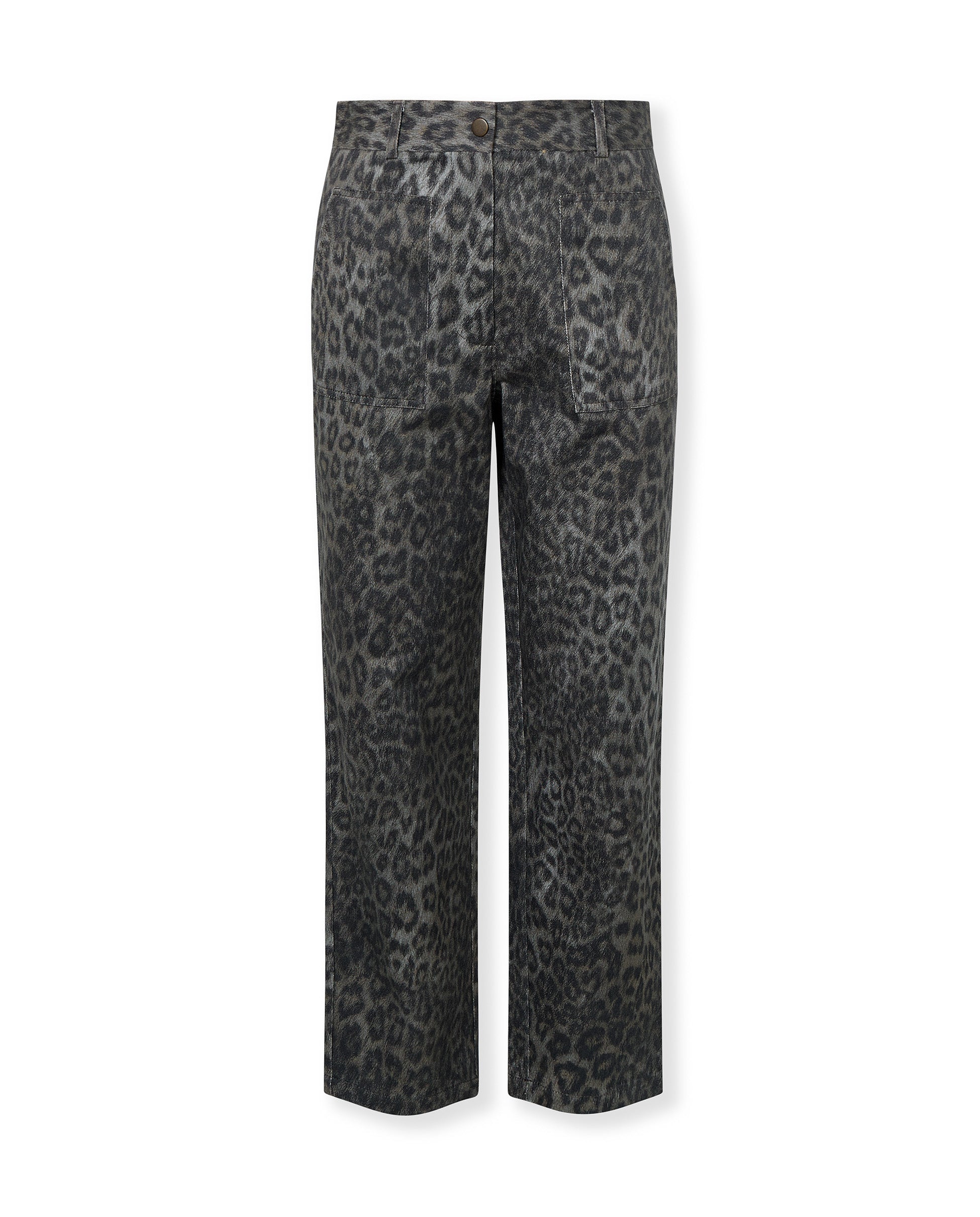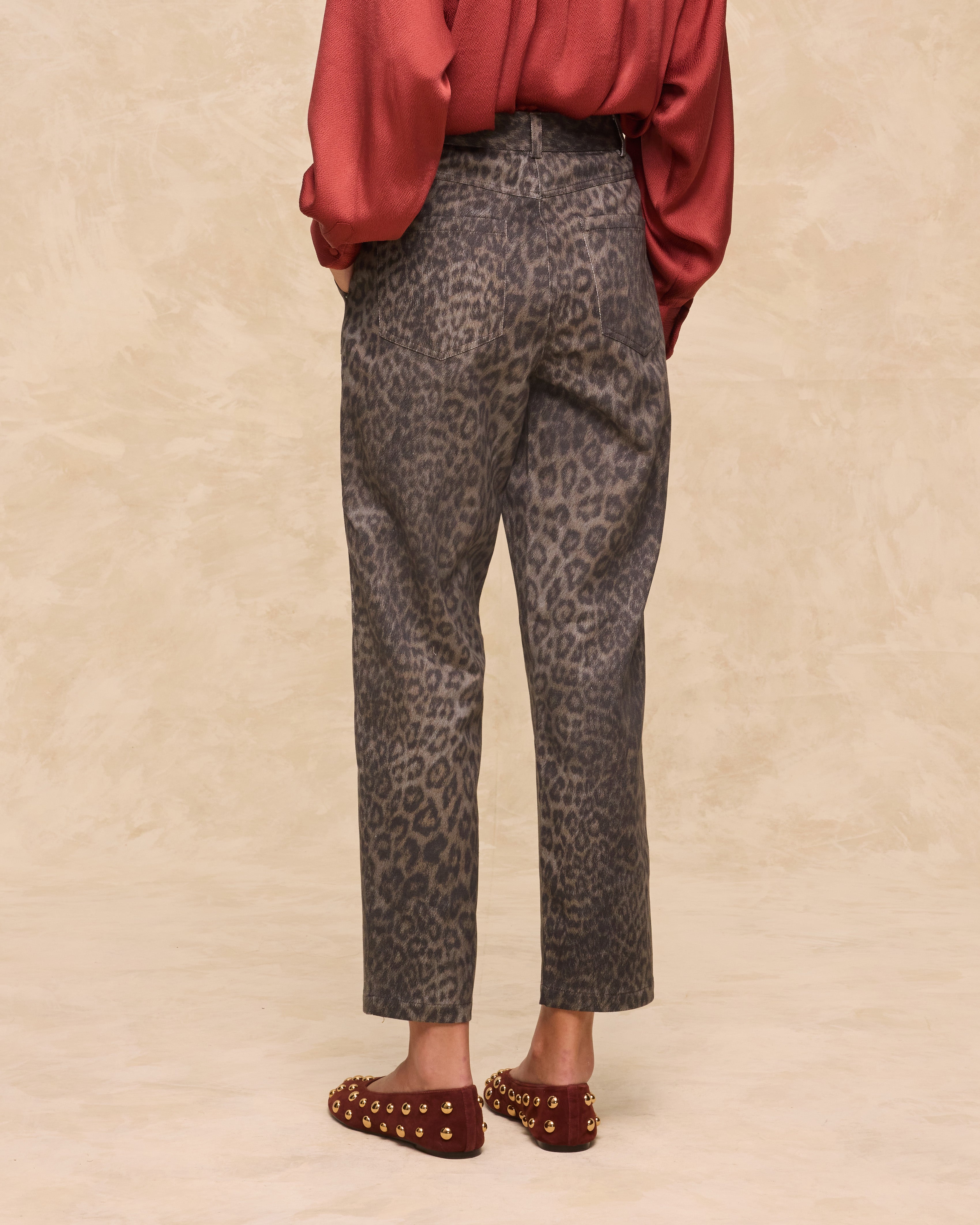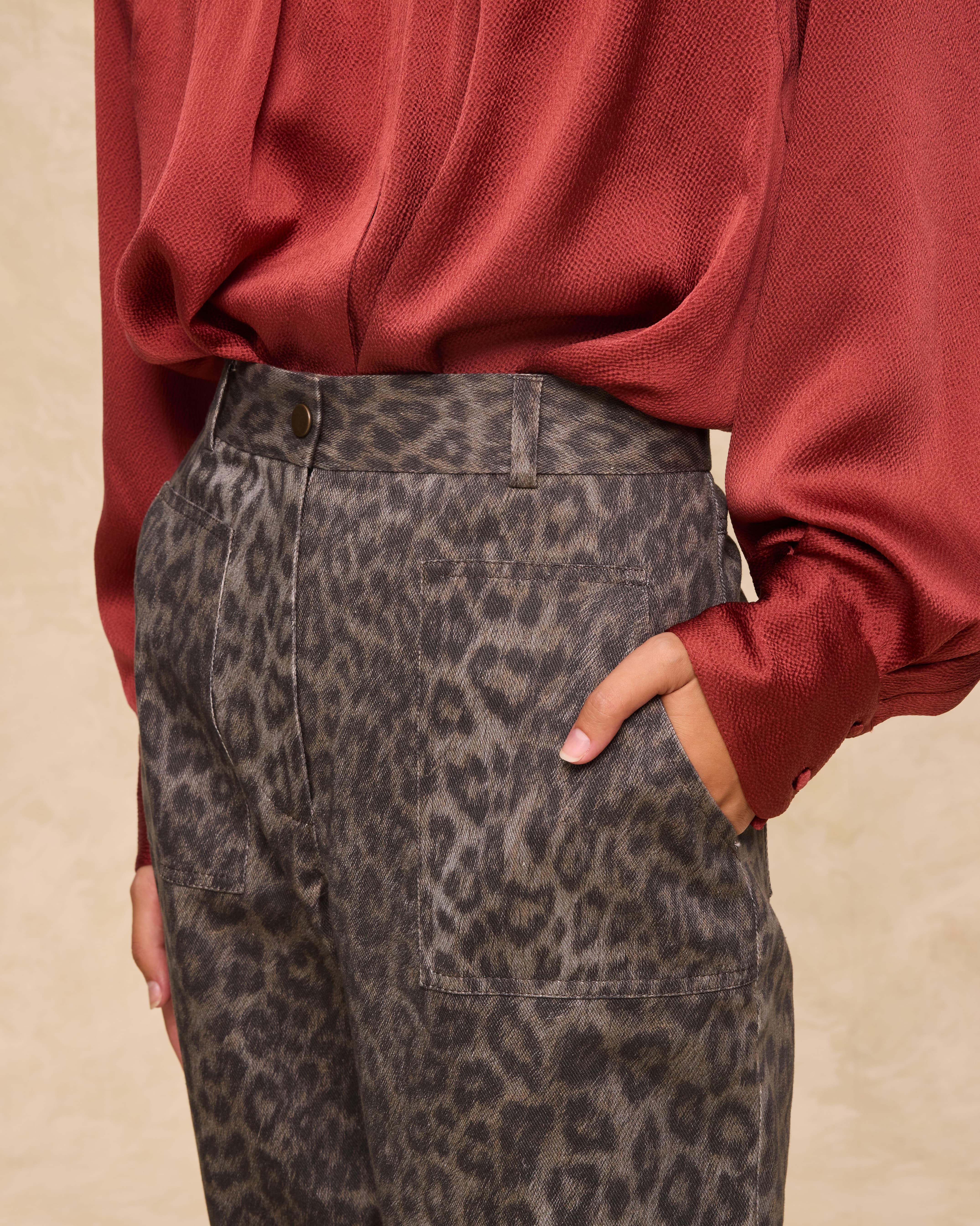 Confeccionado en algodón, el pantalón Olivia combina sastrería clásica con un estampado de leopardo en tonos caqui. De tiro alto y pierna recta ligeramente entallada, incluye bolsillos de parche al frente y cierre con cremallera y corchete metálico.