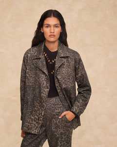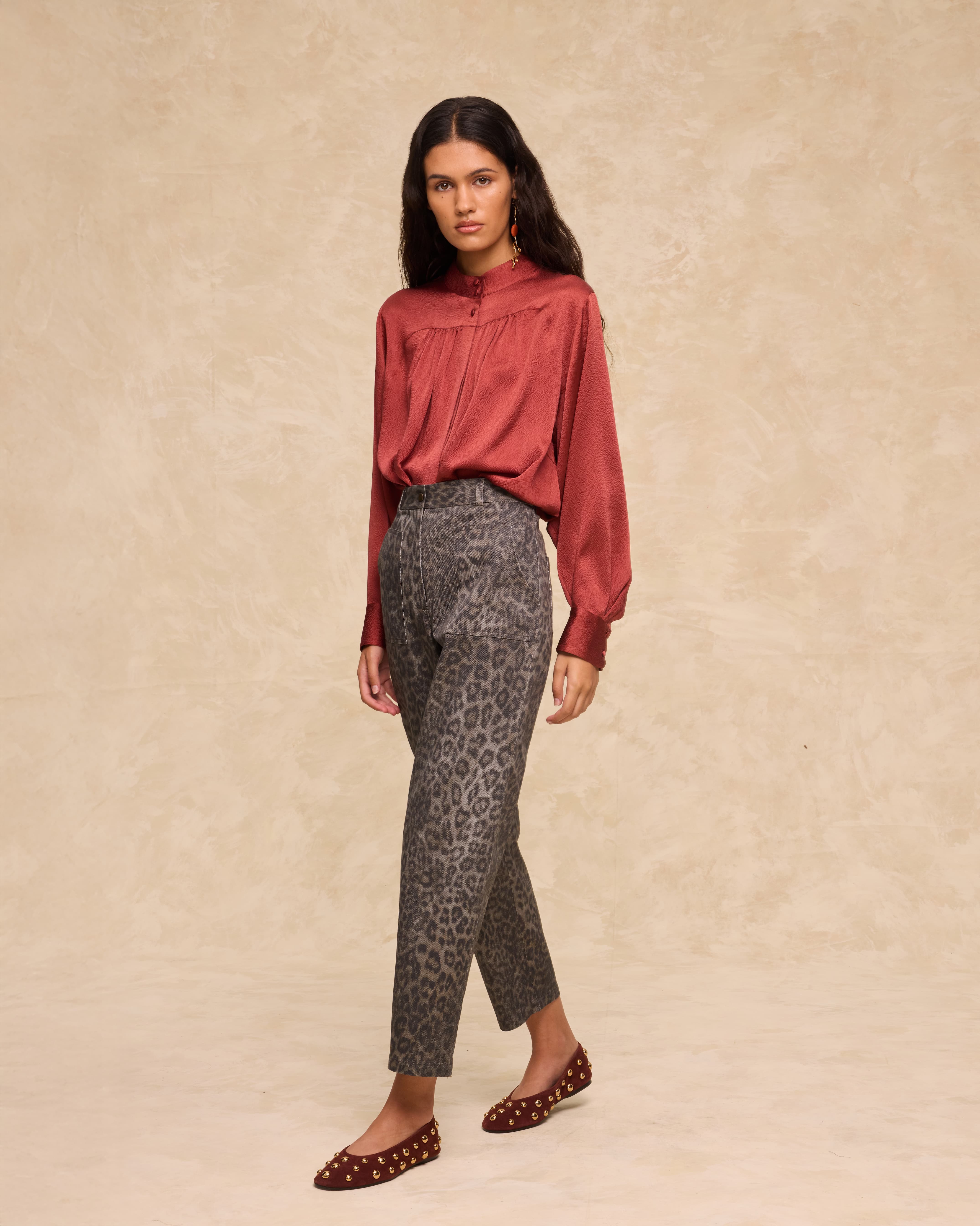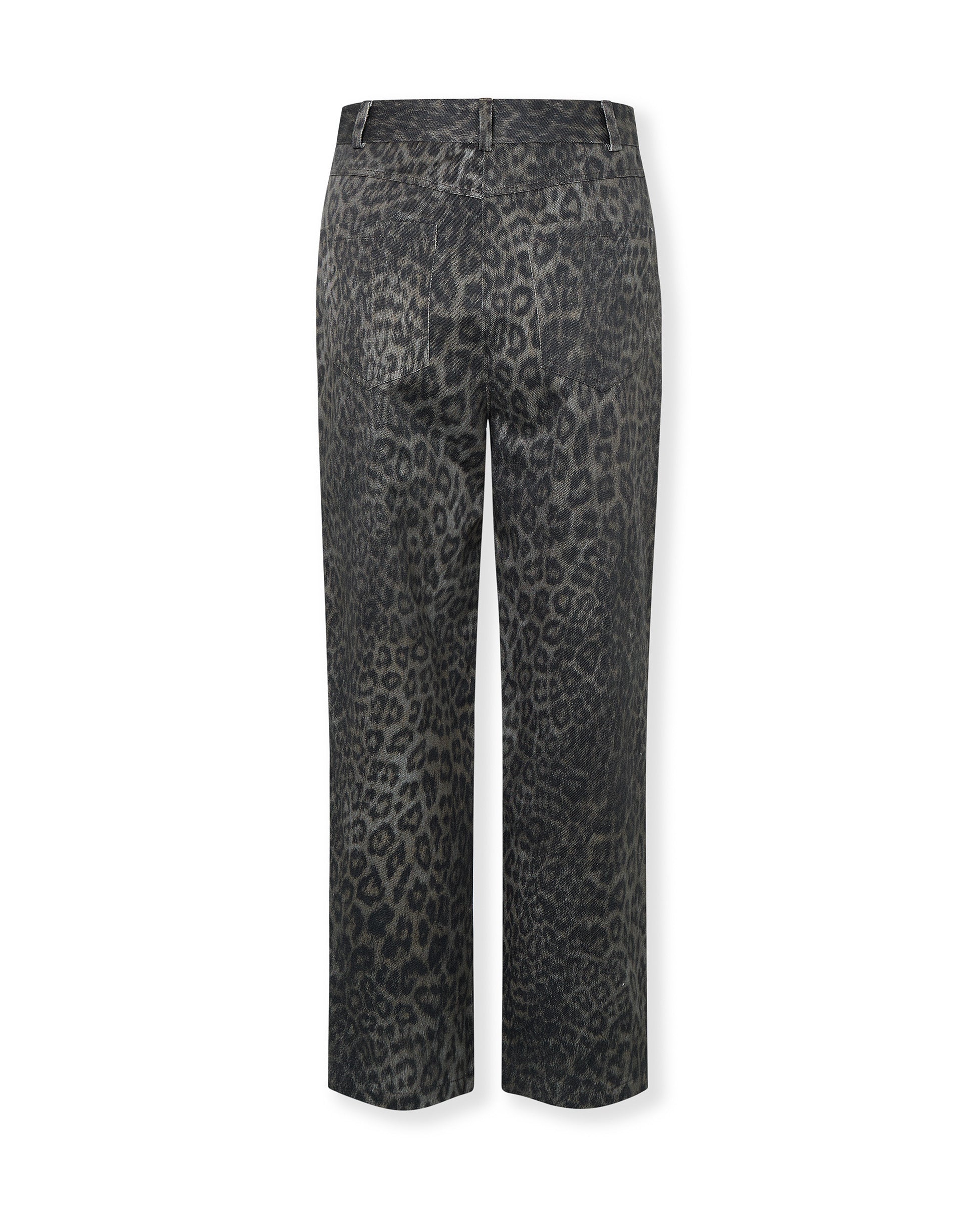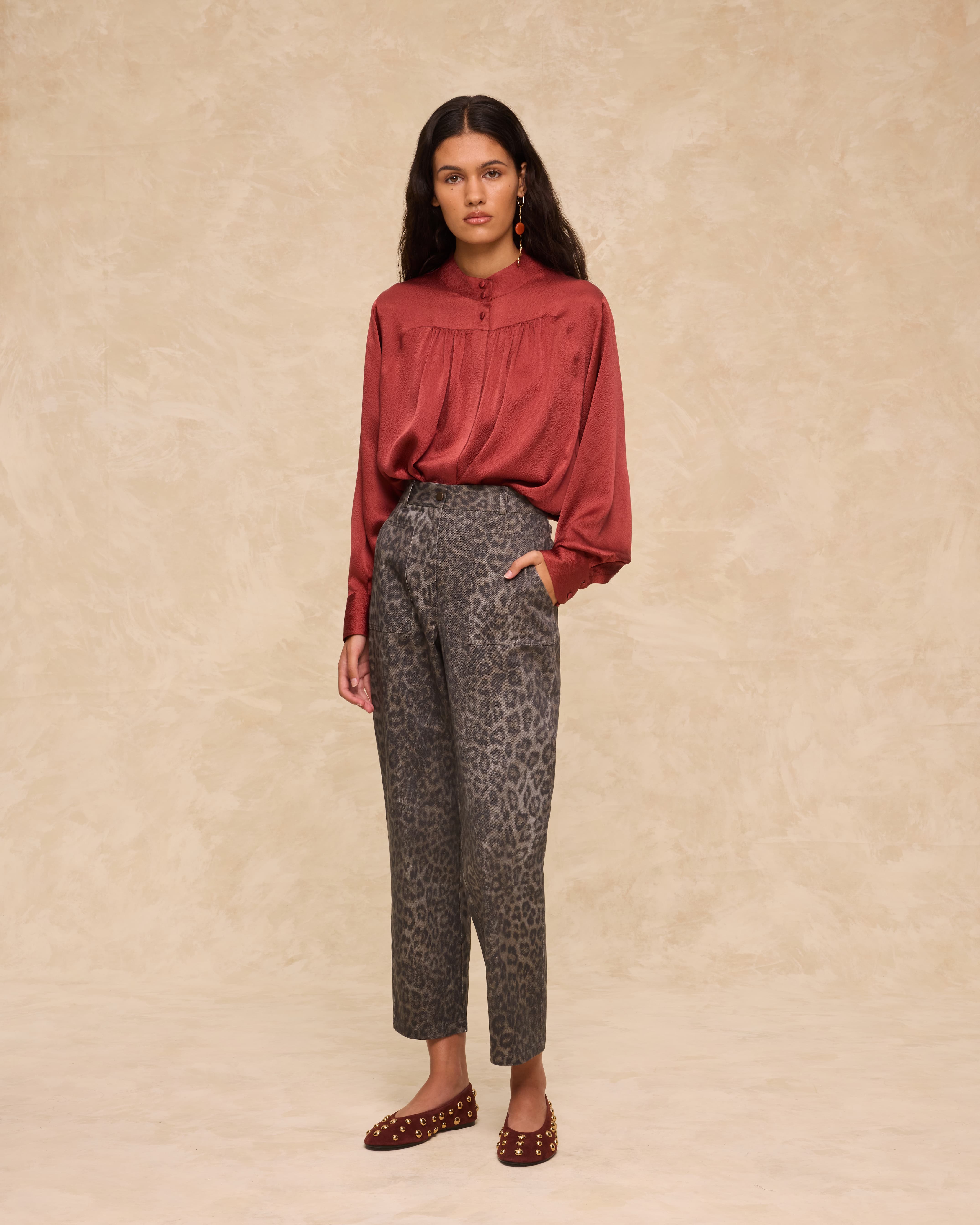 Confeccionado en algodón, el pantalón Olivia combina sastrería clásica con un estampado de leopardo en tonos caqui. De tiro alto y pierna recta ligeramente entallada, incluye bolsillos de parche al frente y cierre con cremallera y corchete metálico.