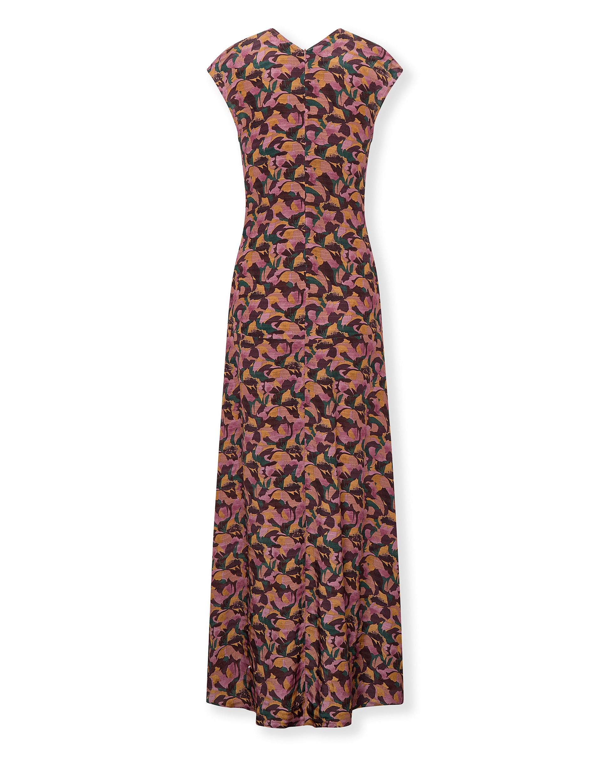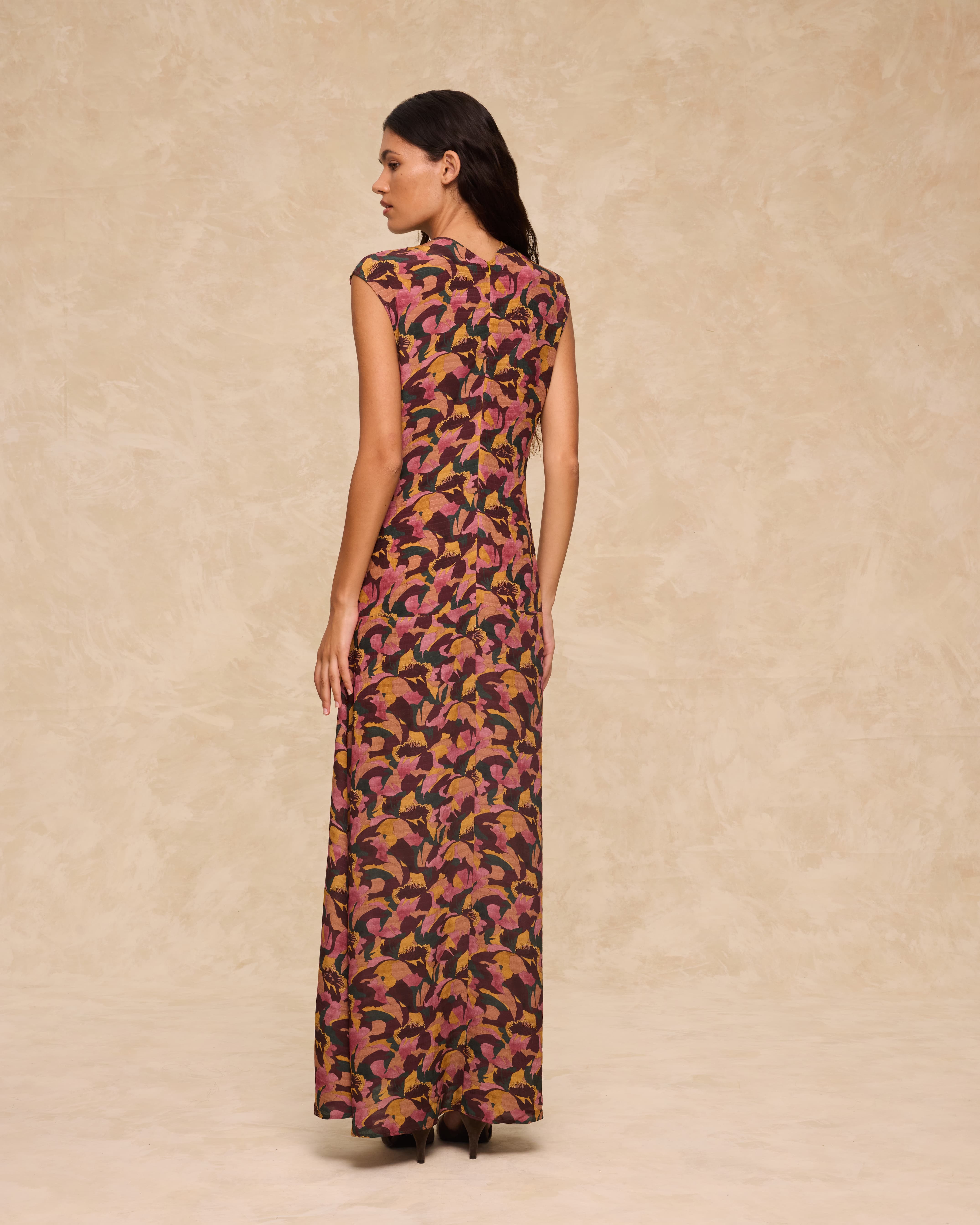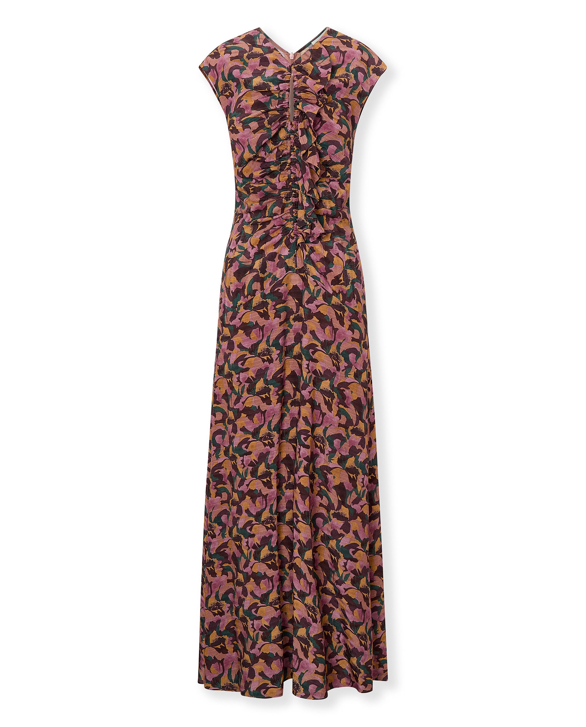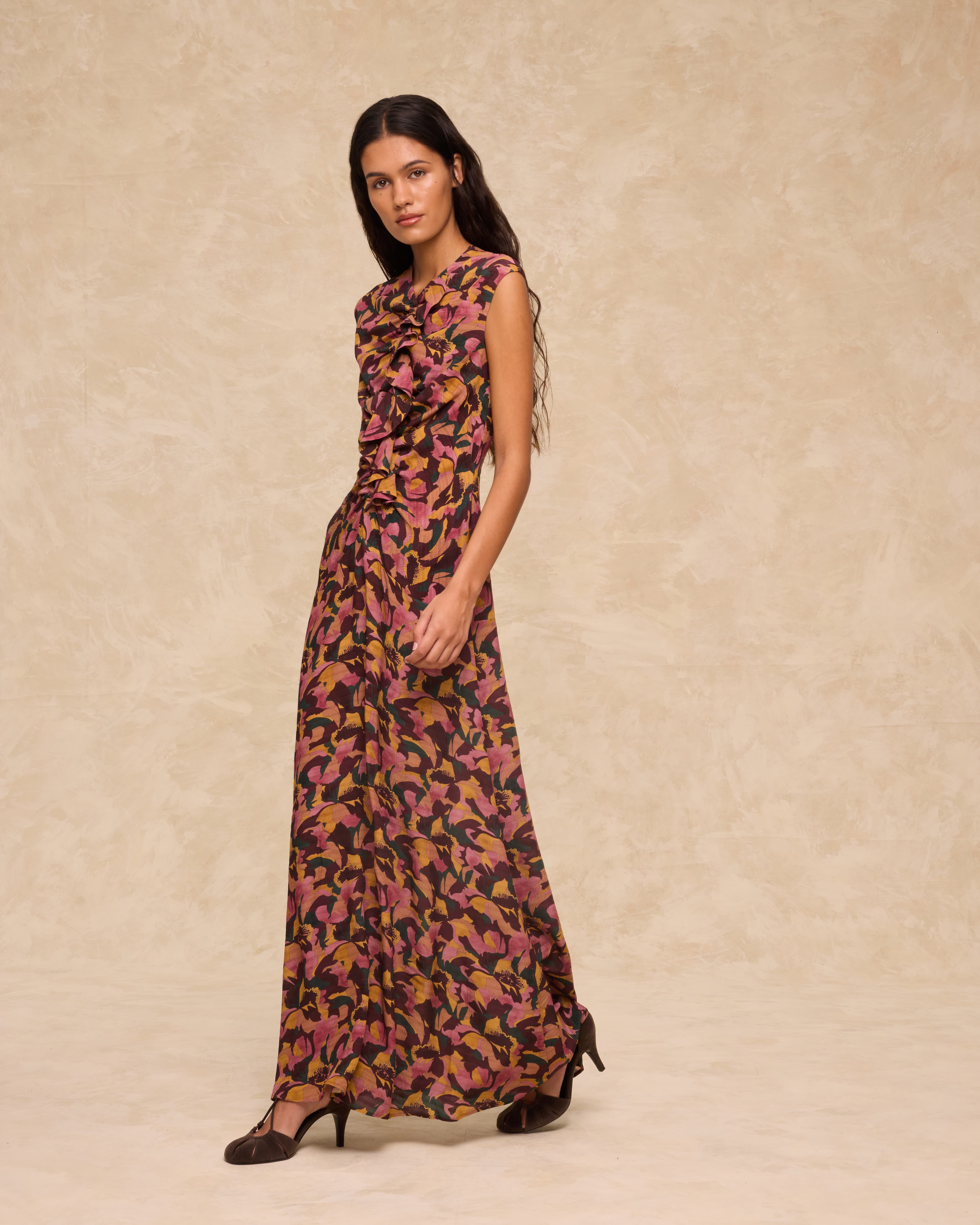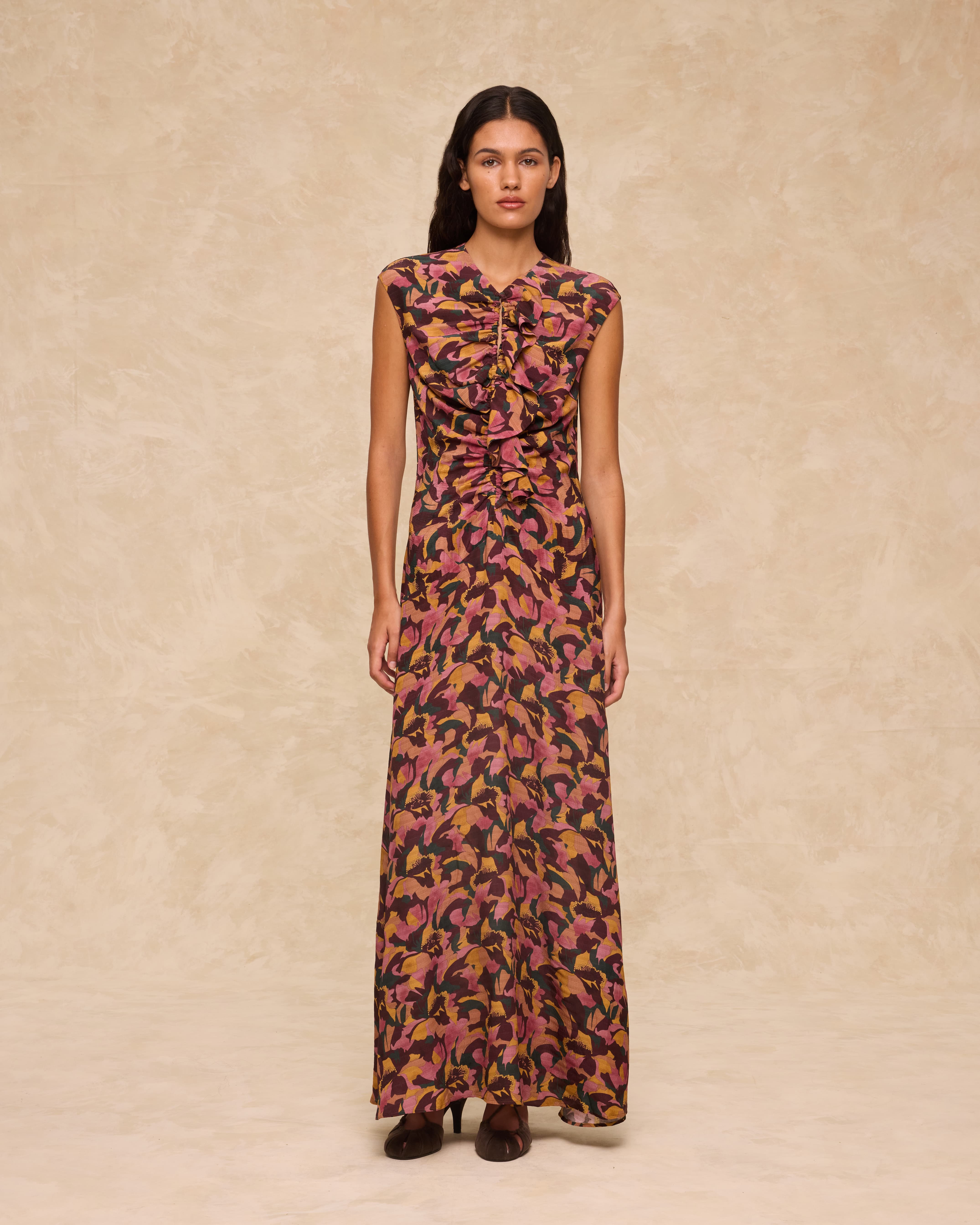 El vestido Saachi está diseñado con un llamativo estampado floral, presenta un panel frontal con volantes, delicados frunces y una pequeña abertura tipo lágrima en el escote. Su silueta sin mangas y de largo completo se ajusta suavemente al cuerpo y se cierra con una cremallera invisible en la espalda.