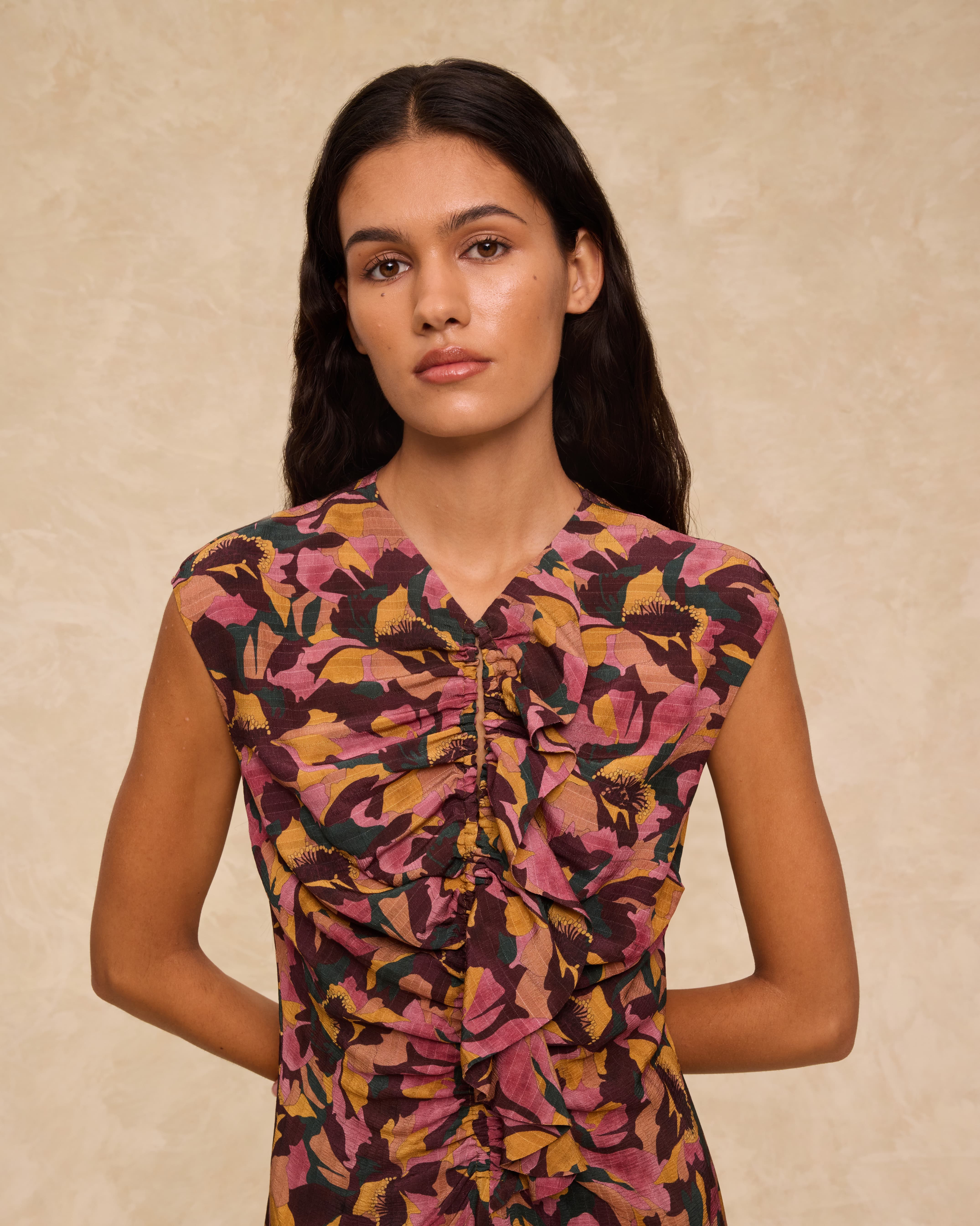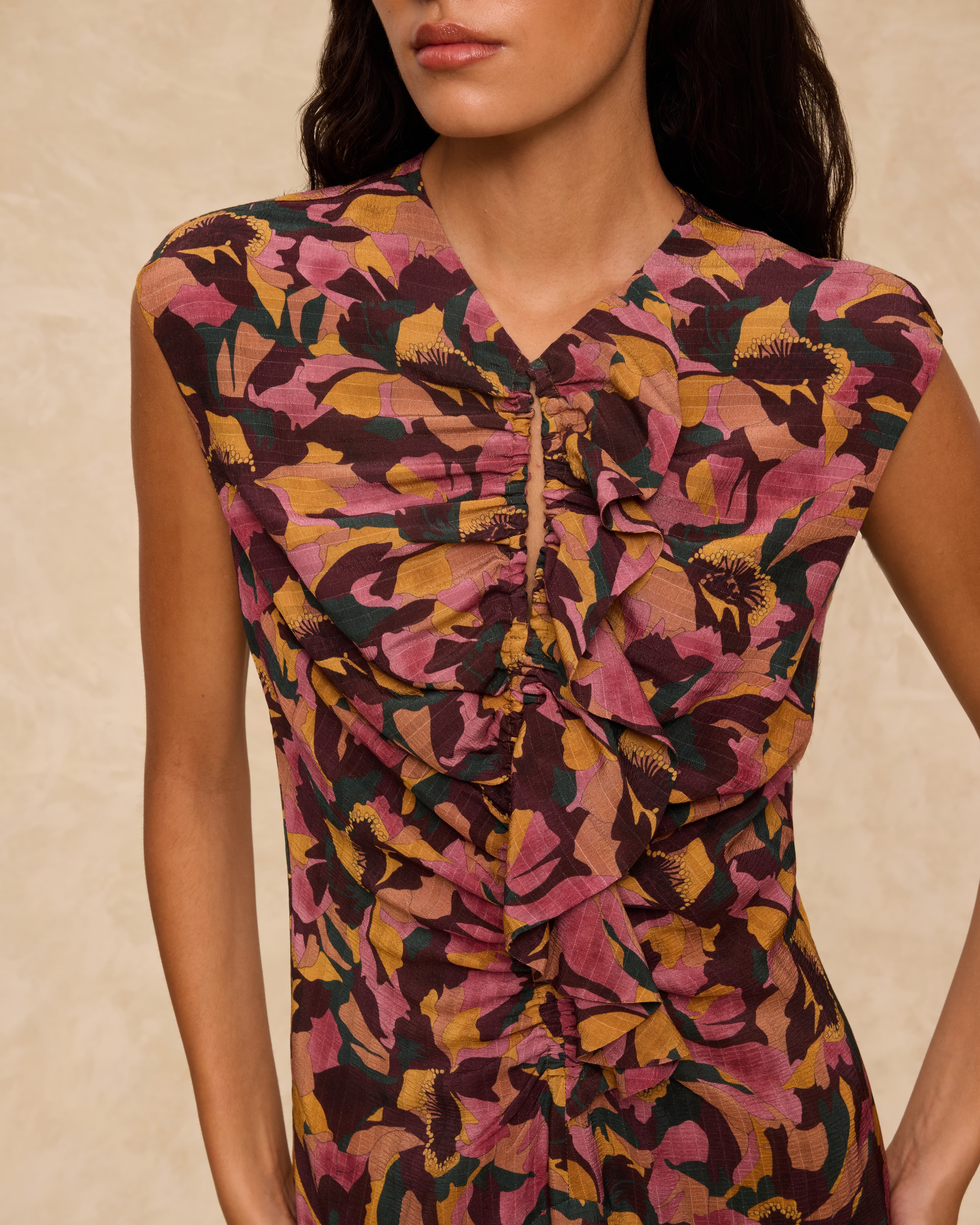 • Silueta sin mangas con volantes y frunces en el frente
