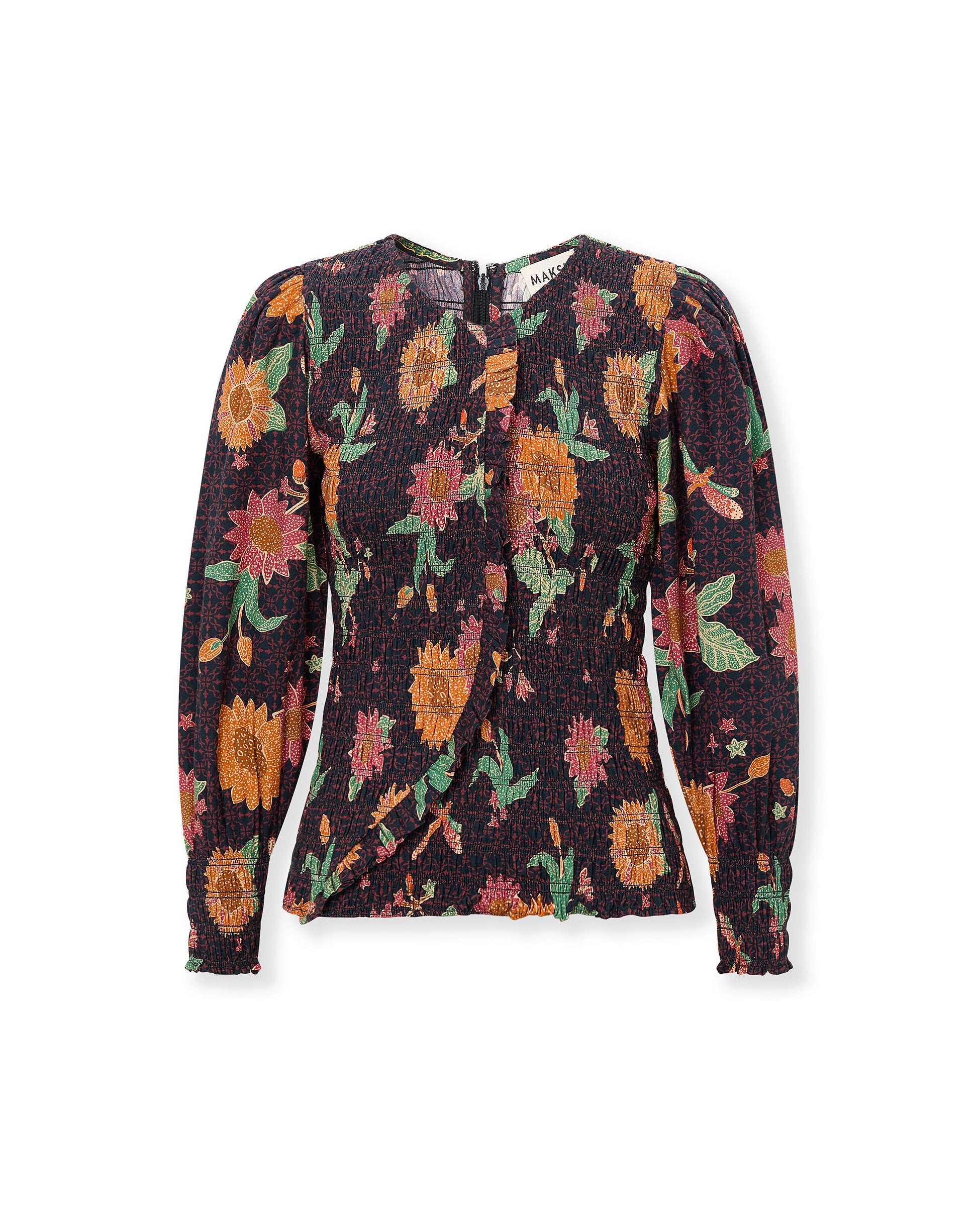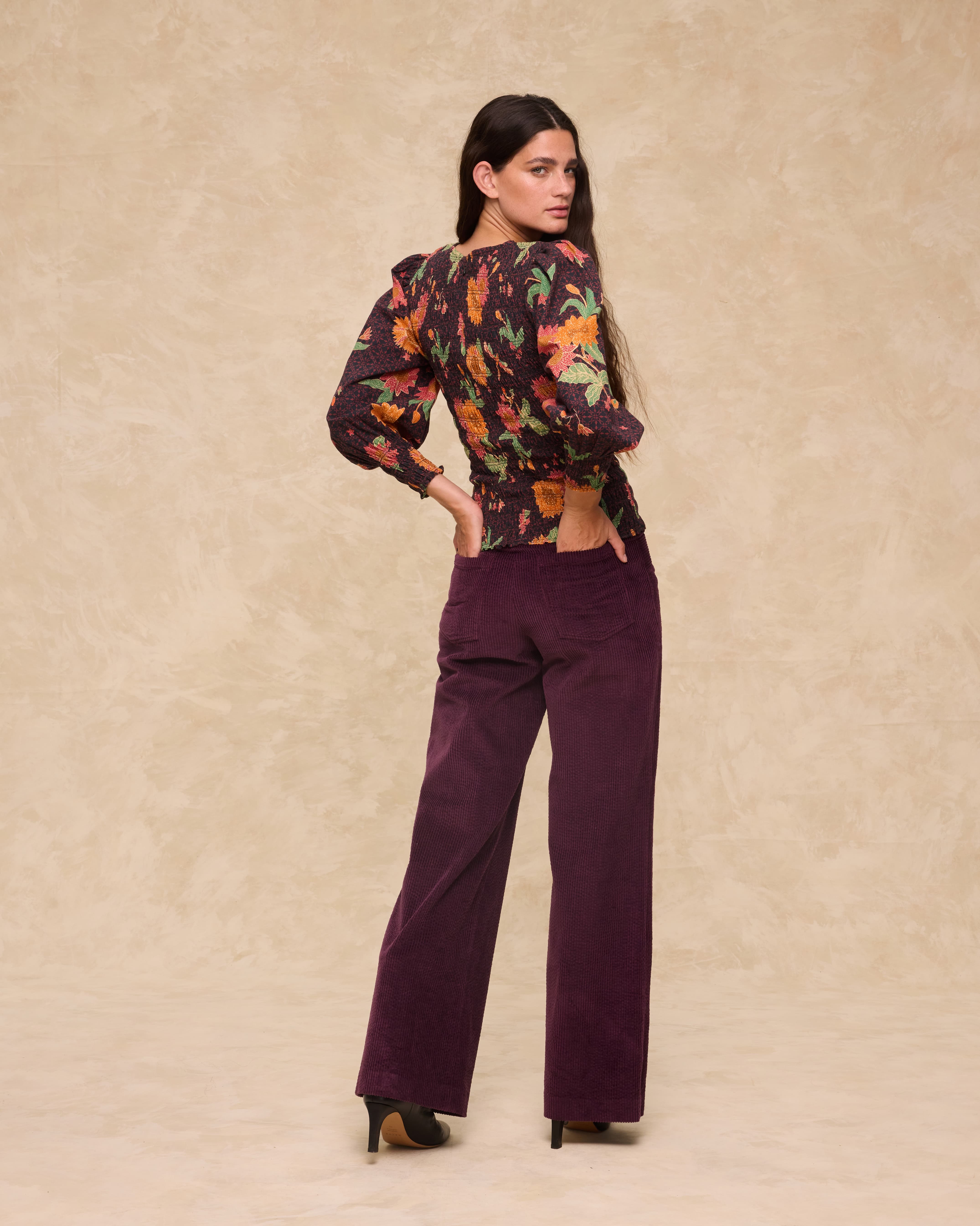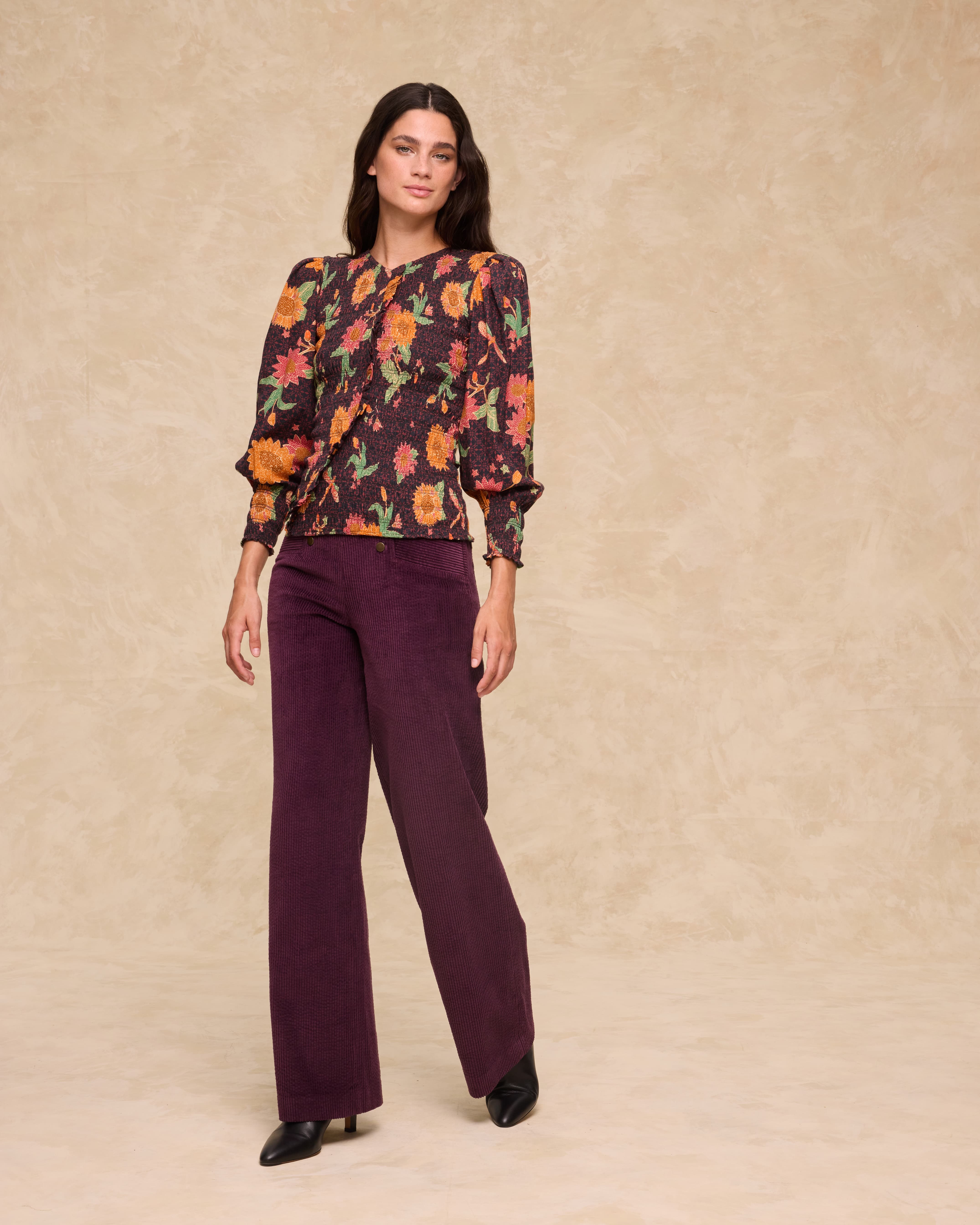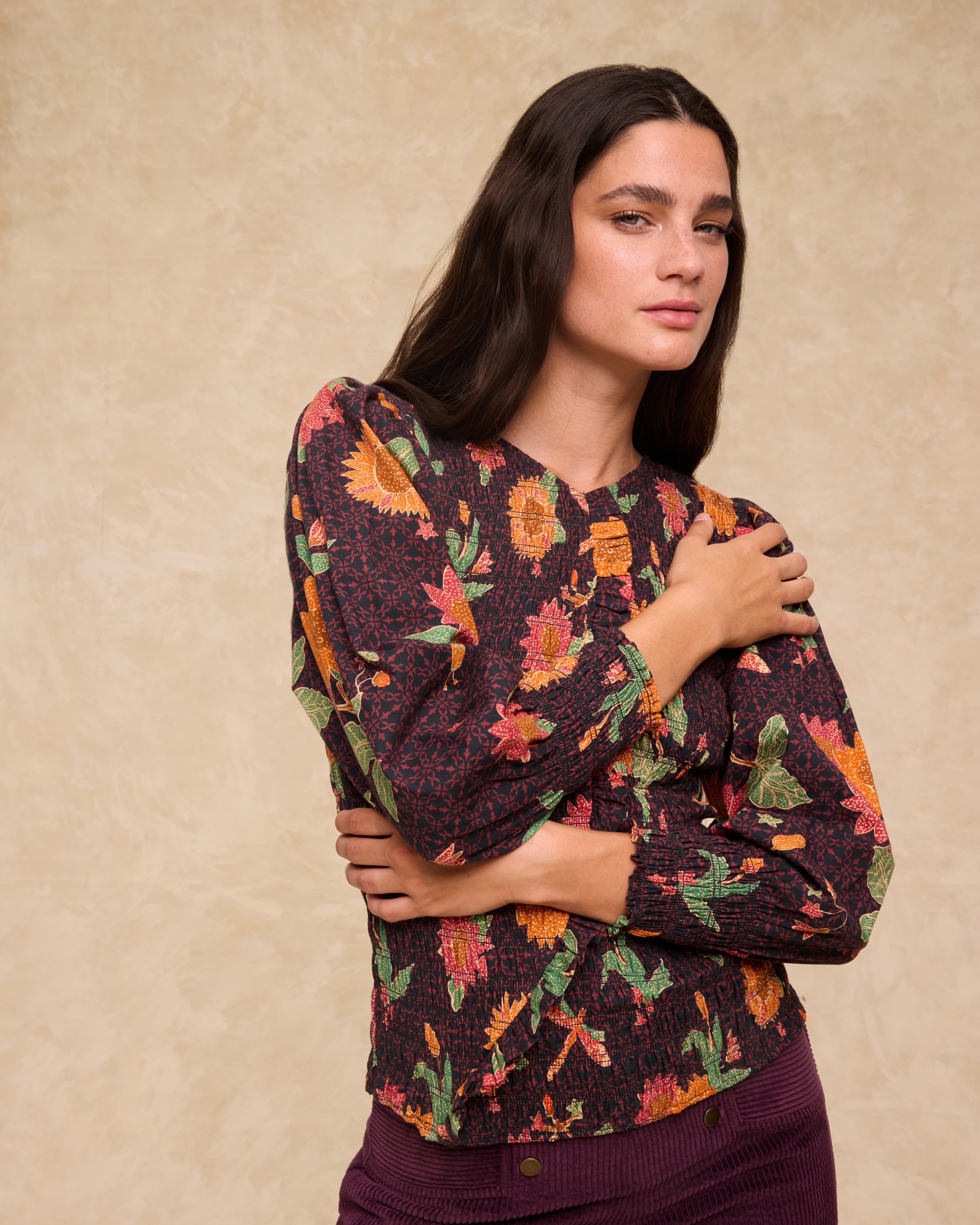 La blusa Scarlet está confeccionada en 100% algodón, presenta un escote redondo, mangas voluminosas con puños fruncidos y un bajo tipo péplum con volantes que realza la silueta. Se completa con una cremallera oculta en la espalda para un ajuste impecable.