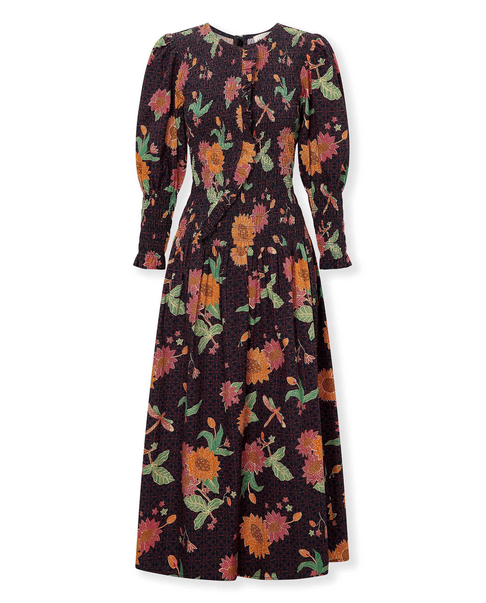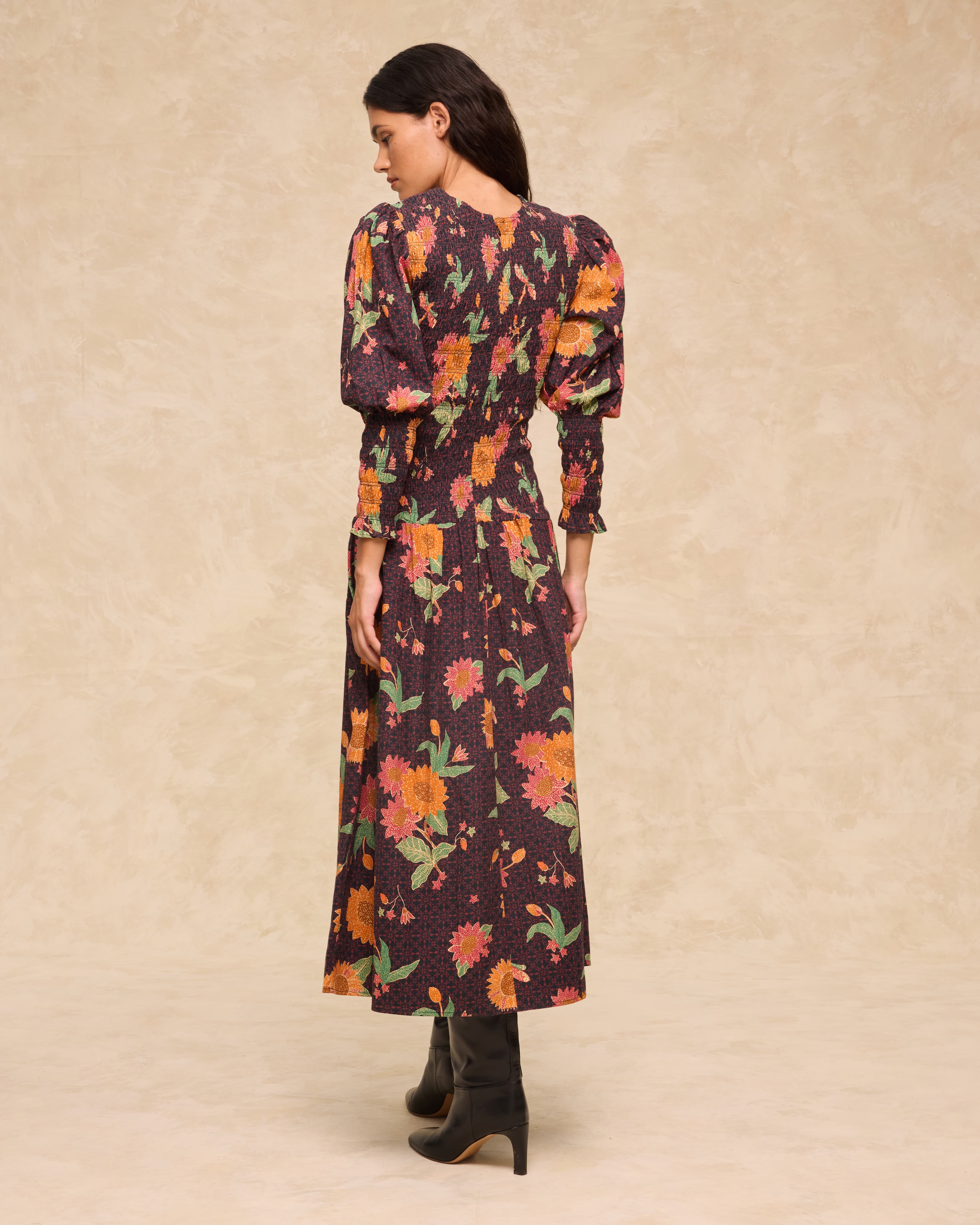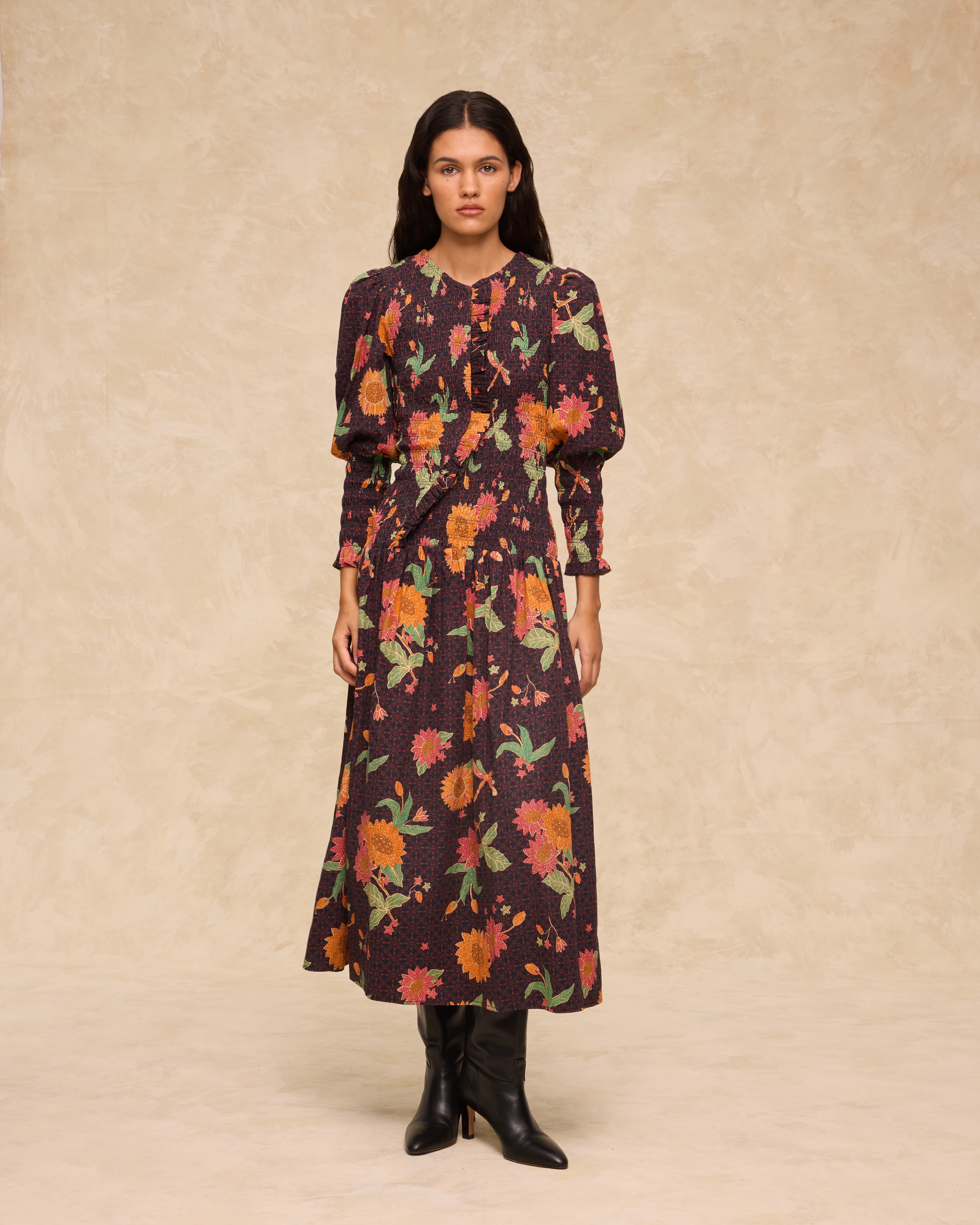 Flores vibrantes y textura fruncida se combinan en el vestido Scarlet. Confeccionado en 100% algodón, mangas abullonadas estructuradas y una falda con suaves recogidos. Los detalles de volantes y la cremallera oculta en la espalda completan el diseño.