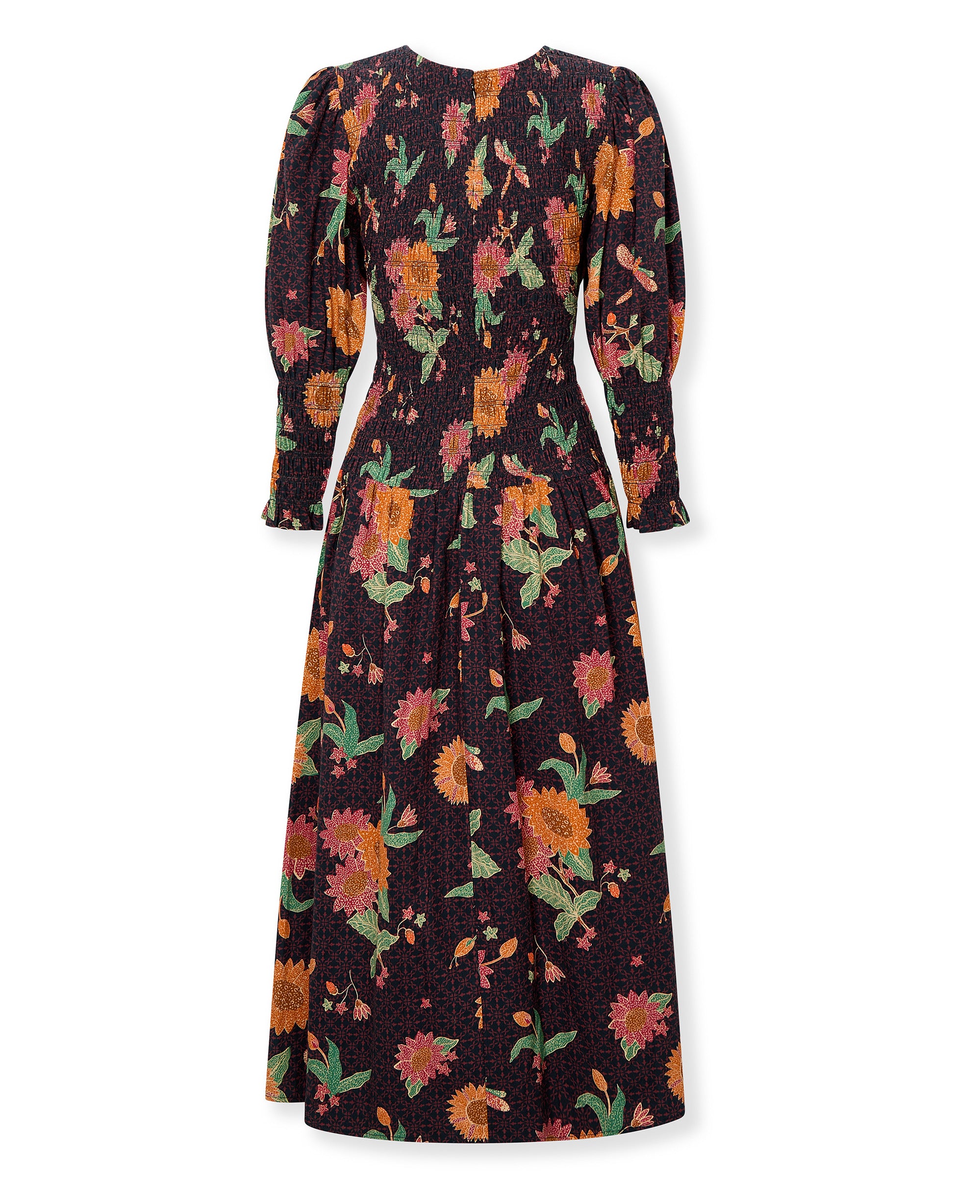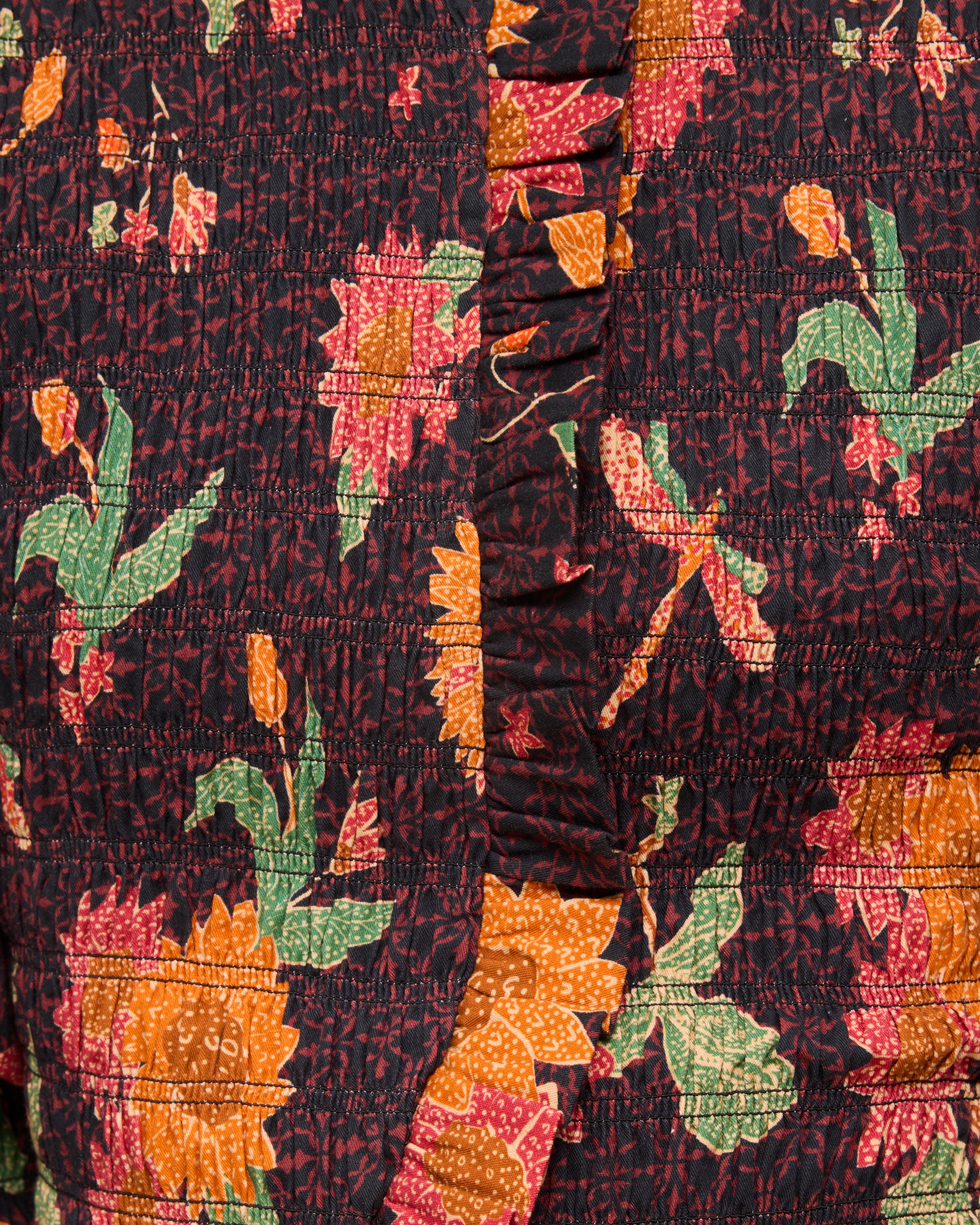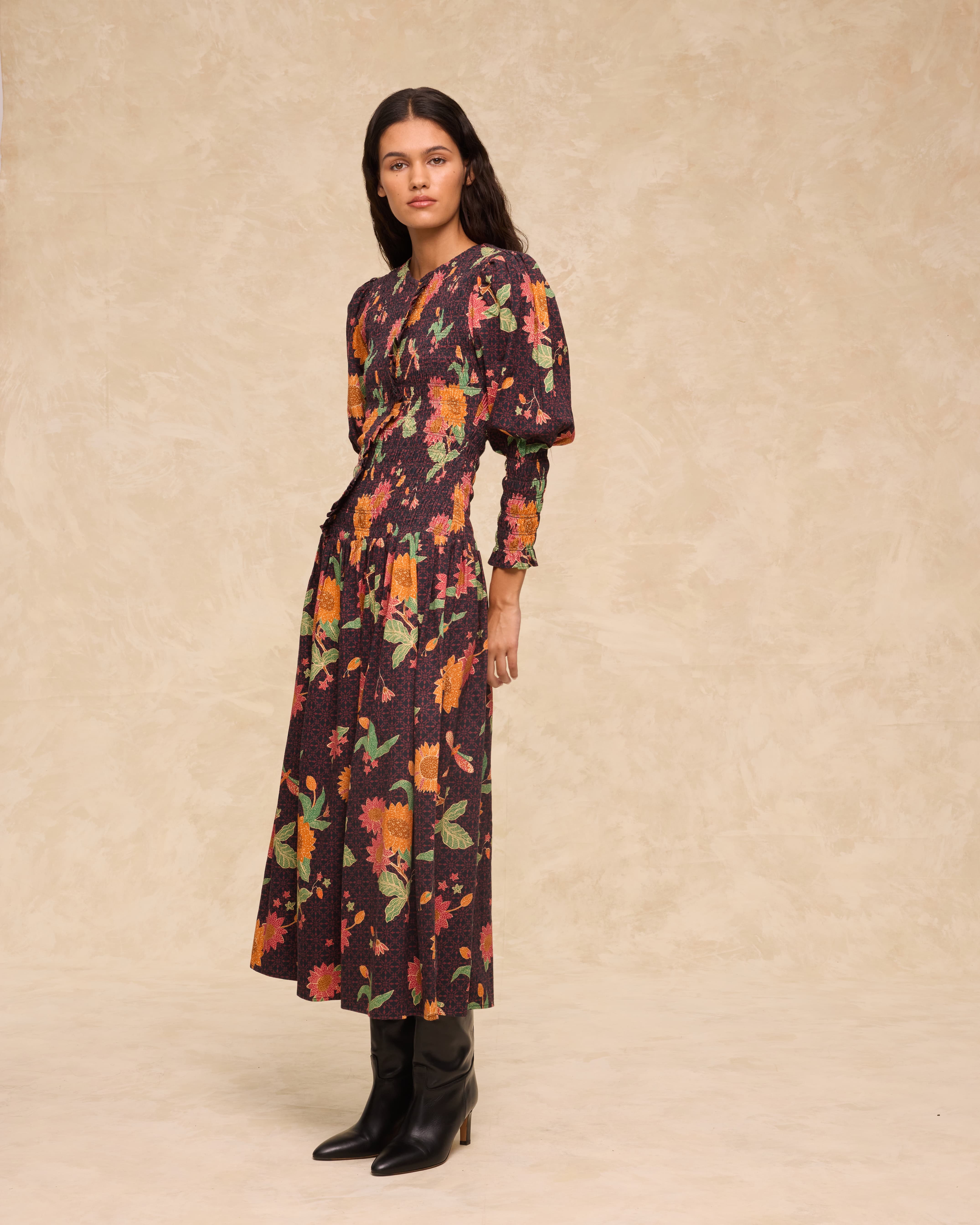 Flores vibrantes y textura fruncida se combinan en el vestido Scarlet. Confeccionado en 100% algodón, mangas abullonadas estructuradas y una falda con suaves recogidos. Los detalles de volantes y la cremallera oculta en la espalda completan el diseño.