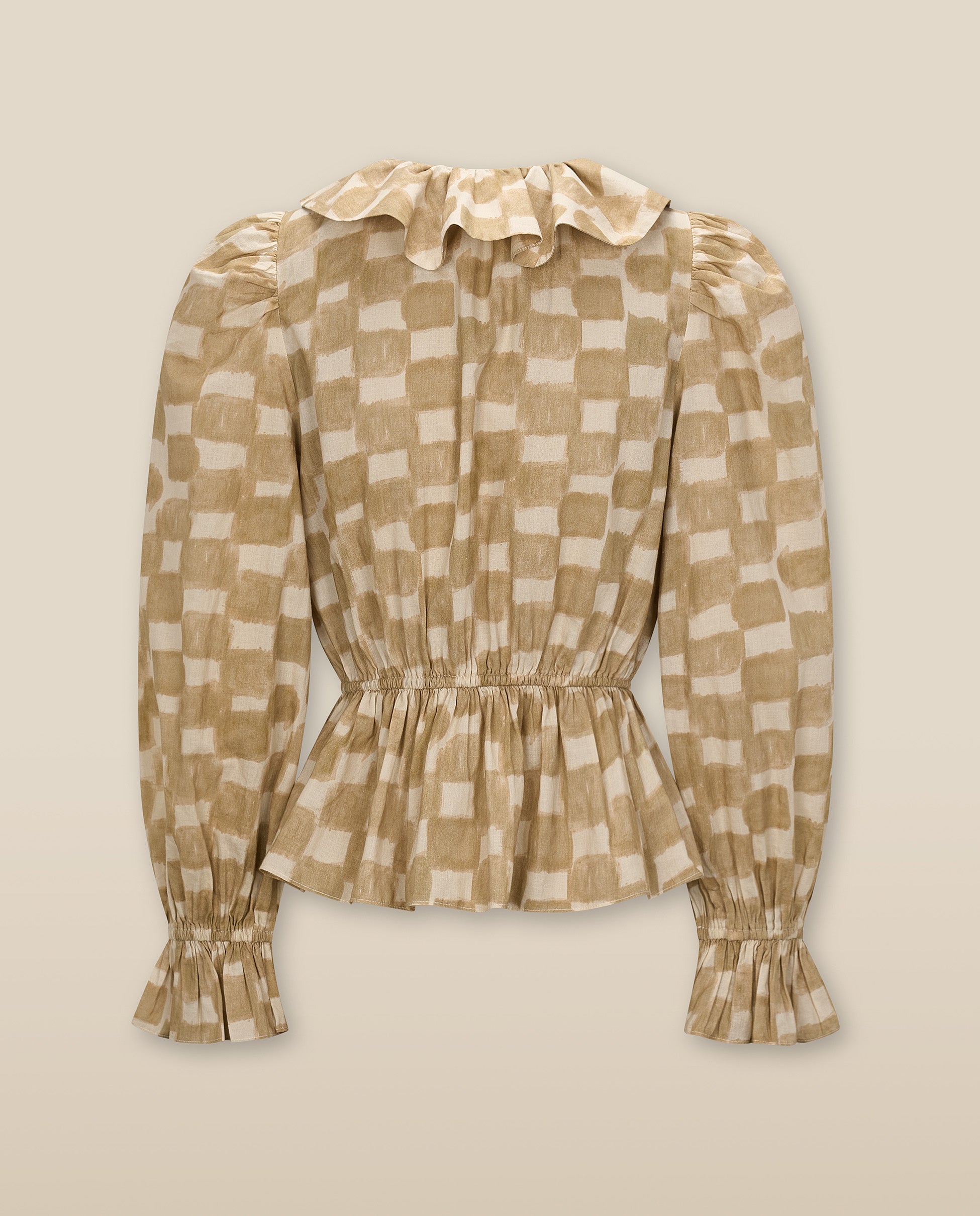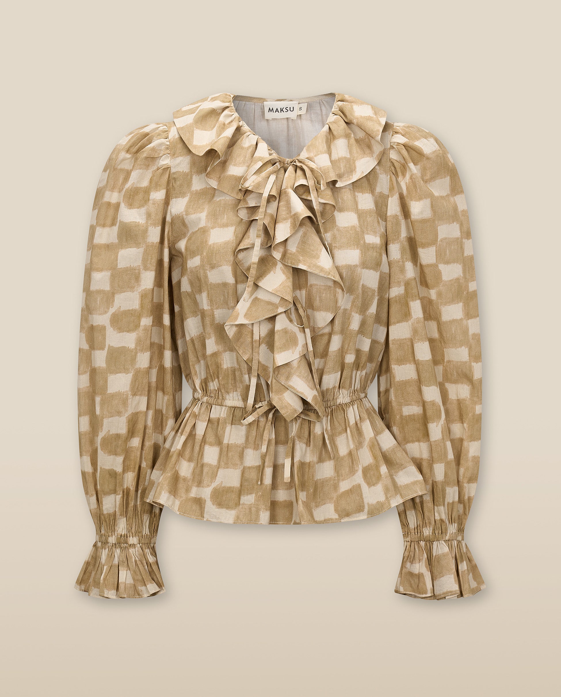 GURNOOR | Blusa de Algodón Marrón Suave con Volantes y Cuadros