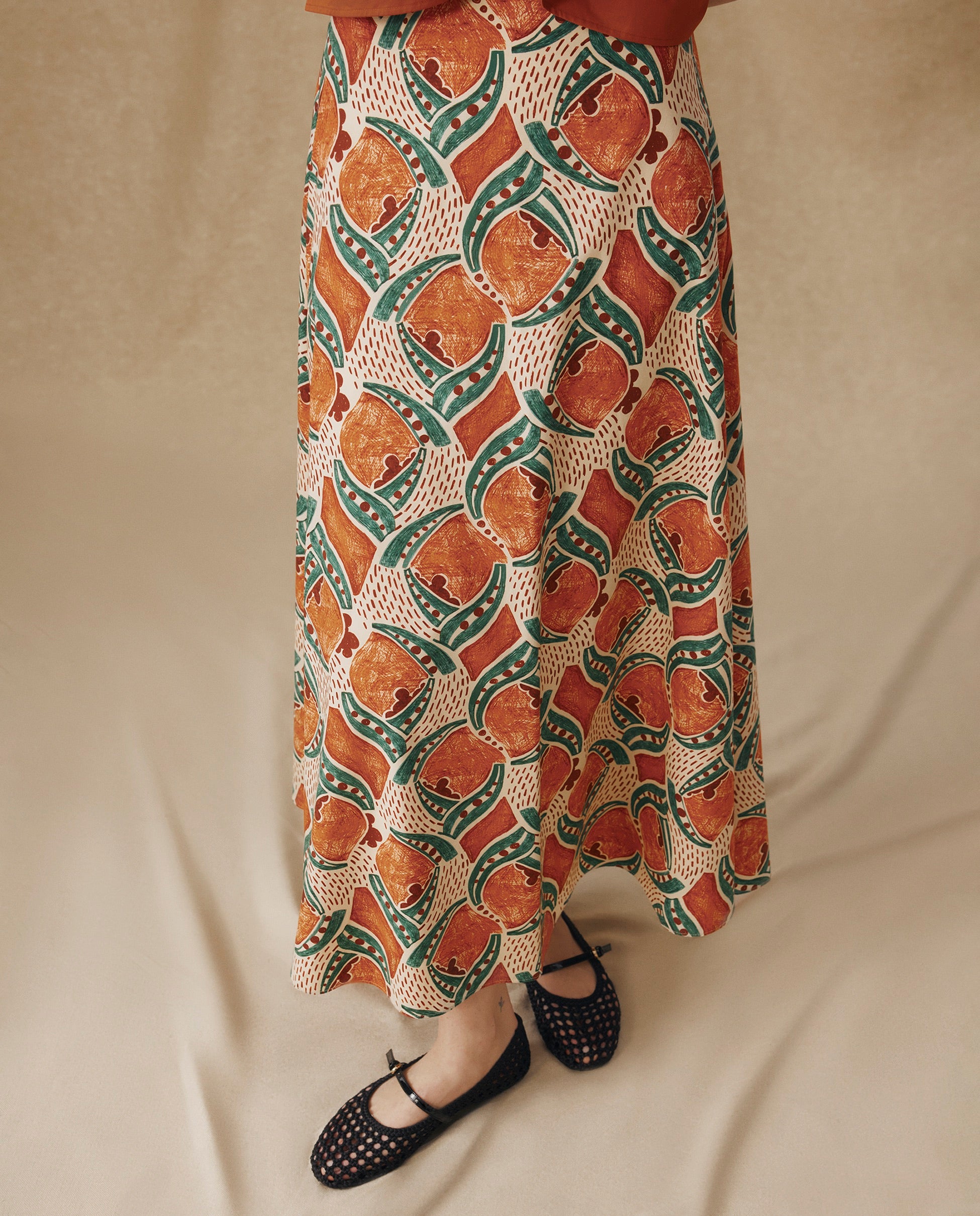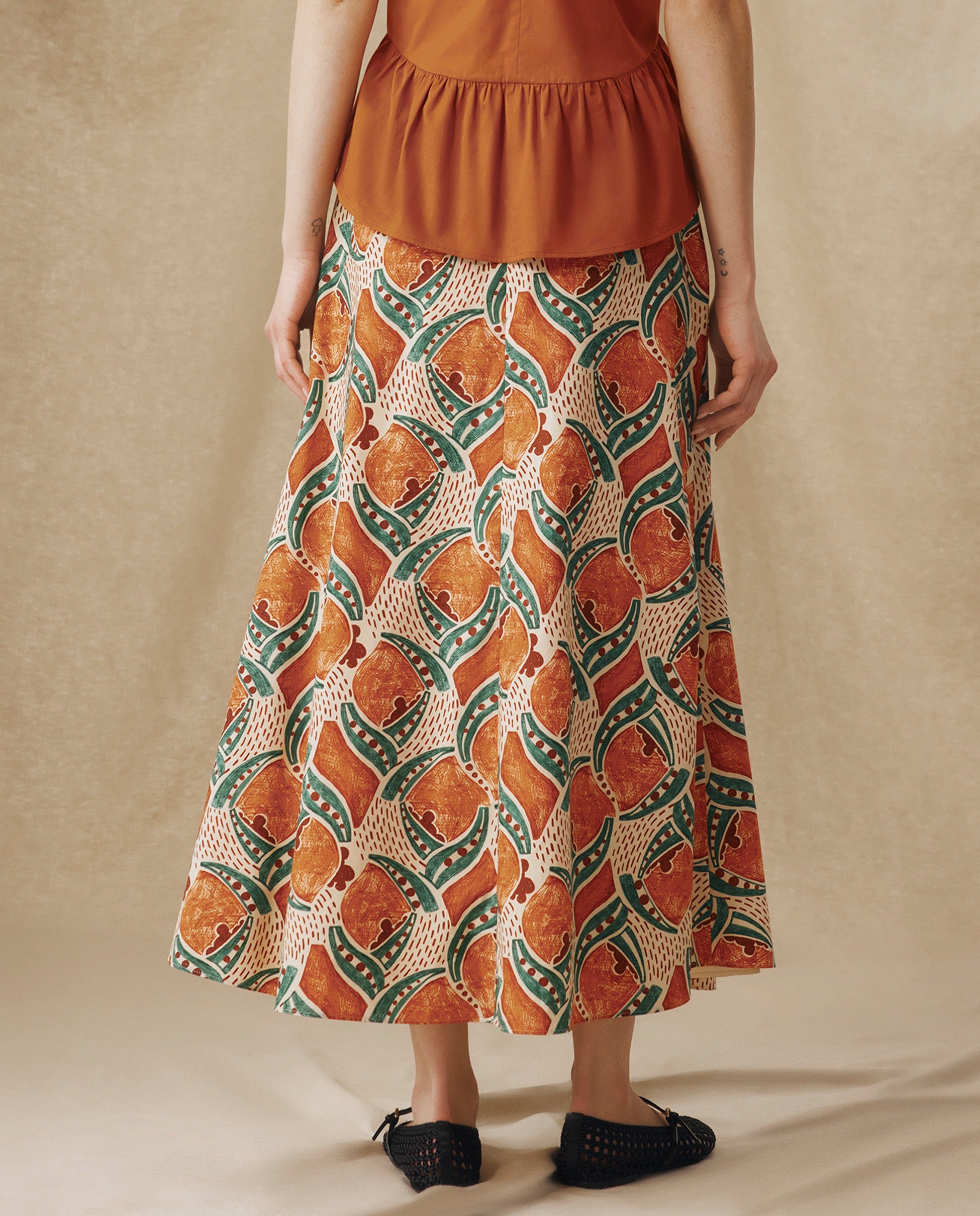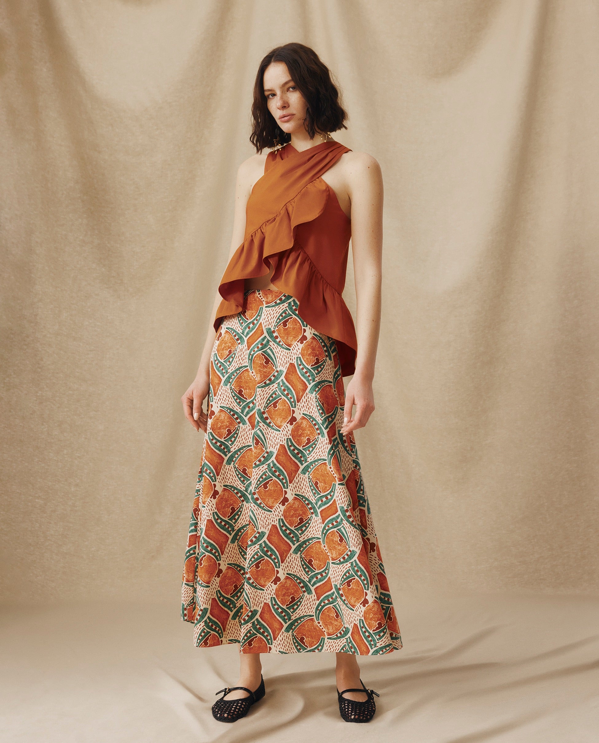 Con un aire de elegancia y un toque coqueto, la falda Ayla destaca con su vibrante estampado en terracota y verde azulado. Confeccionada en algodón italiano de alta calidad y completamente forrada, presenta un favorecedor corte en línea A que fluye con naturalidad. El cierre lateral oculto garantiza un ajuste impecable, mientras que el estampado de inspiración artesanal aporta ritmo y personalidad al conjunto.