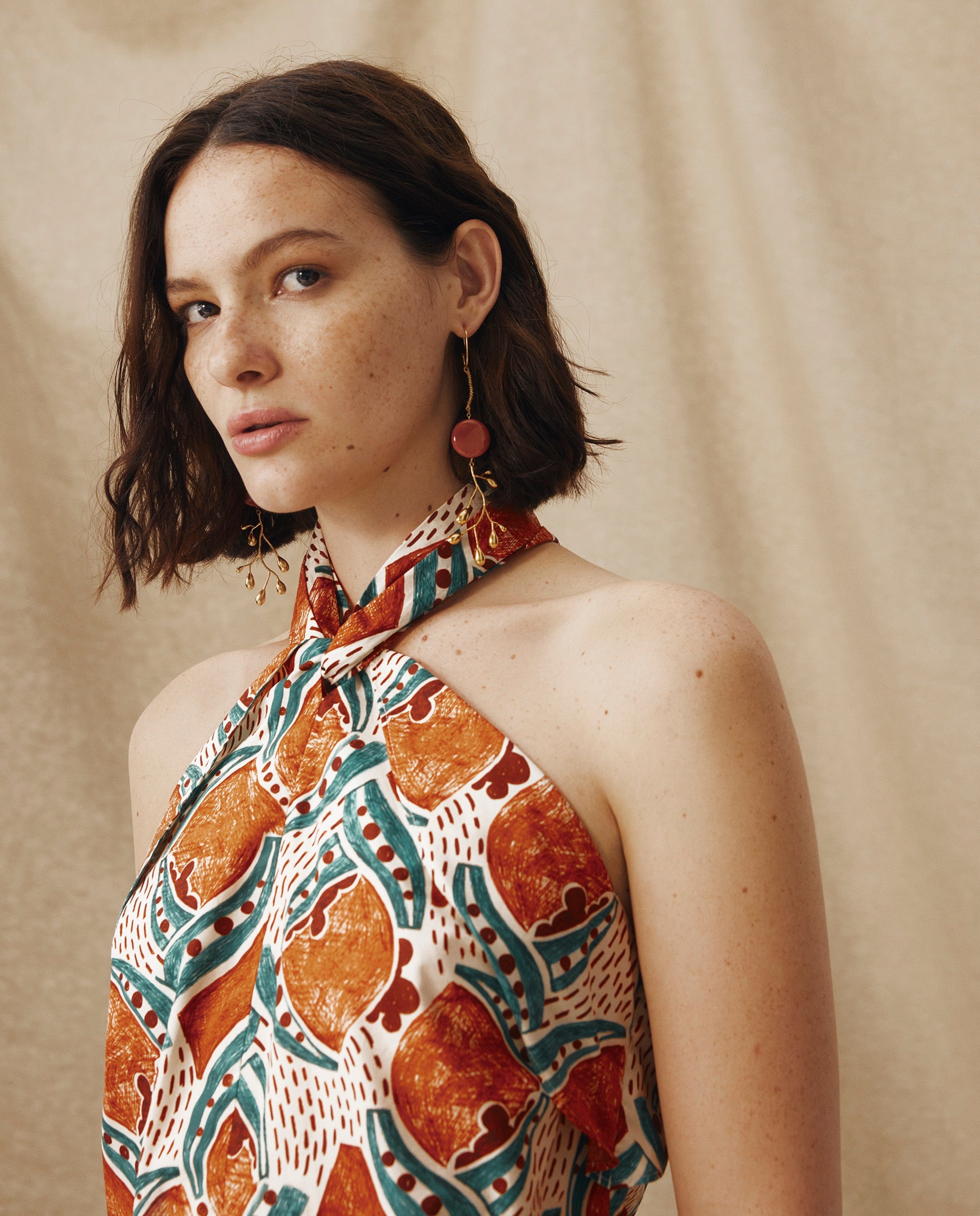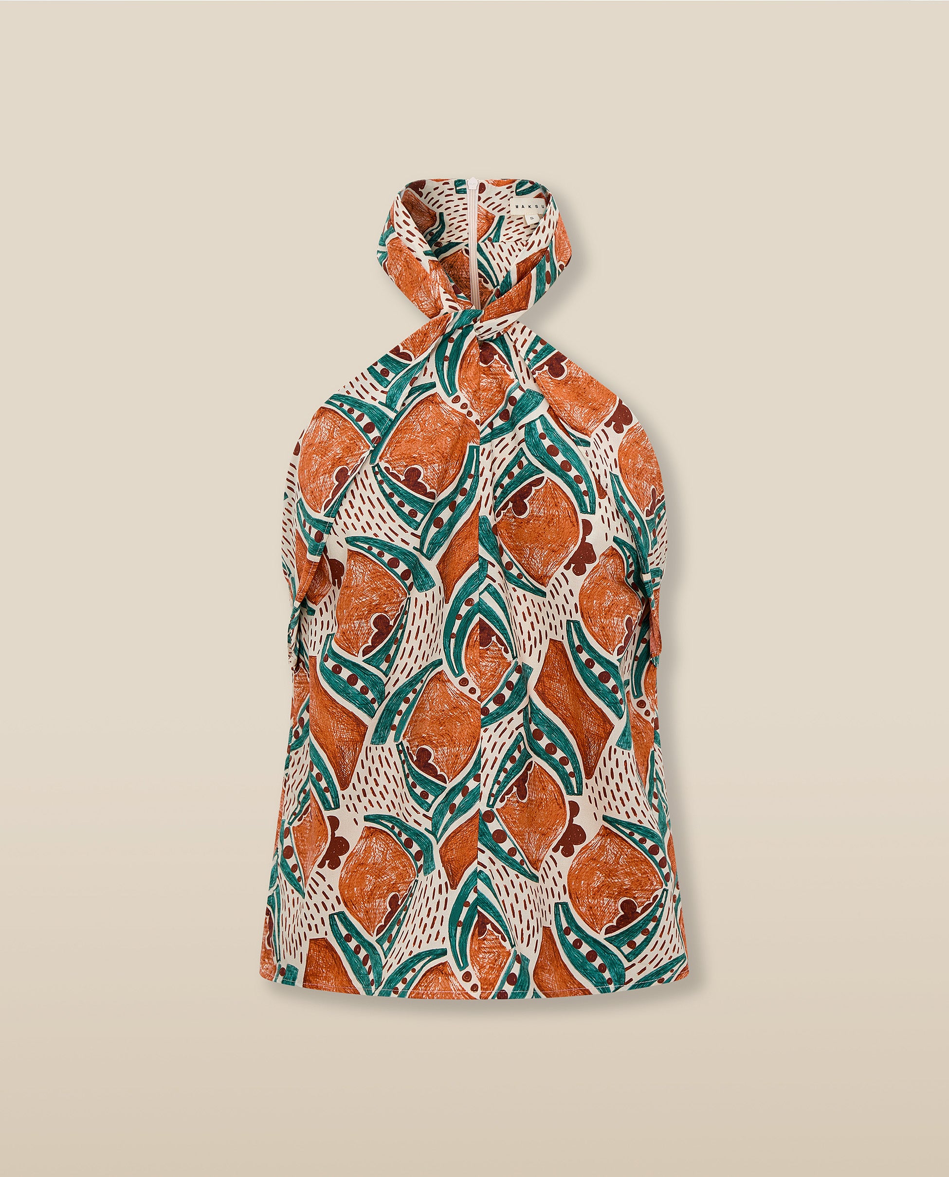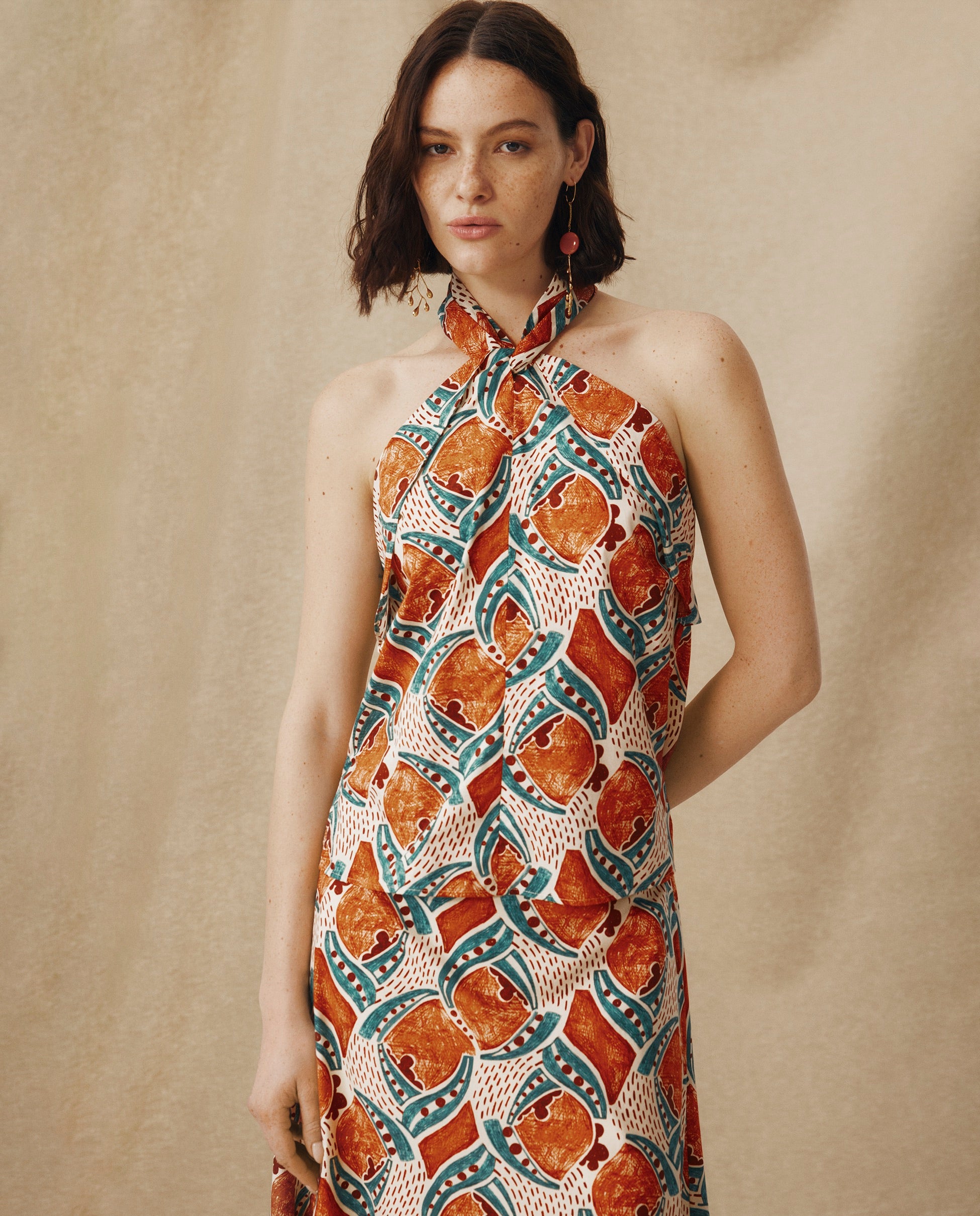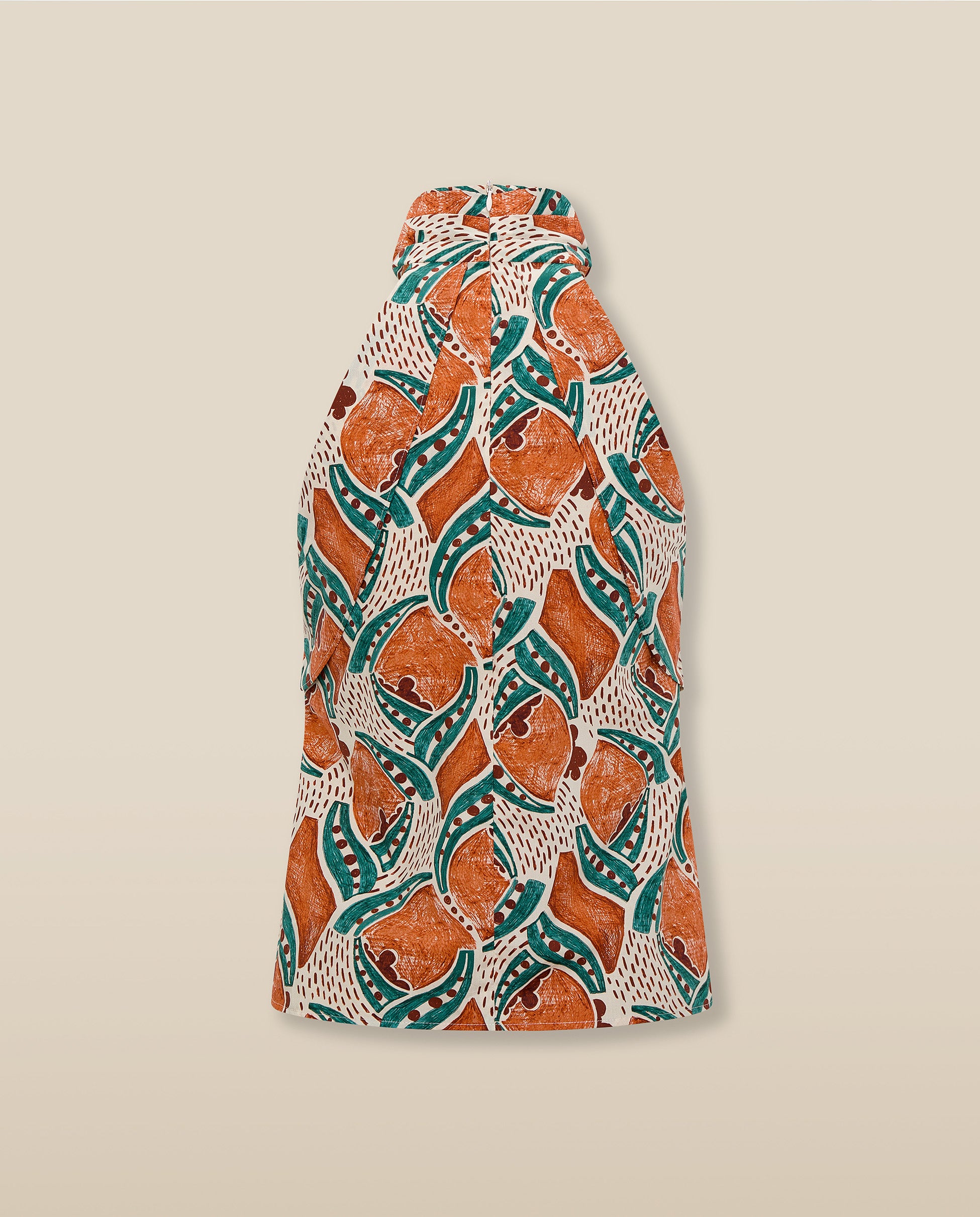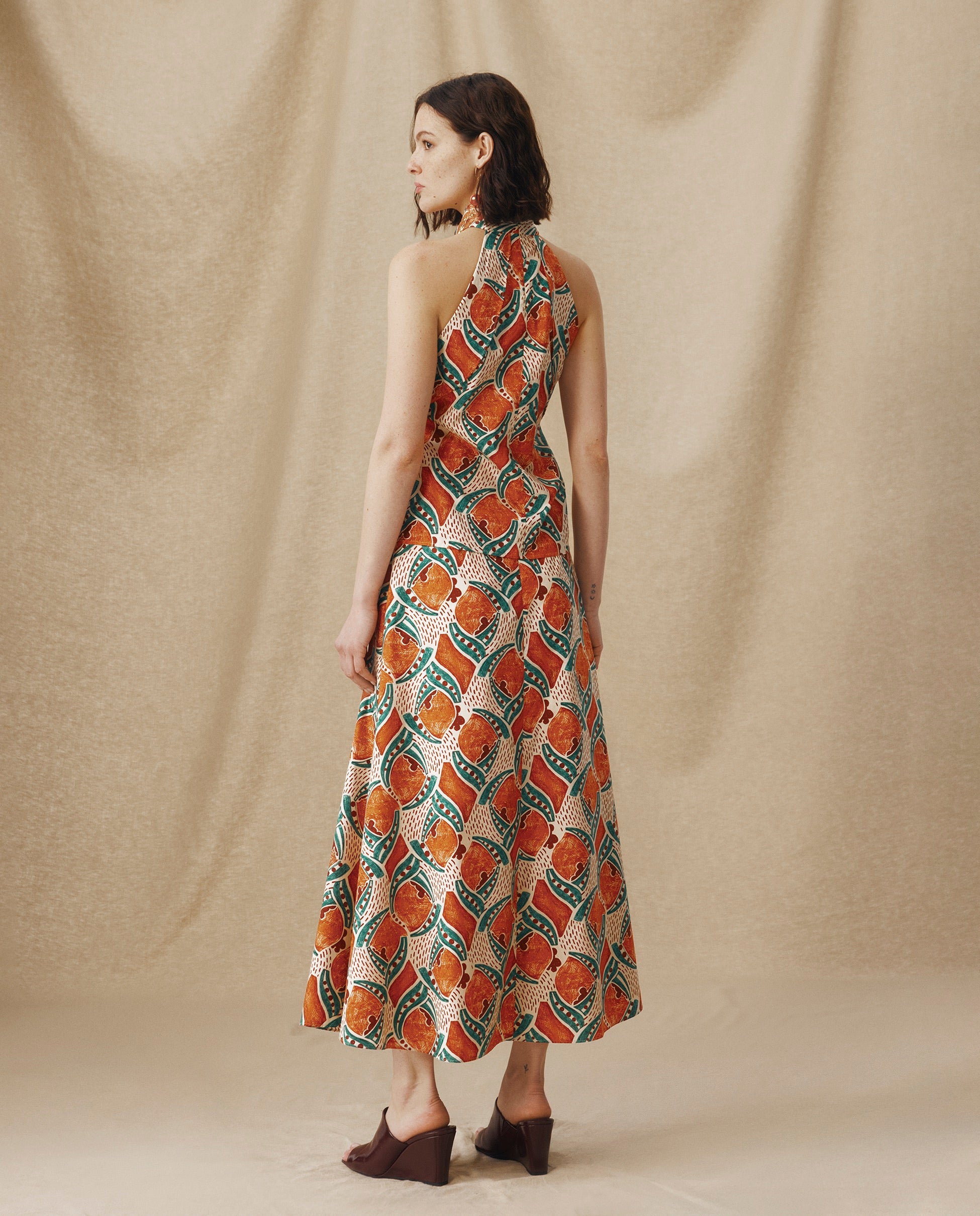 Escultural y fácil de llevar, el top Ayla aporta energía a los estilismos de temporada. Confeccionado en algodón italiano de alta calidad con un estampado artesanal en terracota y azul añil, presenta un escote halter con pliegues suaves y un cuerpo entallado que se cierra con cremallera oculta en la espalda. Combínalo con la falda a juego para un conjunto con carácter.
