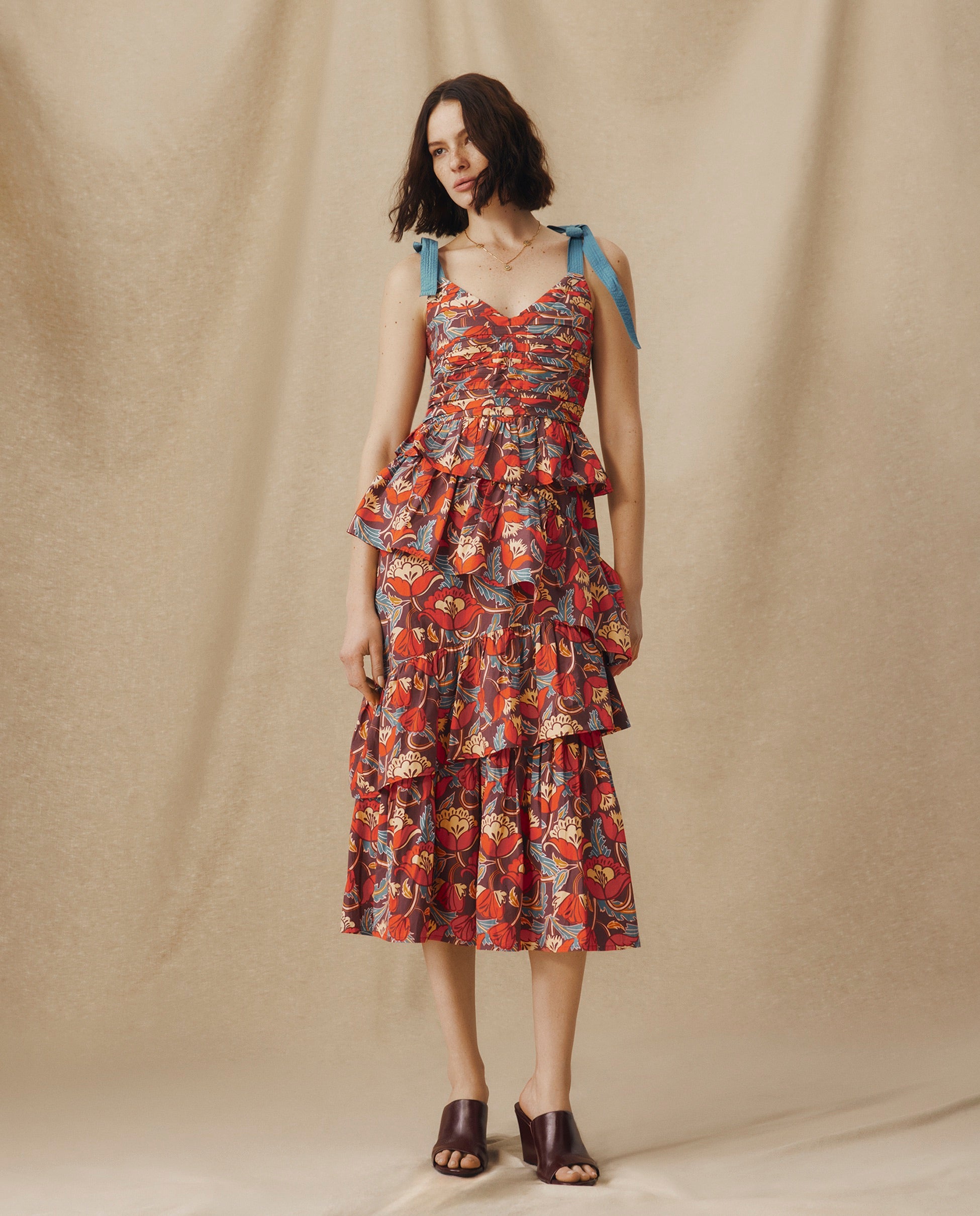 BIMBA | Vestido Midi de Algodón con Estampado Floral y Volantes en Terracota