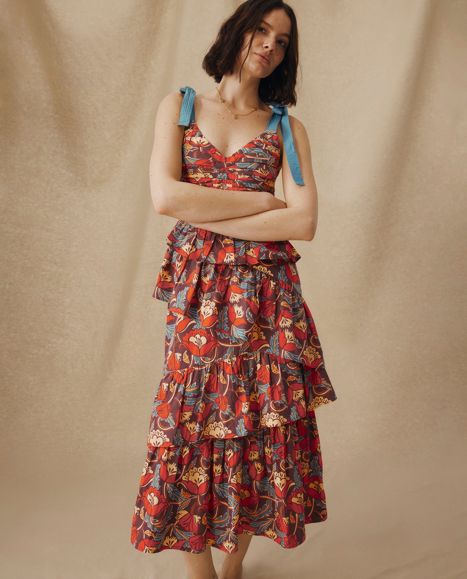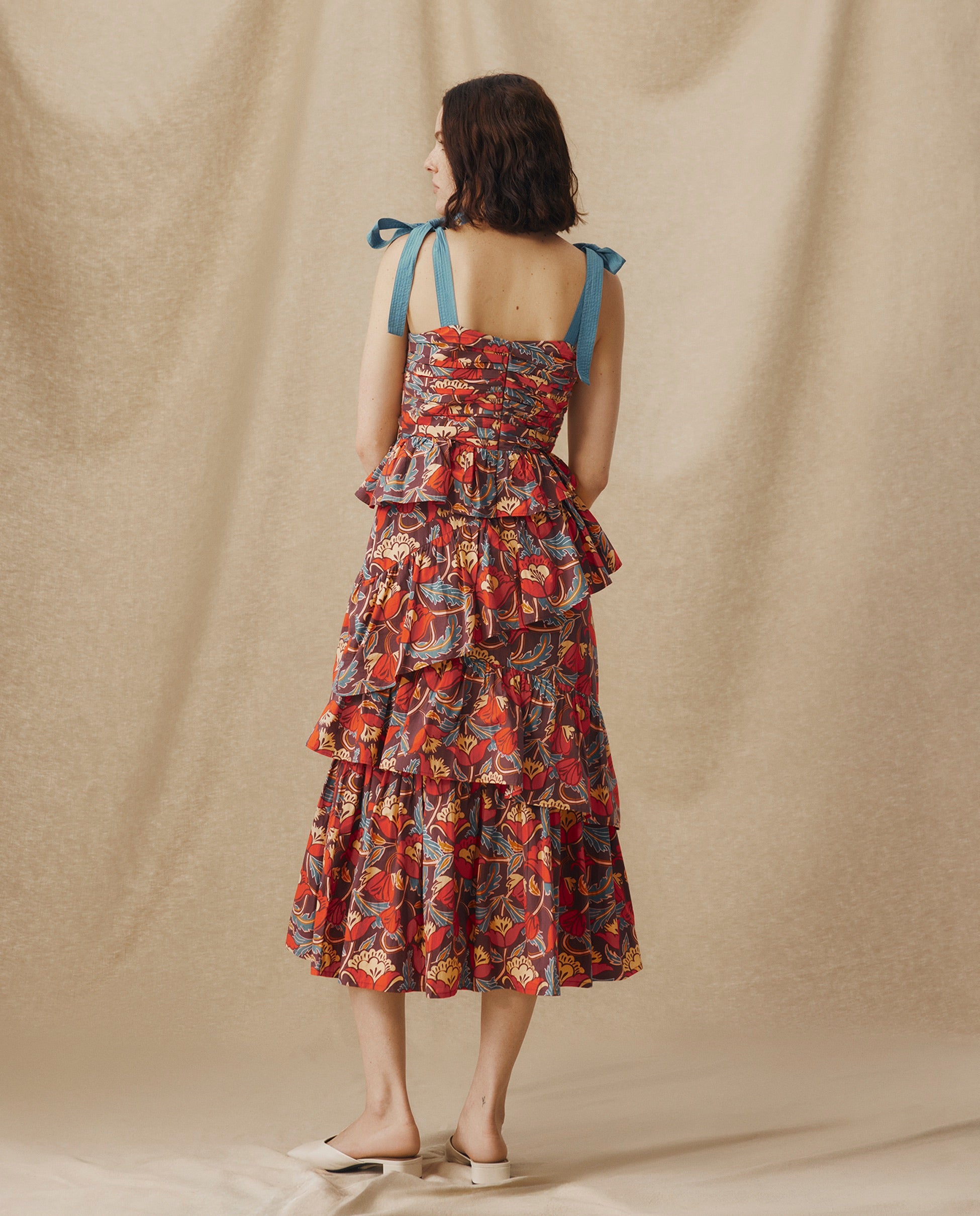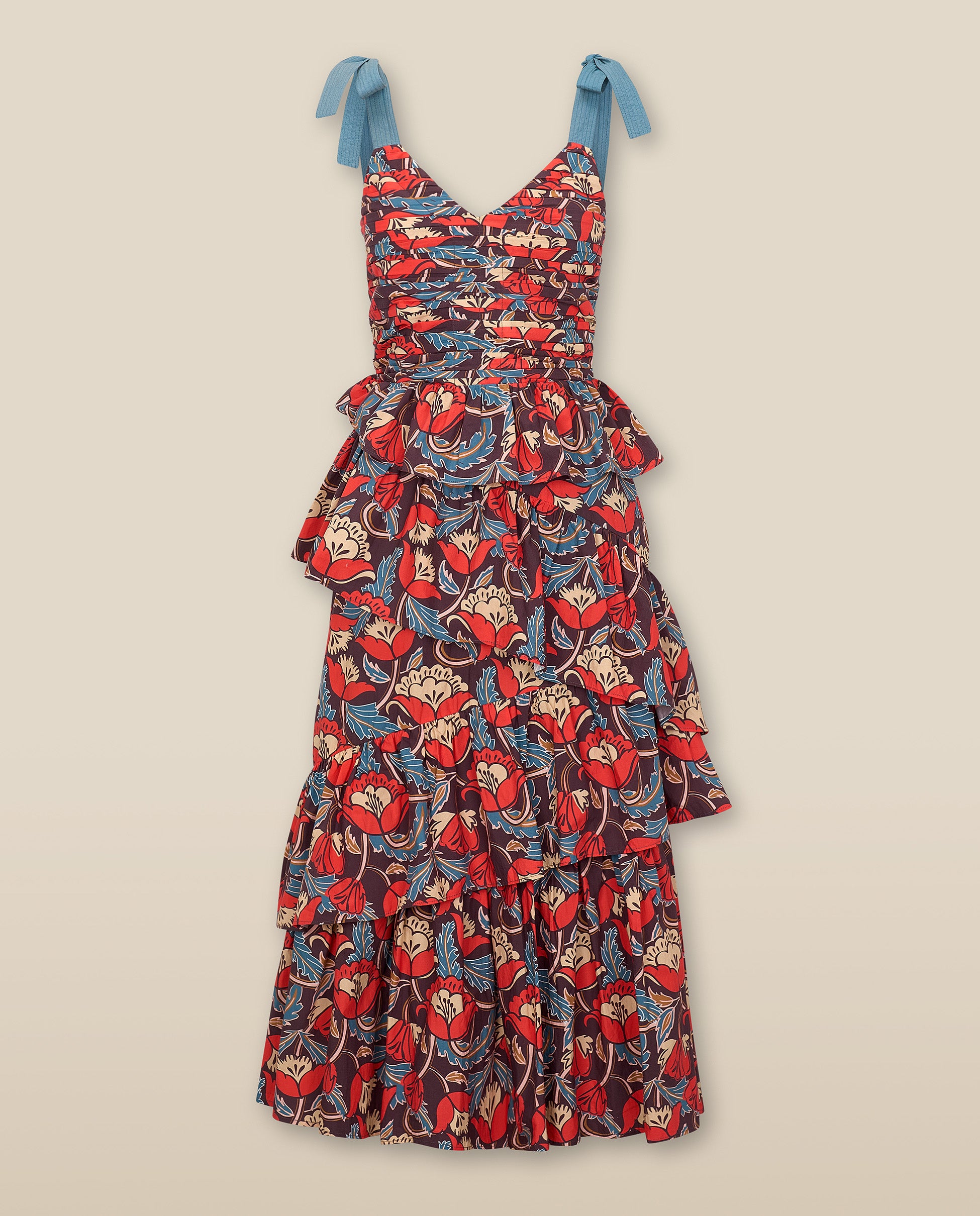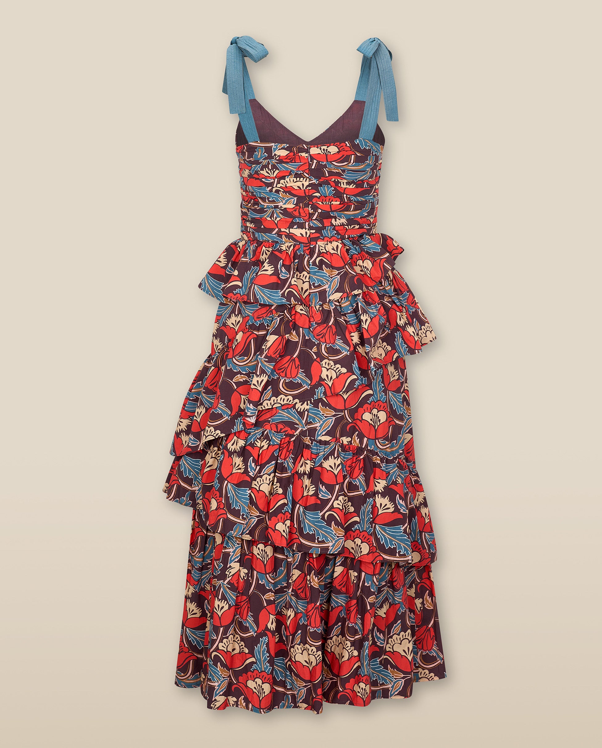 Juguetón y romántico, el vestido Bimba celebra el color y el movimiento. Confeccionado en algodón 100% con un rico estampado floral, presenta un cuerpo fruncido, falda con volantes en capas y tirantes tie straps en un llamativo tono denim azul. La cremallera oculta en la espalda garantiza un acabado limpio y favorecedor. • Cuerpo fruncido y volantes en cascada para un volumen femenino y estructurado • Tirantes tie straps en denim azul para un contraste moderno • 100% algodón con cremallera oculta para mayor comodidad y transpirabilidad