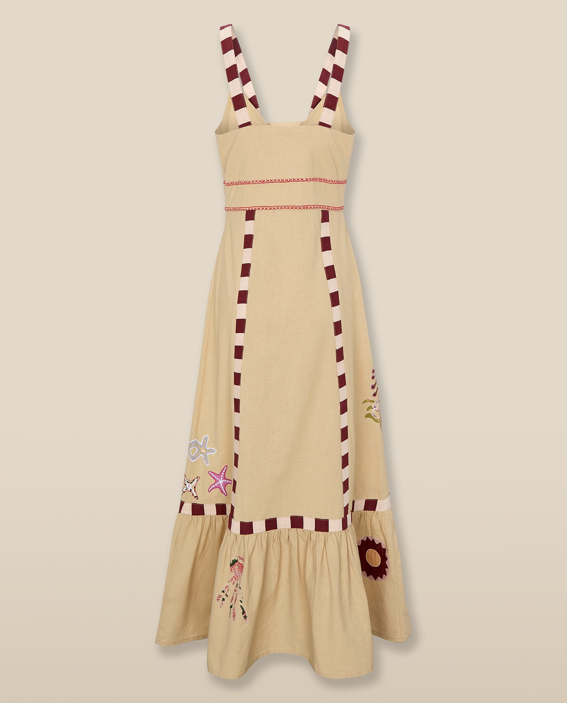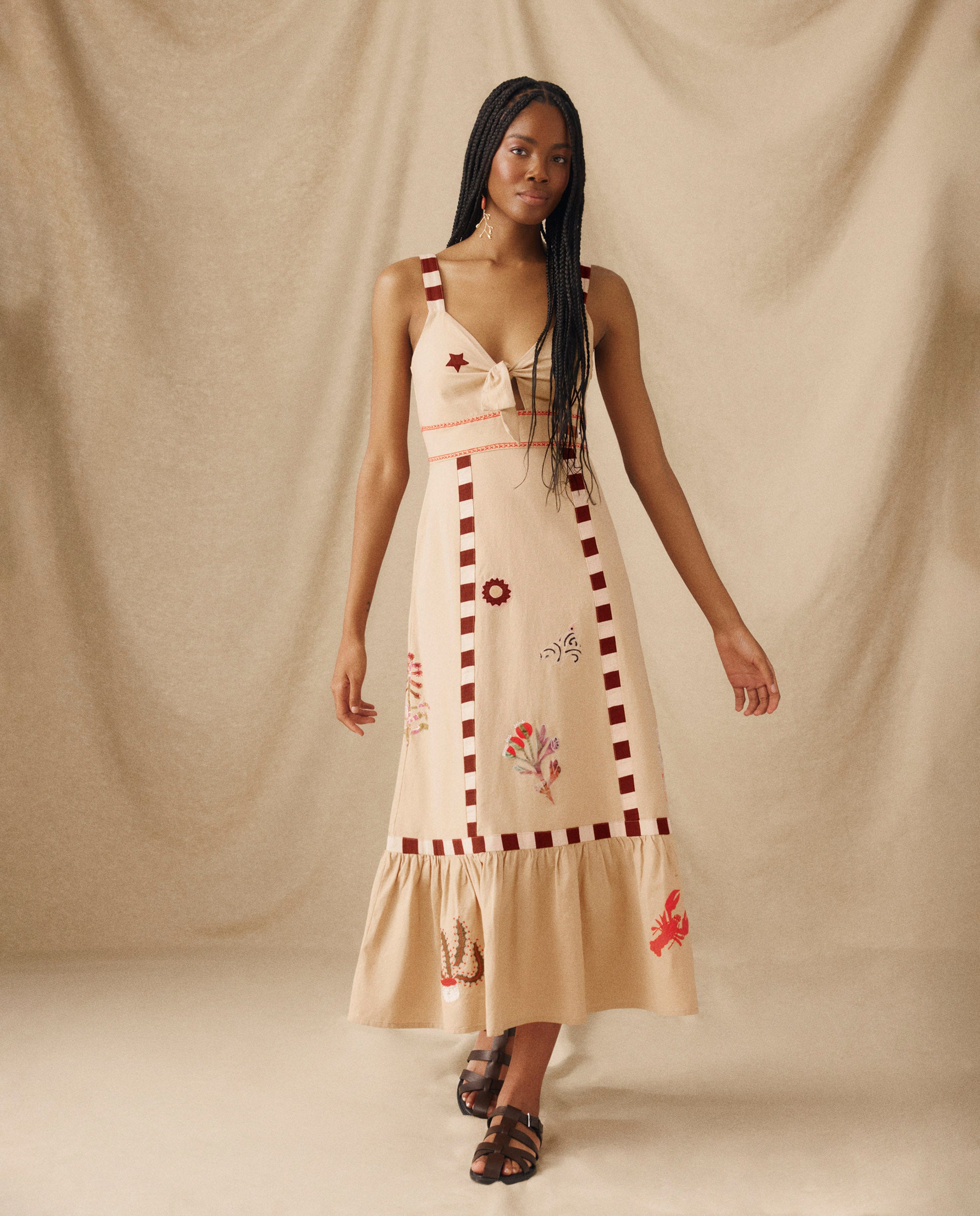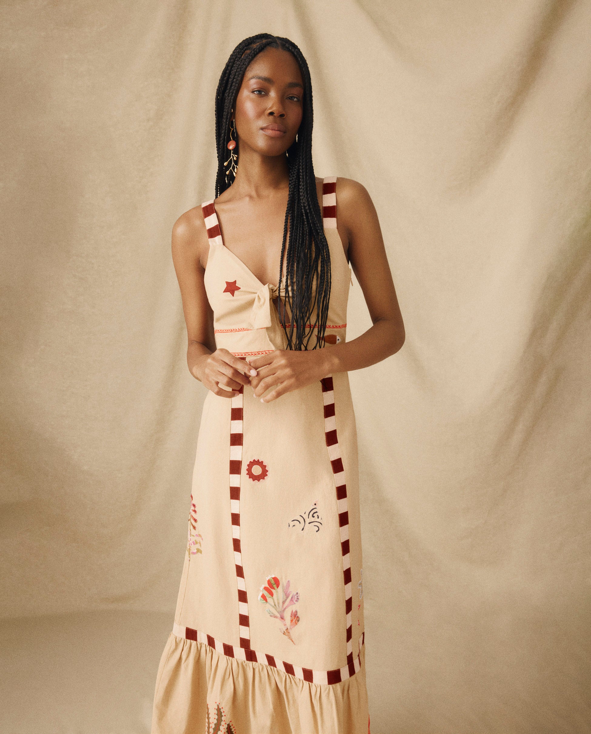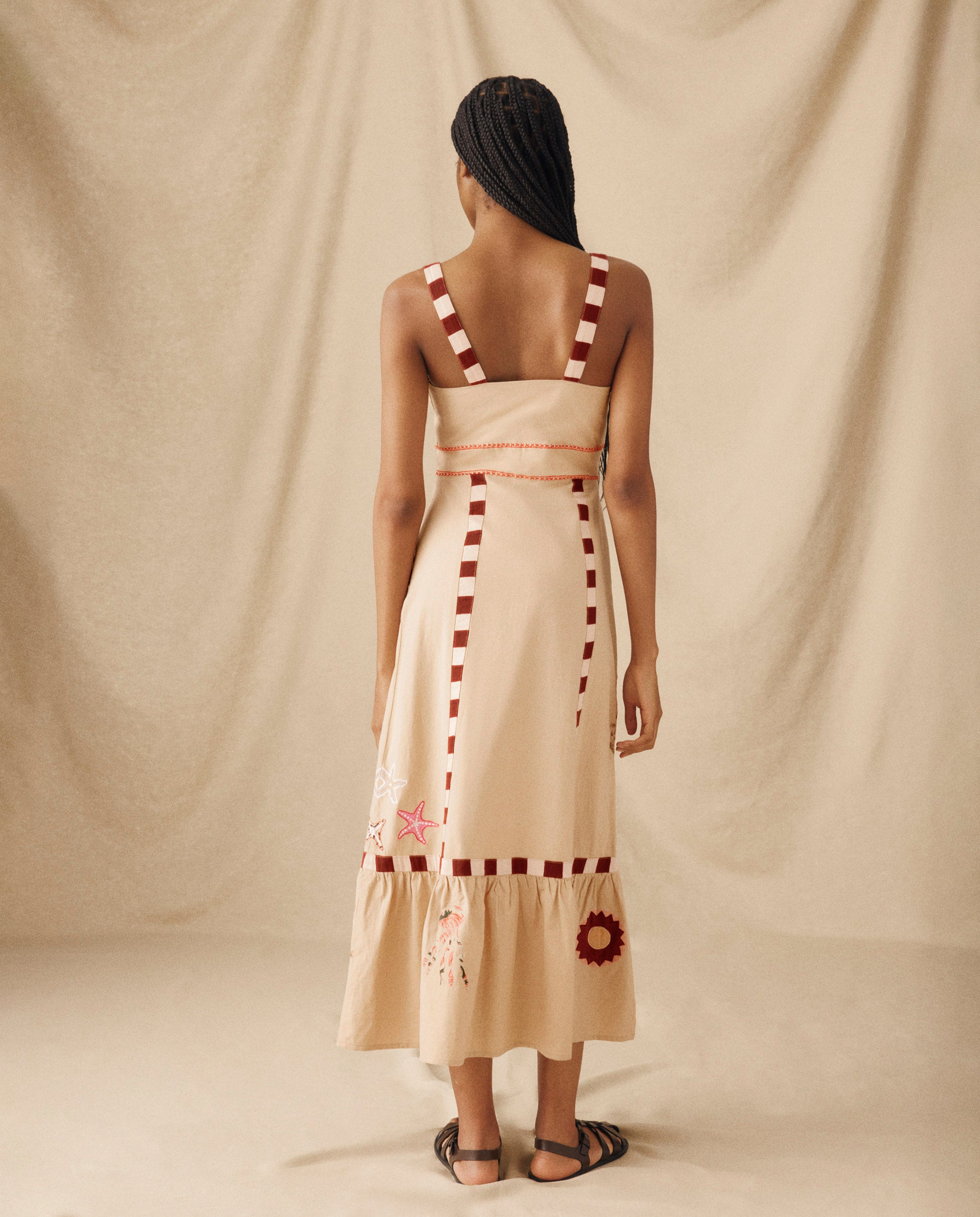CHANDANI | Vestido Midi de Algodón y Lino Color Beige con Bordado