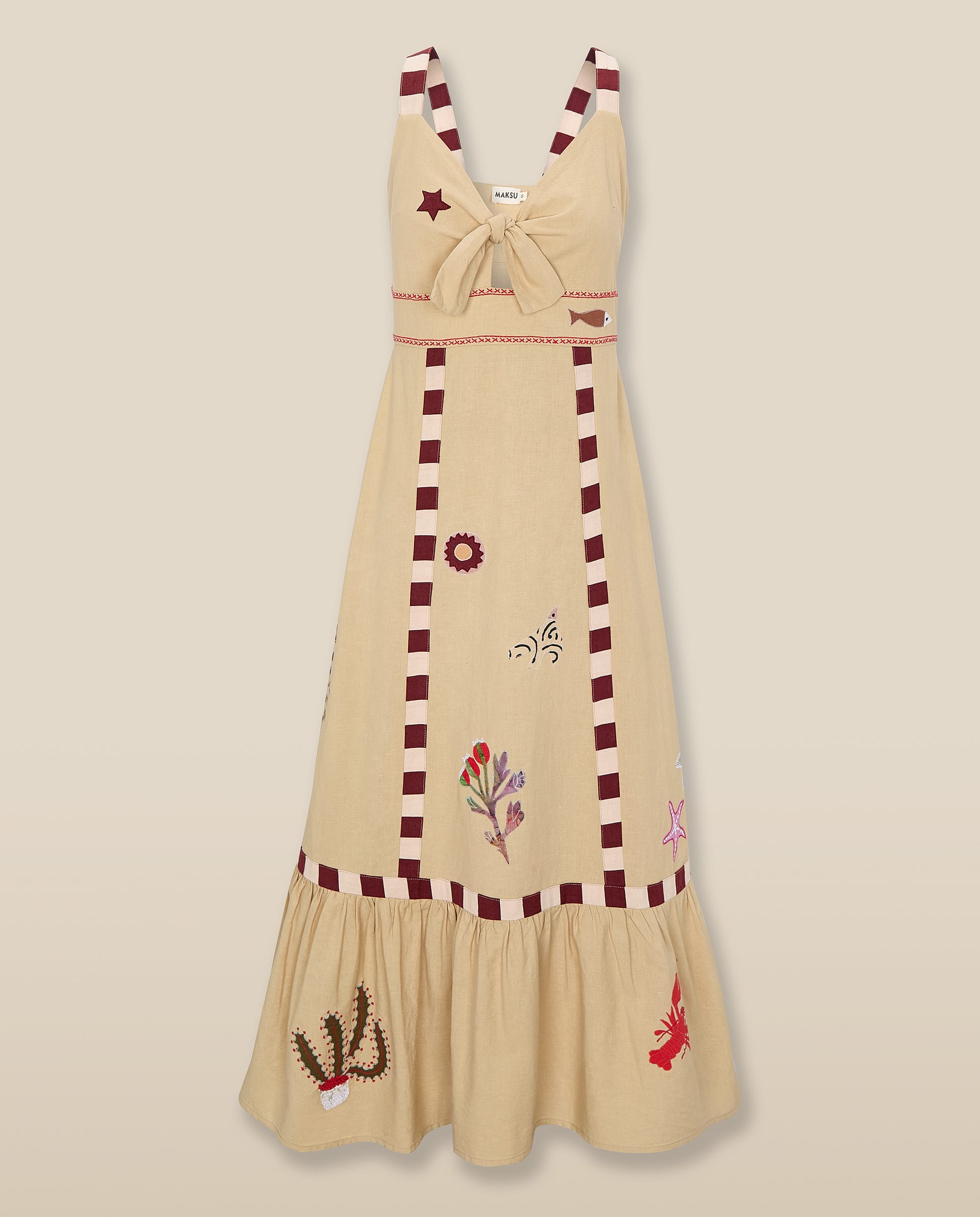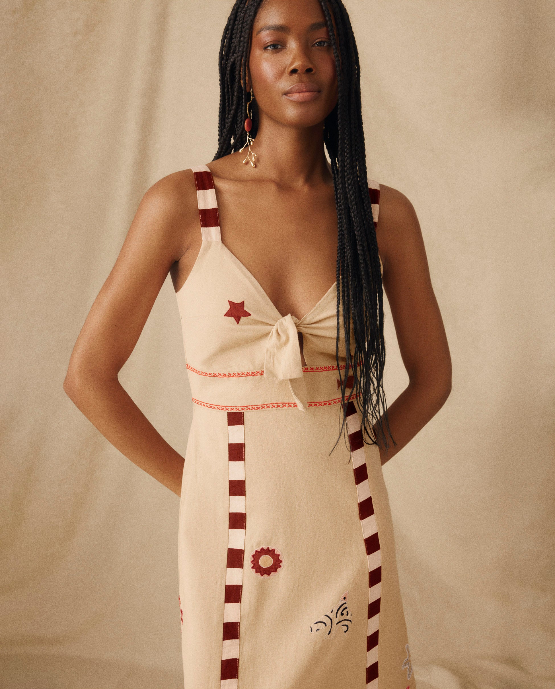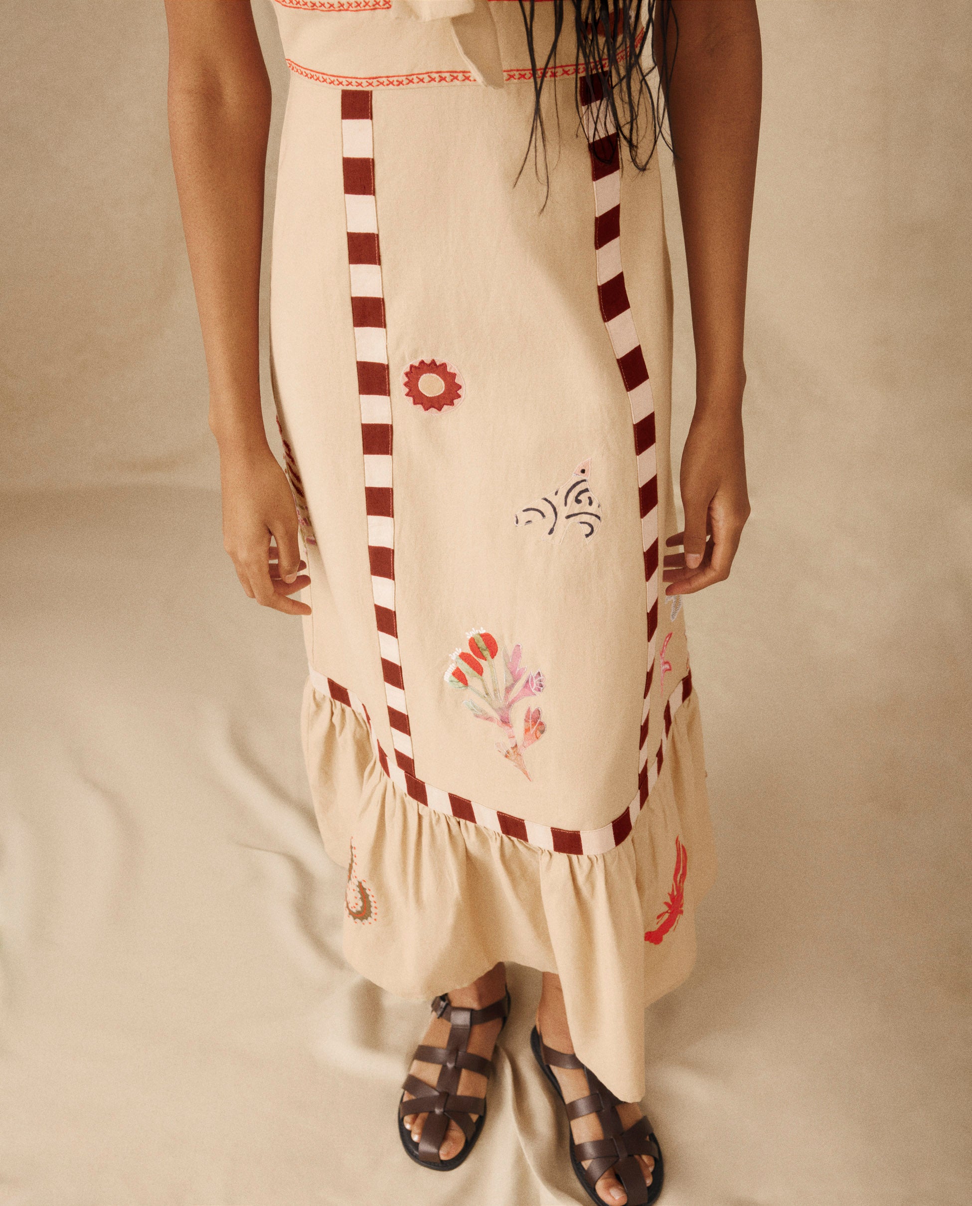 Una pieza artesanal con carácter, el vestido Chandani captura un espíritu lúdico y hecho a mano con sus vibrantes aplicaciones y detalles de rayas llamativas. Confeccionado en una mezcla transpirable de algodón y lino, presenta un corpiño con lazo frontal y tirantes anchos que añaden un contraste impactante. La falda escalonada está adornada con intrincados bordados y se completa con un dobladillo suavemente fruncido para un movimiento fluido.