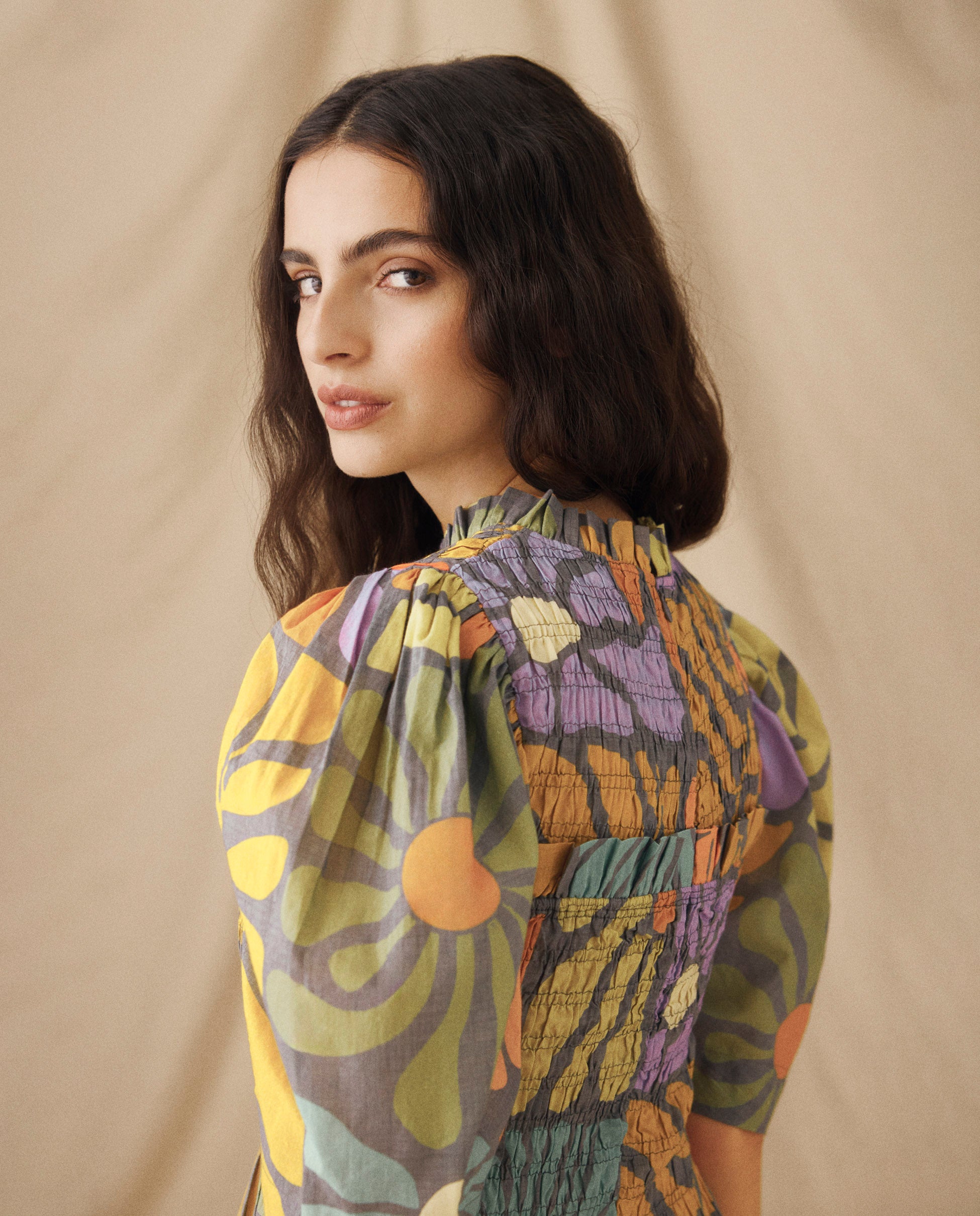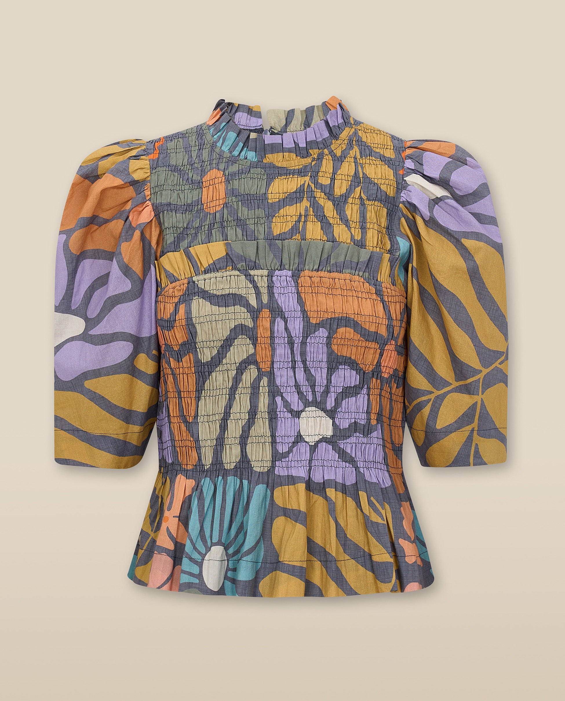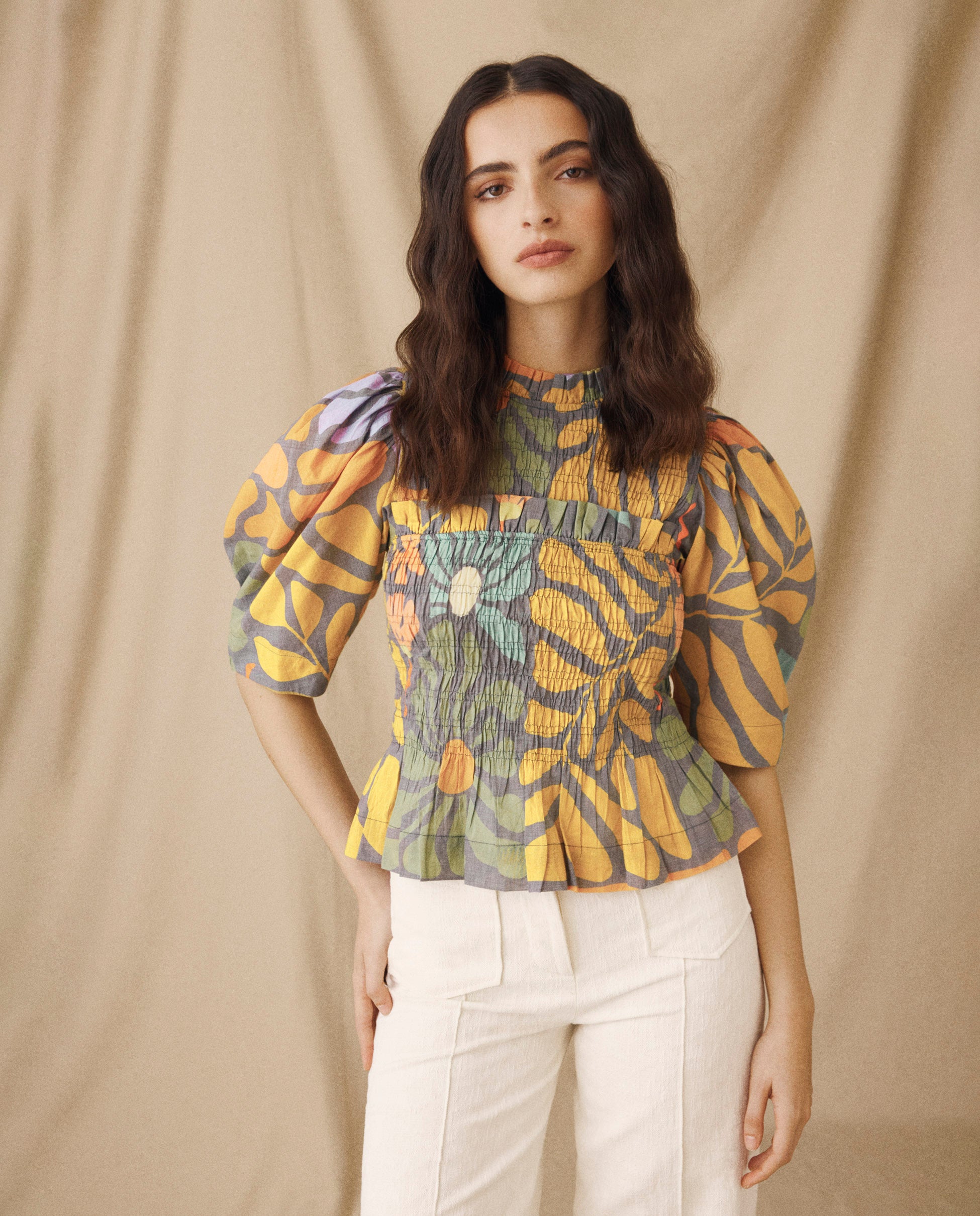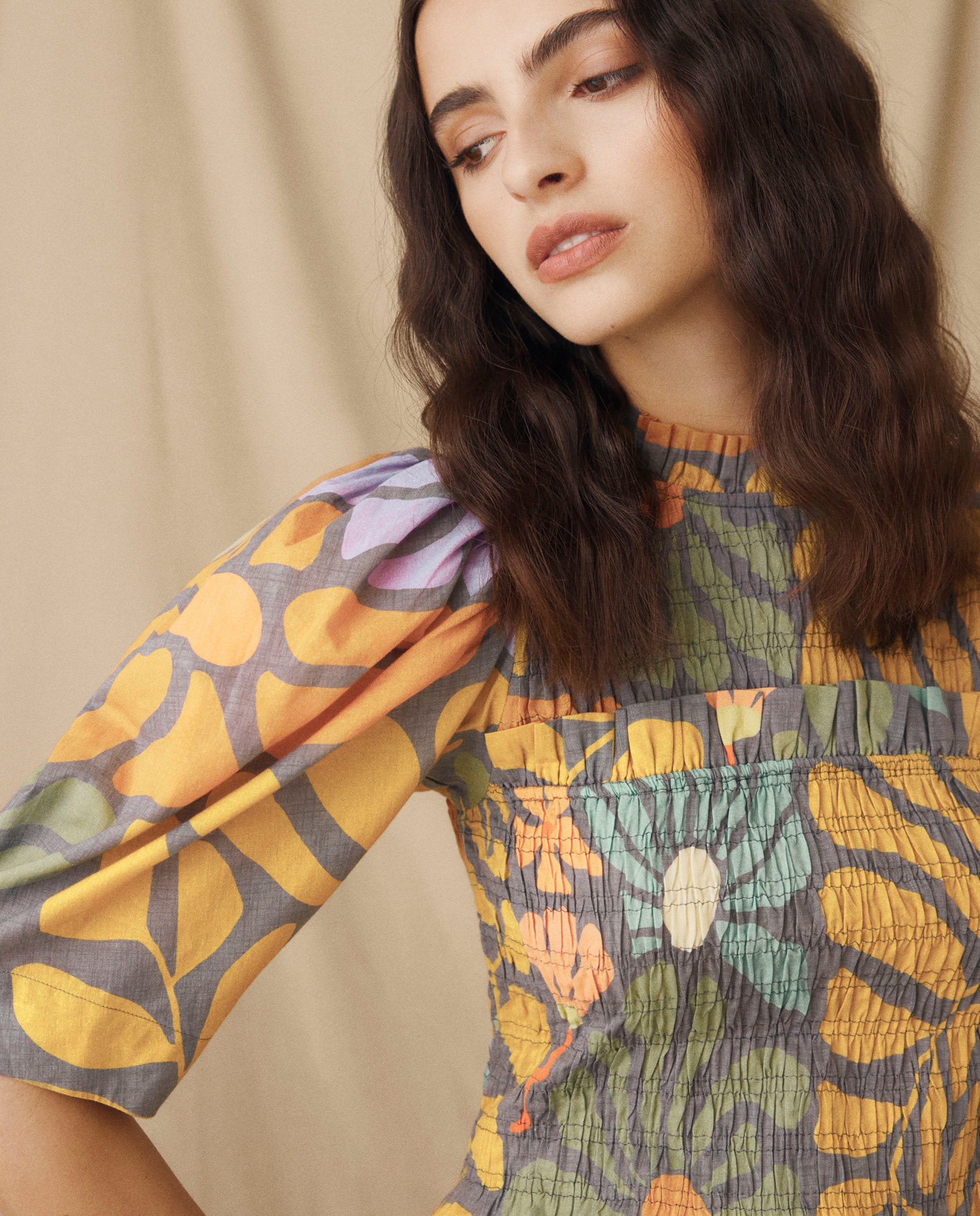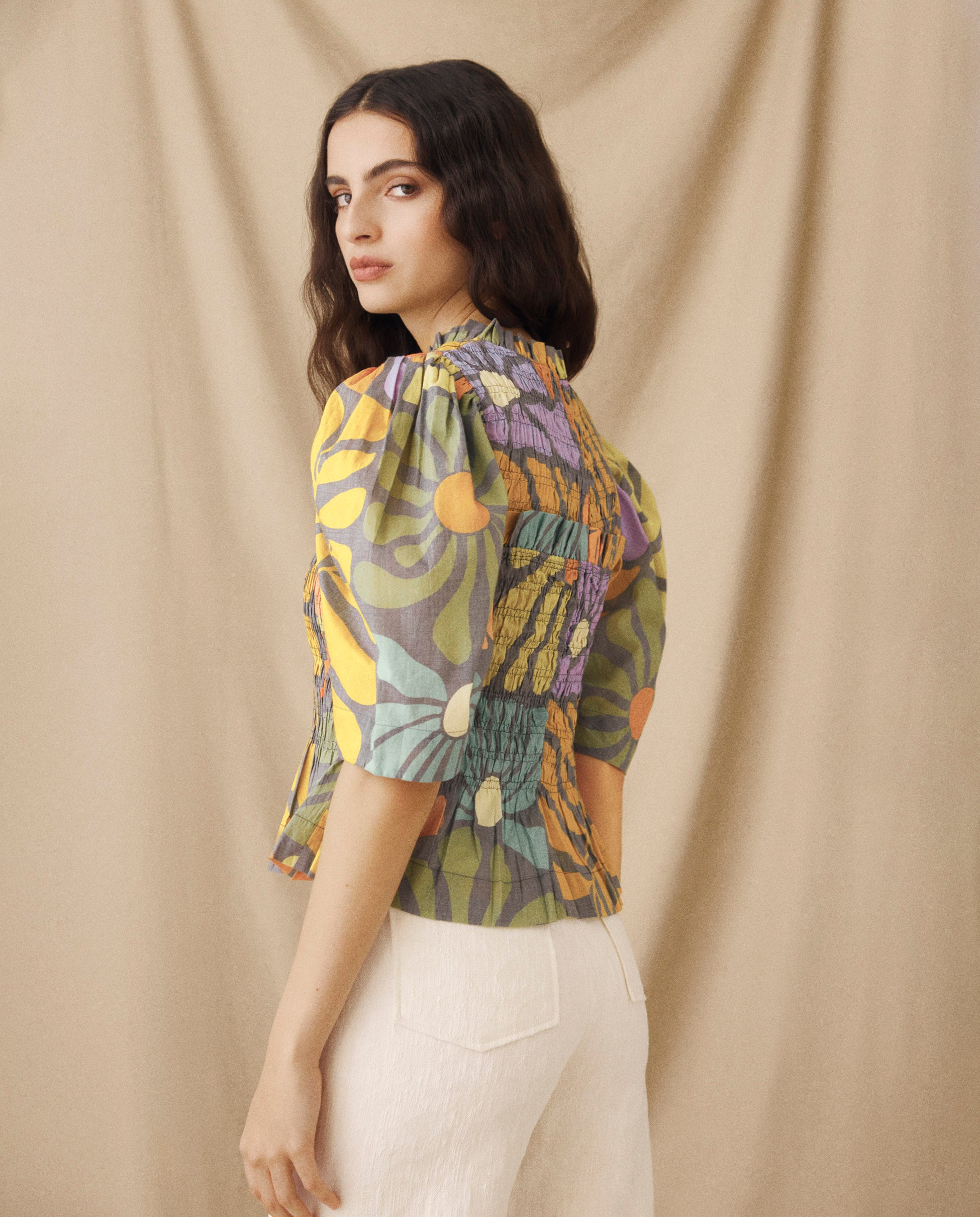 Confeccionada en algodón 100%, la blusa Charita aporta energía y color al día a día. Destaca por su silueta smocked así como por sus mangas abullonadas, su cuello alto con volante y su cremallera oculta en la espalda. El estampado floral multicolor añade un toque artístico a una forma femenina y estructurada.