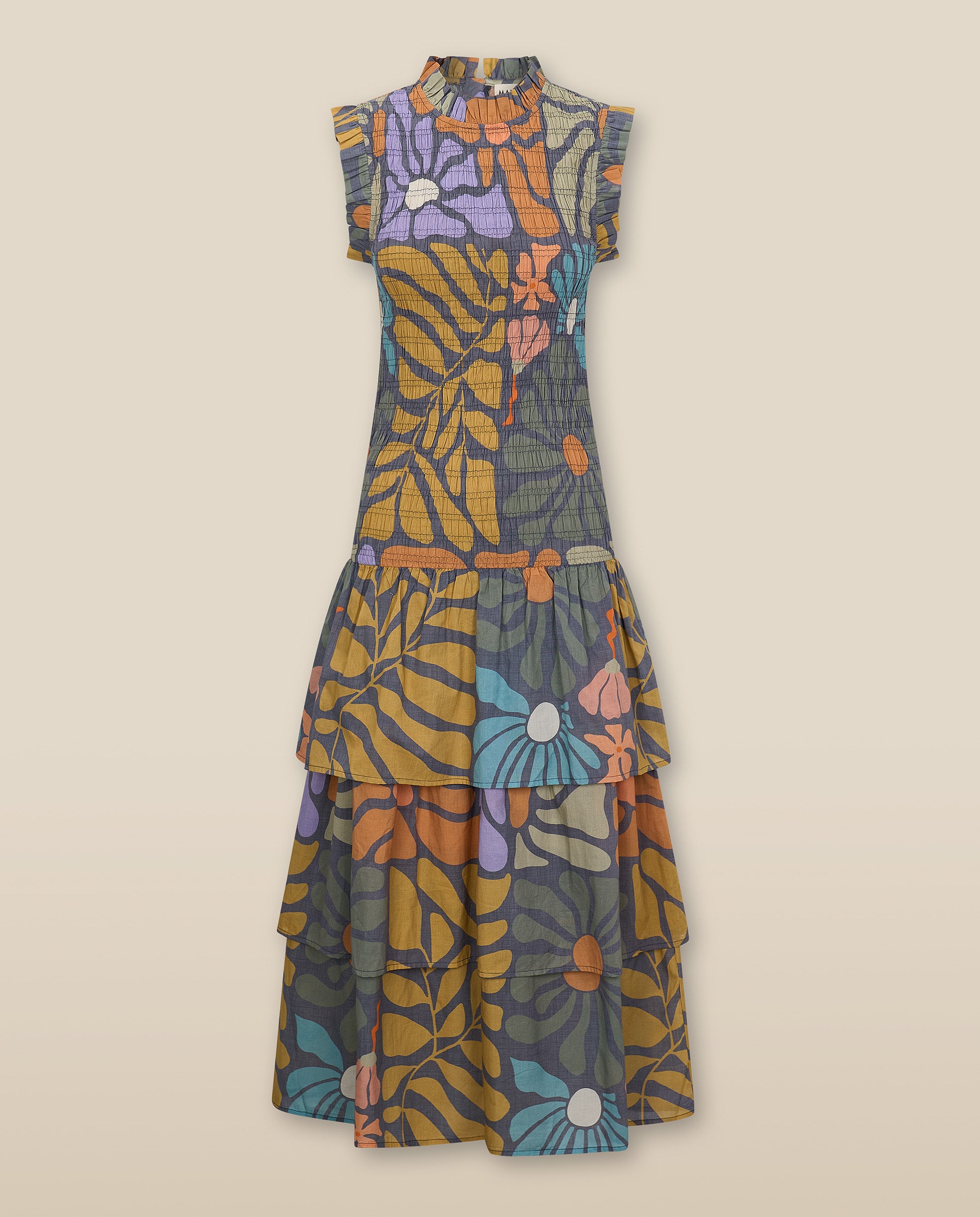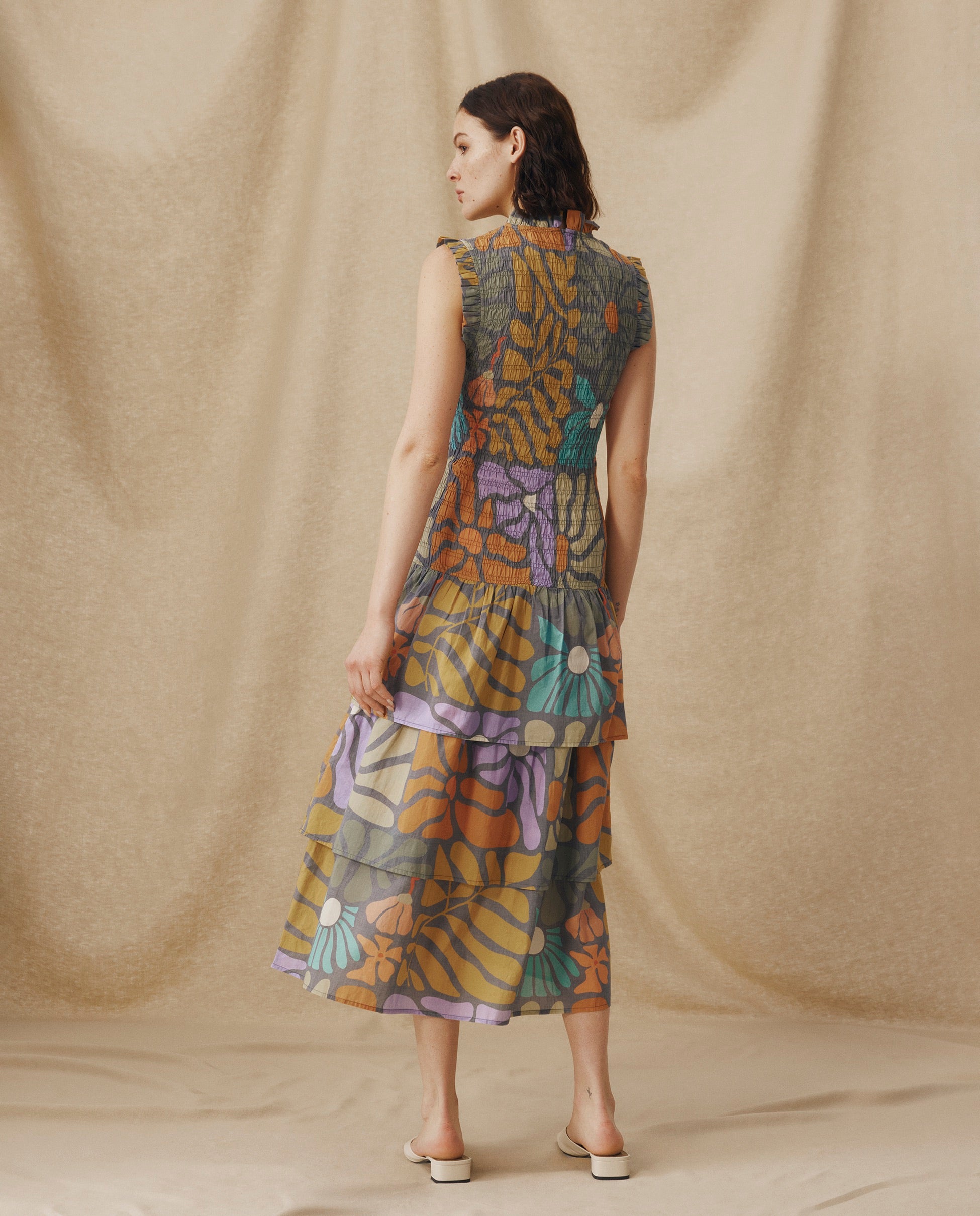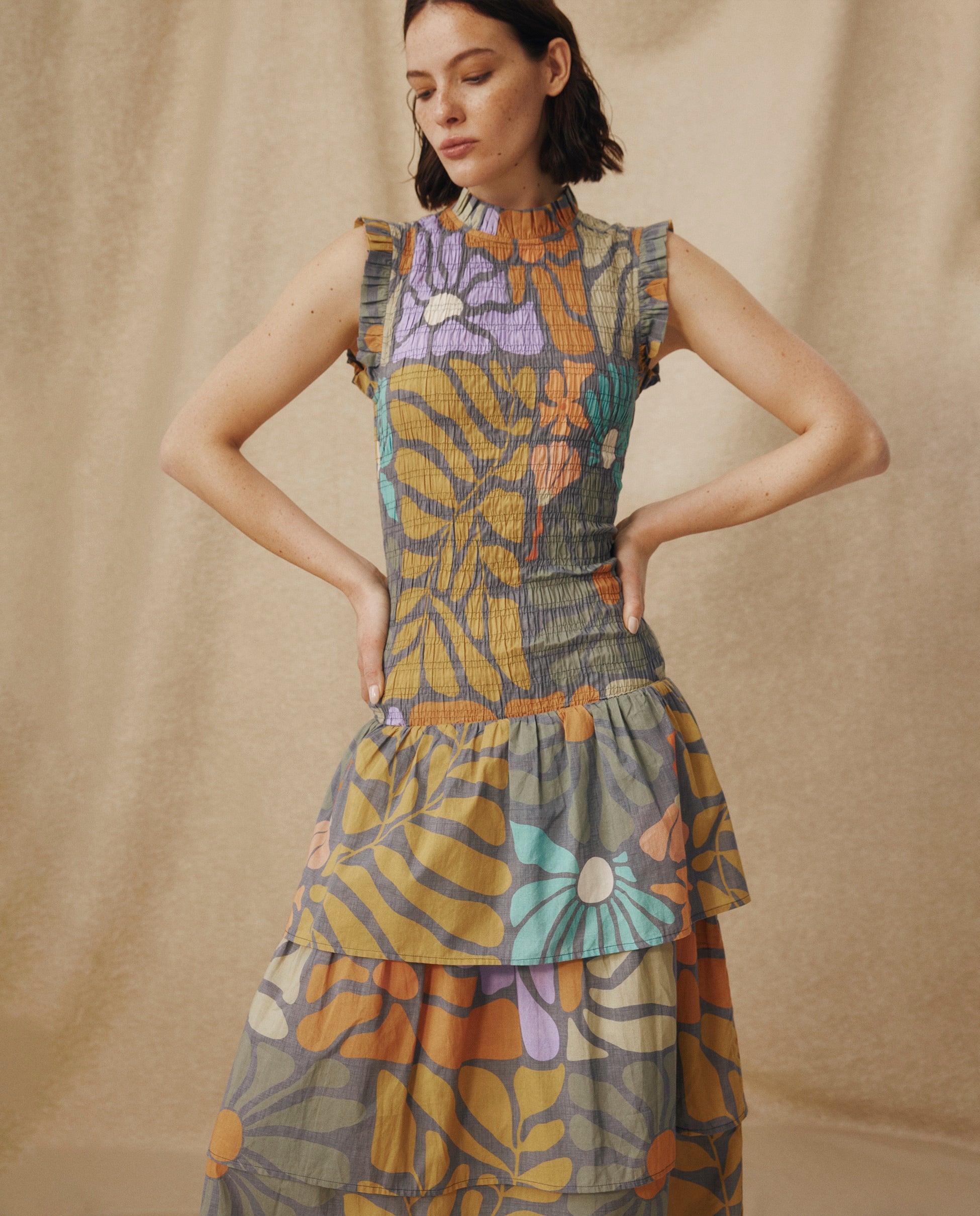 El vestido Charita es divertido y femenino. Está confeccionado en algodón 100% ligero con un vibrante estampado floral multicolor. El cuerpo smocked se adapta con suavidad a la silueta, mientras que la falda midi con volantes en capas aporta volumen y movimiento. Esta pieza ofrece una silueta romántica y versátil para el día a día.