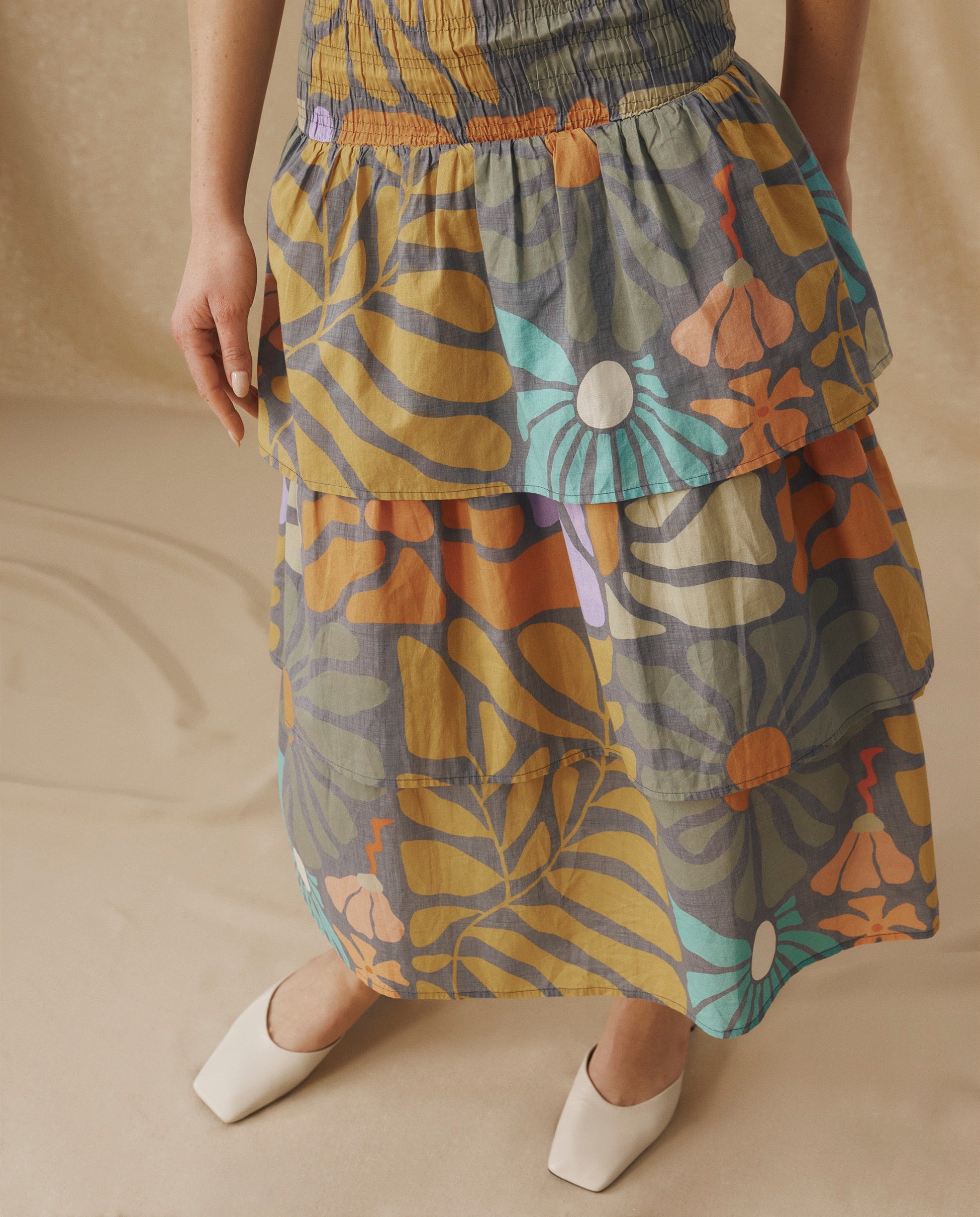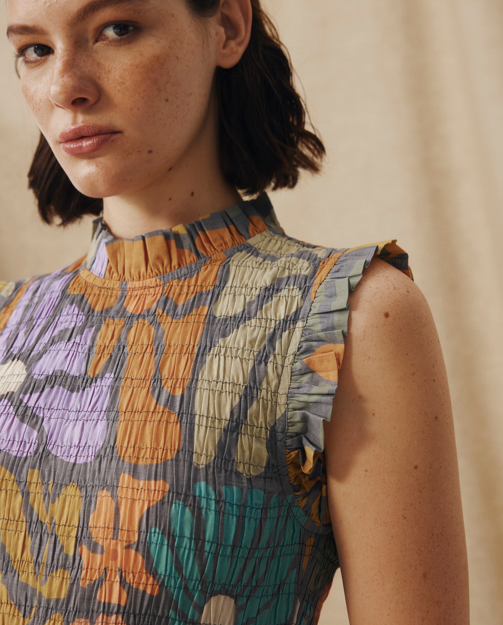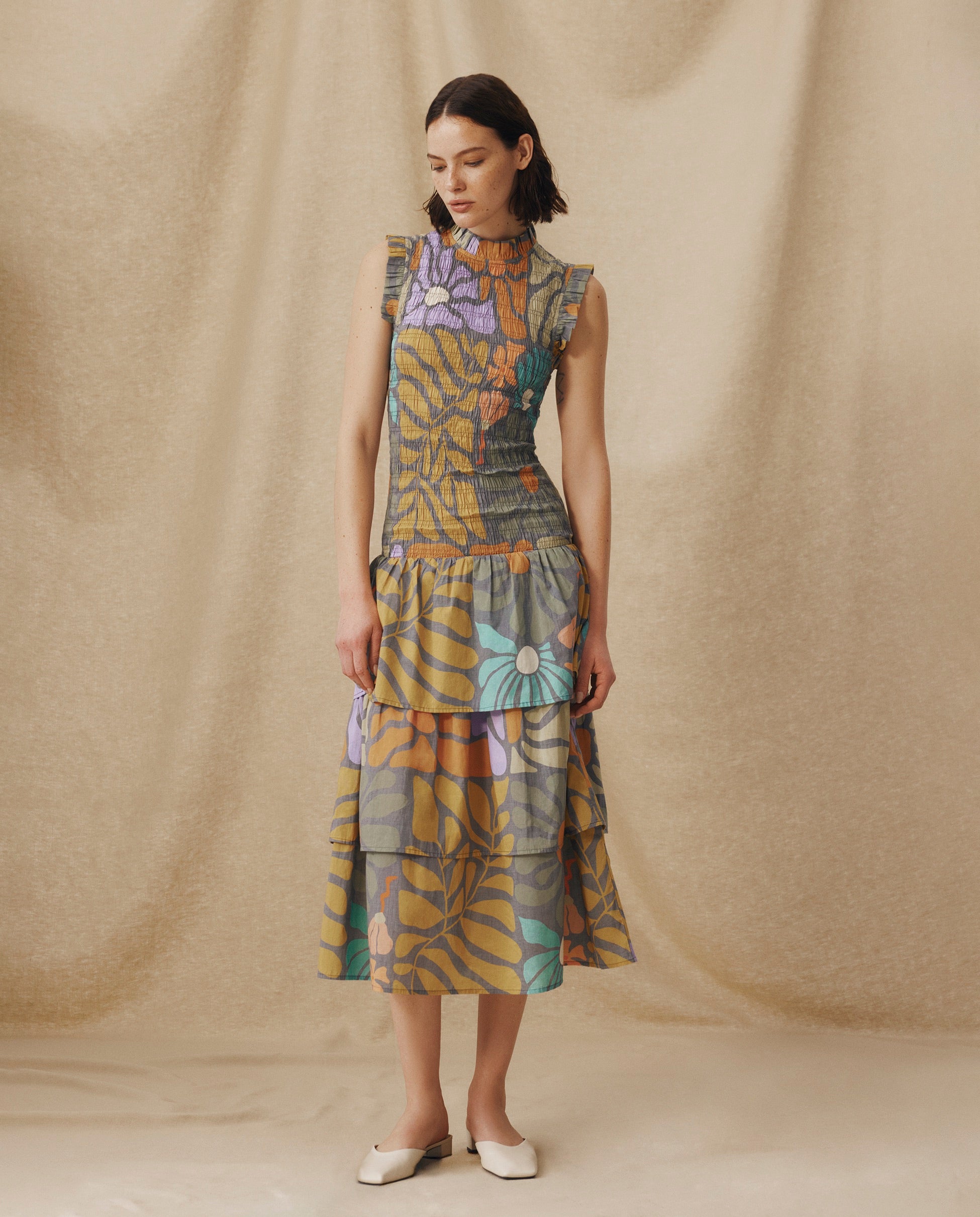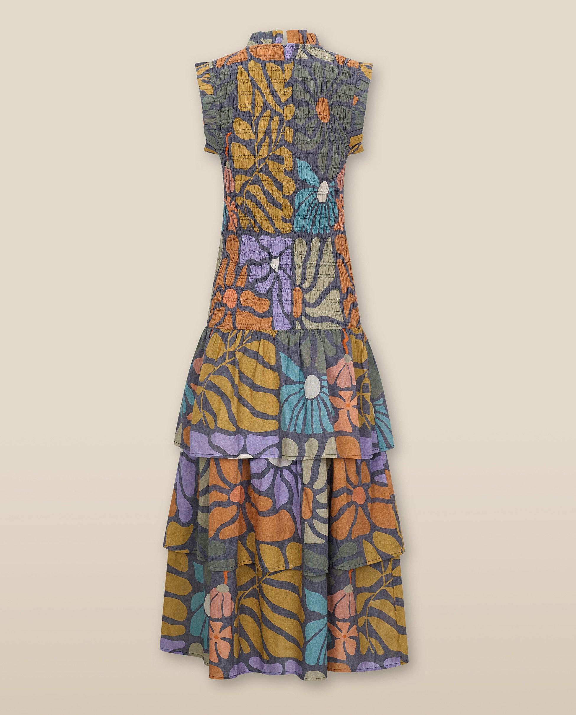 El vestido Charita es divertido y femenino. Está confeccionado en algodón 100% ligero con un vibrante estampado floral multicolor. El cuerpo smocked se adapta con suavidad a la silueta, mientras que la falda midi con volantes en capas aporta volumen y movimiento. Esta pieza ofrece una silueta romántica y versátil para el día a día.
