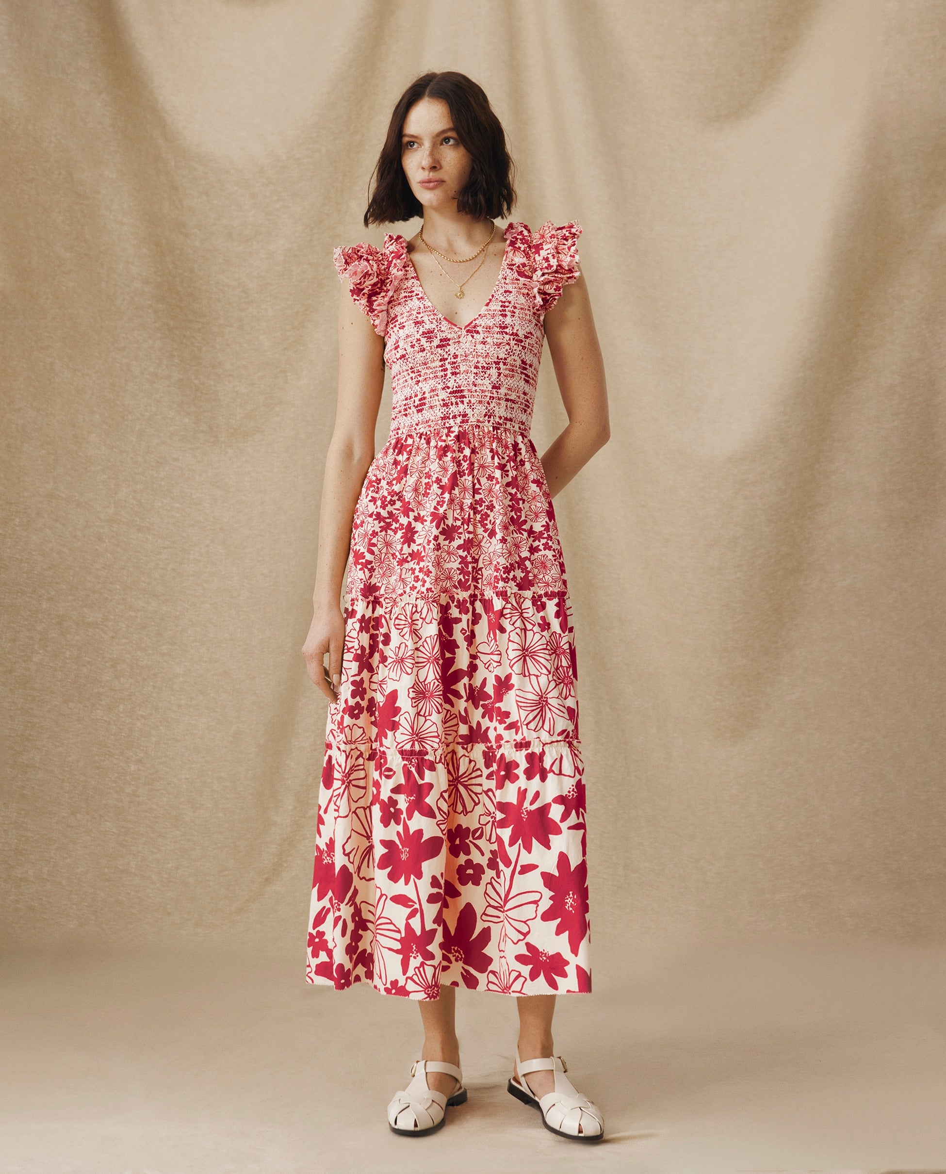 DAWA | Vestido Midi Fruncido de Algodón en Blanco y Rojo Carmesí con Flores
