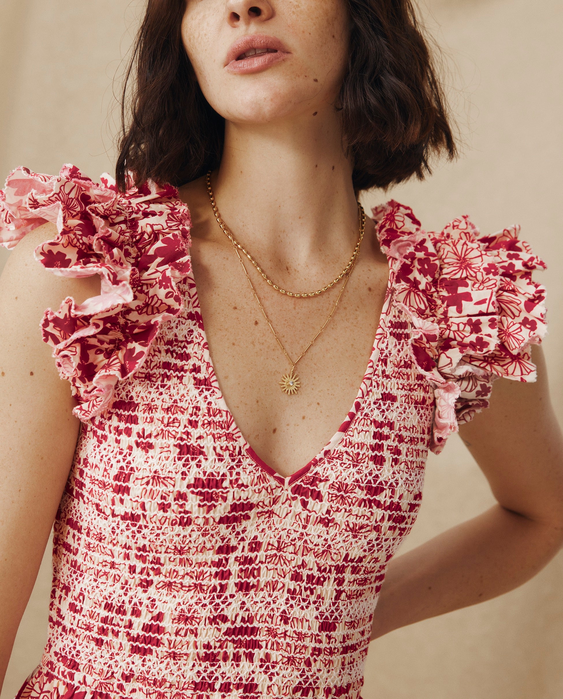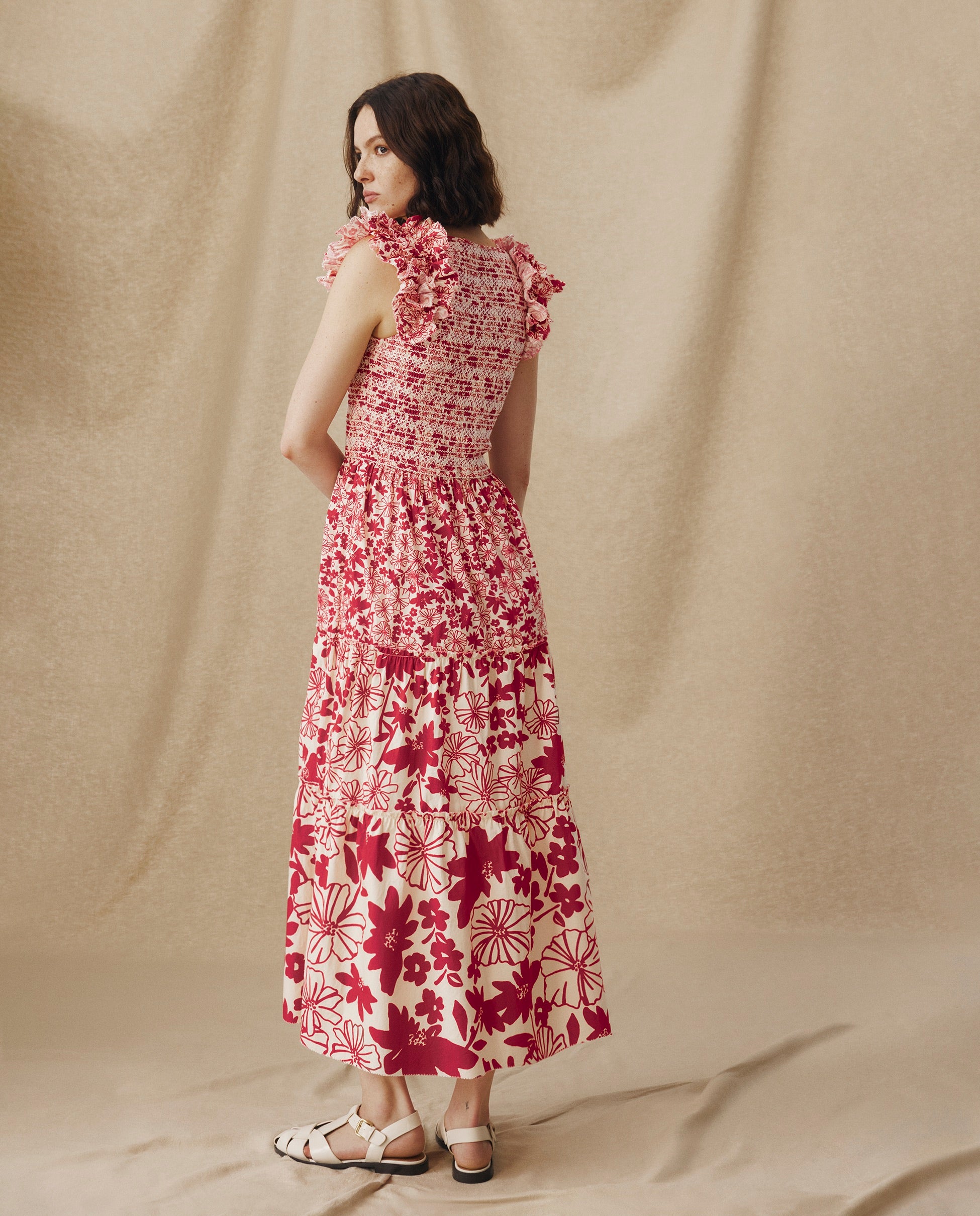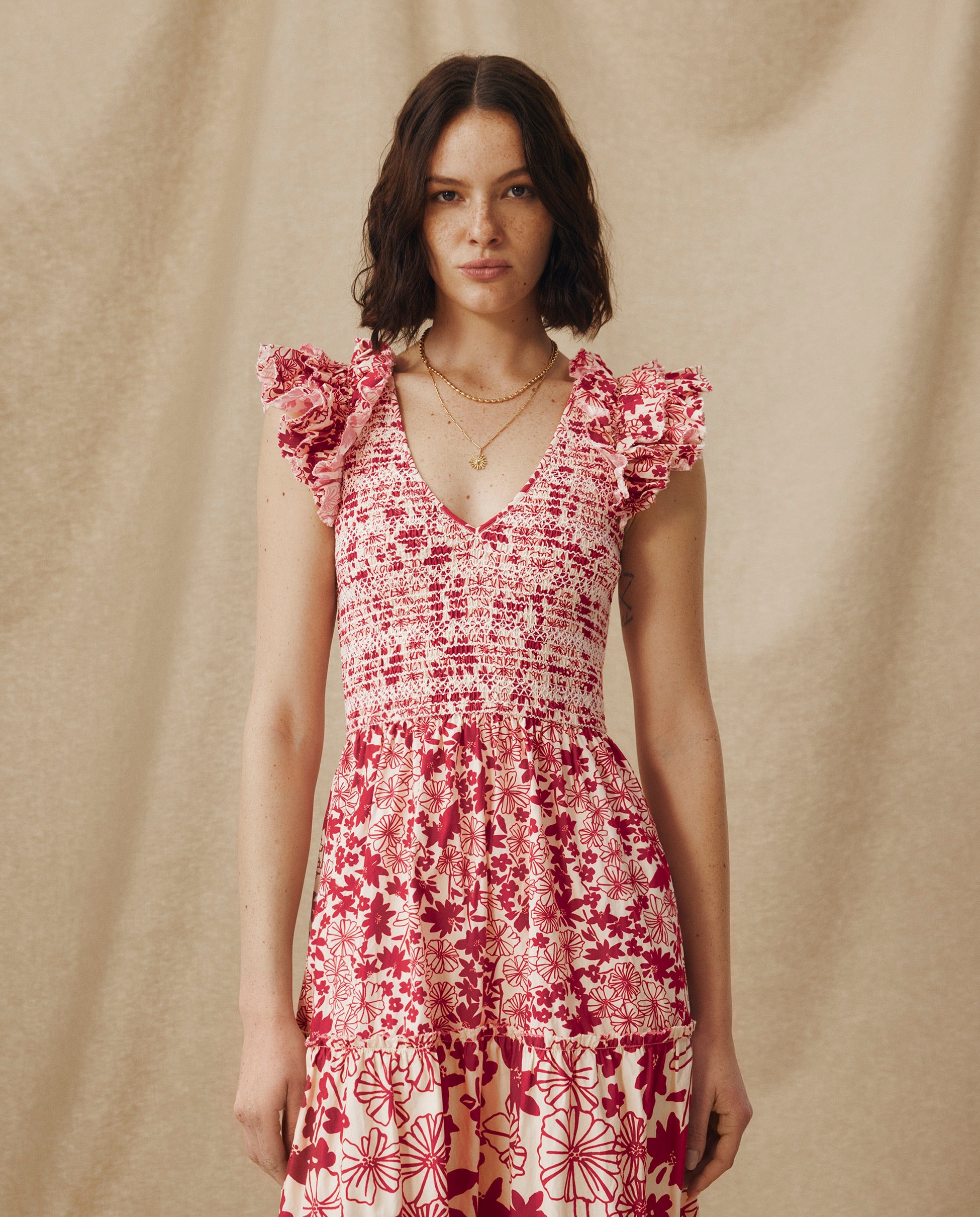 Romántico y desenfadado, el vestido Dawa destaca por su estampado floral en color rojo carmesí. Confeccionado en 100% algodón, su silueta femenina incluye un cuerpo nido de abeja, hombros con volumen y falda con volantes a capas que aportan movimiento y ligereza. Es un diseño tan elegante como versátil, ideal para el día a día.