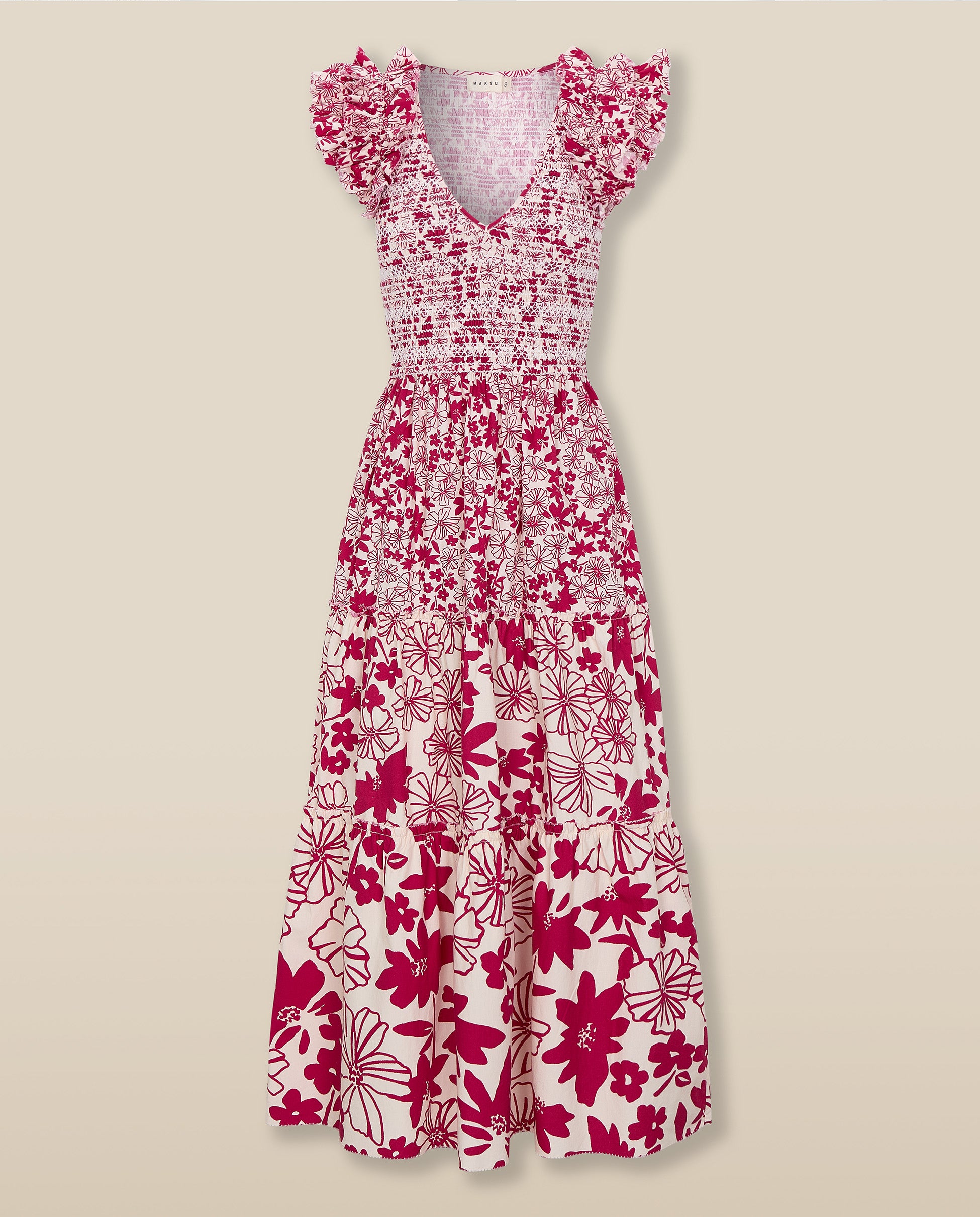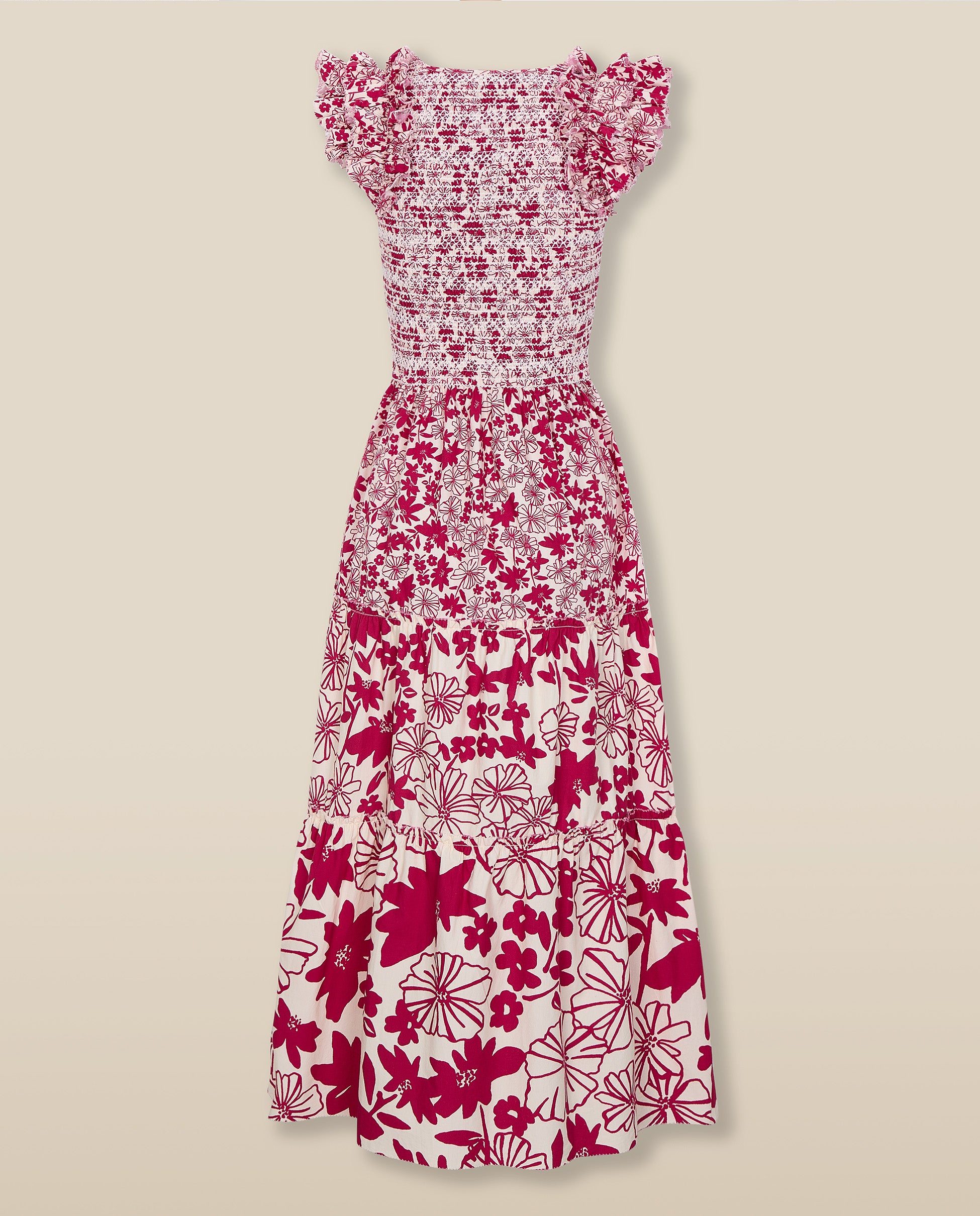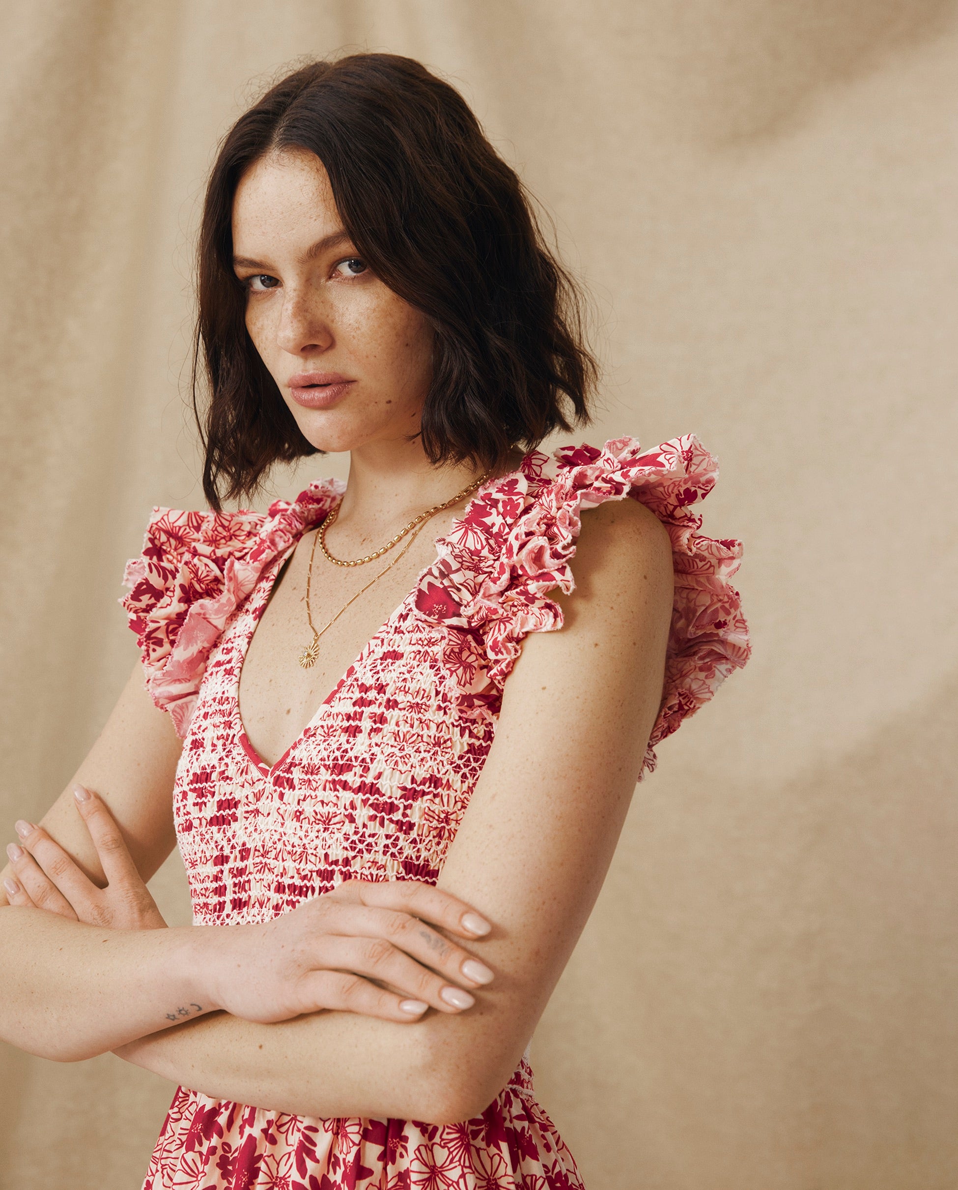 Romántico y desenfadado, el vestido Dawa destaca por su estampado floral en color rojo carmesí. Confeccionado en 100% algodón, su silueta femenina incluye un cuerpo nido de abeja, hombros con volumen y falda con volantes a capas que aportan movimiento y ligereza. Es un diseño tan elegante como versátil, ideal para el día a día.