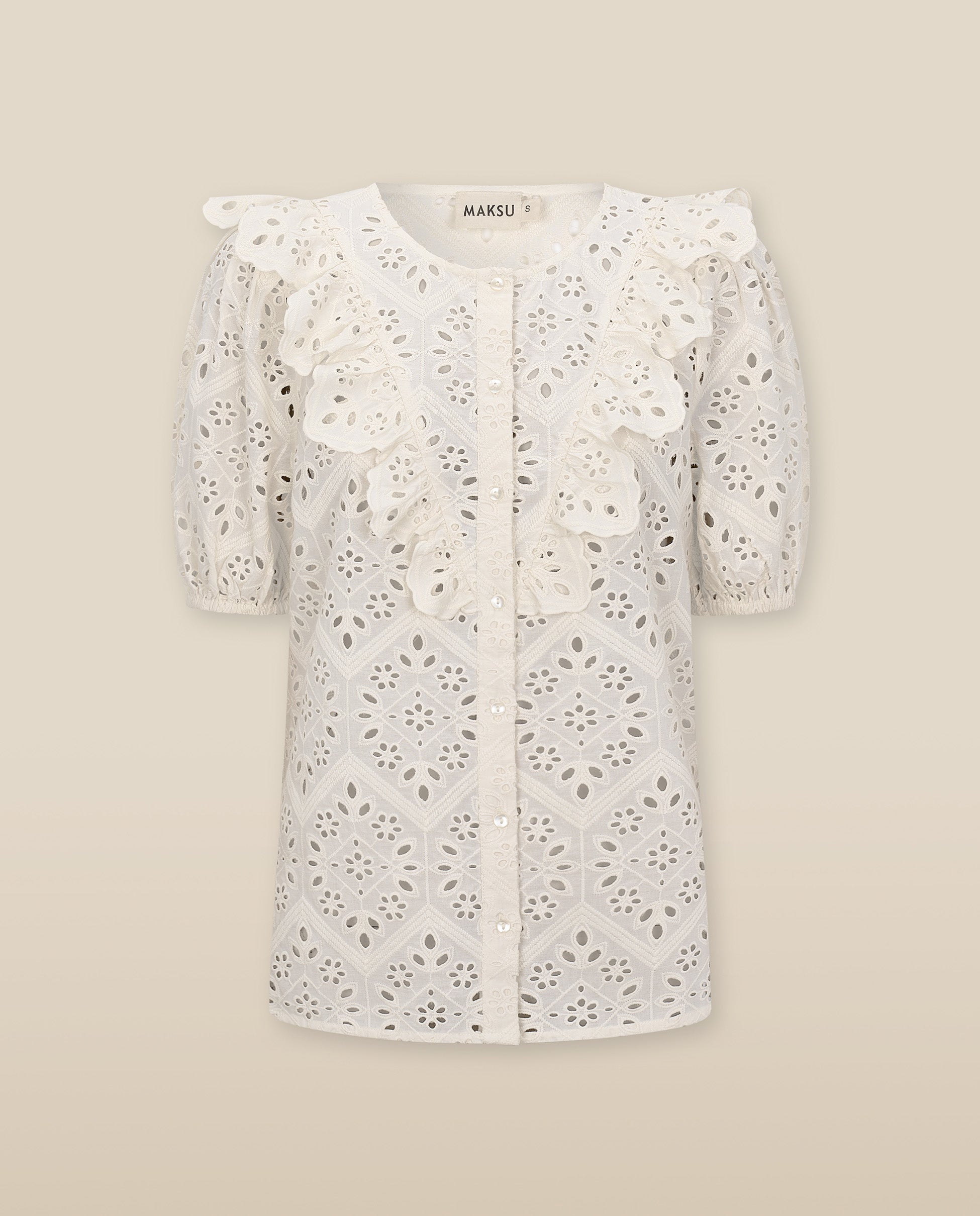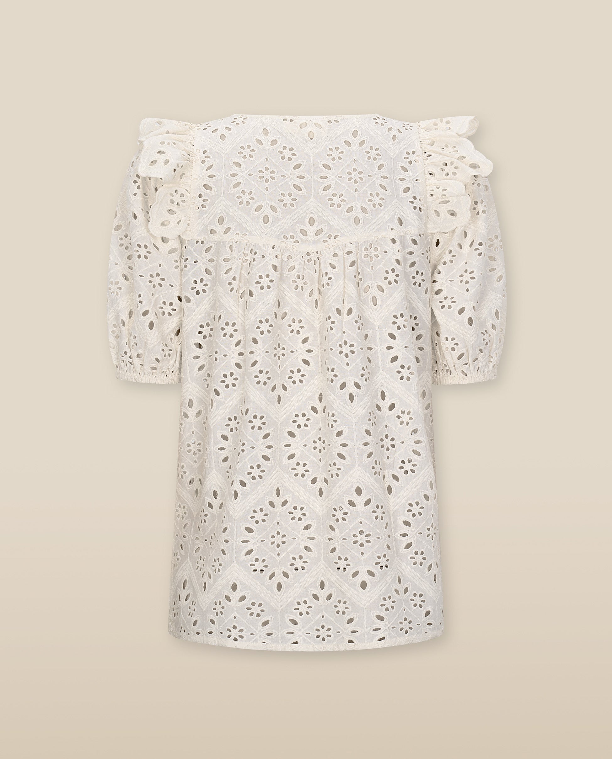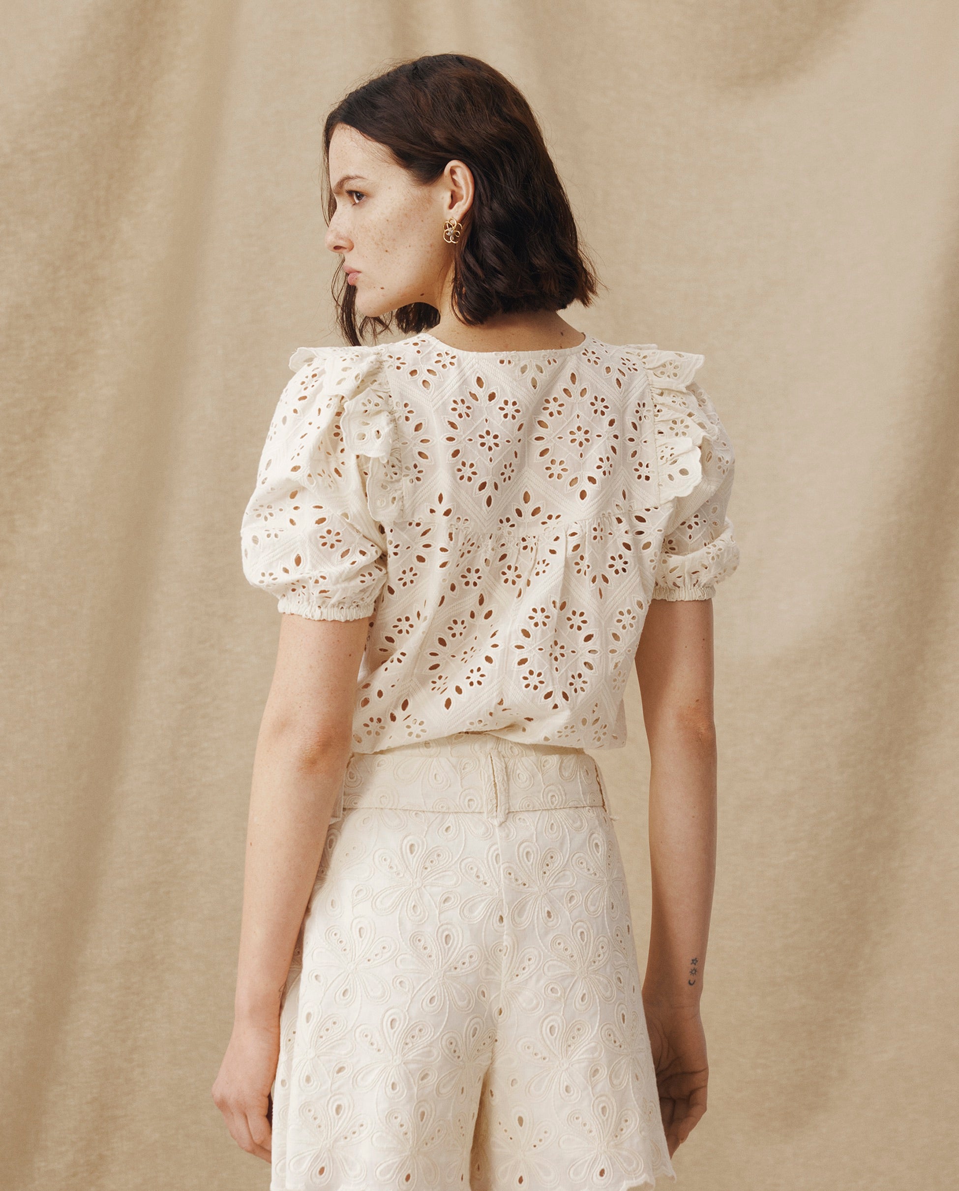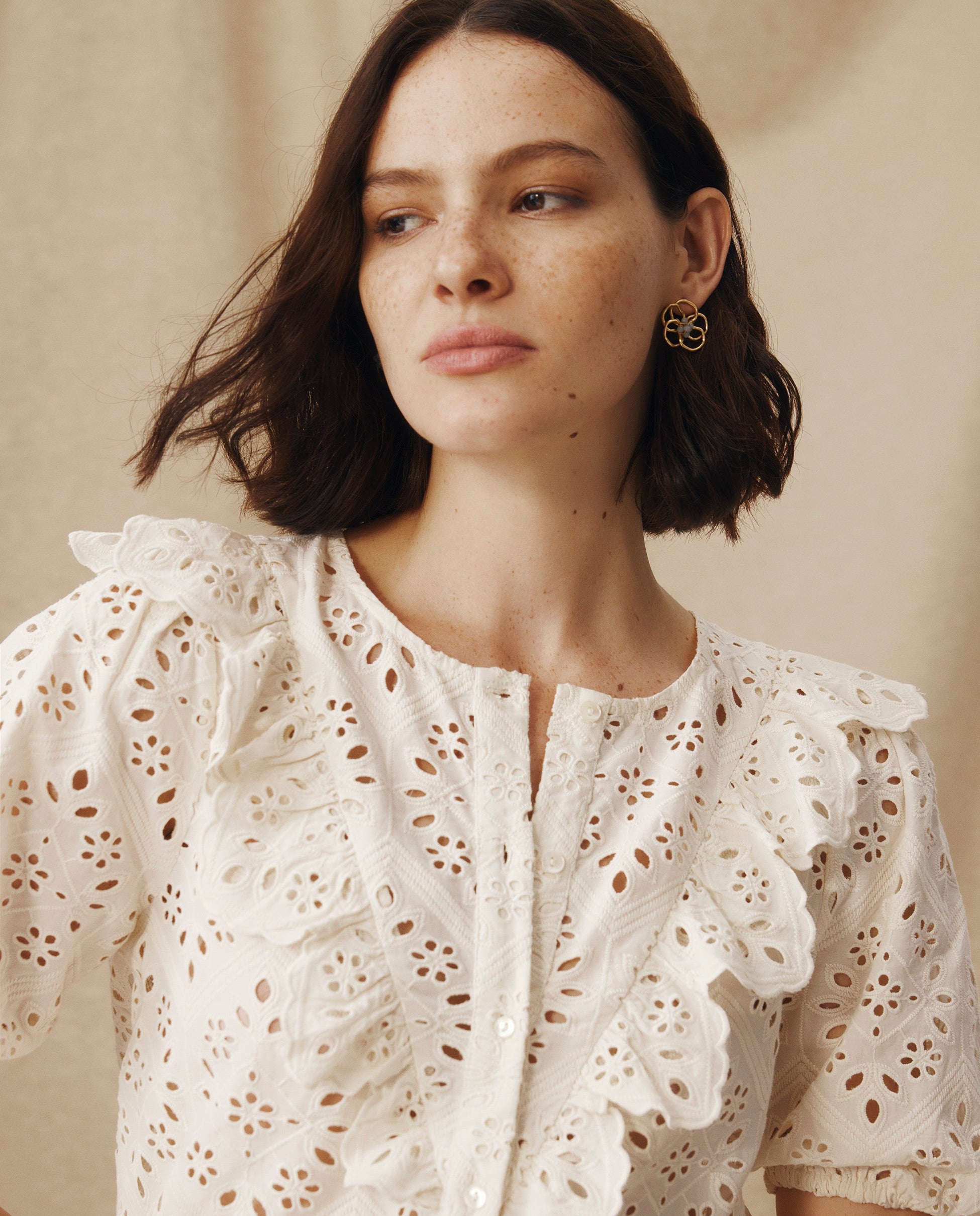 Una oda a la feminidad, la blusa Lili evoca el romanticismo de épocas pasadas. El delicado broderie anglaise ocupa el centro de la escena, realzado por suaves volantes y mangas abullonadas con volumen. Confeccionada en algodón 100% en tono crudo, esta silueta atemporal se completa con cuello redondo y botones de nácar para un acabado refinado.