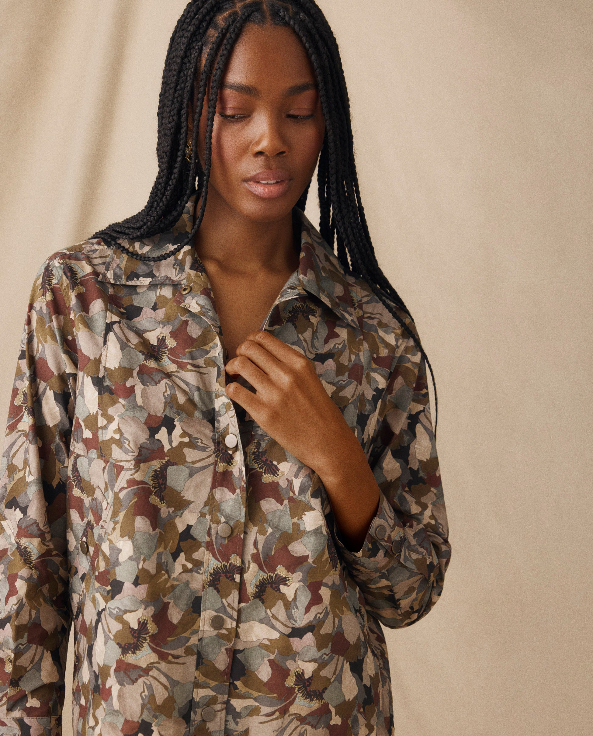 Una combinación de estructura relajada y sastrería, la sobrecamisa Misty está confeccionada en algodón Liberty de alta calidad con un estampado floral en tonos naturales y terrosos. Diseñada con una silueta relajada y cuello marcado, incorpora bolsillos laterales prácticos y una tapeta frontal oculta con cierres de corchete para un acabado moderno y limpio. Combínala con el pantalón.