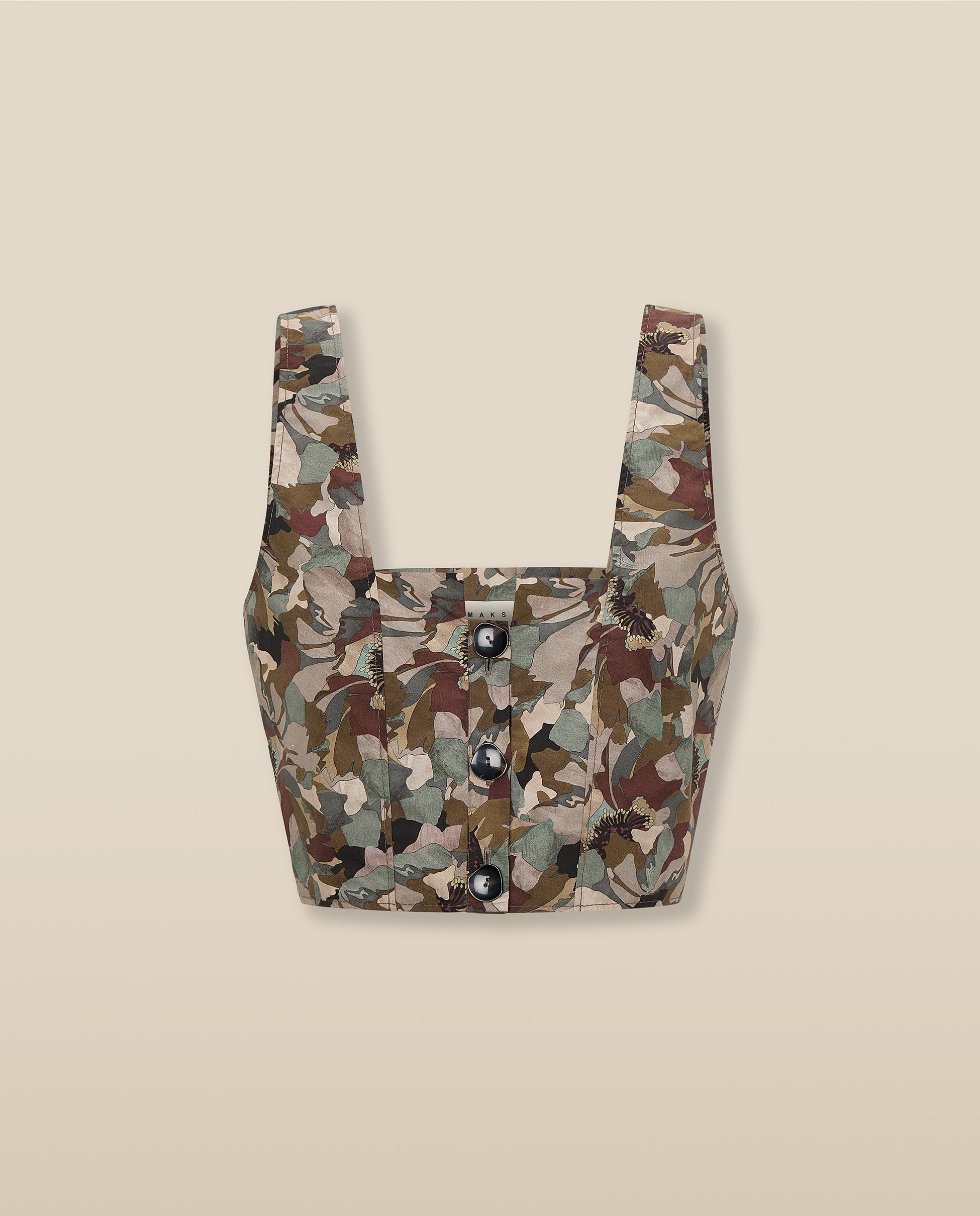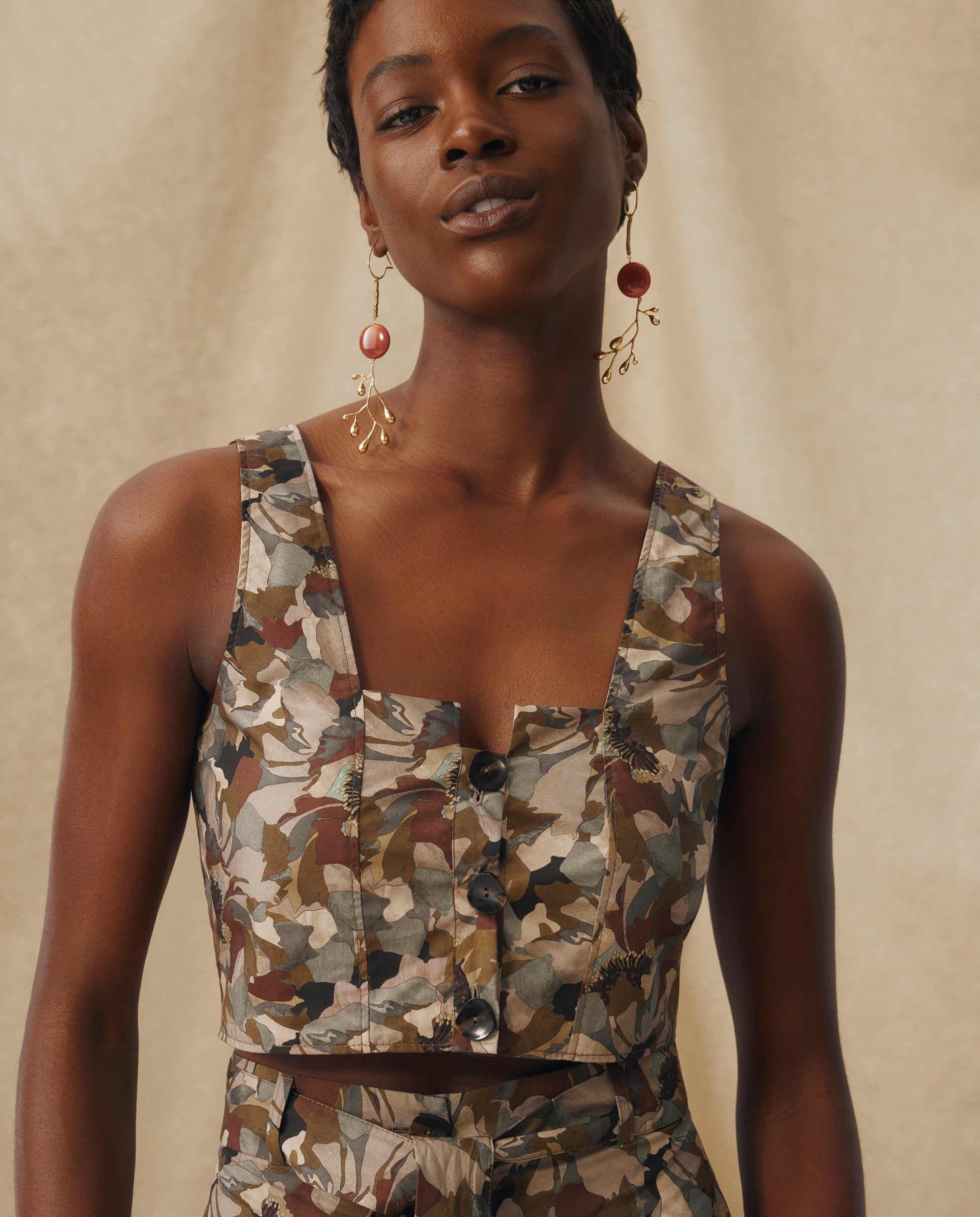 Confeccionado en icónico algodón Liberty en tonos neutros y terrosos, el top Misty combina sastrería estructurada con un toque femenino y delicado. De silueta cropped favorecedora, presenta un escote cuadrado esculpido, tirantes anchos y botonadura frontal. Diseñado para combinar perfectamente con el pantalón a juego, es una prenda versátil que aporta carácter tanto en conjunto como por separado. • Top estructurado tipo crop con estampado Liberty en tonos naturales • Escote cuadrado con tirantes anchos y cierre de botones en el delantero • Estampado Liberty en algodón 100%