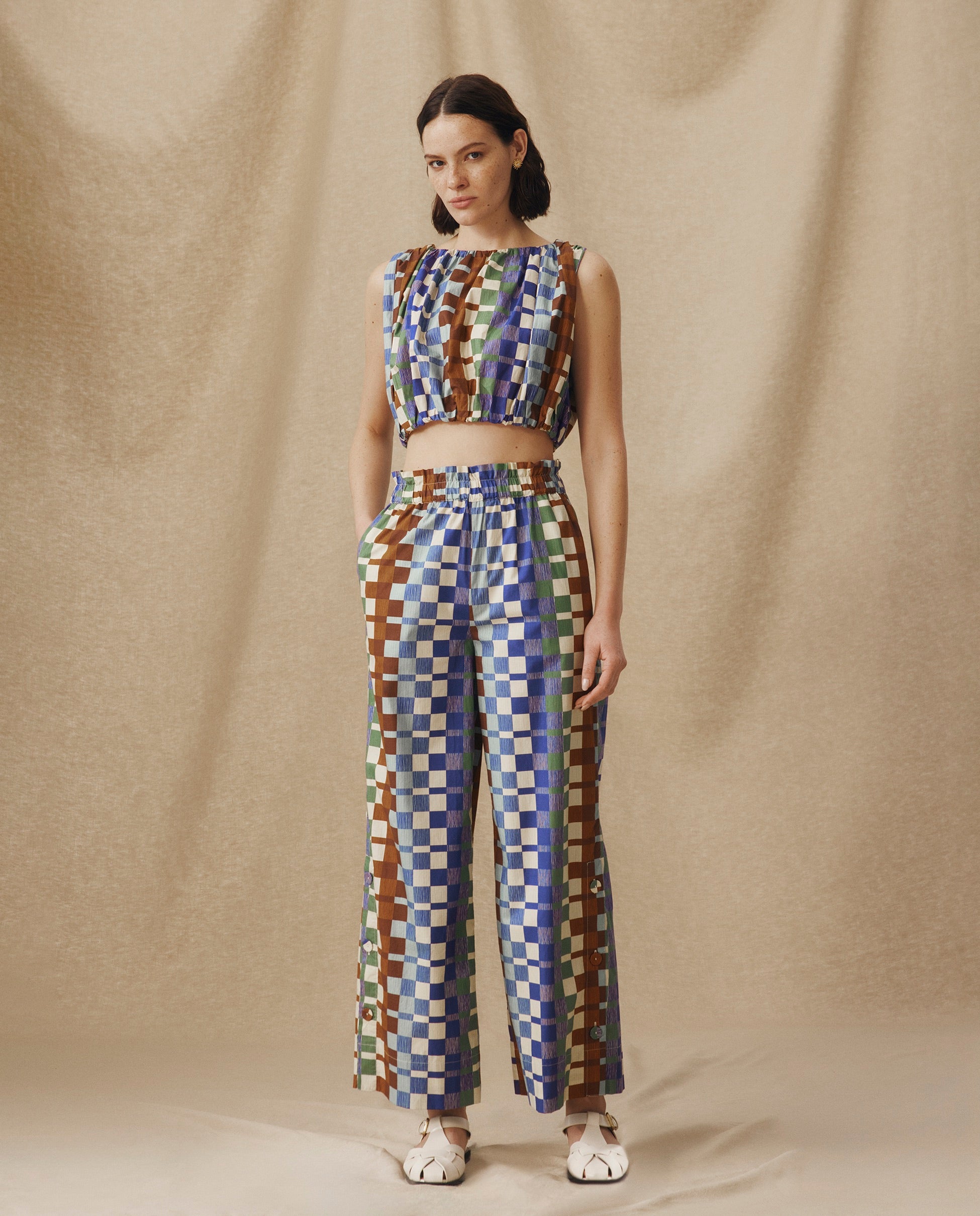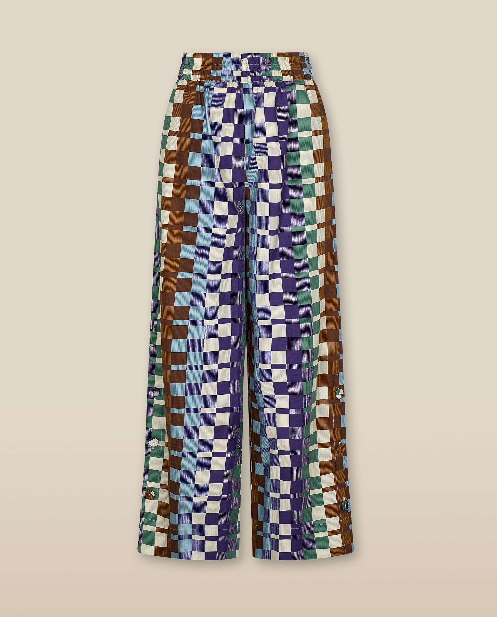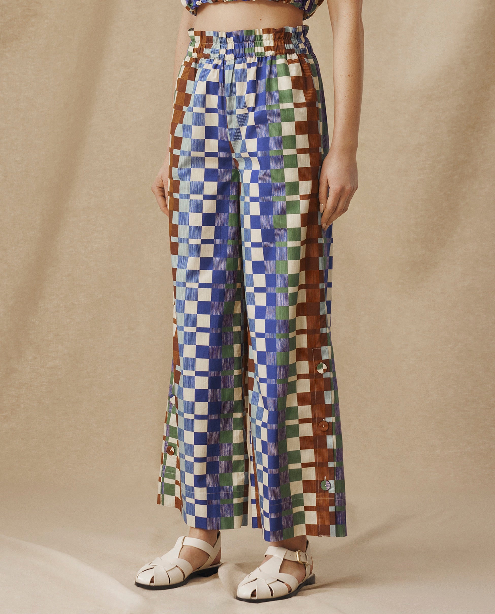 La reinterpretación de la sastrería retro, el pantalón Morinal combina un estampado gráfico con una estructura relajada. Confeccionado en algodón 100% con un llamativo estampado geométrico multicolor, presenta cintura alta, pierna ancha y cinturilla elástica para un ajuste cómodo y favorecedor. Los bolsillos laterales aportan funcionalidad, mientras que tres botones forrados en la parte baja de la pierna añaden un sutil toque de diseño. • Pantalón ancho de algodón con talle alto y ajuste relajado • Estampado geométrico con bolsillos laterales • Confeccionado en 100% algodón con cinturilla elástica