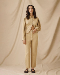 Una interpretación moderna de la sastrería clásica, la chaqueta Moana está confeccionada en algodón 100% en tono camel claro. Diseñada con hombros plisados y mangas voluminosas, se abrocha en la parte delantera mediante botones. El bajo ligeramente curvado y los bolsillos laterales completan la silueta, mientras que los puños con botones aportan un acabado refinado.